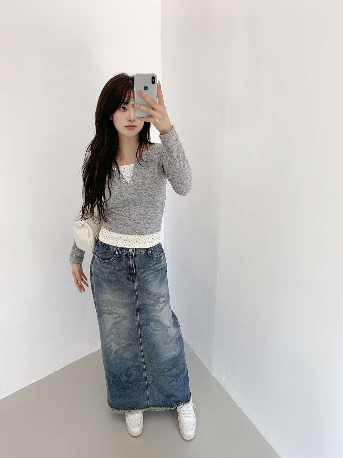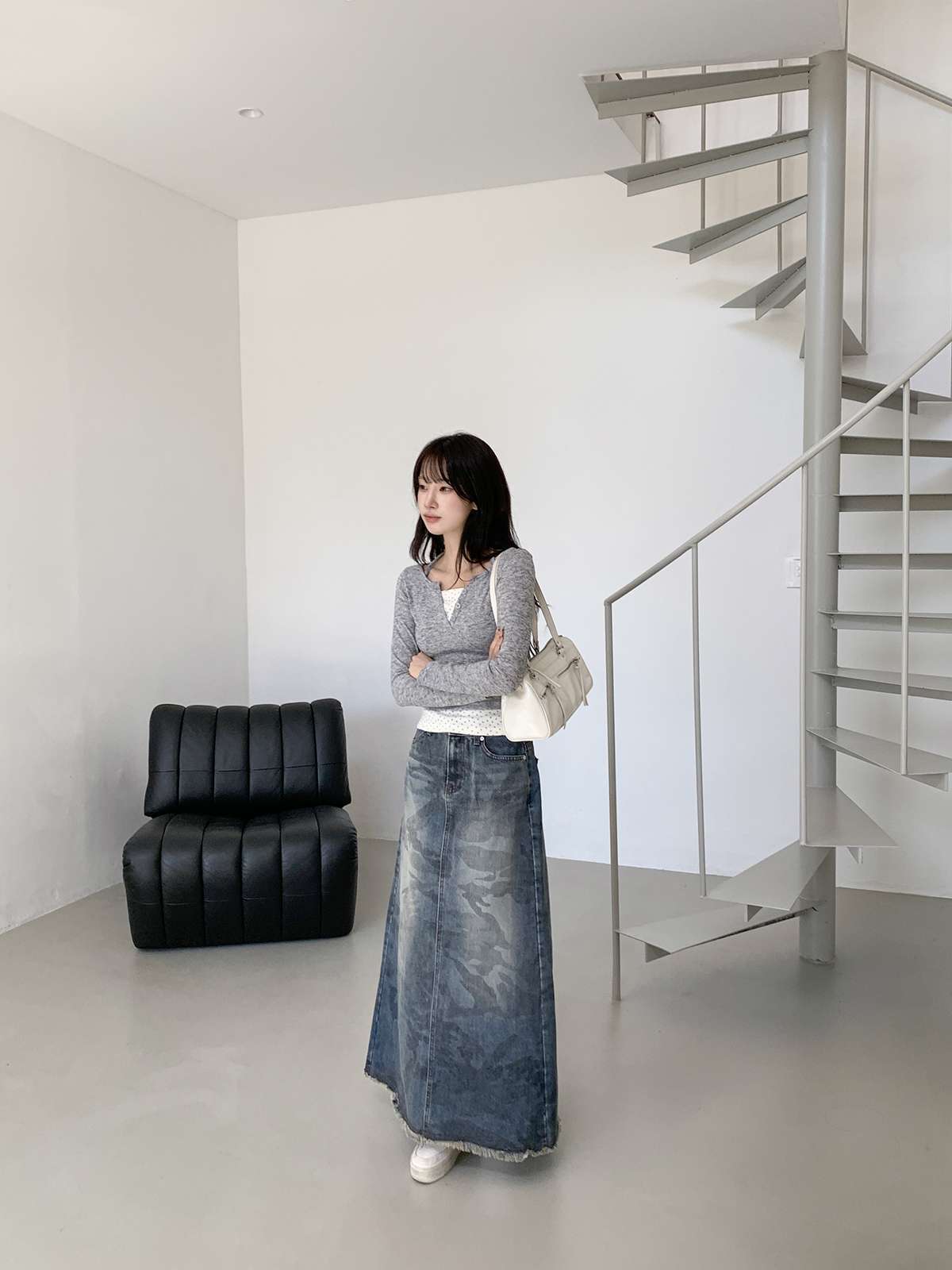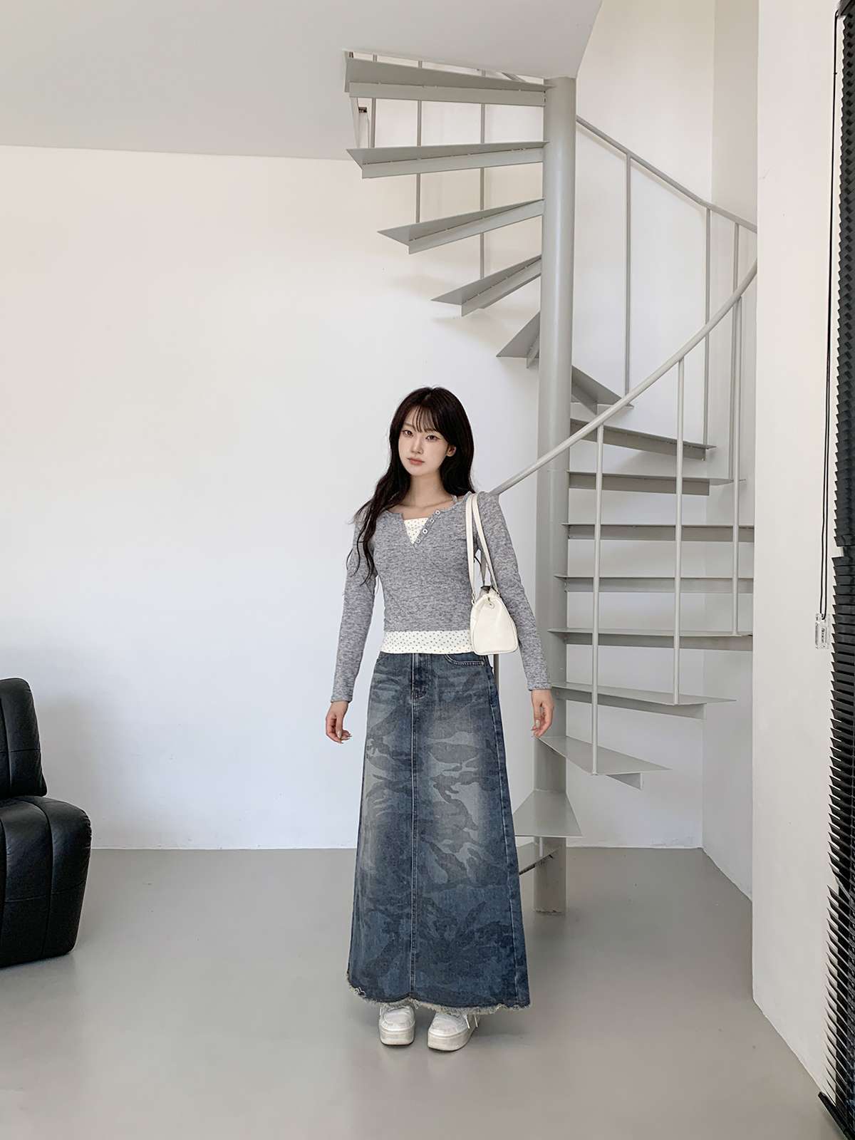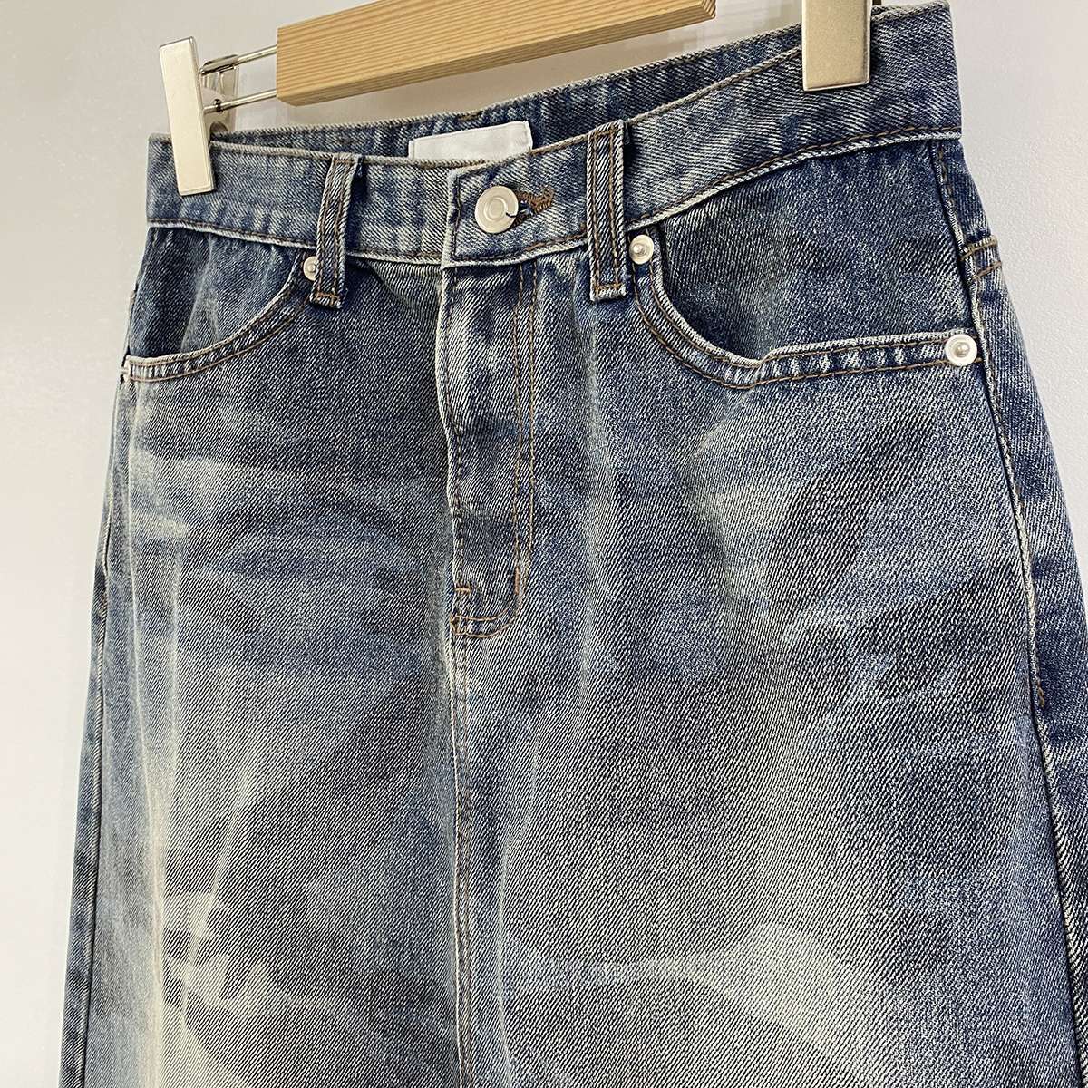 빈티지한 카모플라쥬 패턴 워싱이 유니크한 무드를 연출하는 데님 롱 스커트