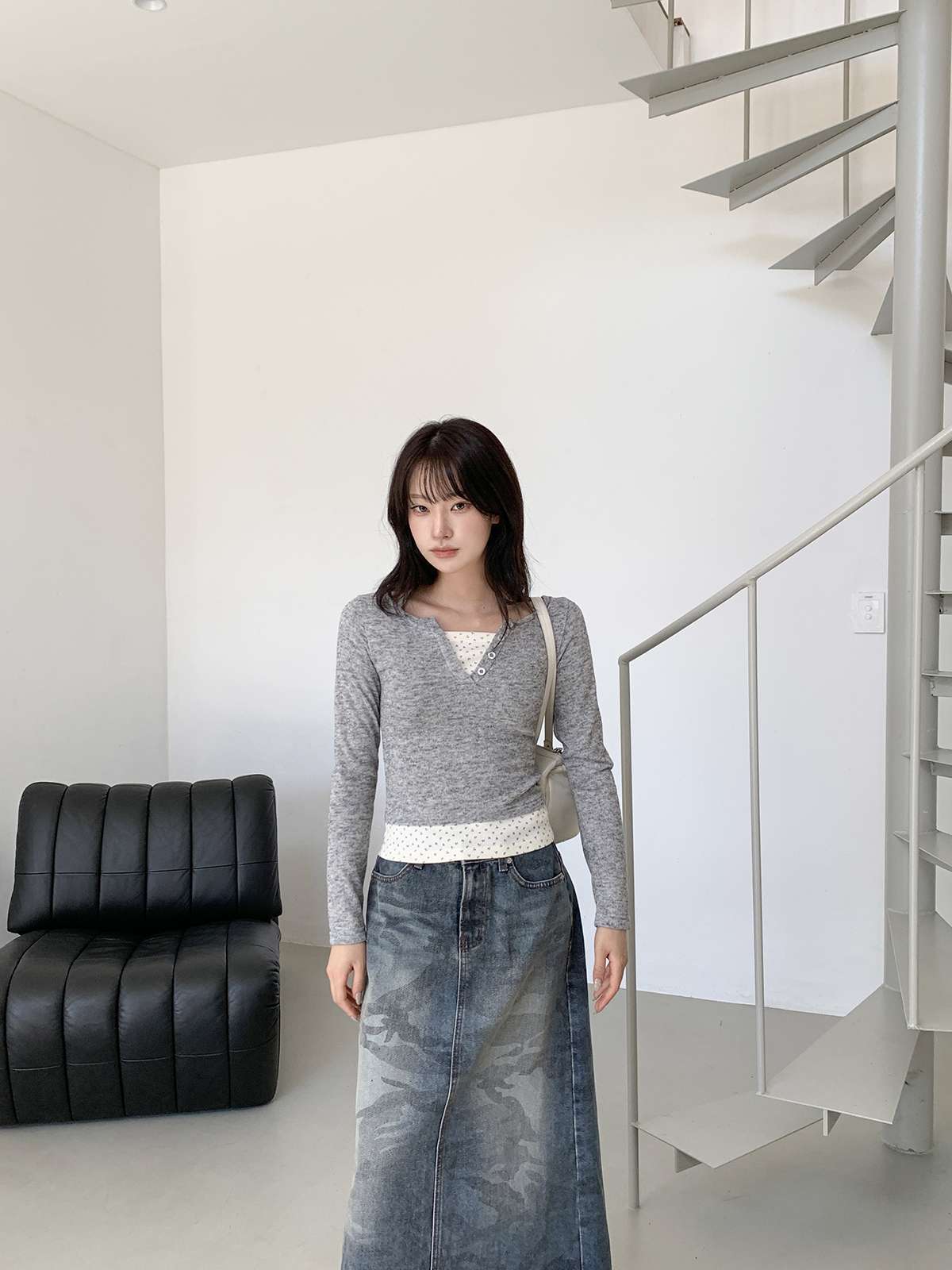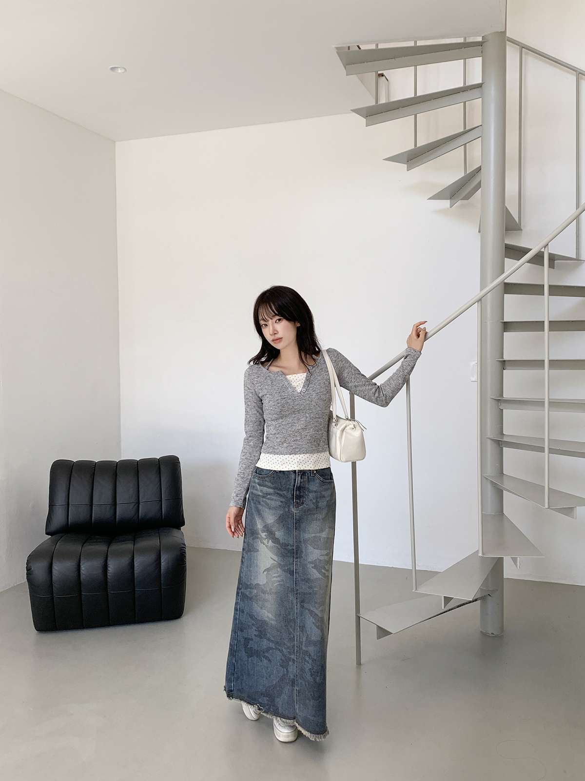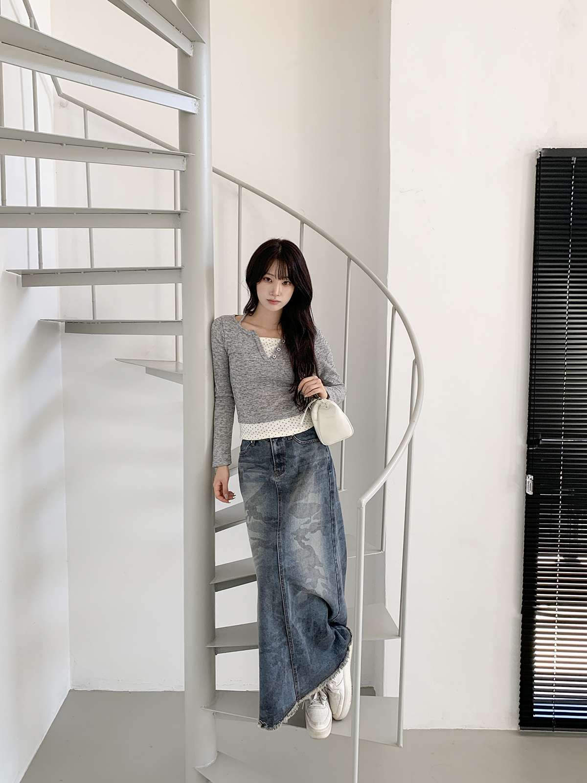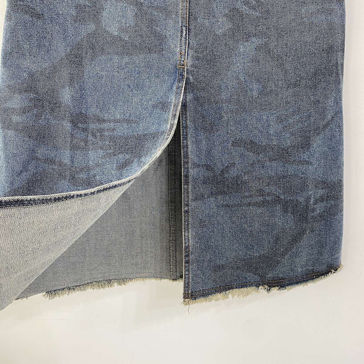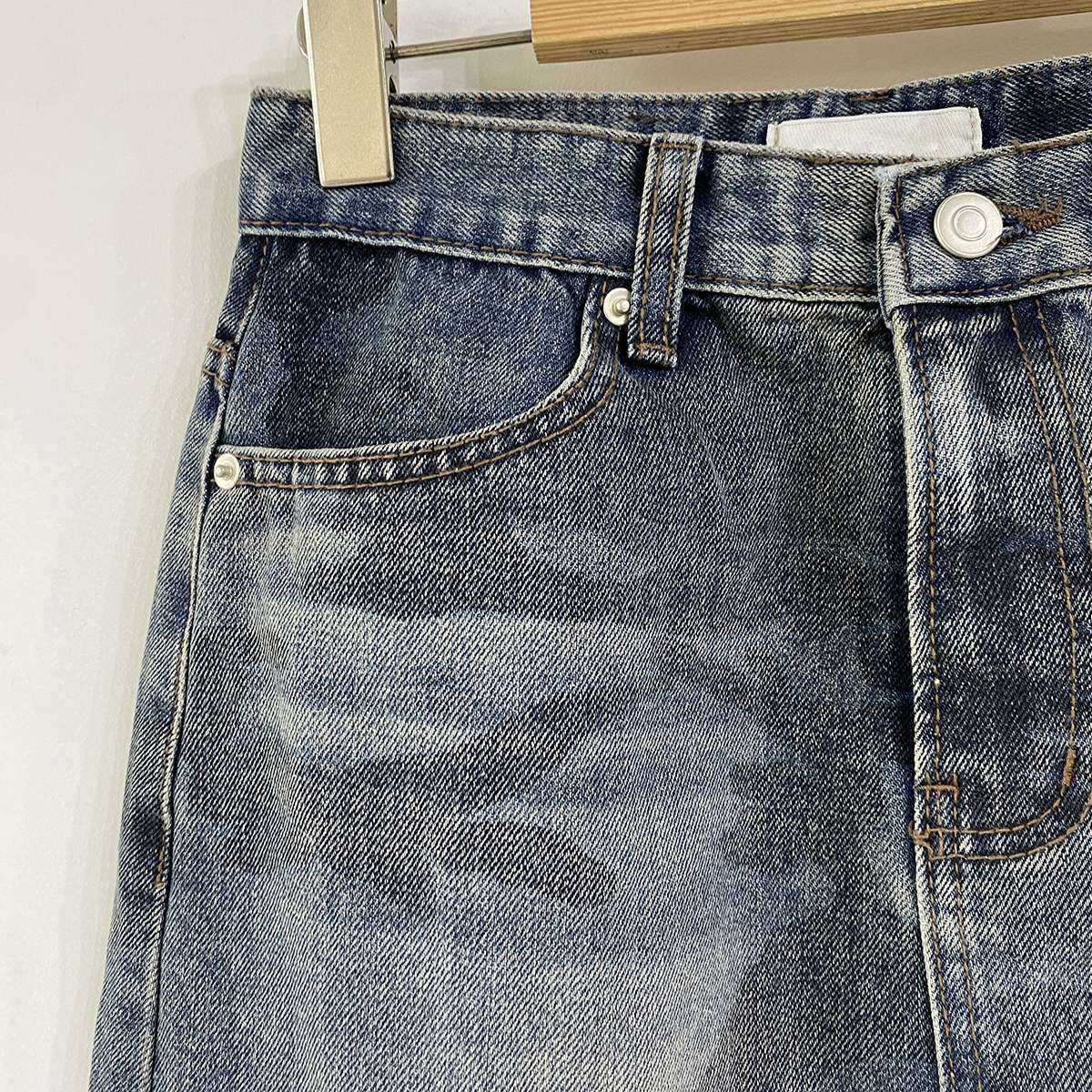 빈티지한 카모플라쥬 패턴 워싱이 유니크한 무드를 연출하는 데님 롱 스커트
