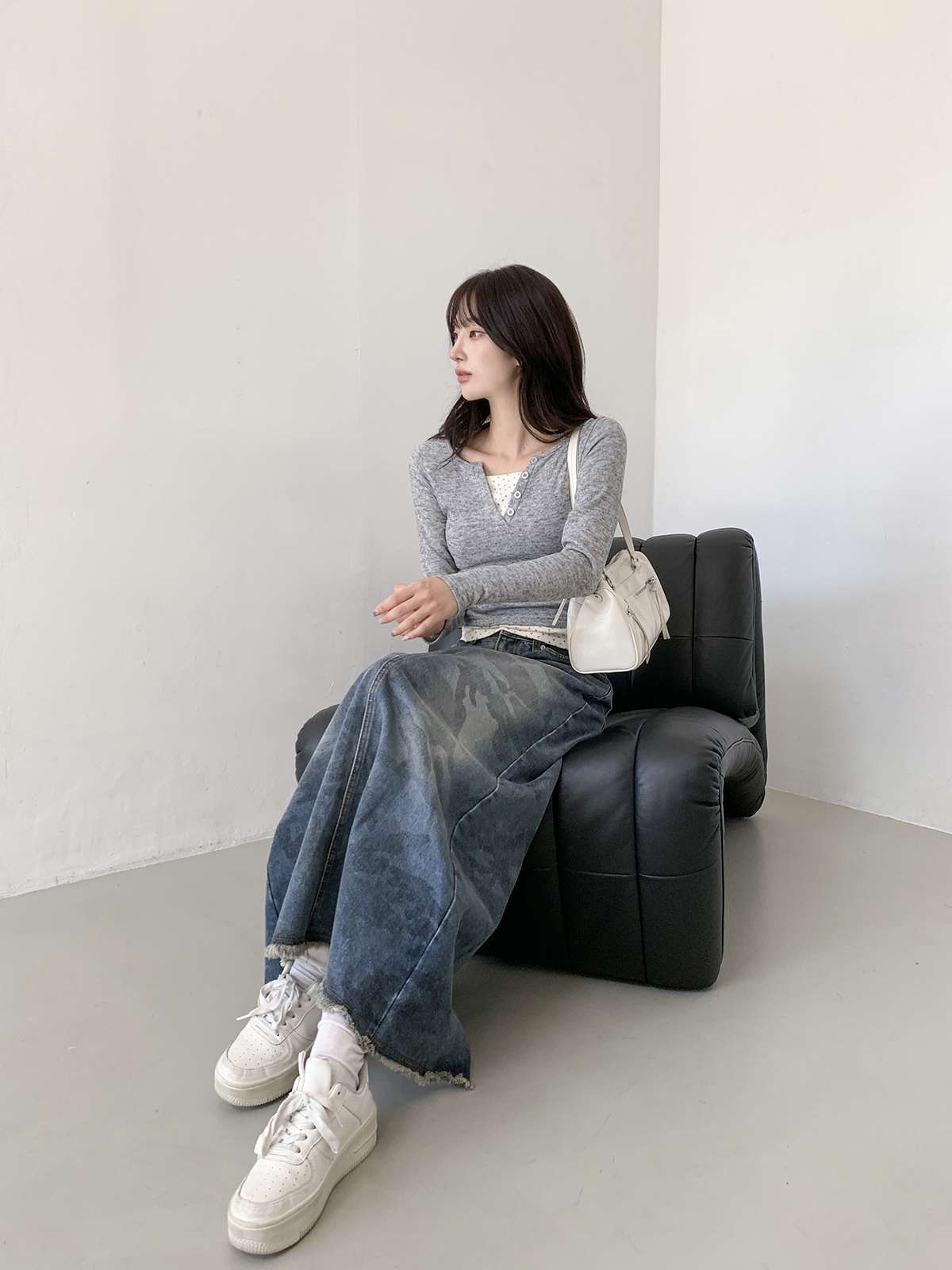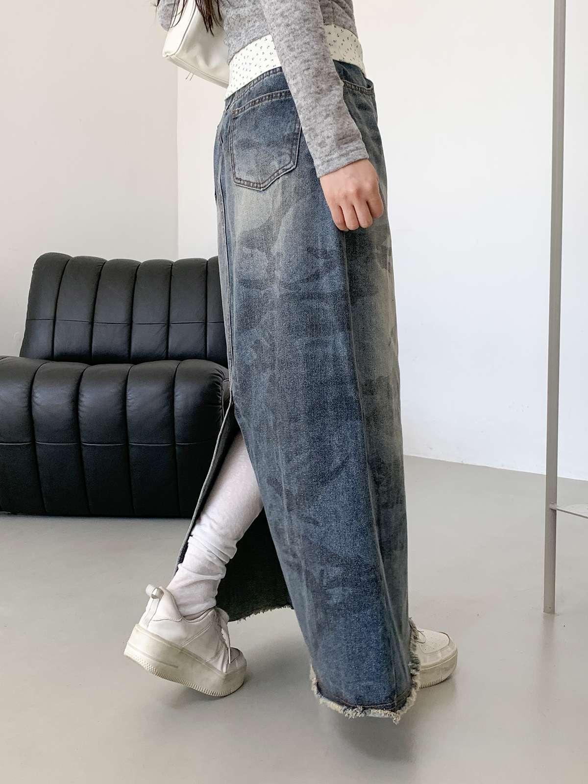 [ SK7414K59-페리얼 카모 워싱 빈티지 데님 롱 스커트 ]