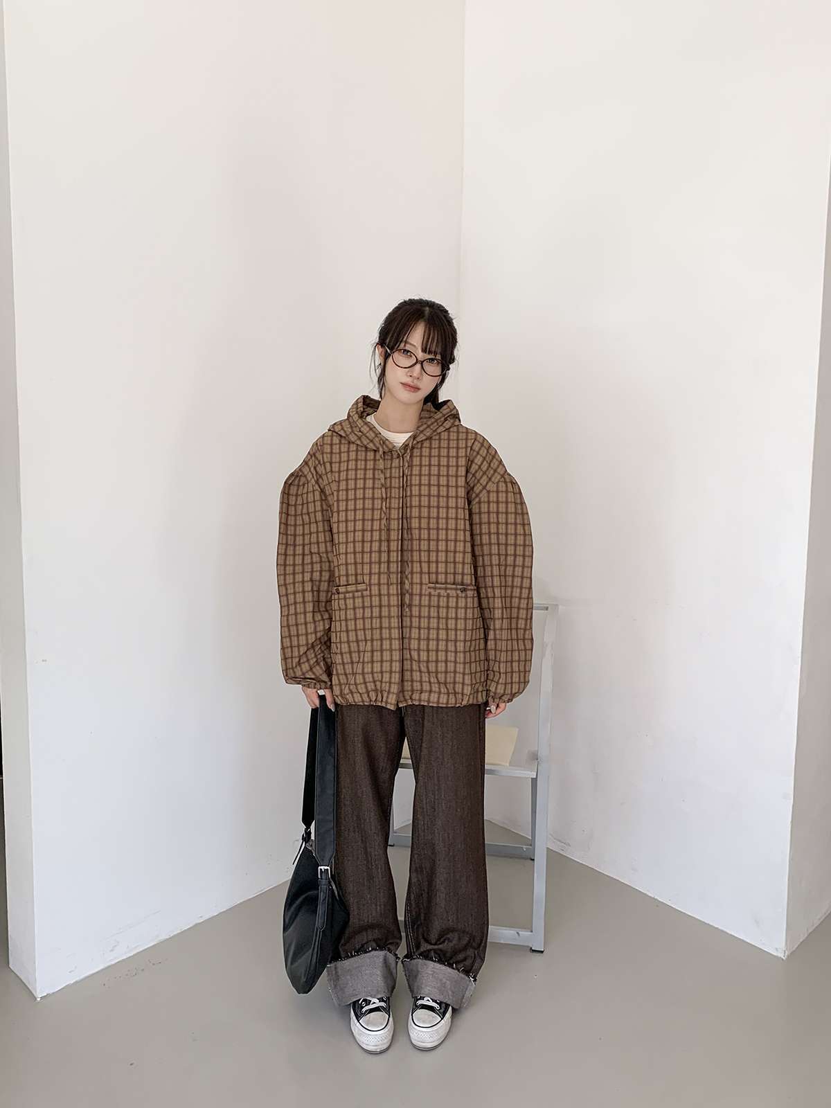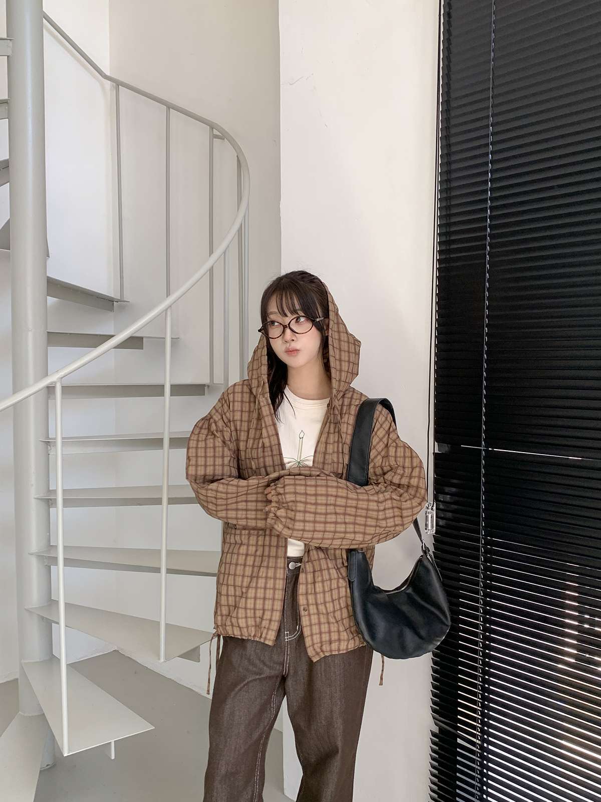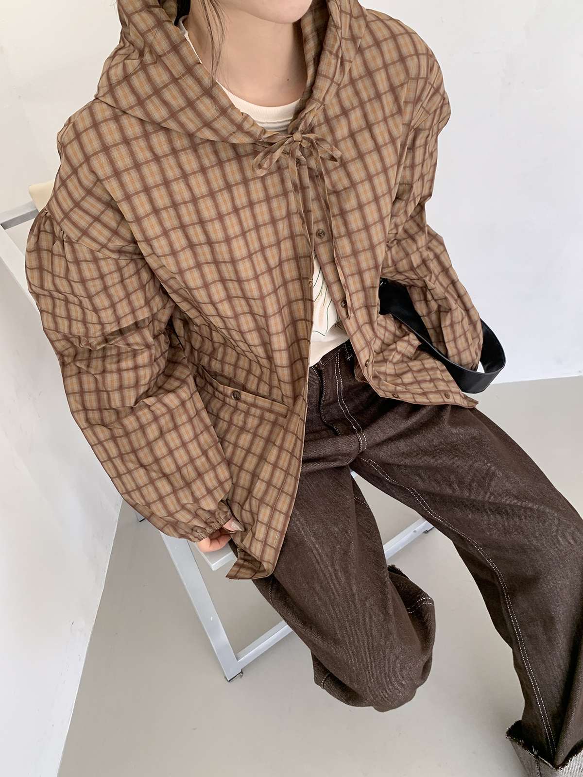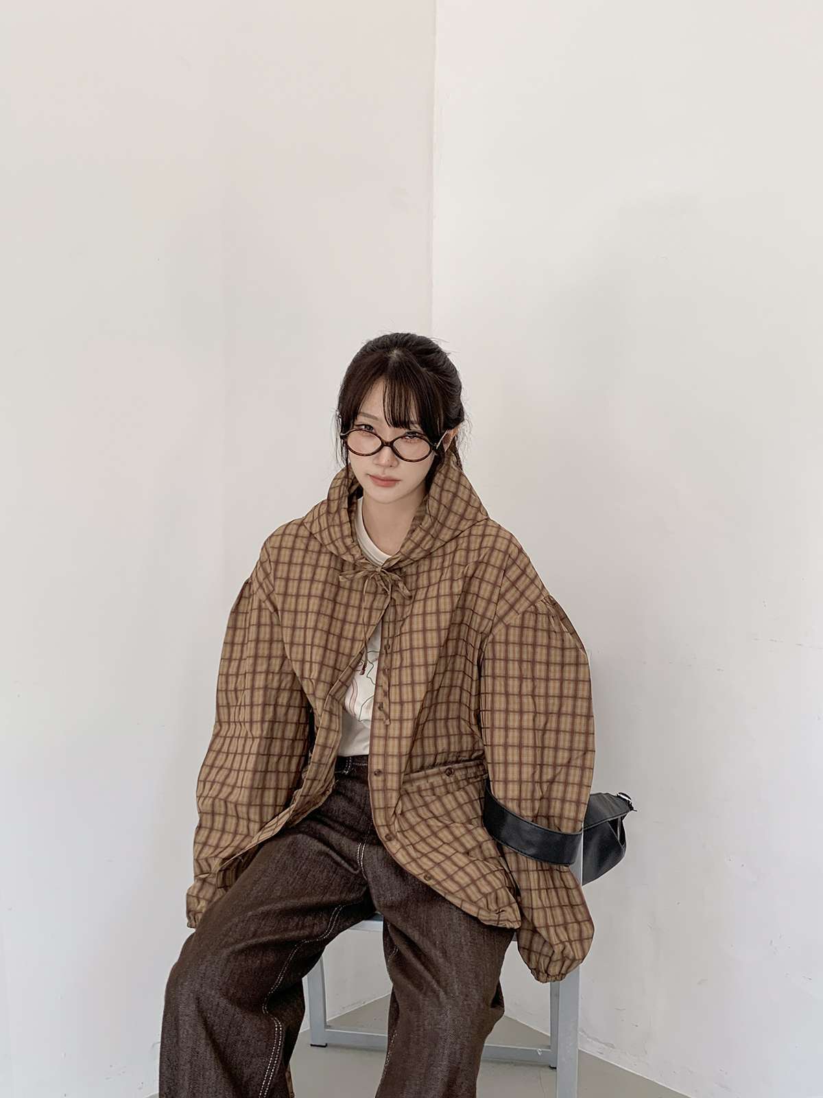 빈티지한 무드의 체크 패턴과 후드가 어우러져 세련된