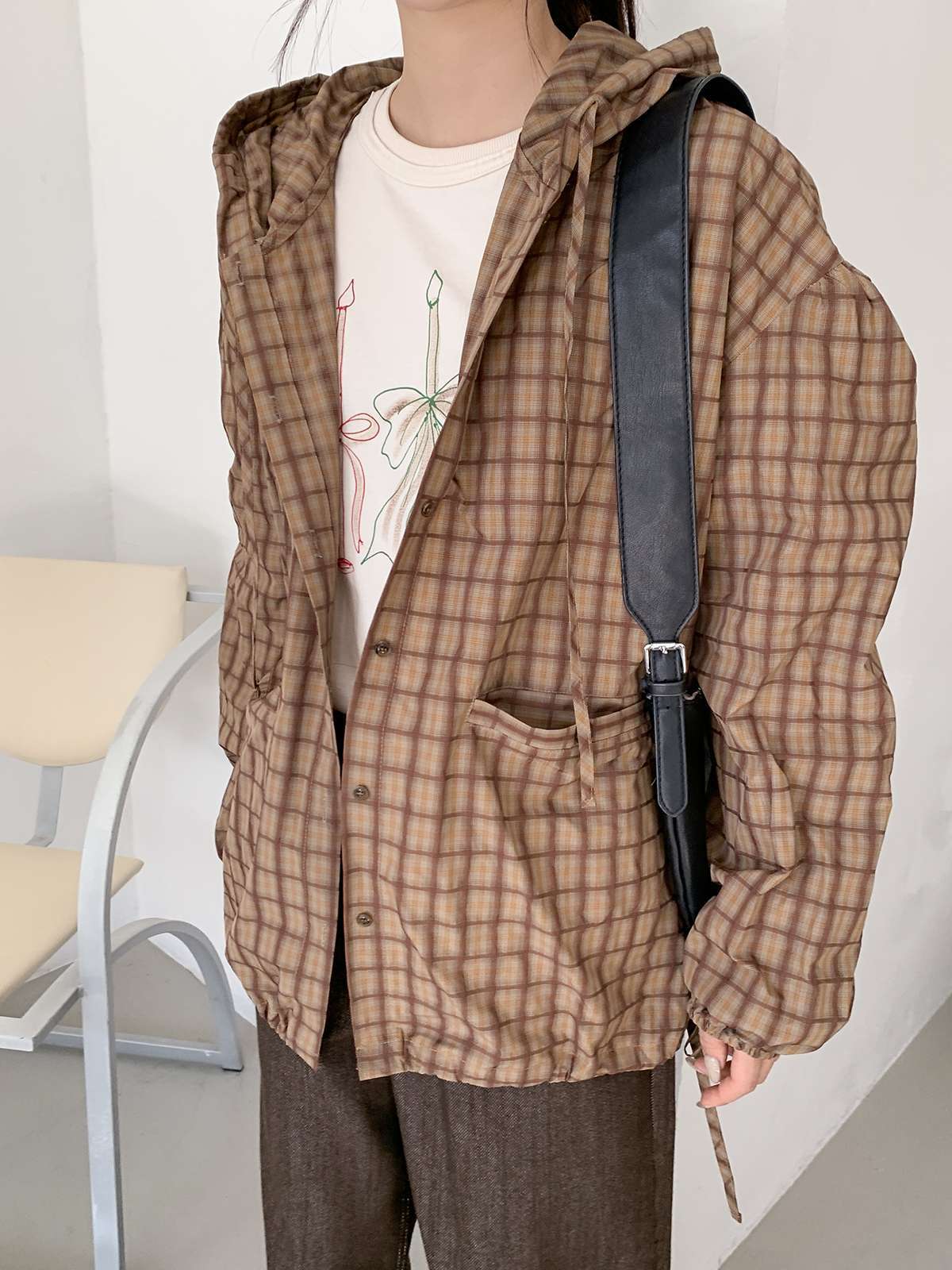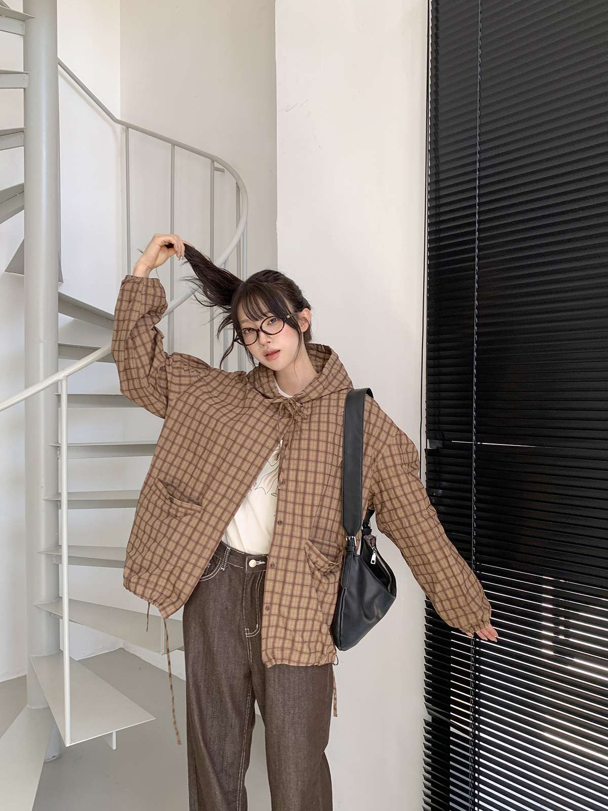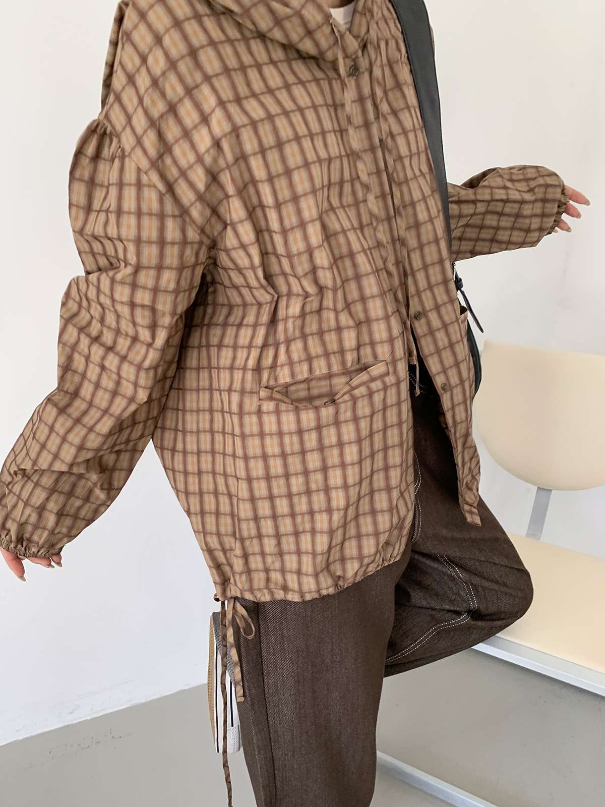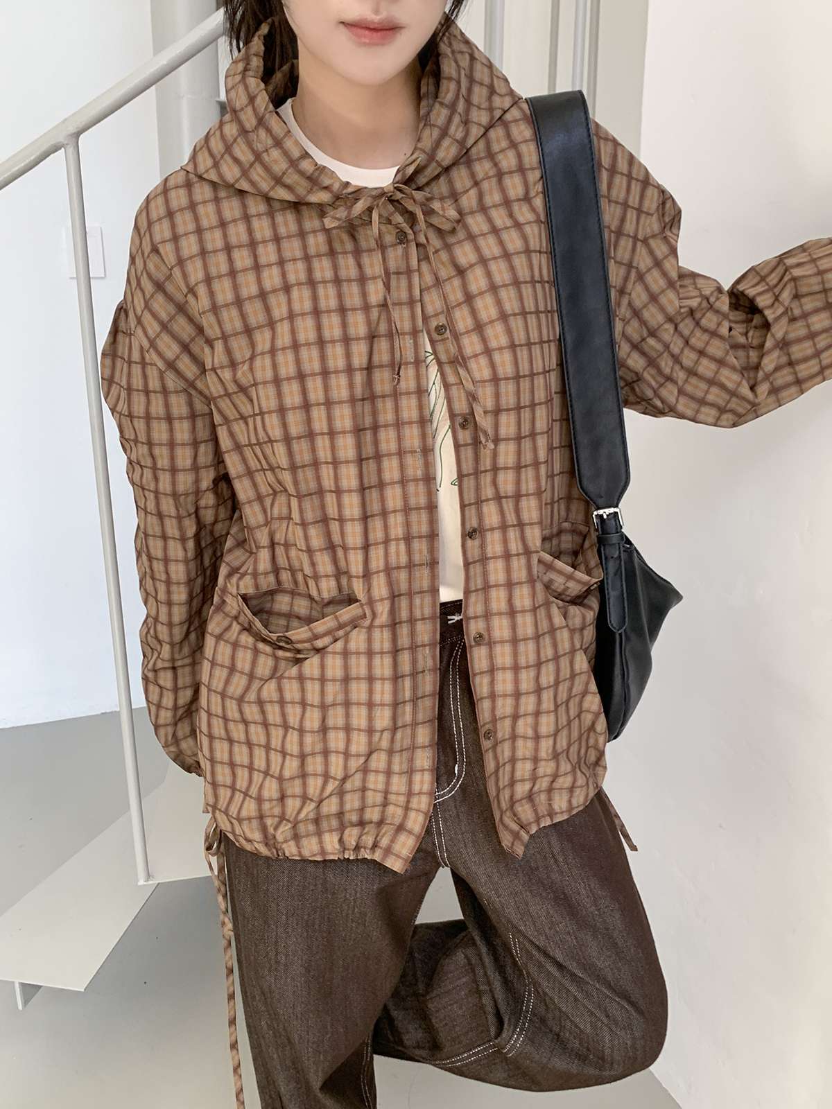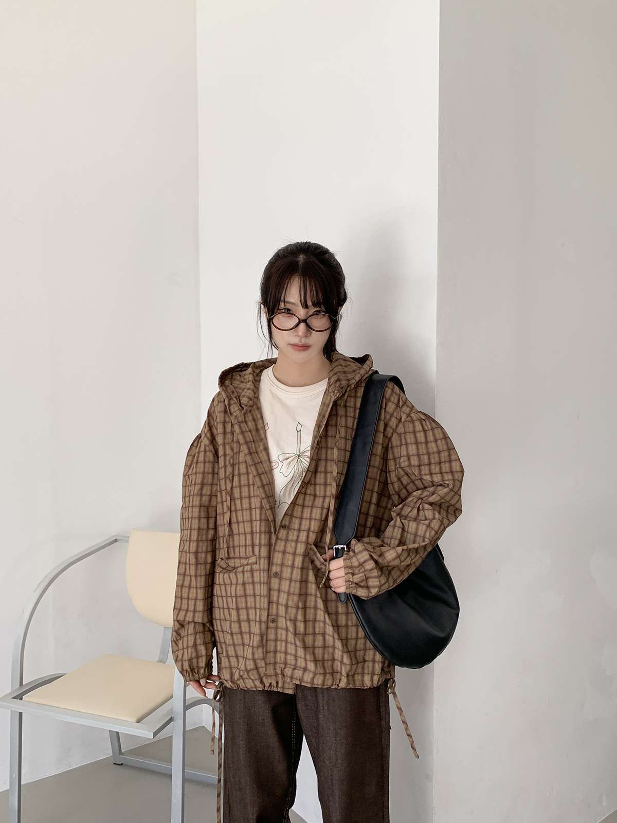 빈티지한 무드의 체크 패턴과 후드가 어우러져 세련된