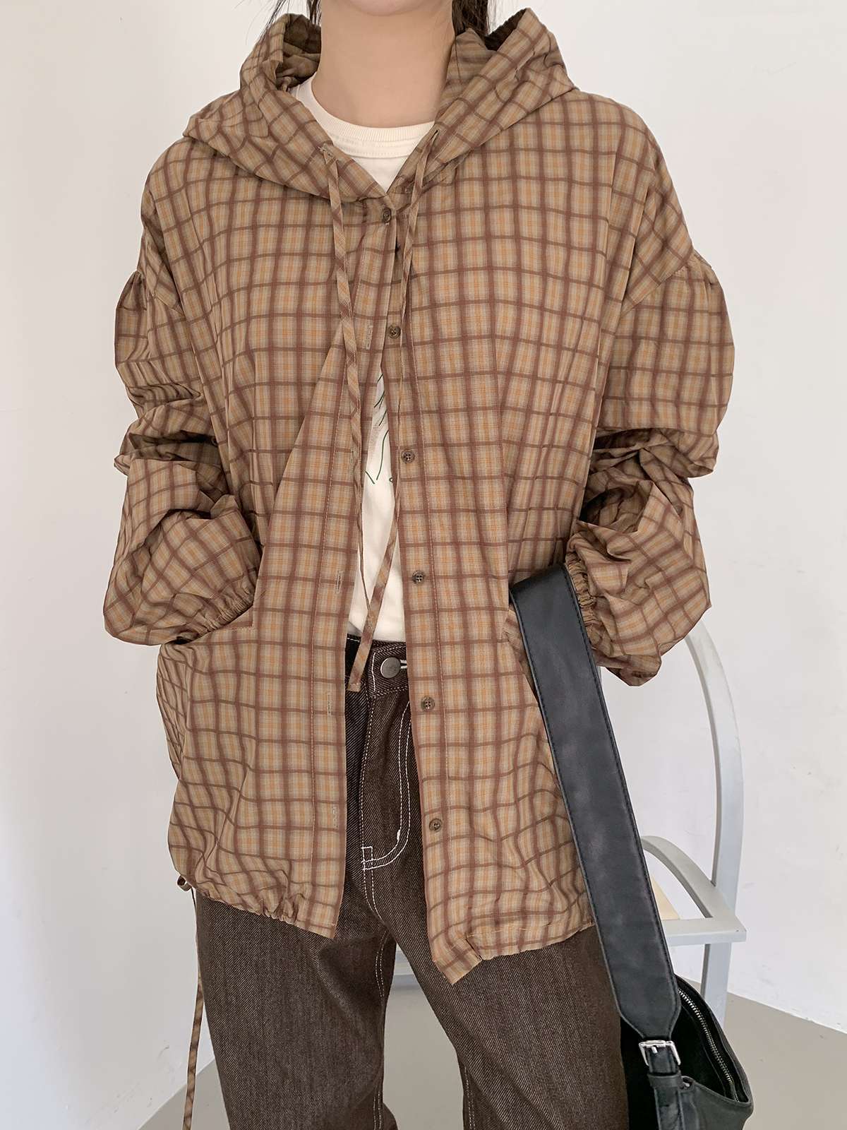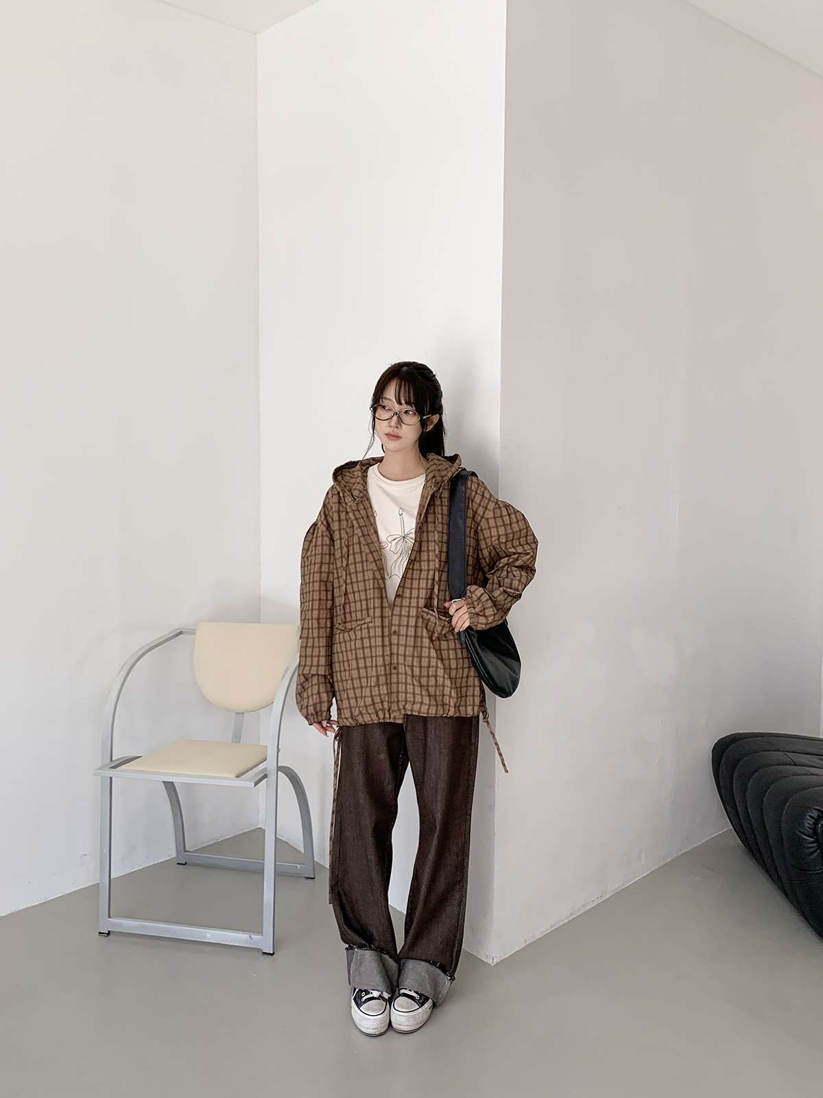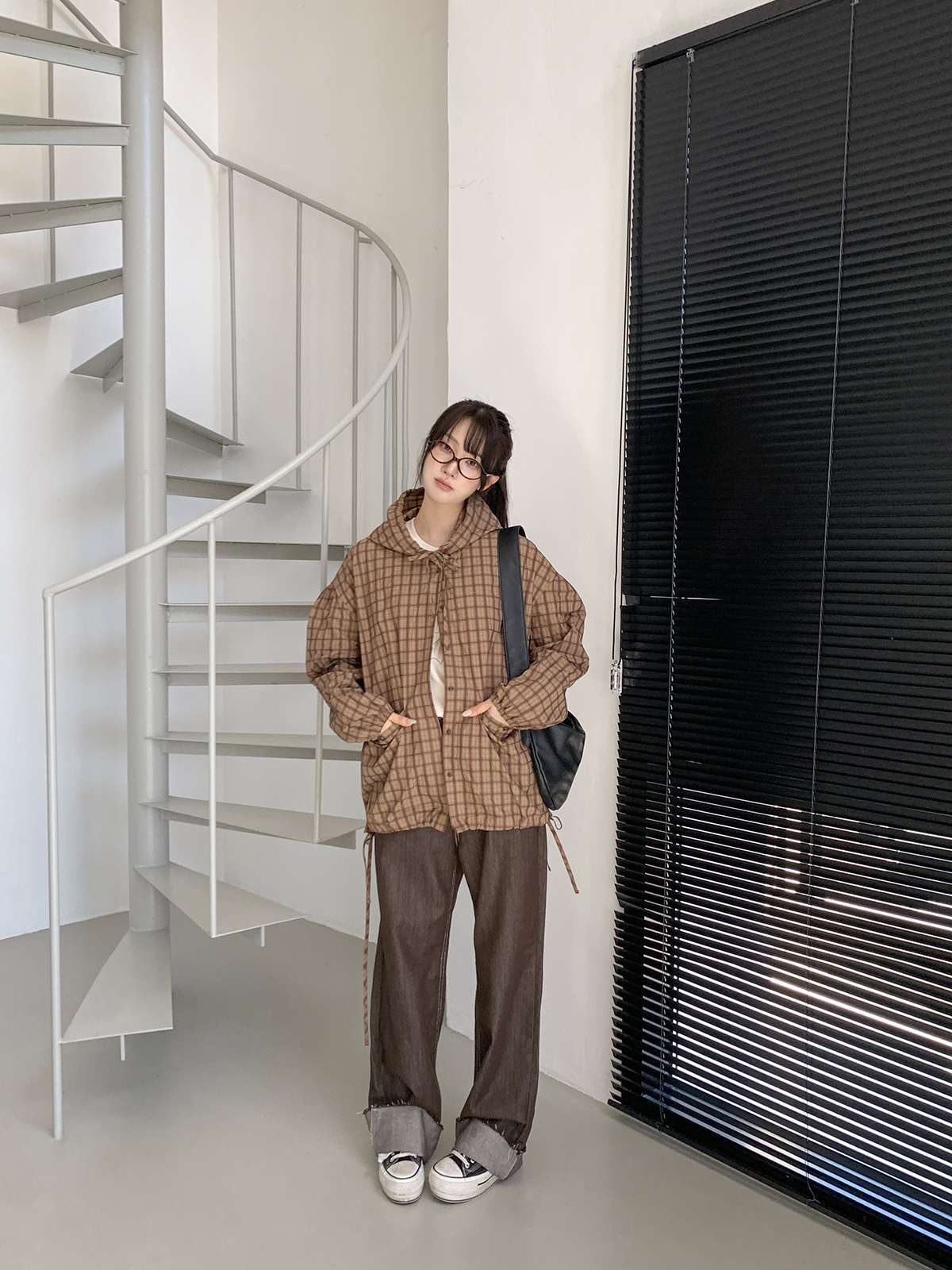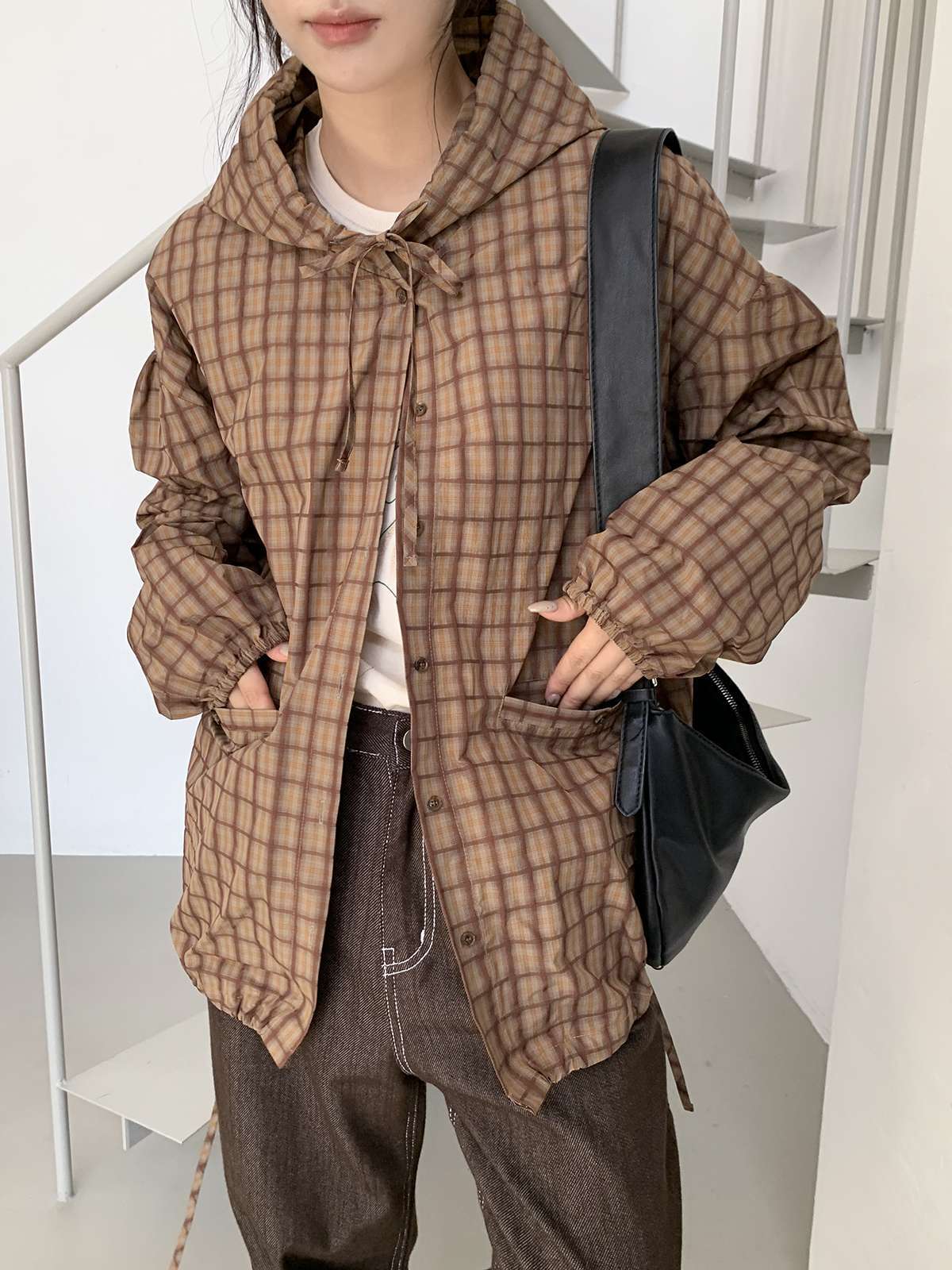 빈티지한 무드의 체크 패턴과 후드가 어우러져 세련된