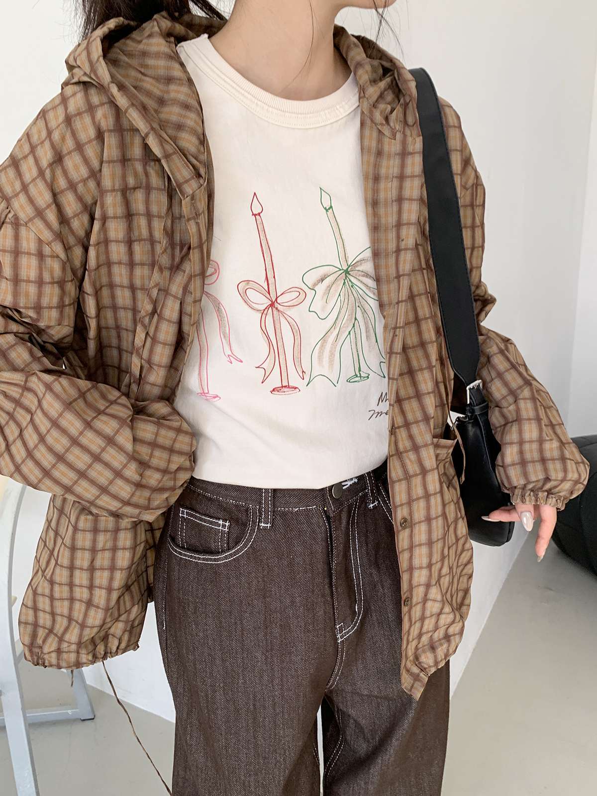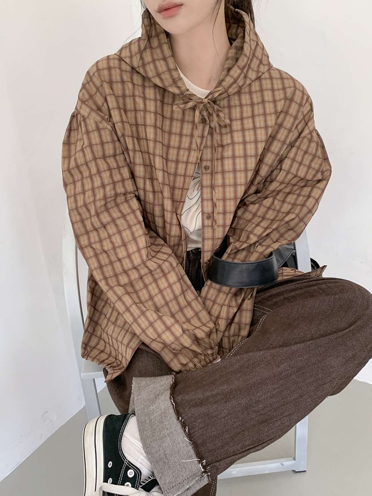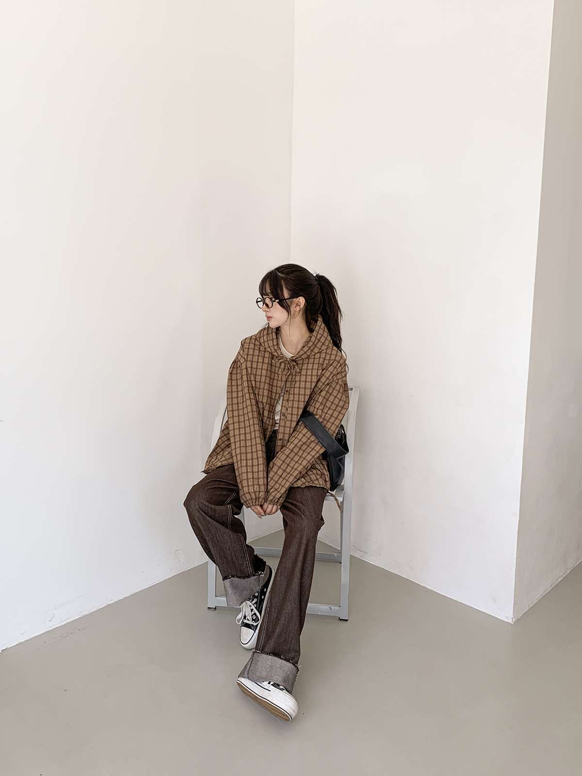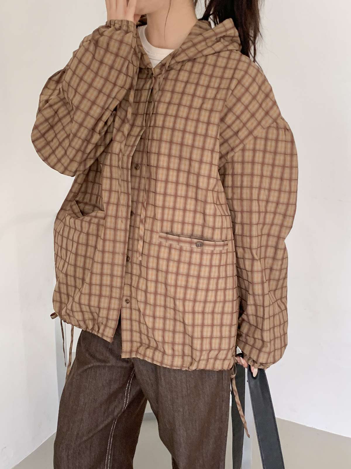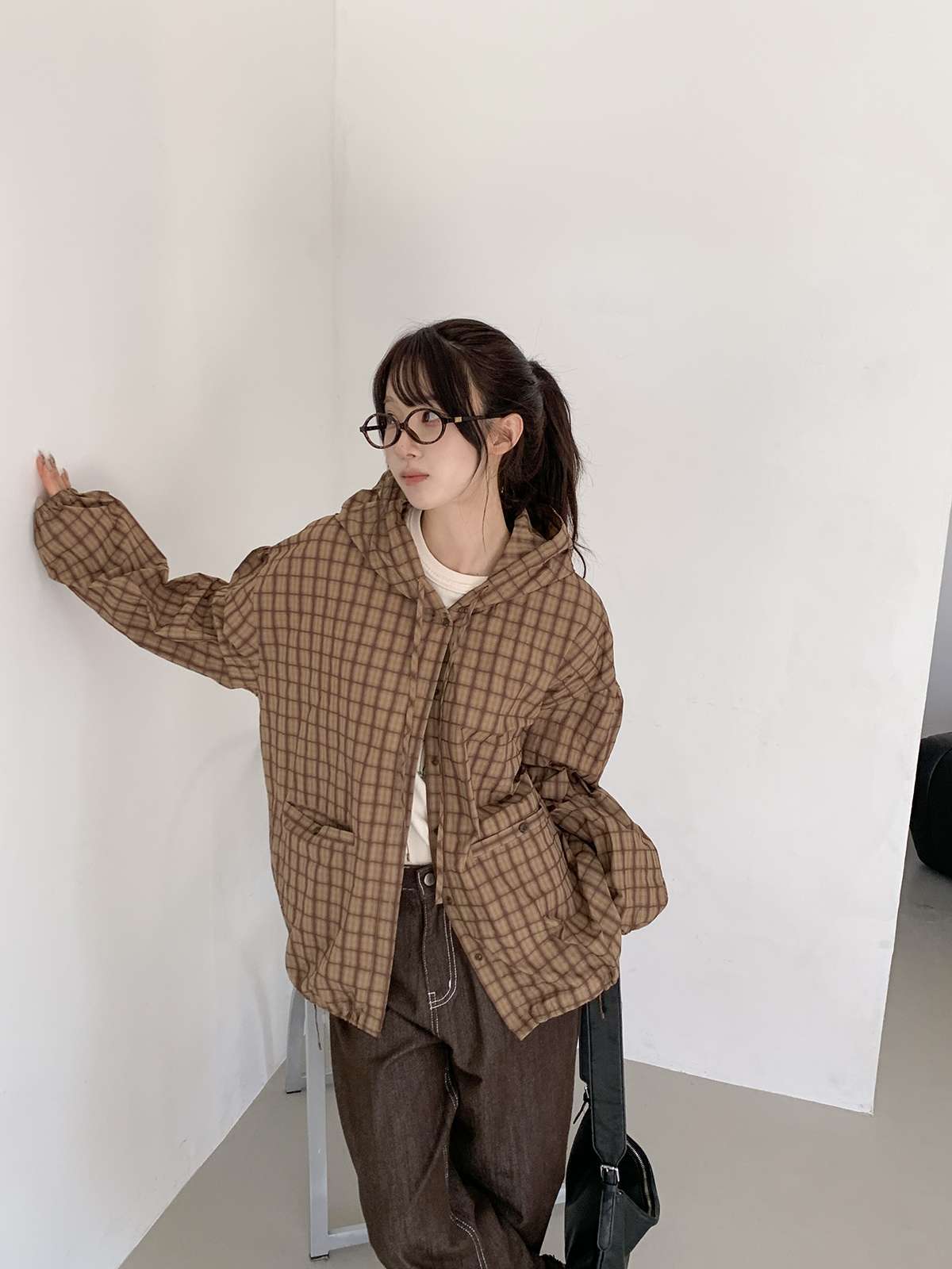 빈티지한 무드의 체크 패턴과 후드가 어우러져 세련된