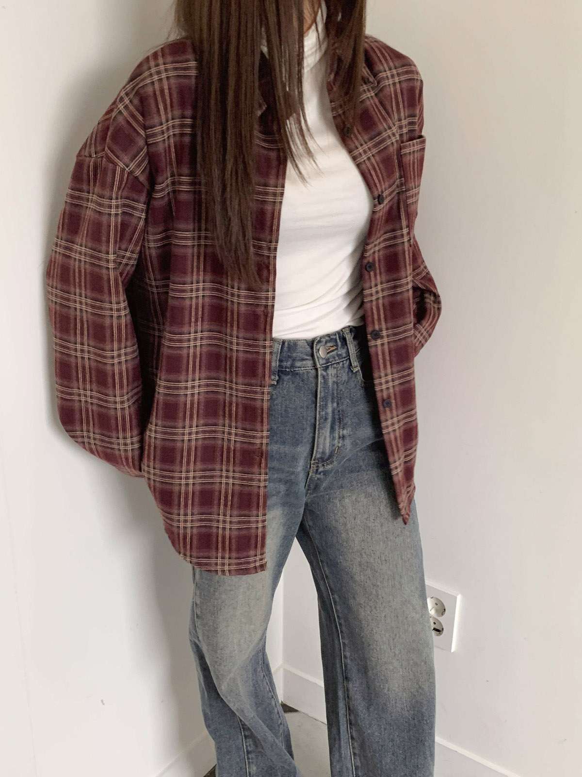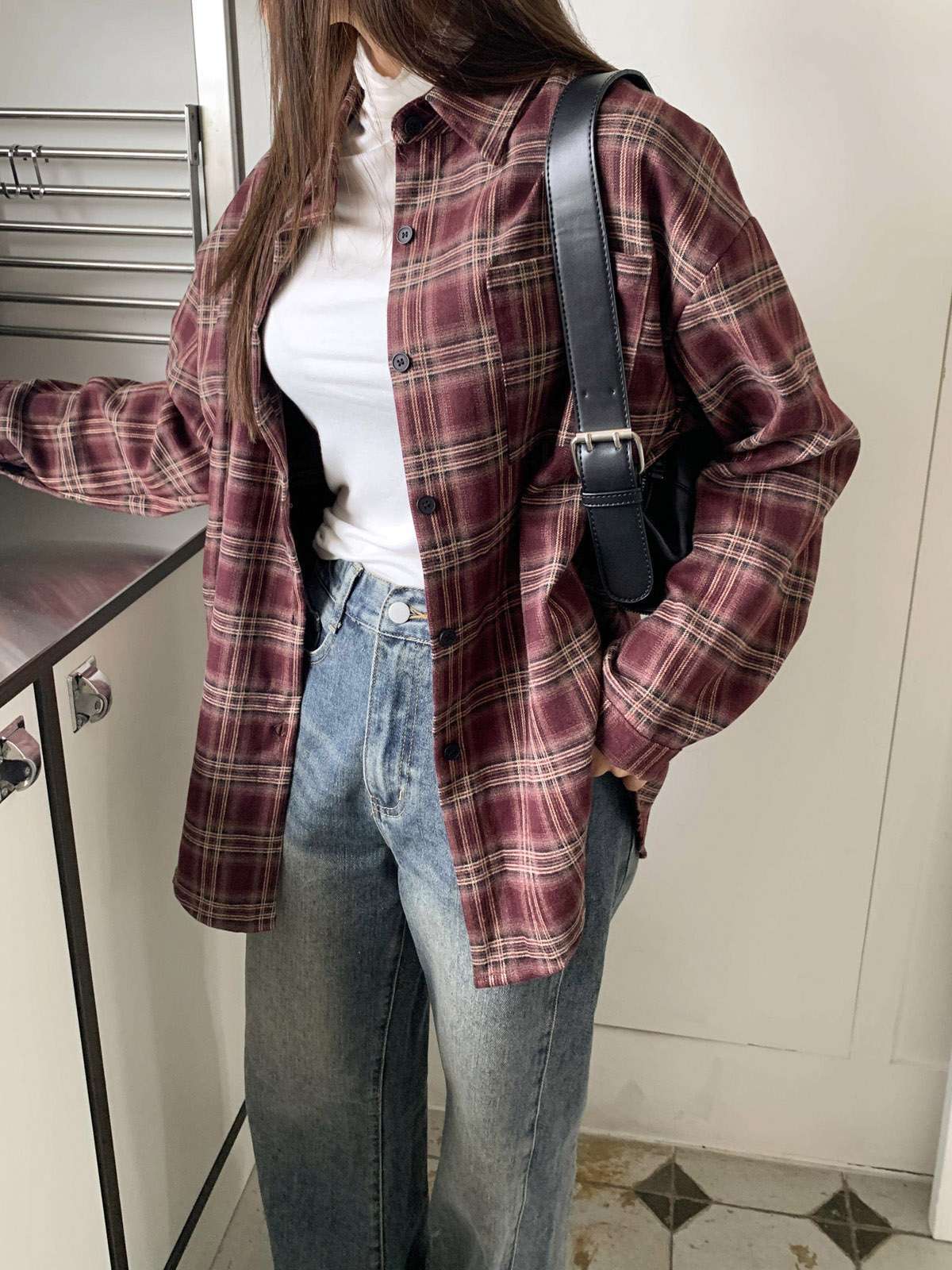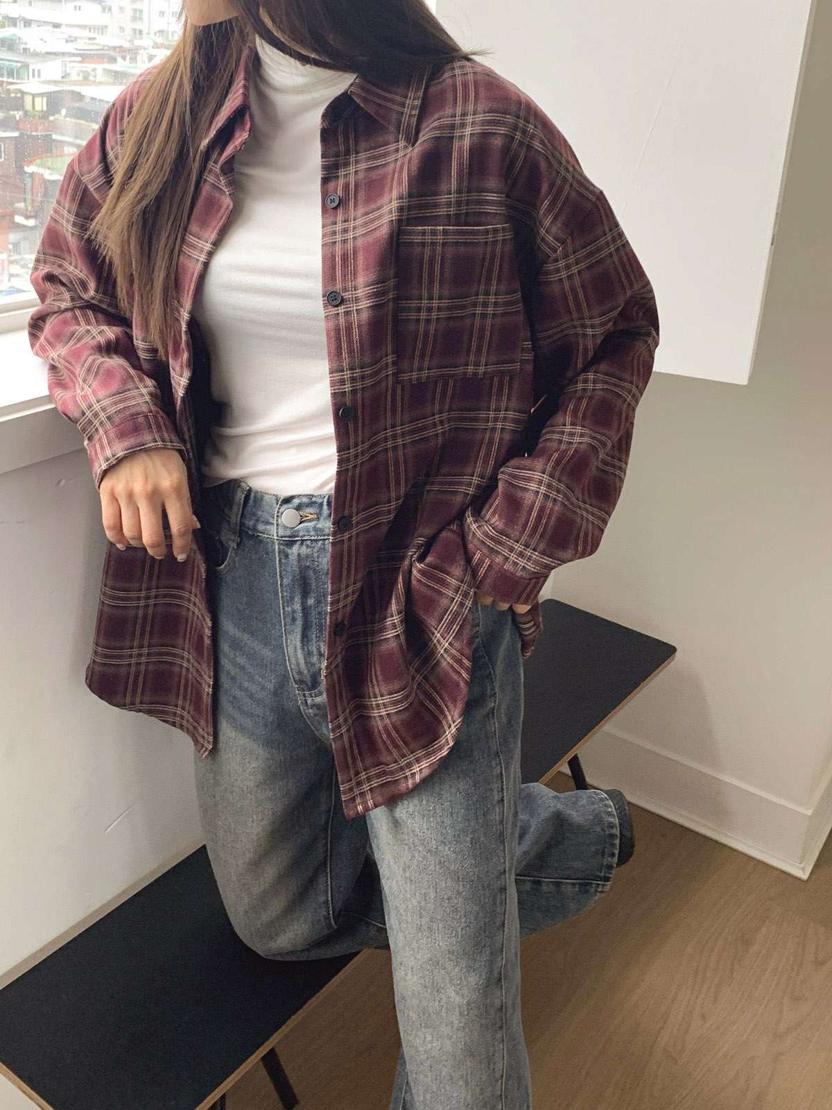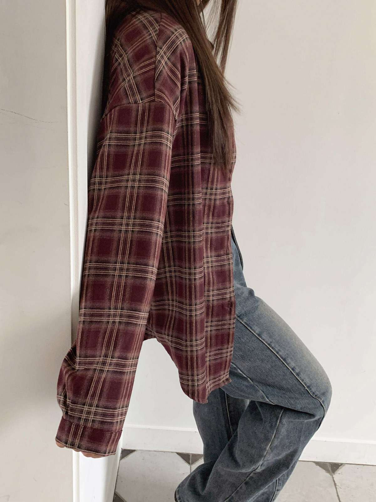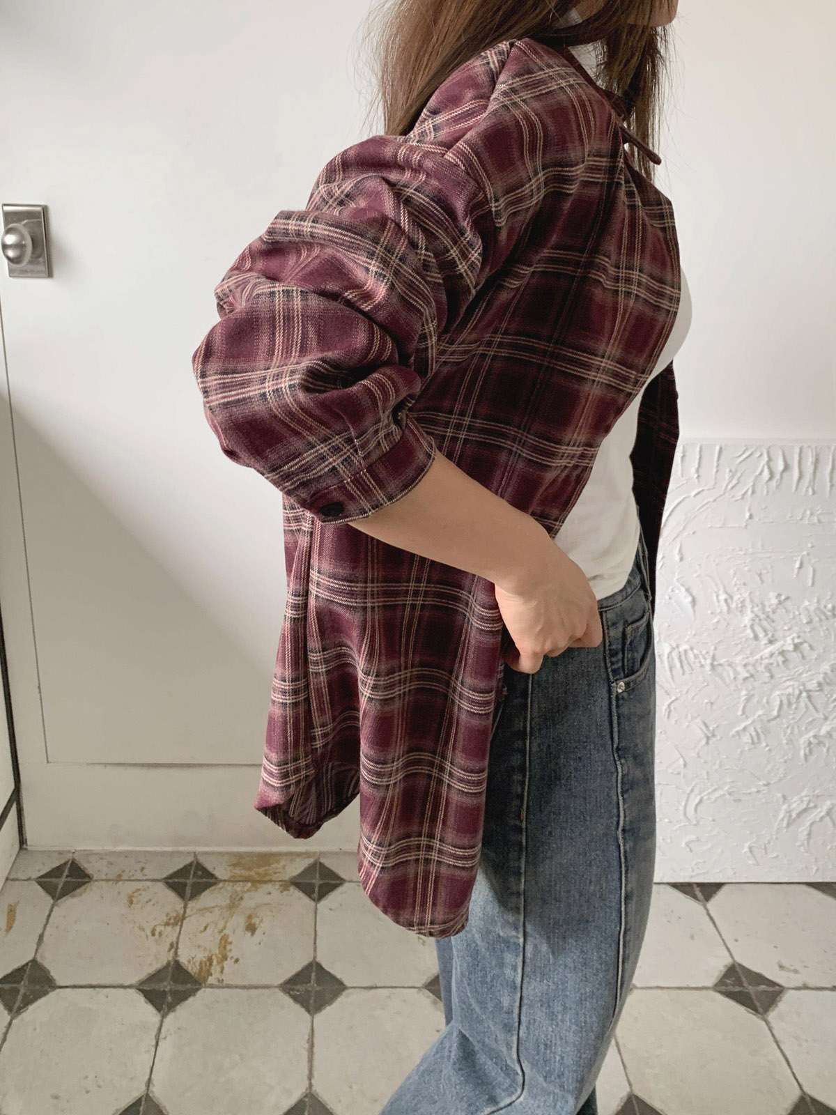 루즈하게 흐르듯이 떨어지는 핏의 체크 셔츠