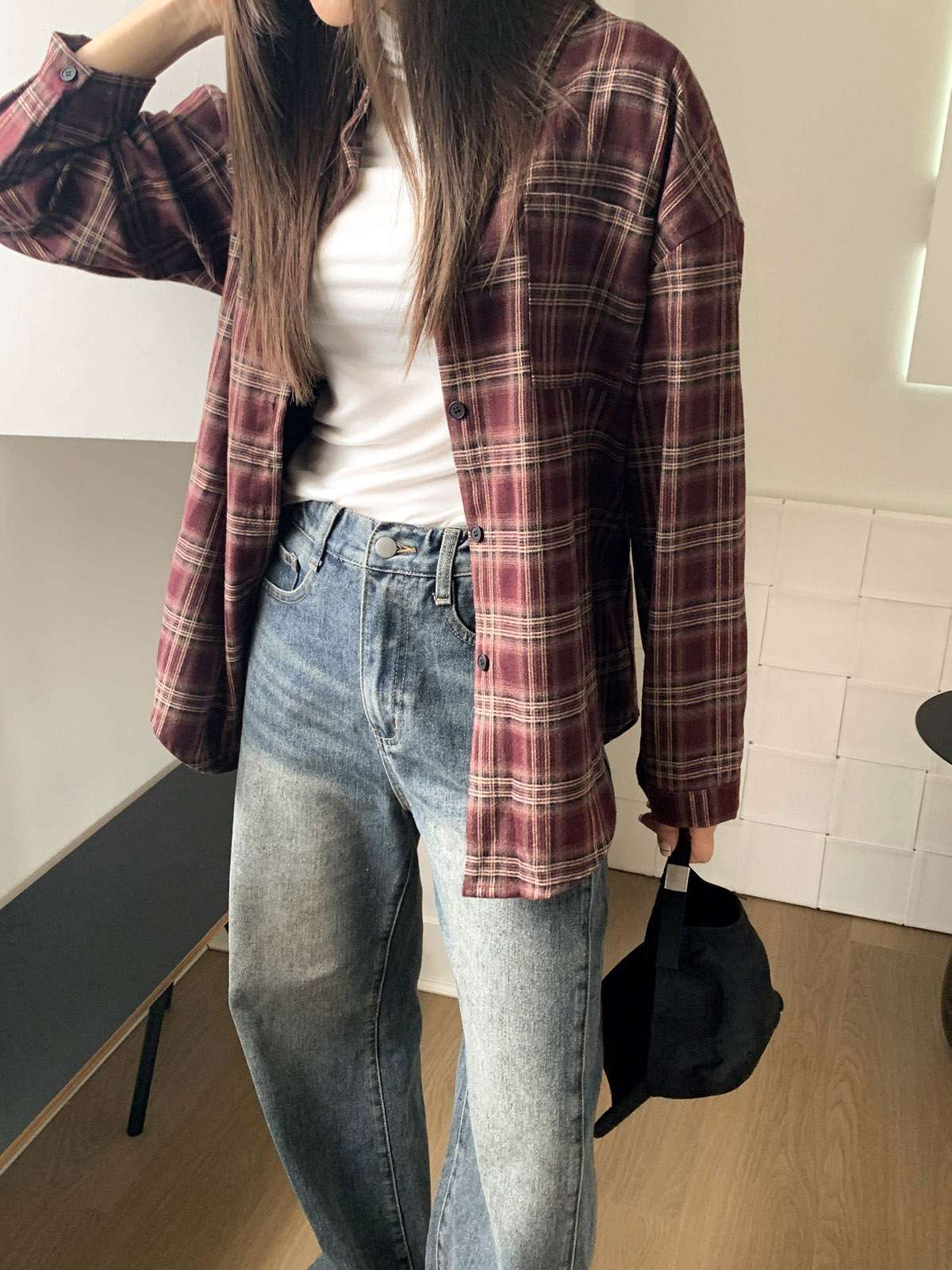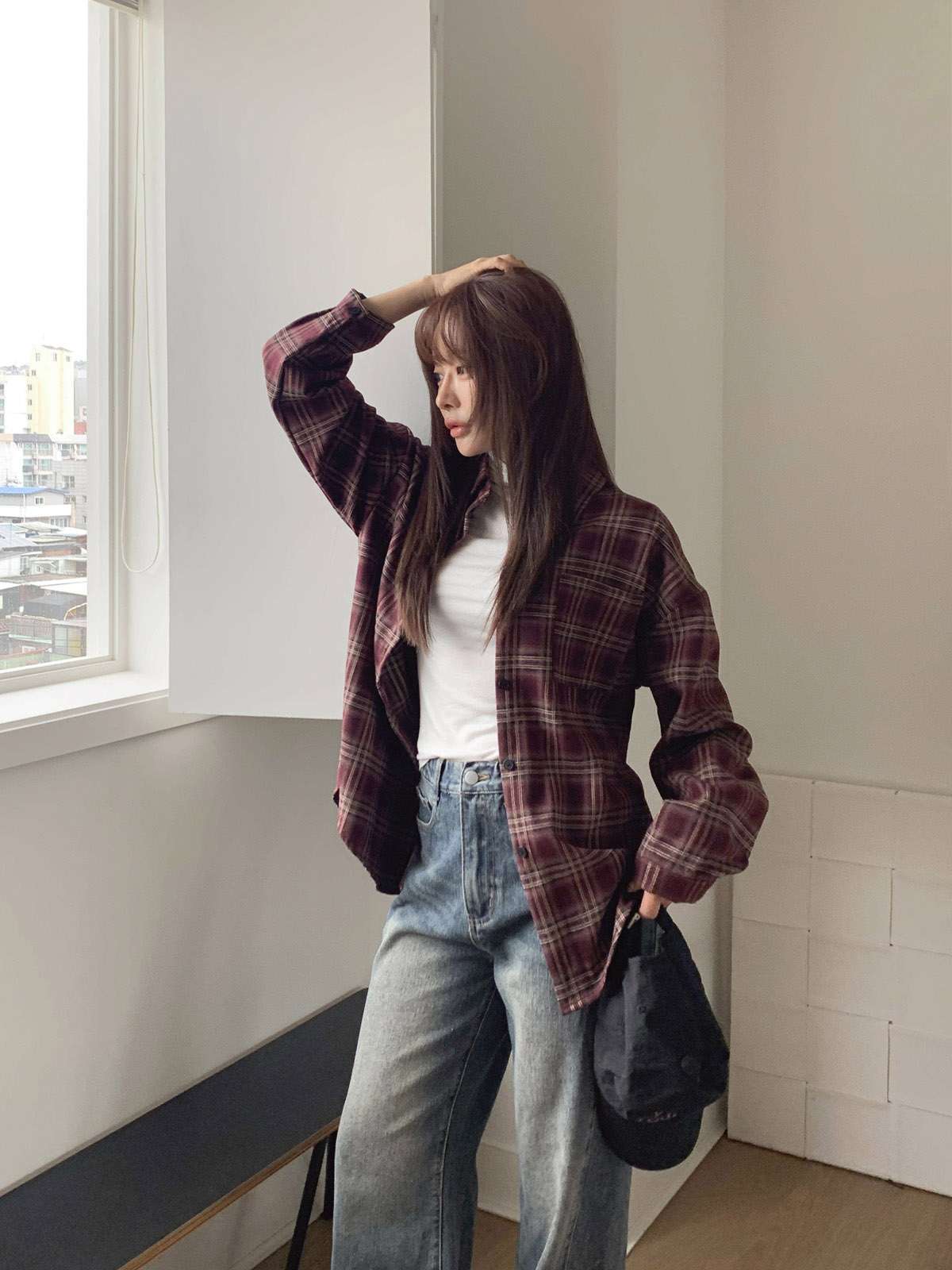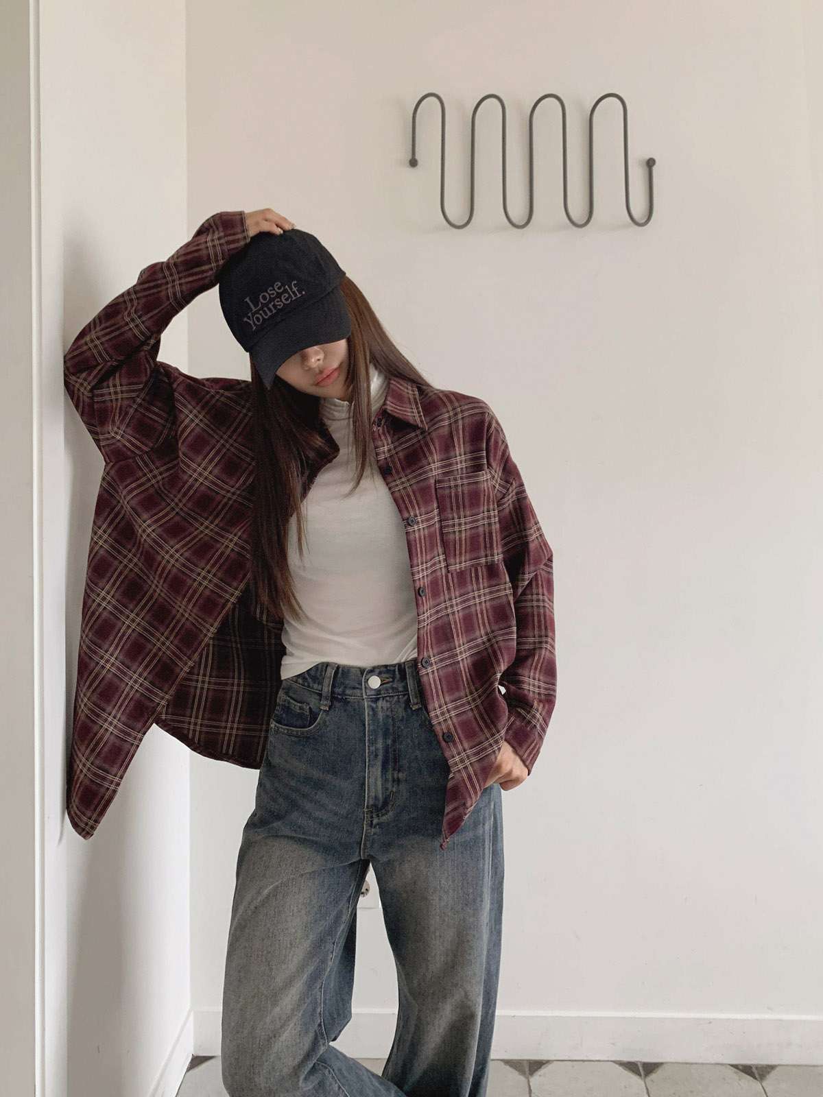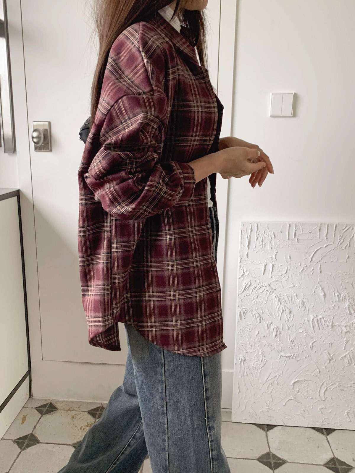 루즈하게 흐르듯이 떨어지는 핏의 체크 셔츠