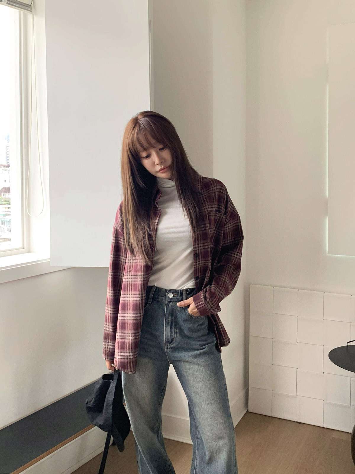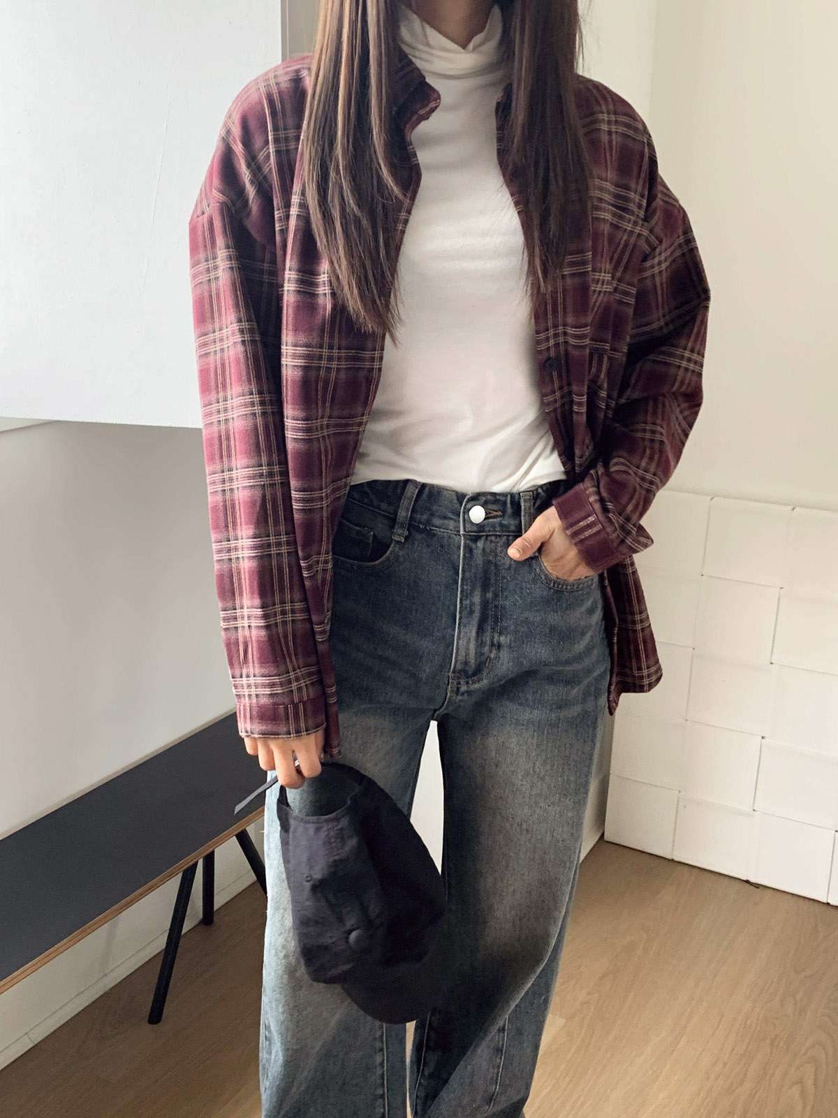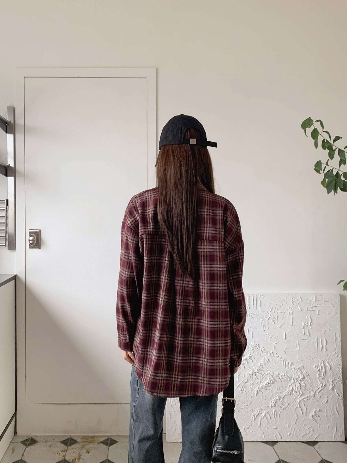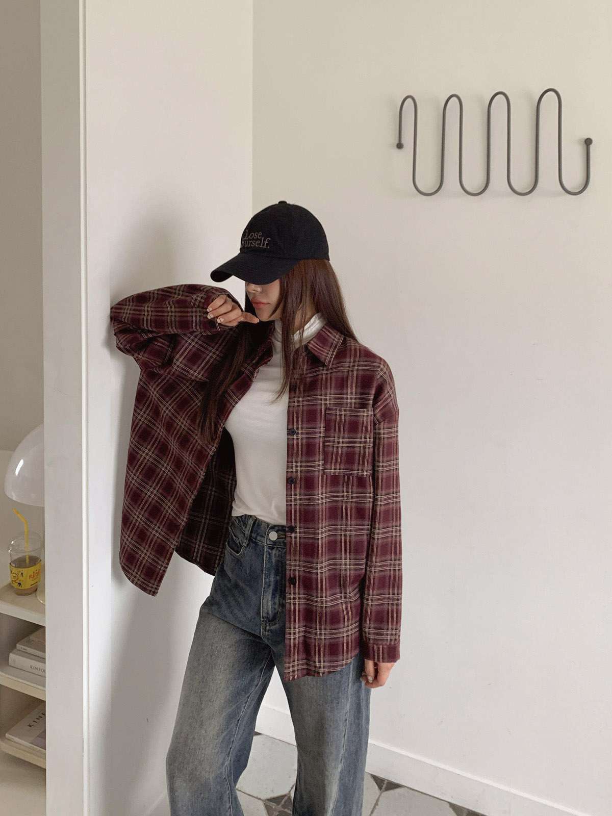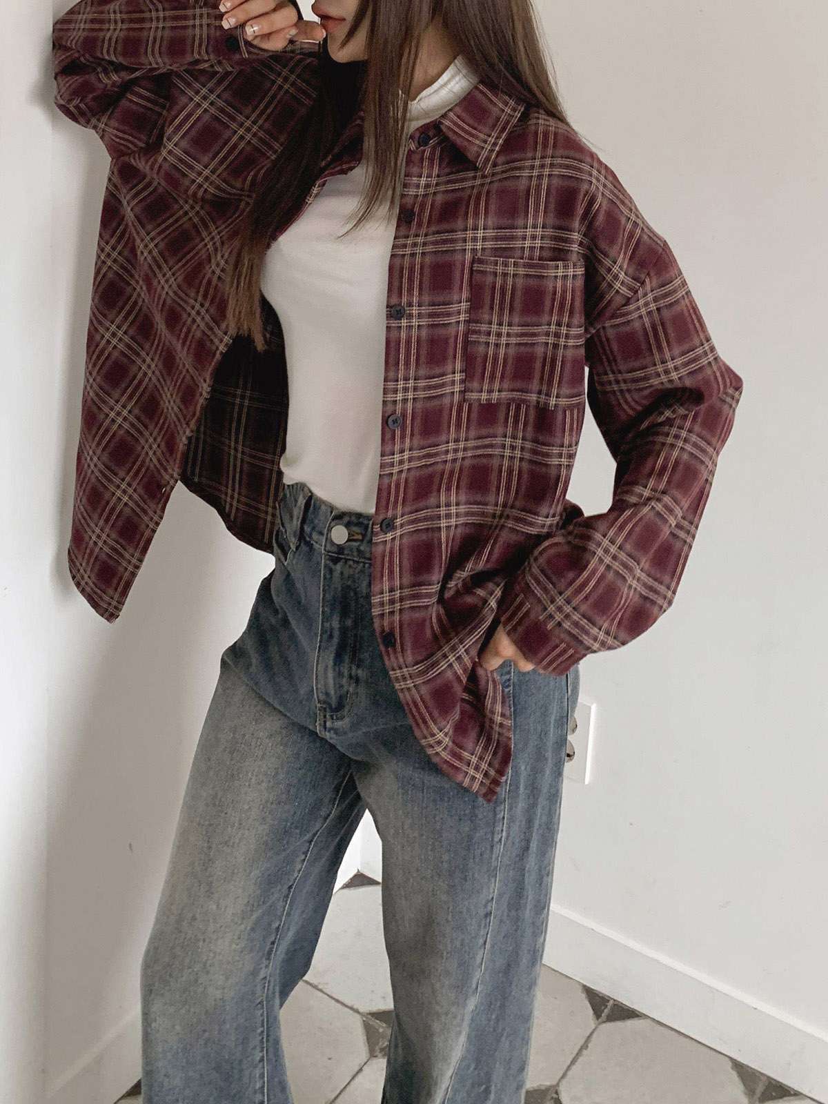 루즈하게 흐르듯이 떨어지는 핏의 체크 셔츠