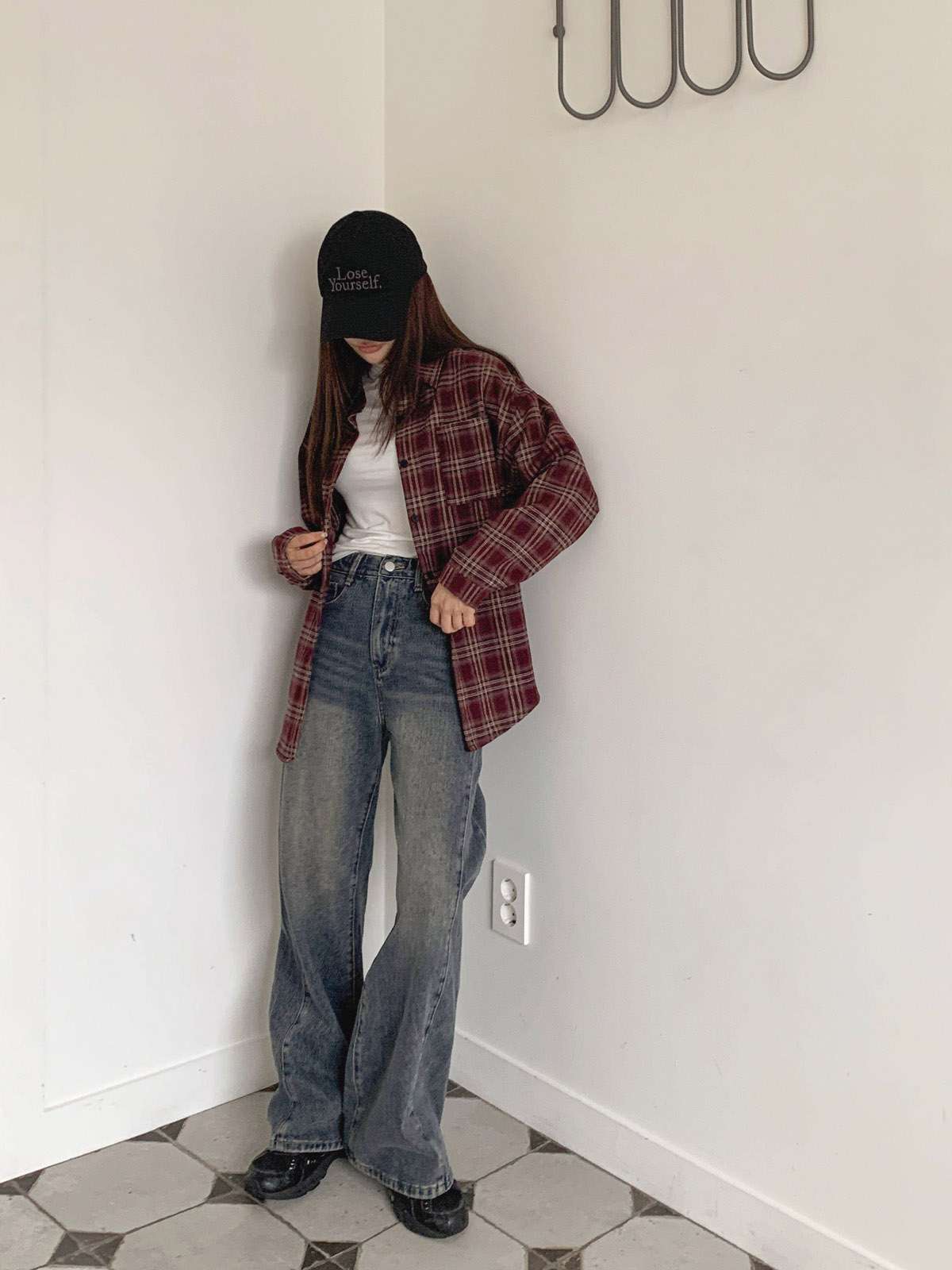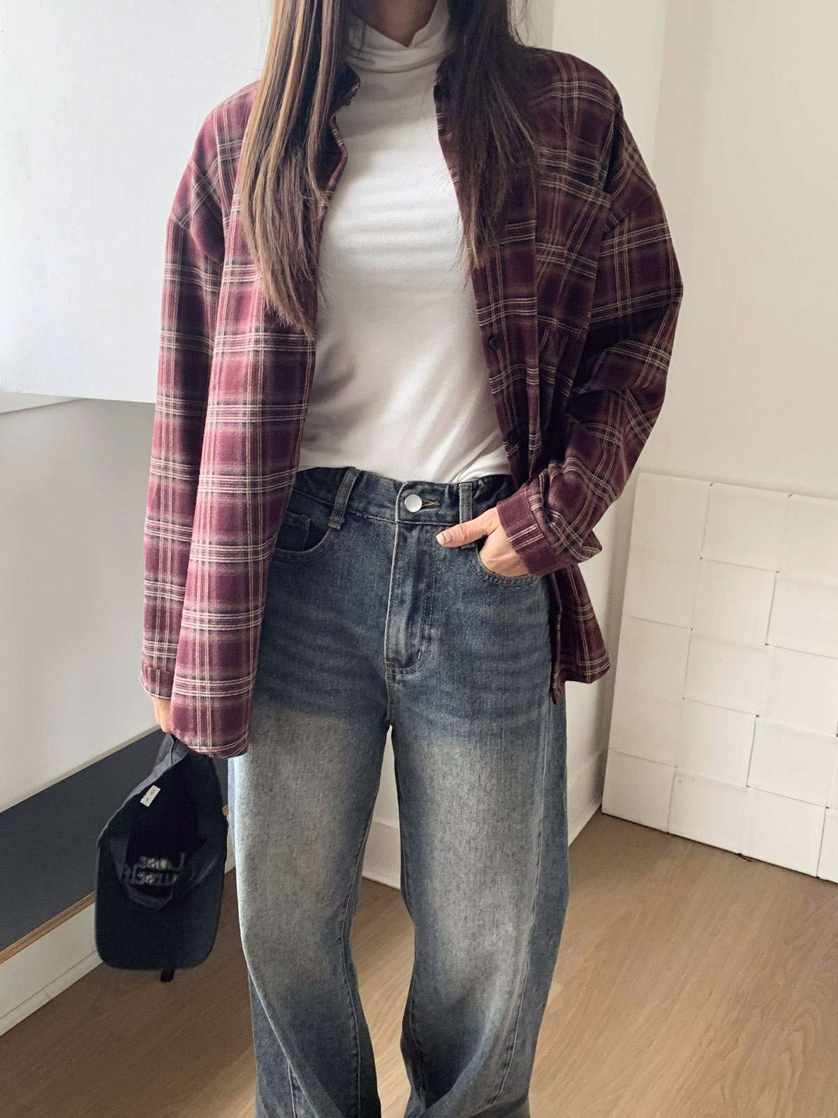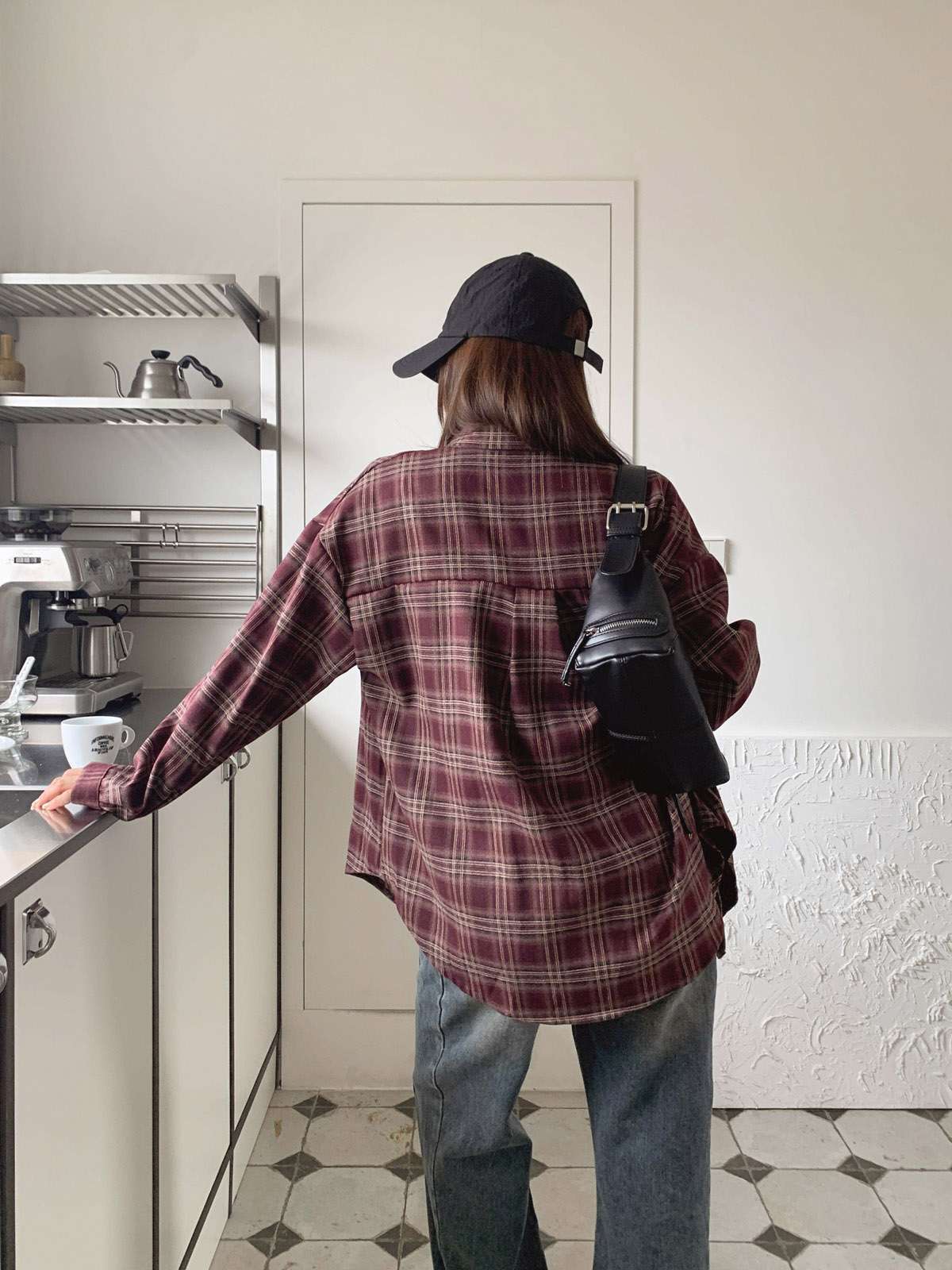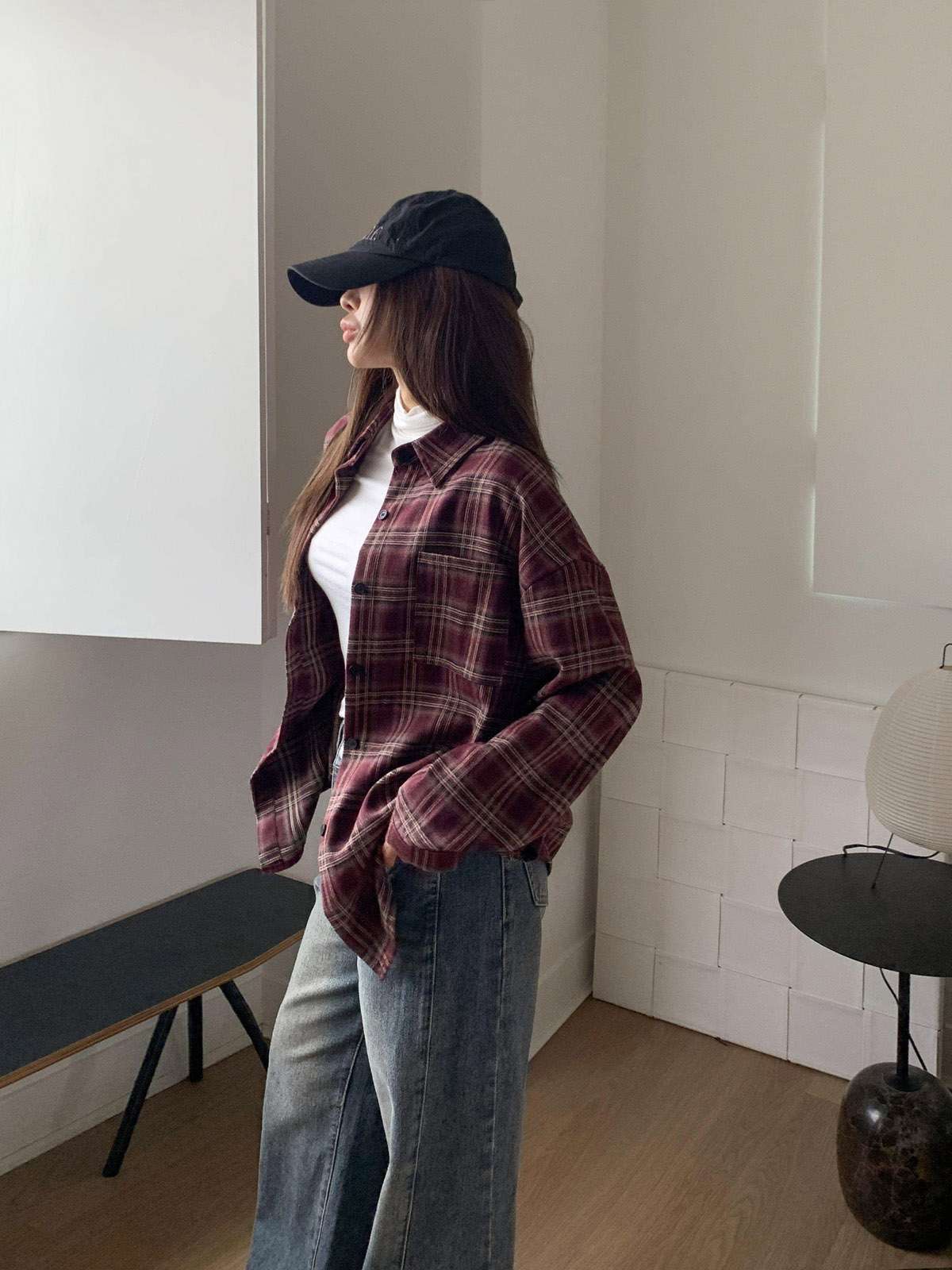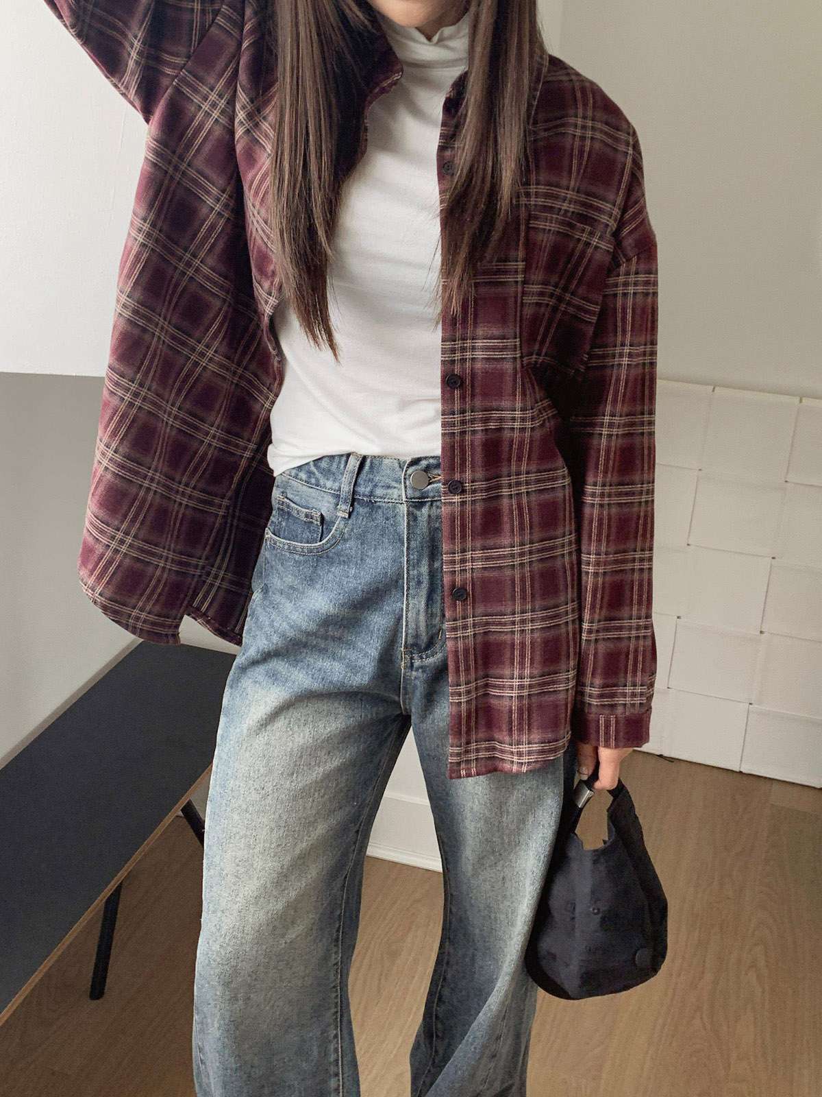 루즈하게 흐르듯이 떨어지는 핏의 체크 셔츠