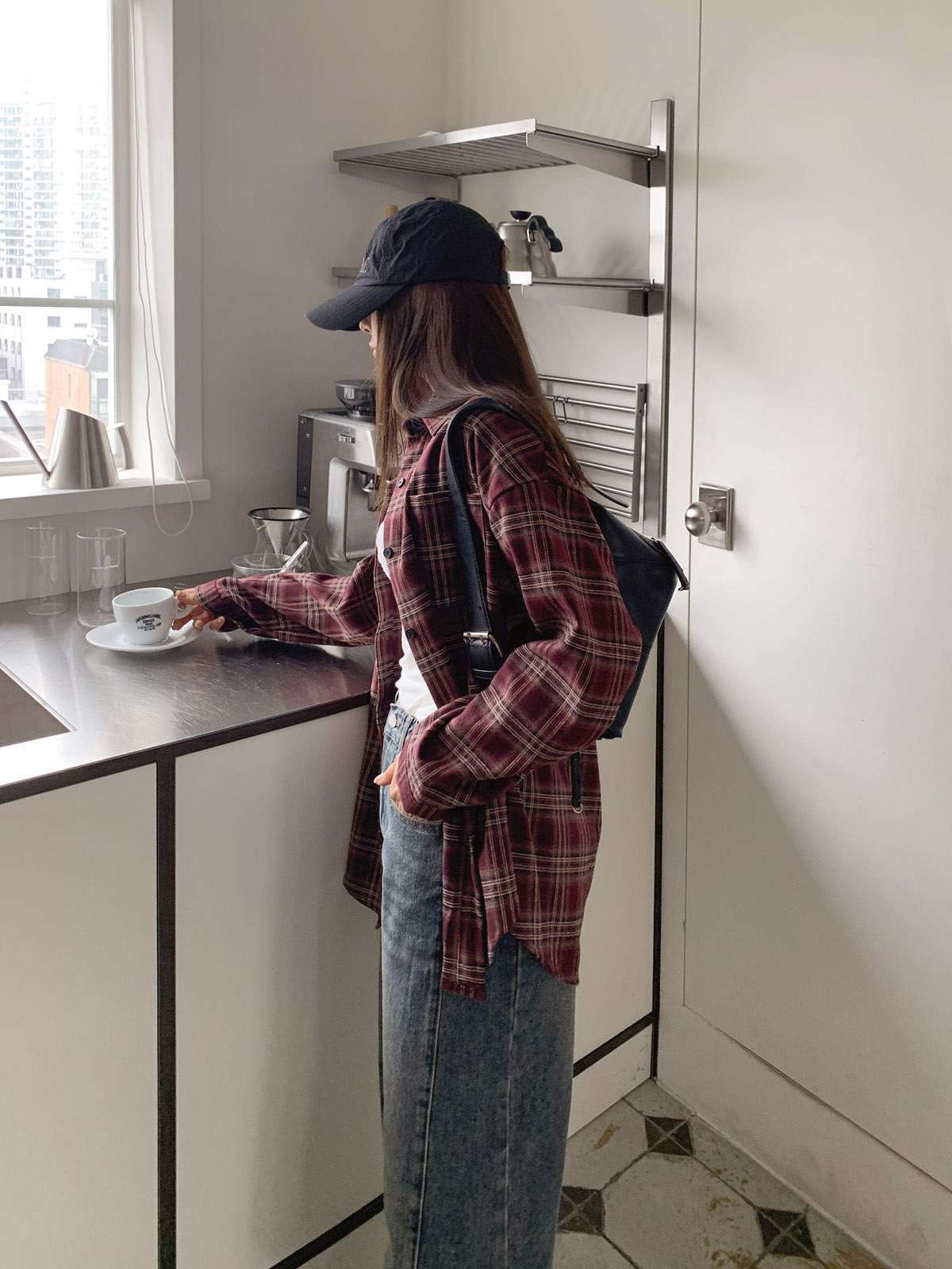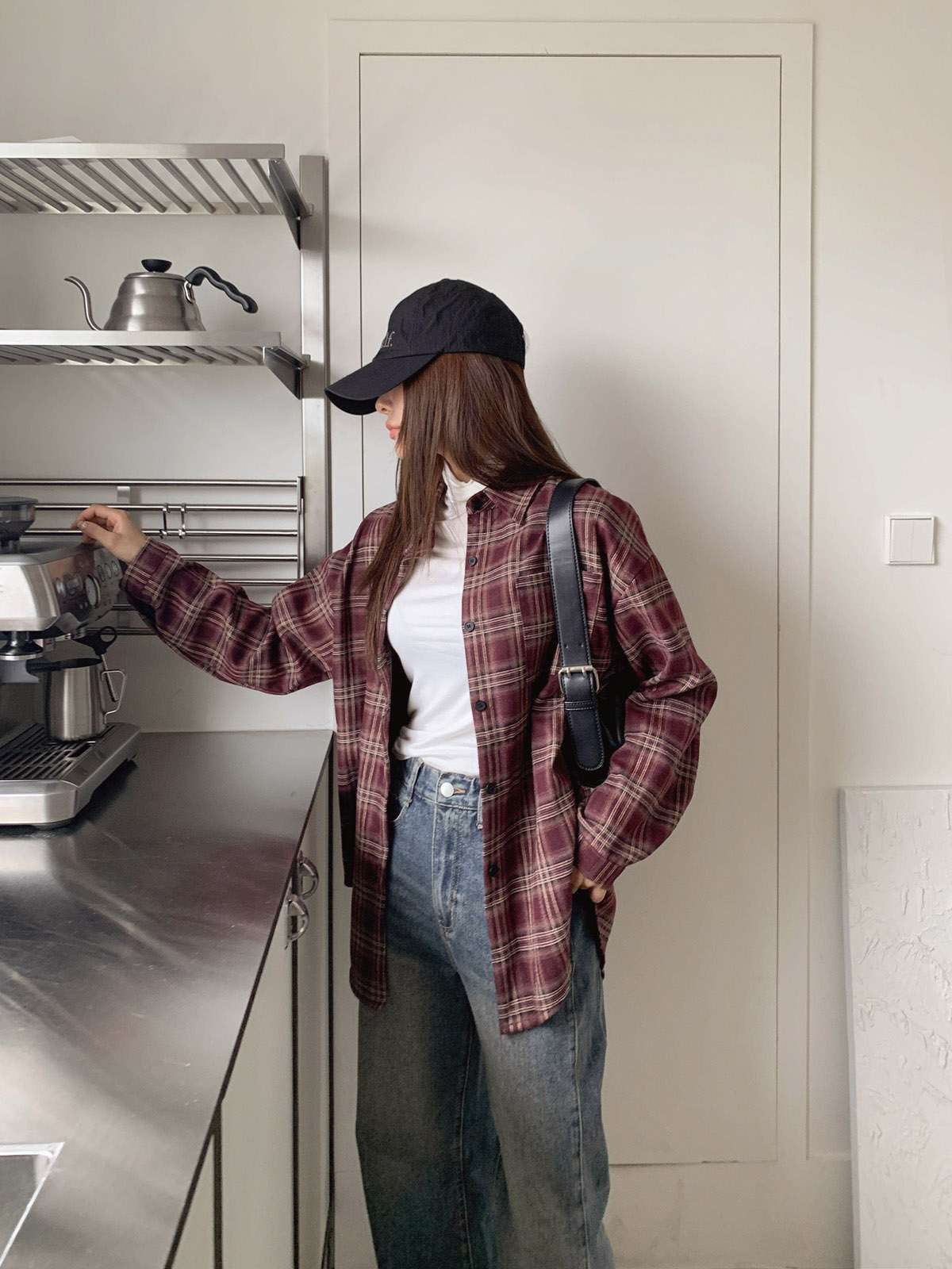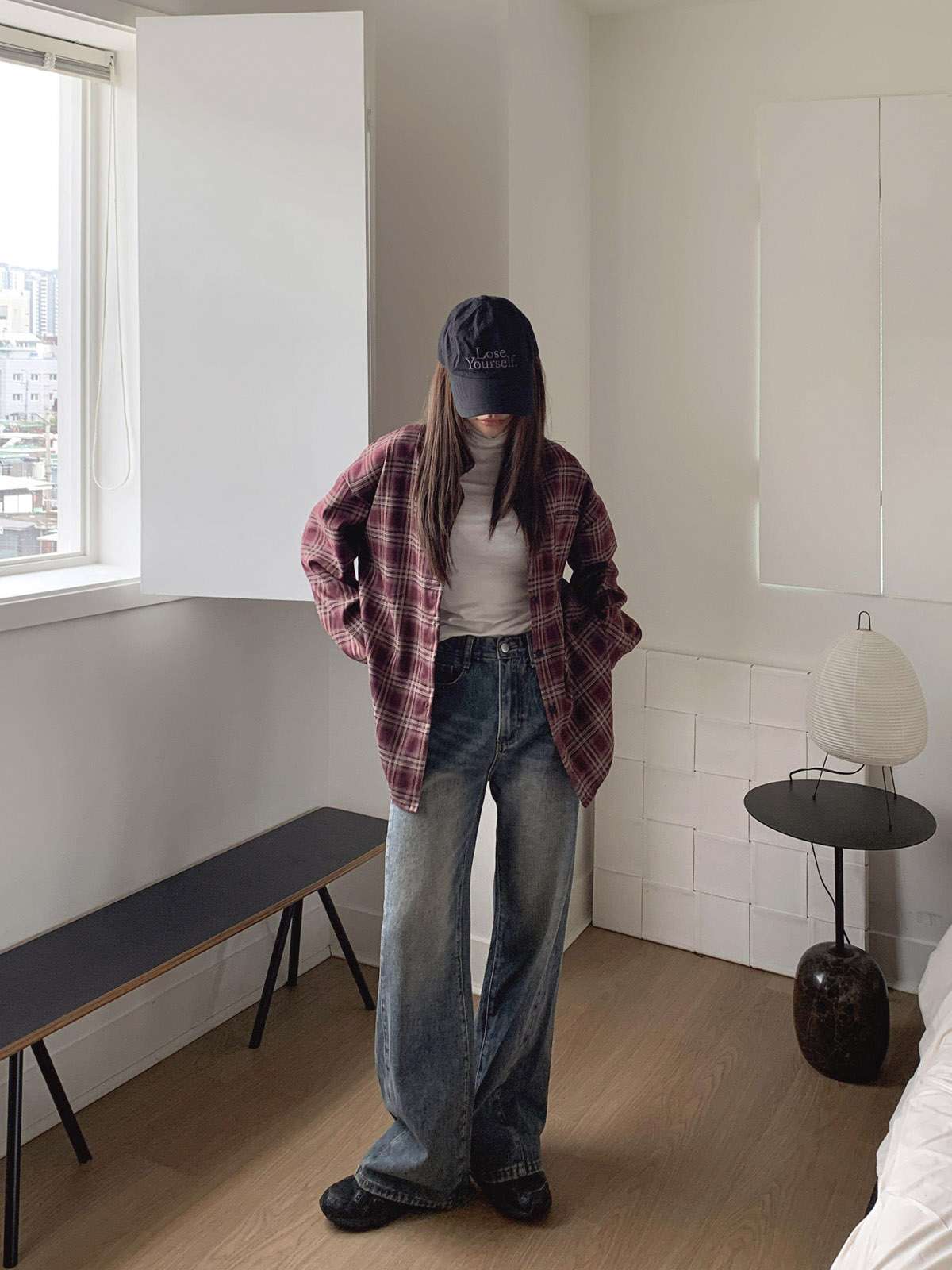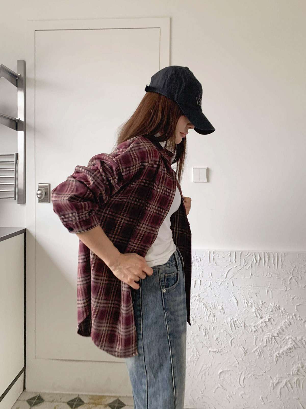 루즈하게 흐르듯이 떨어지는 핏의 체크 셔츠