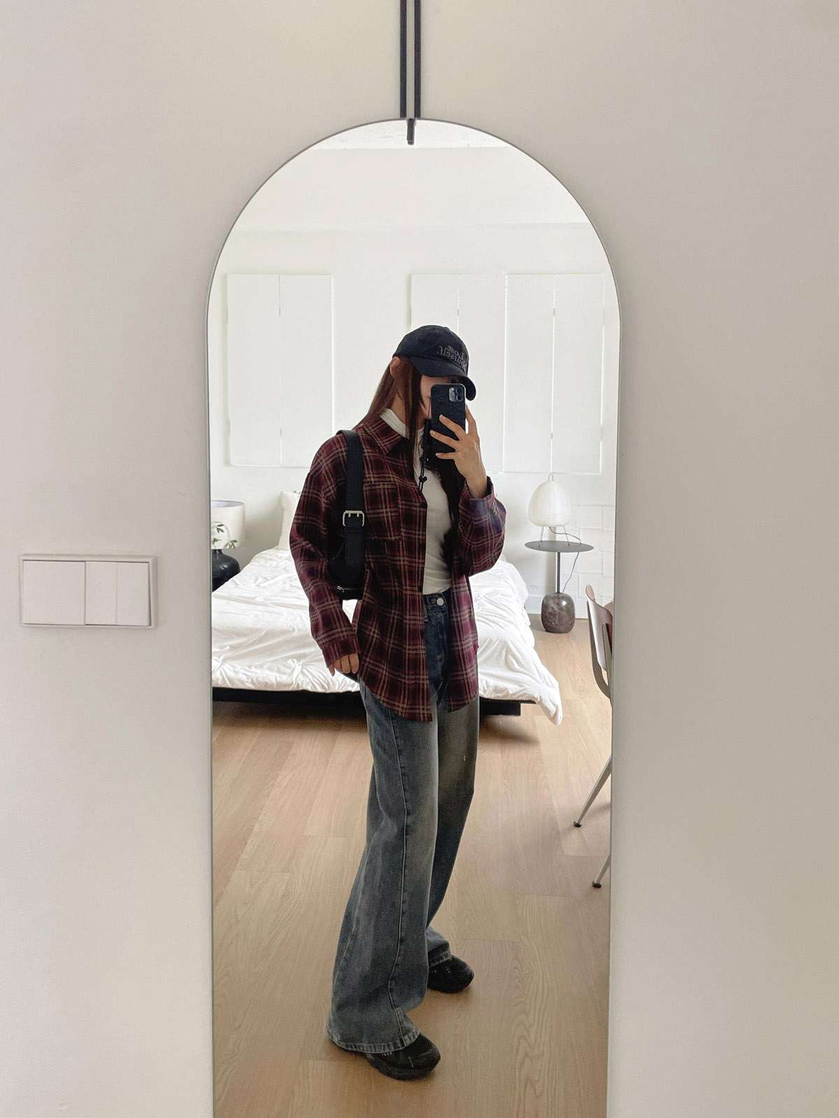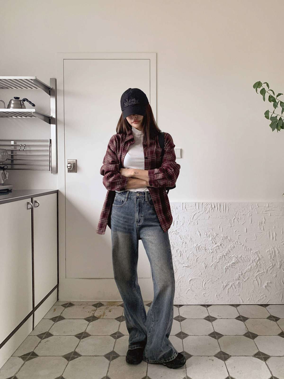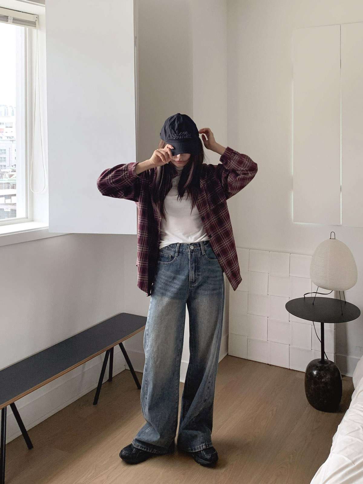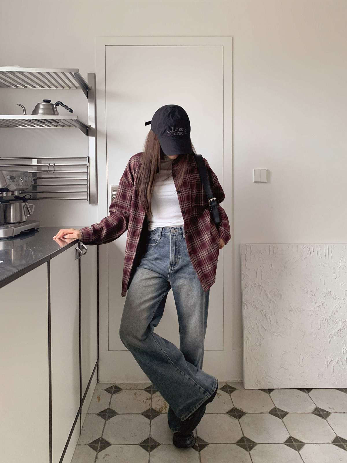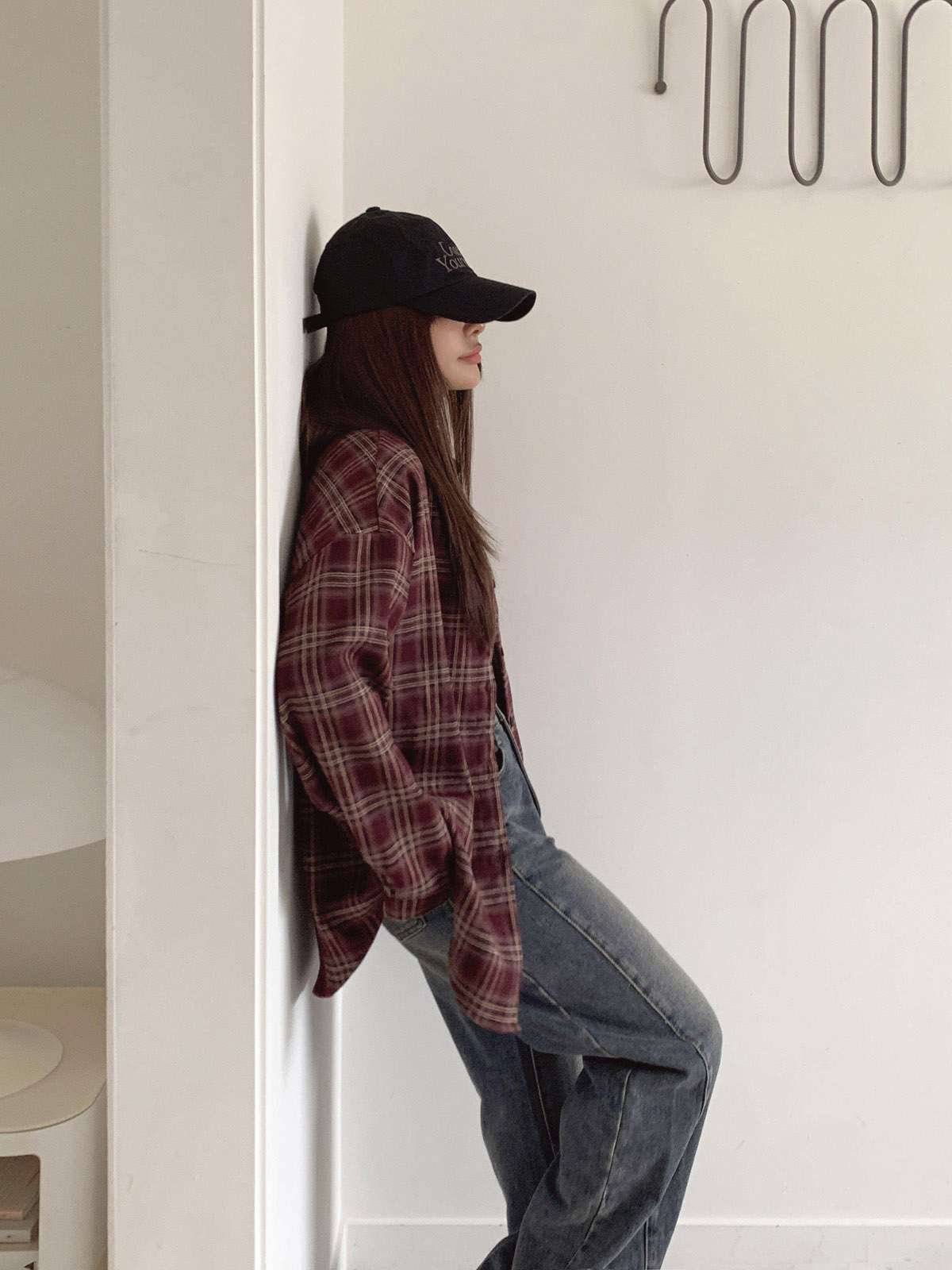 루즈하게 흐르듯이 떨어지는 핏의 체크 셔츠