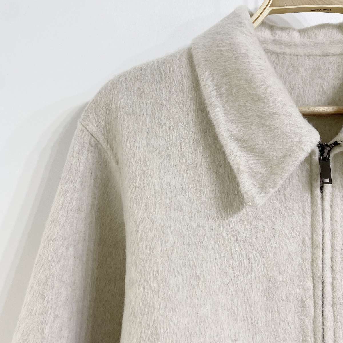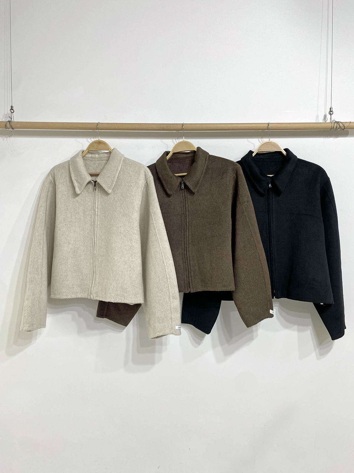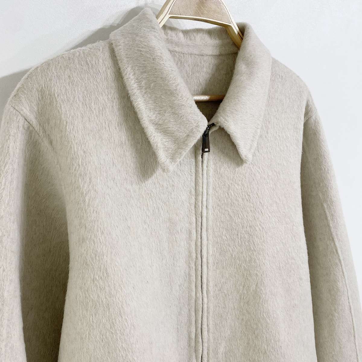 울 혼방 소재와 핸드메이드 마감으로 고급스러운 카라 집업 자켓