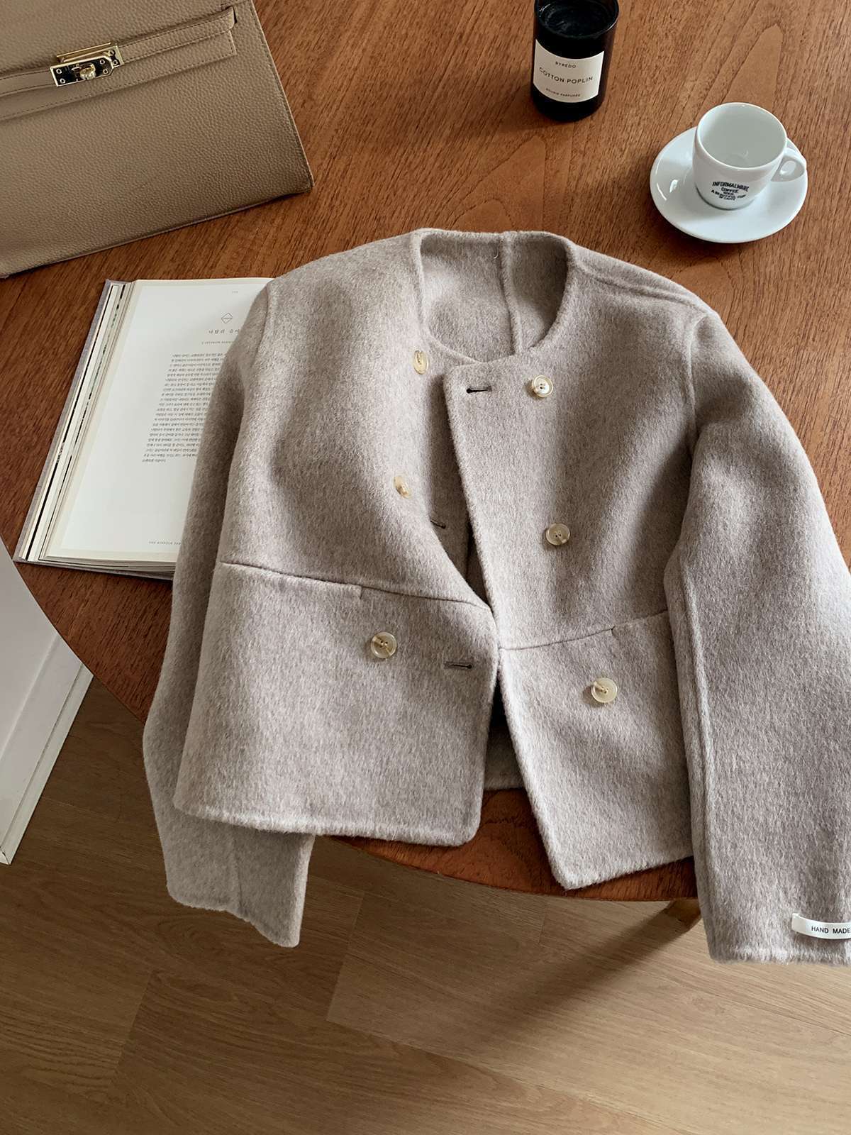클래식한 더블 버튼 디자인의 핸드메이드 숏 울 자켓