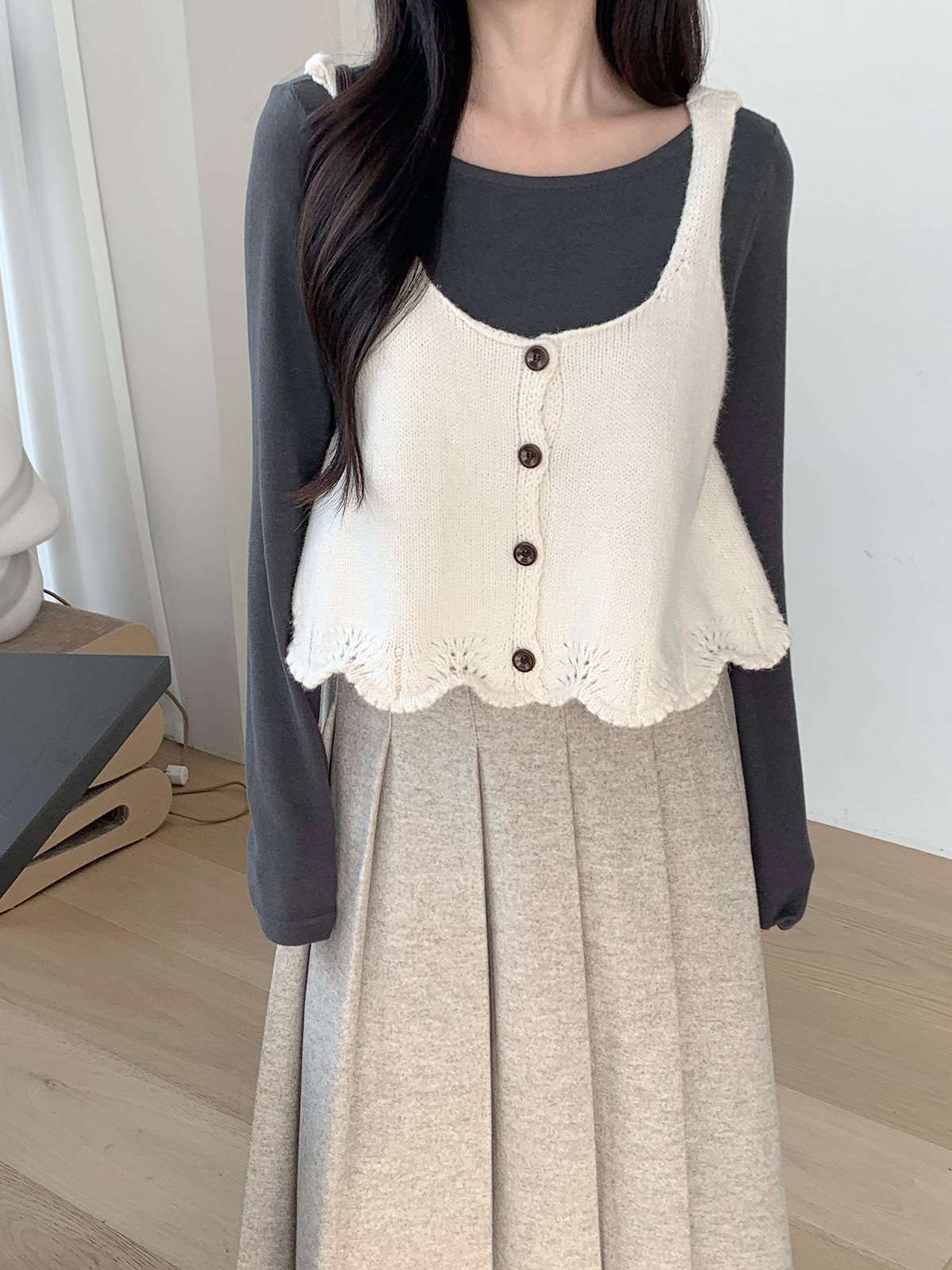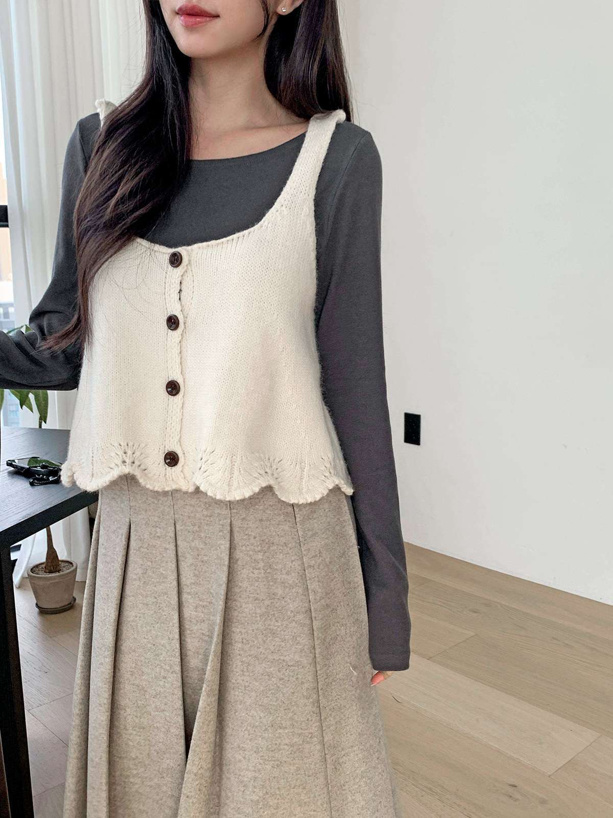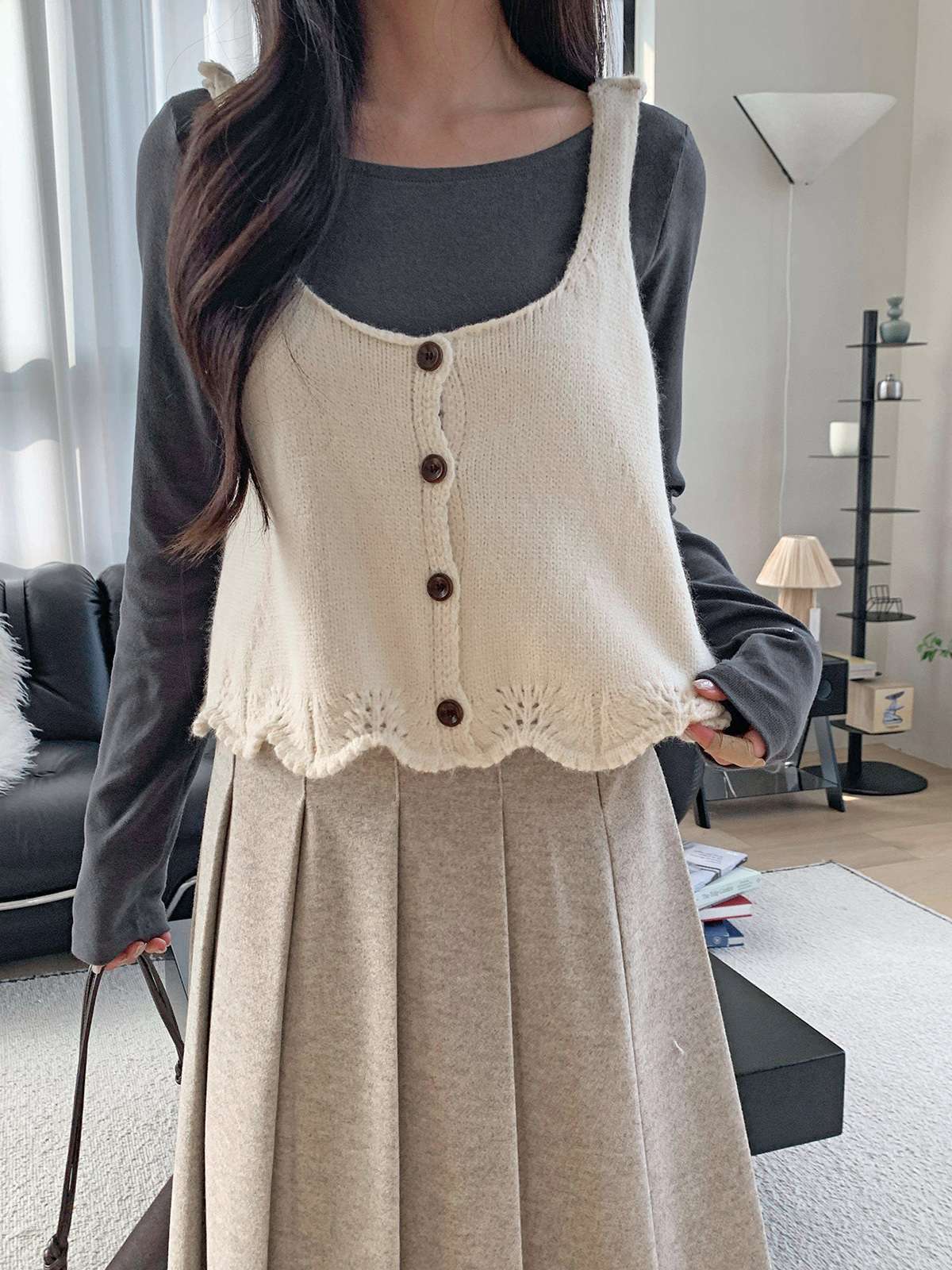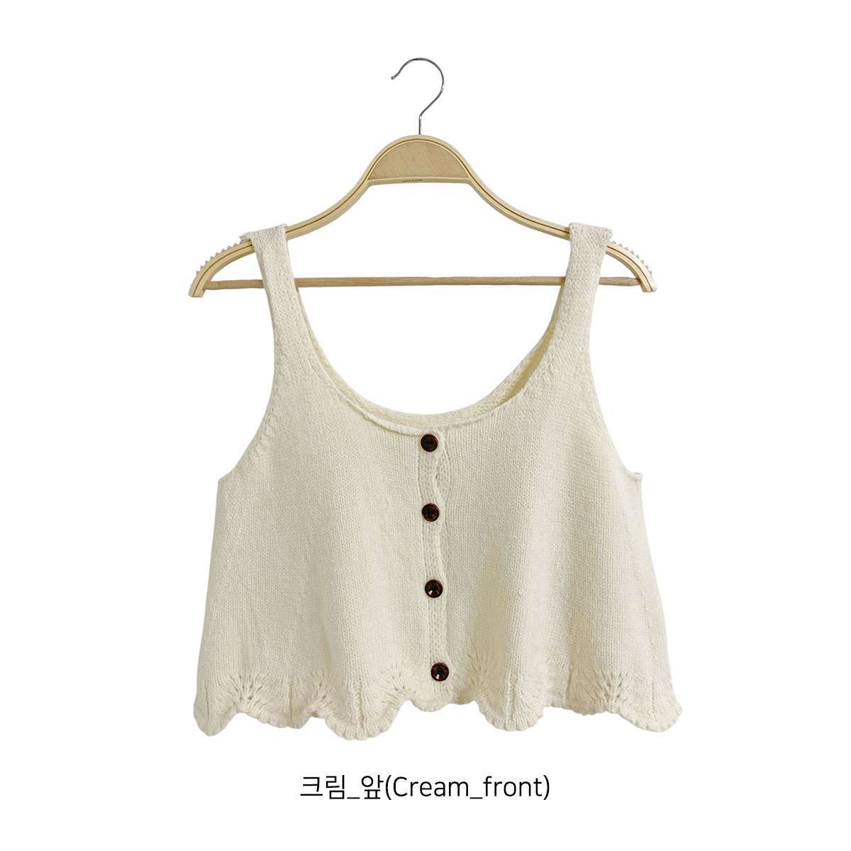 귀여운 버튼 포인트가 돋보이는 물결 펀칭 니트 뷔스티에