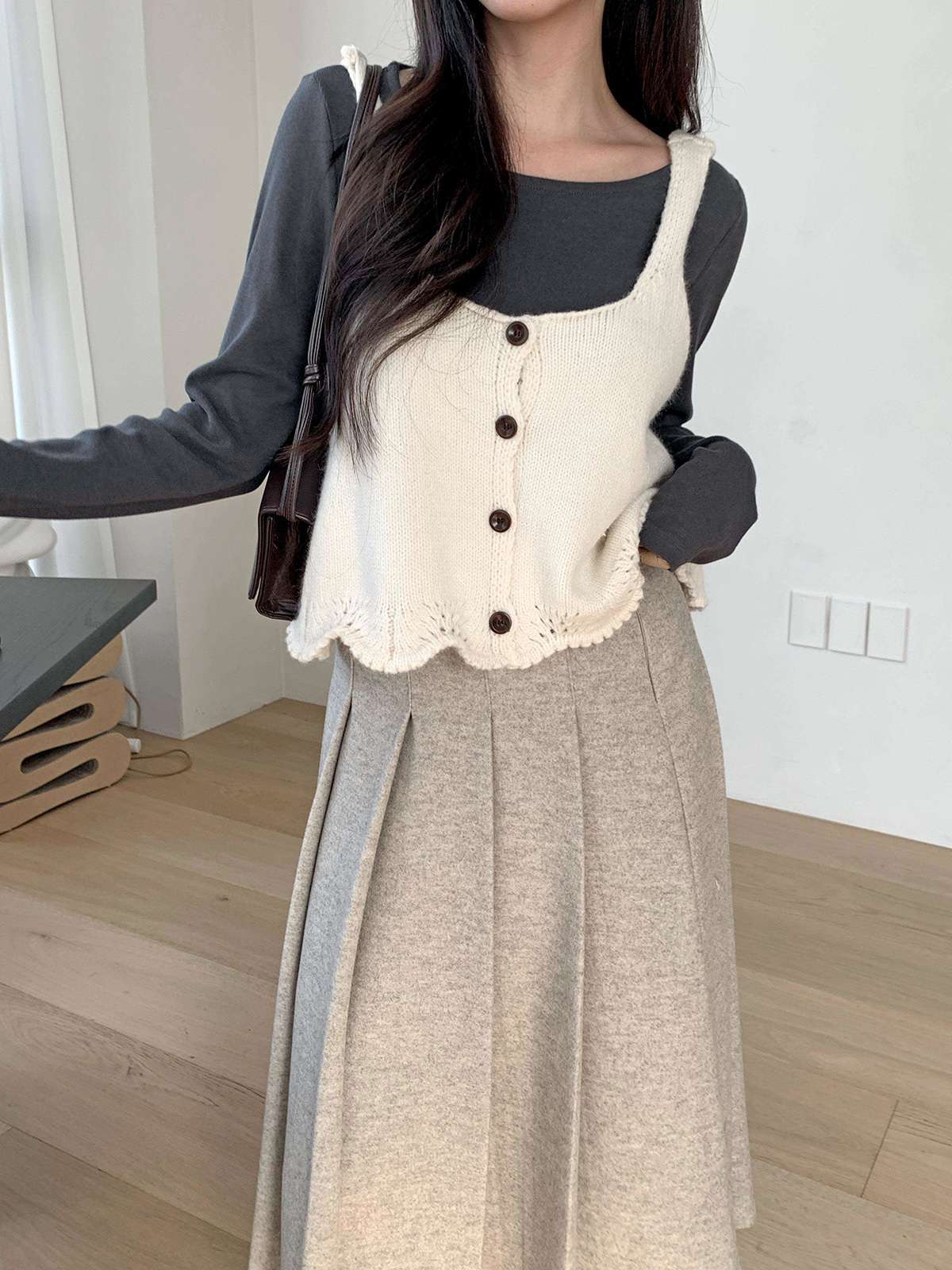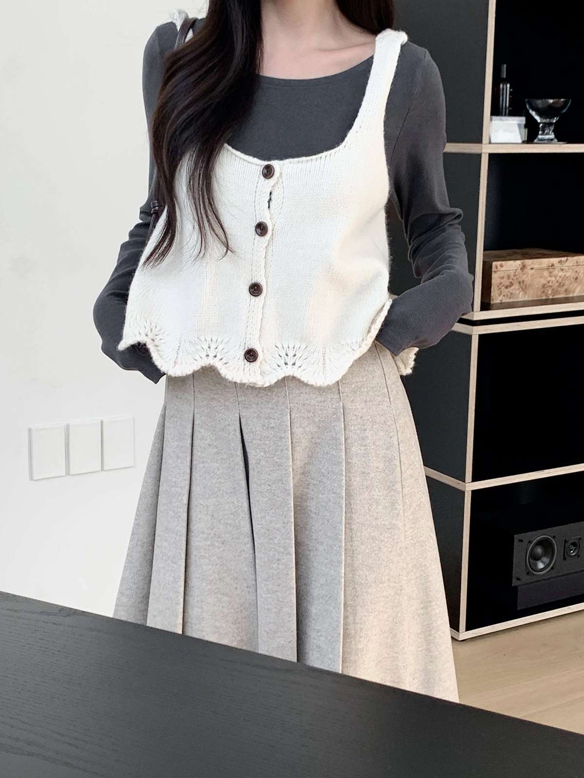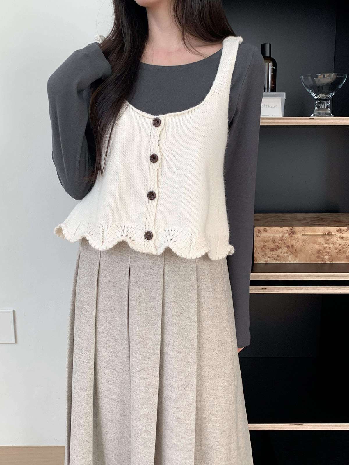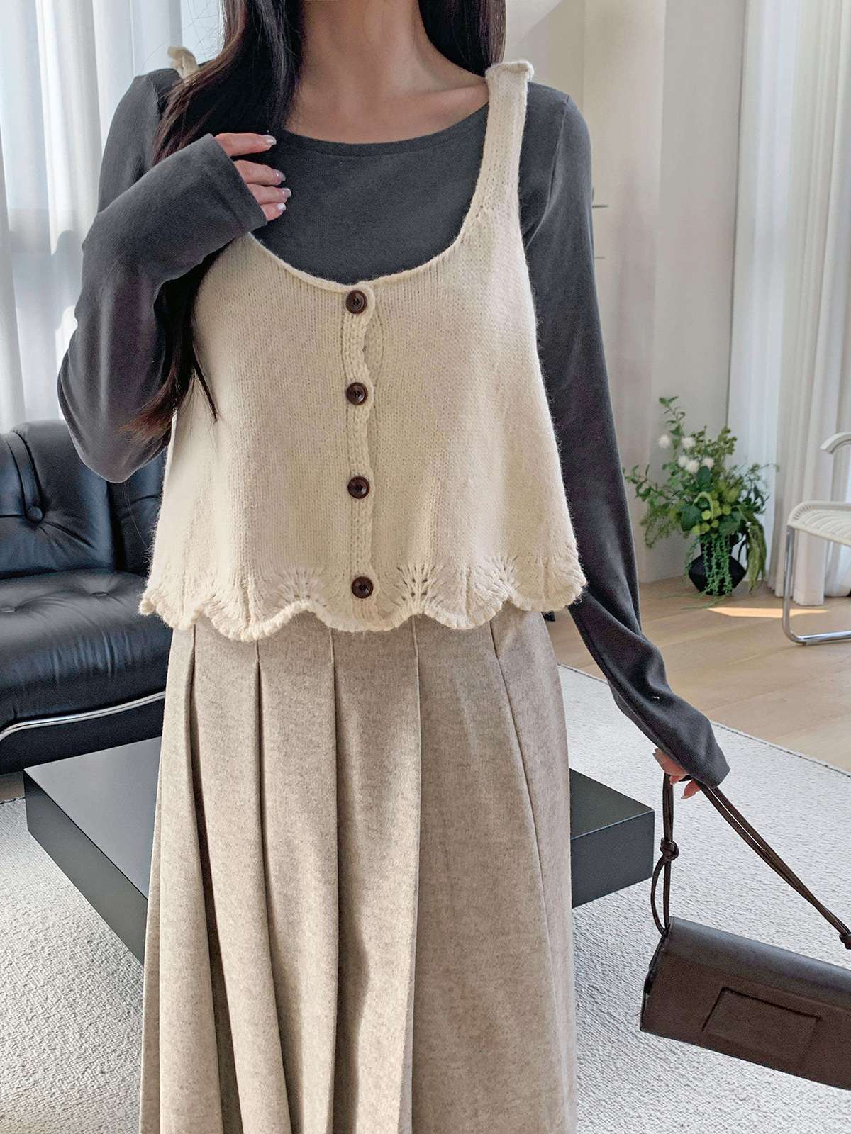 귀여운 버튼 포인트가 돋보이는 물결 펀칭 니트 뷔스티에