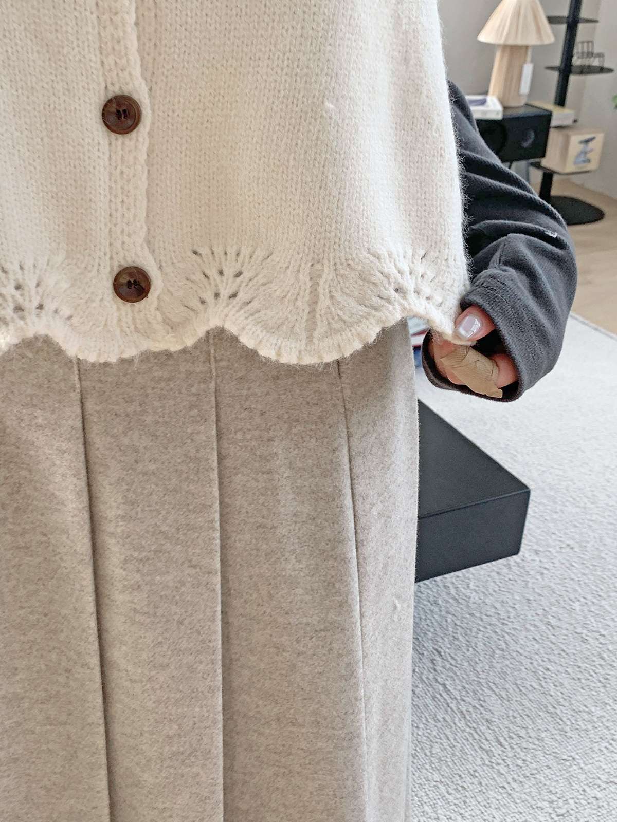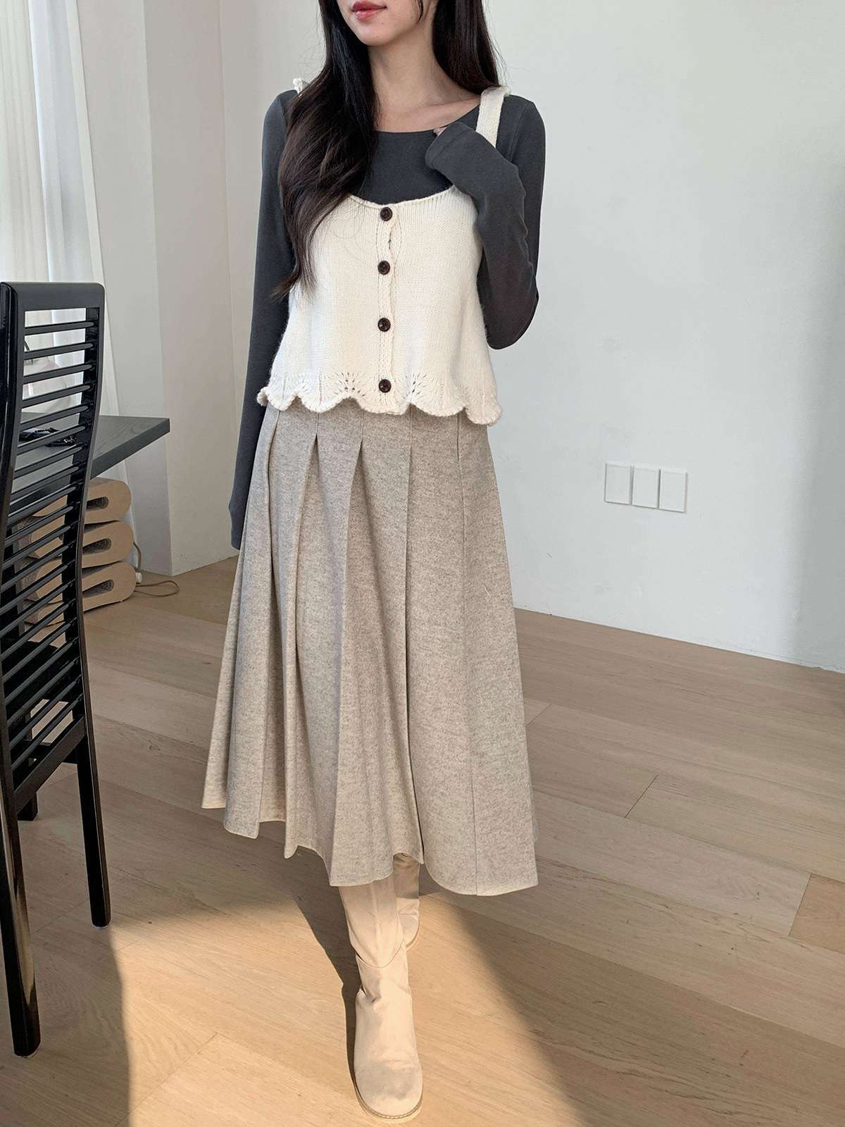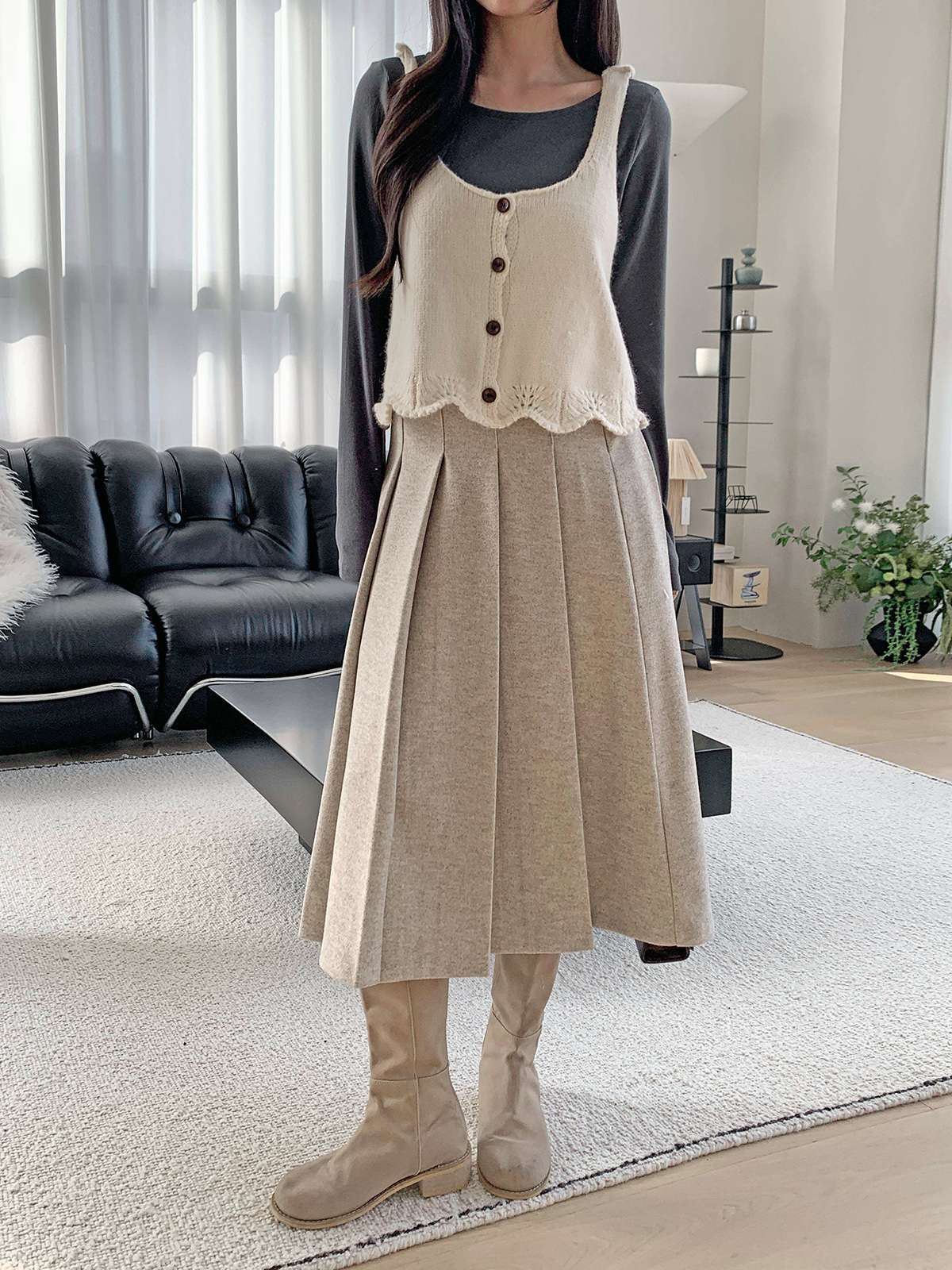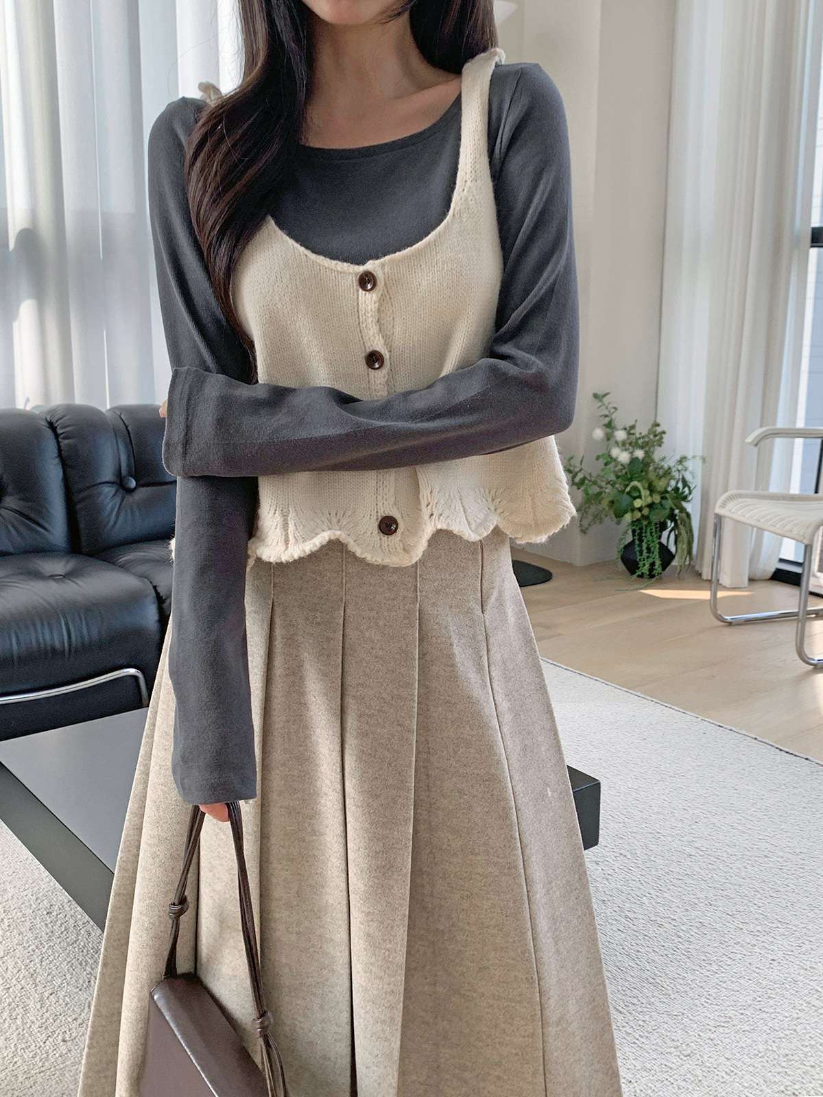 귀여운 버튼 포인트가 돋보이는 물결 펀칭 니트 뷔스티에