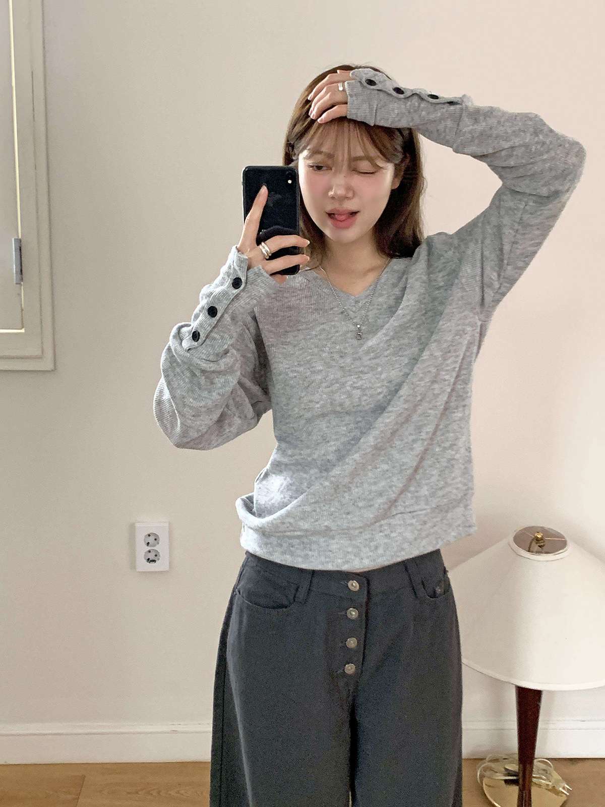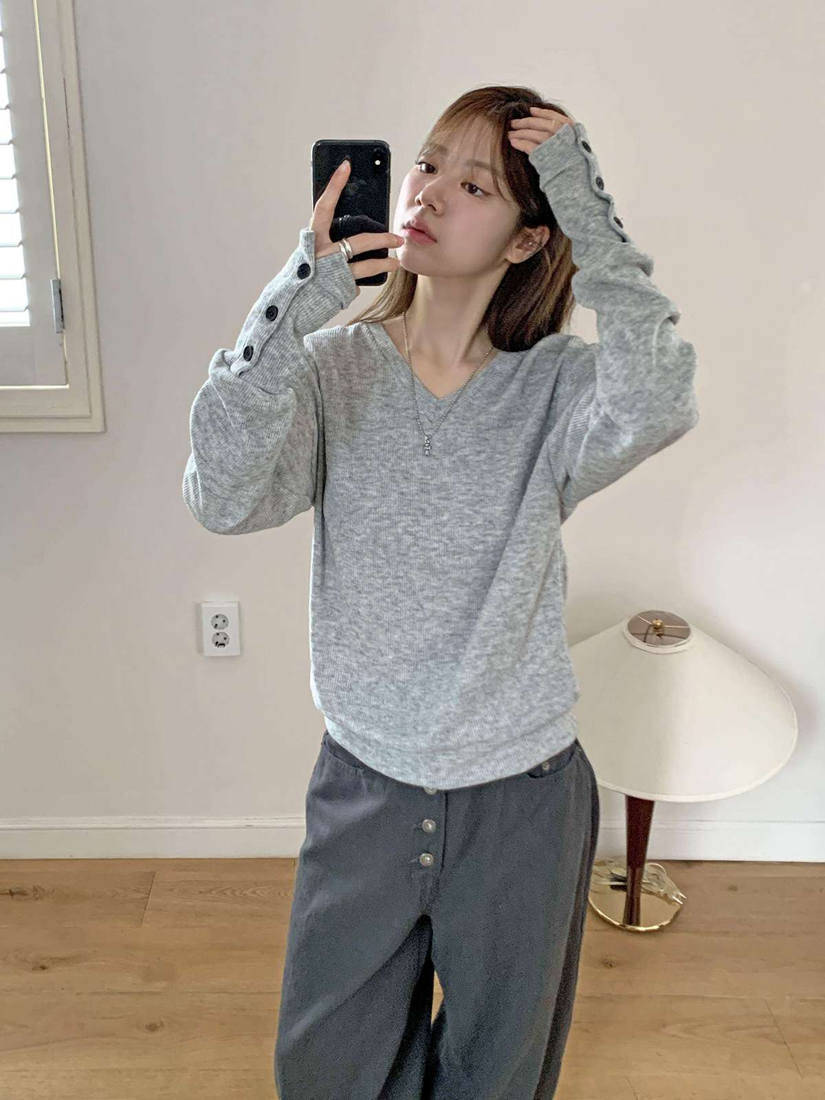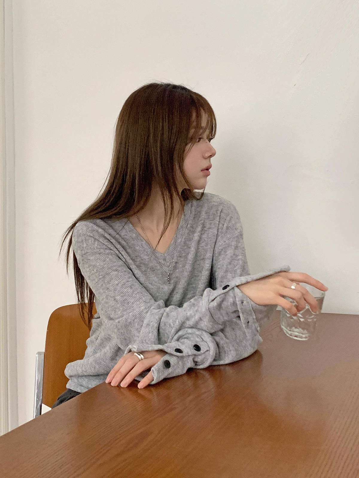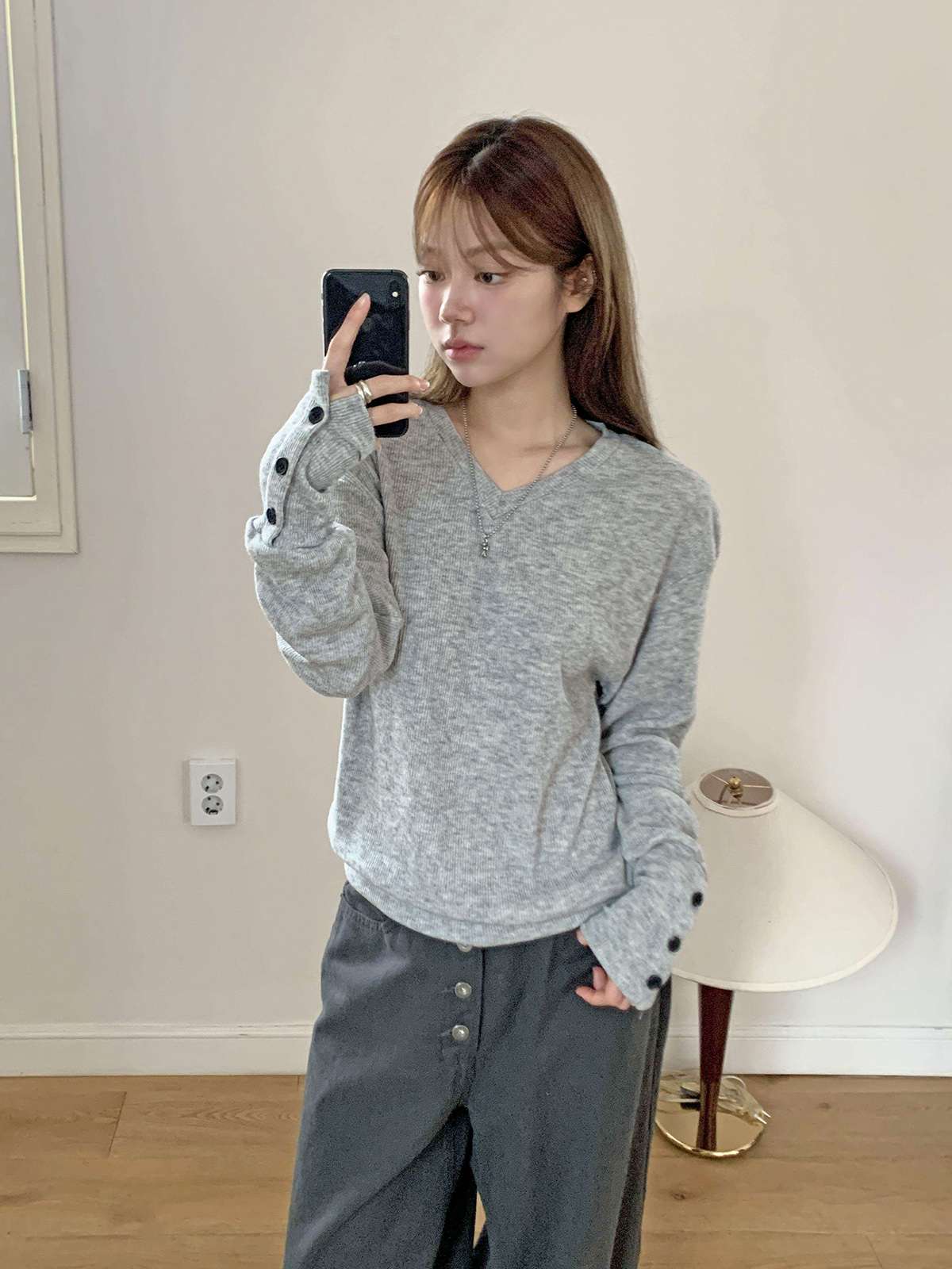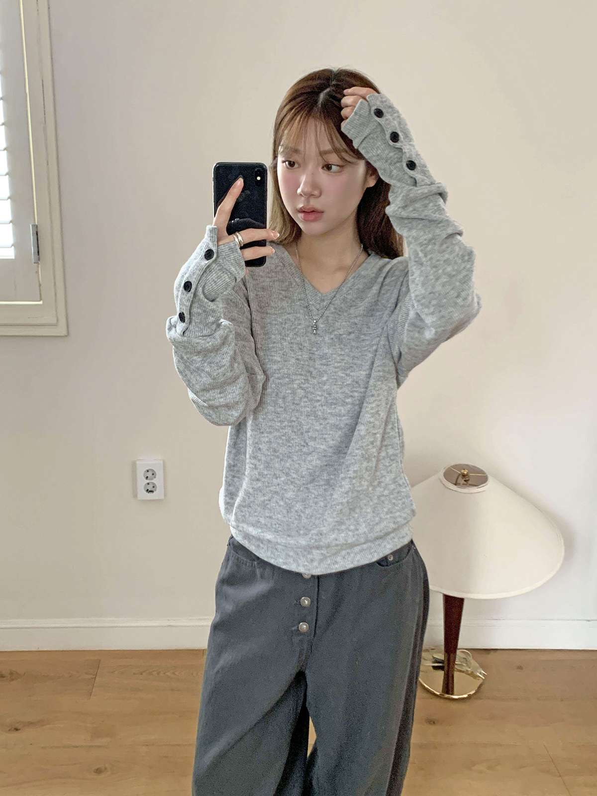 길어보이는 목선을 연출해주는 브이넥과 낙낙한 품과 긴소매 디자인과 소매버튼으로