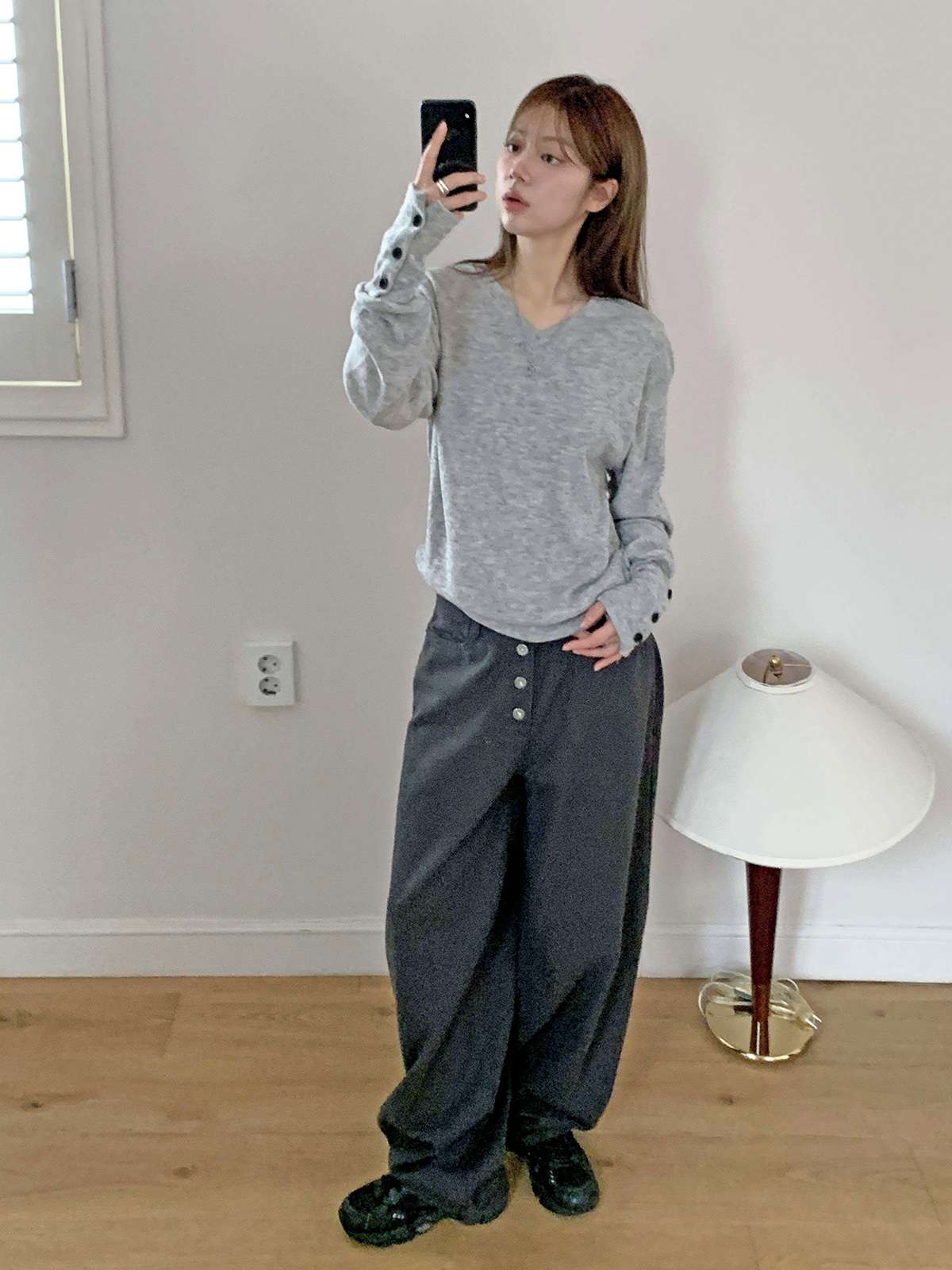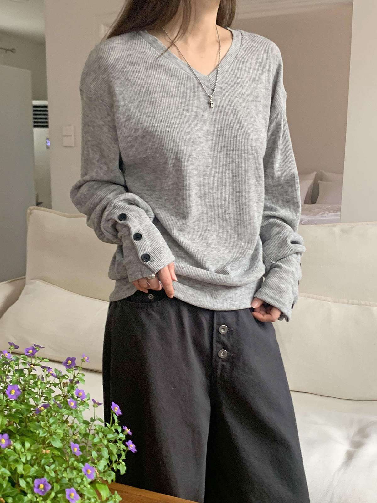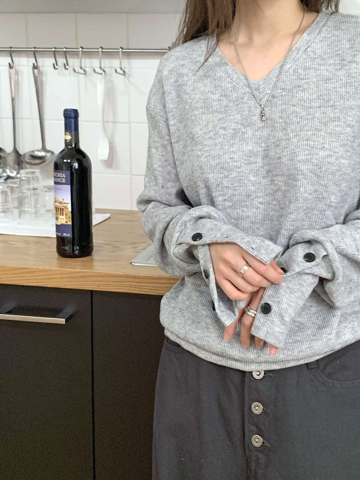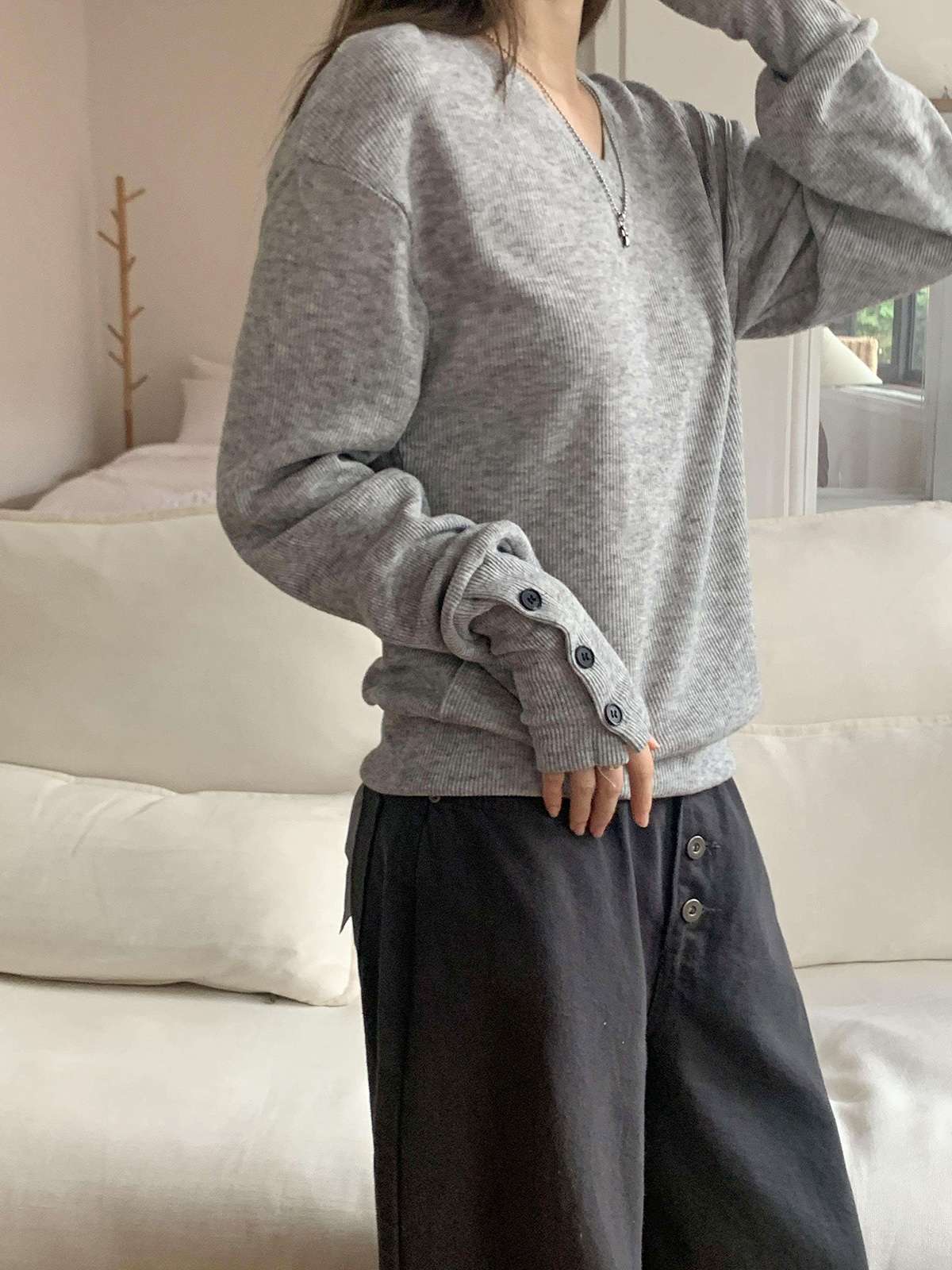 길어보이는 목선을 연출해주는 브이넥과 낙낙한 품과 긴소매 디자인과 소매버튼으로