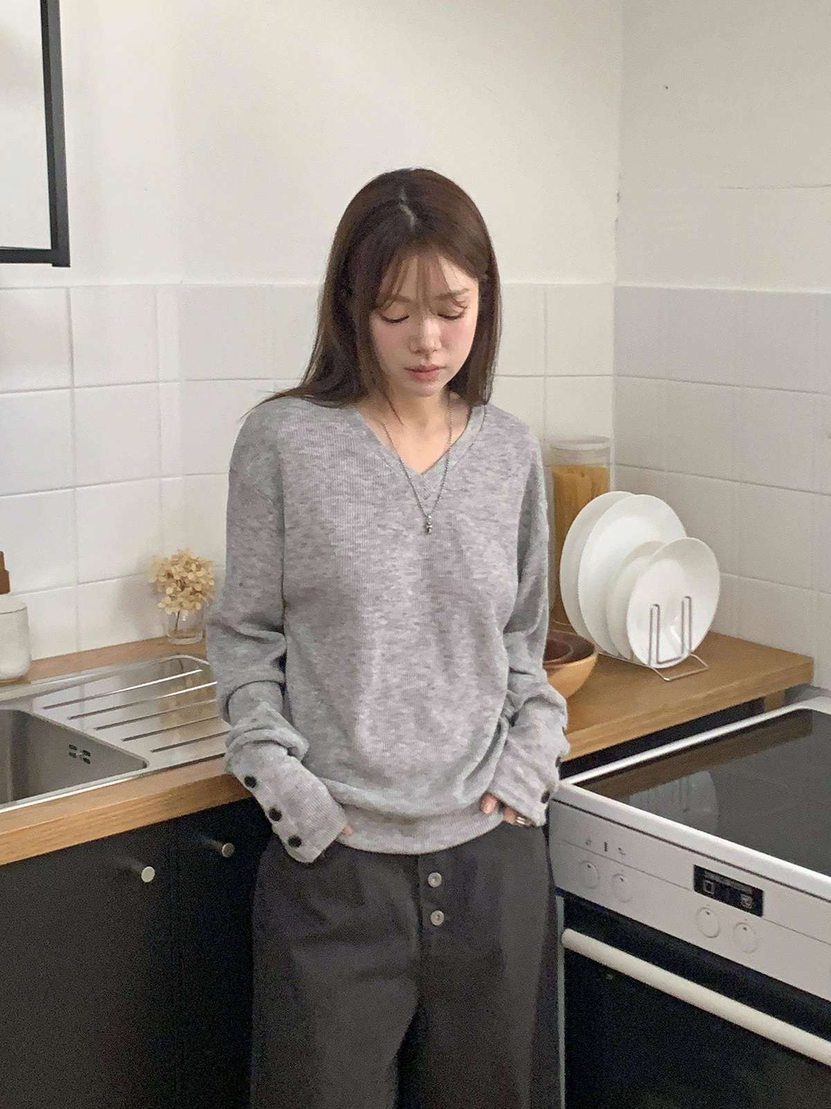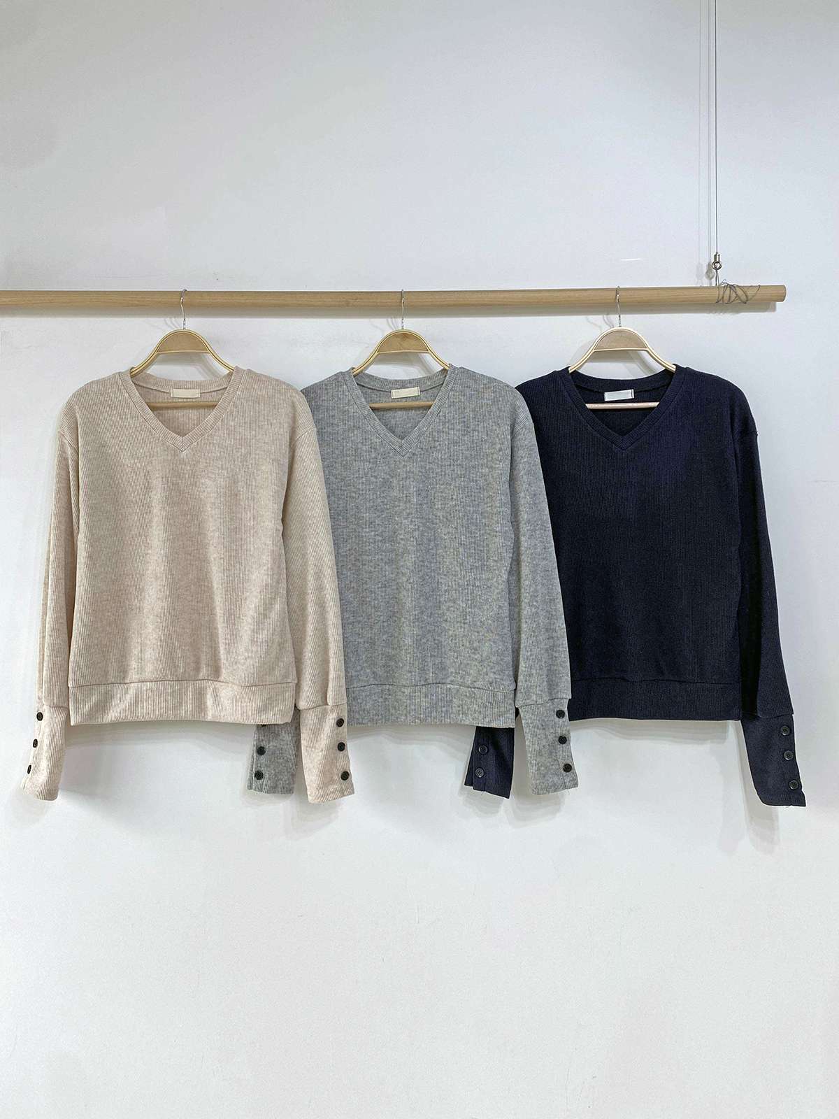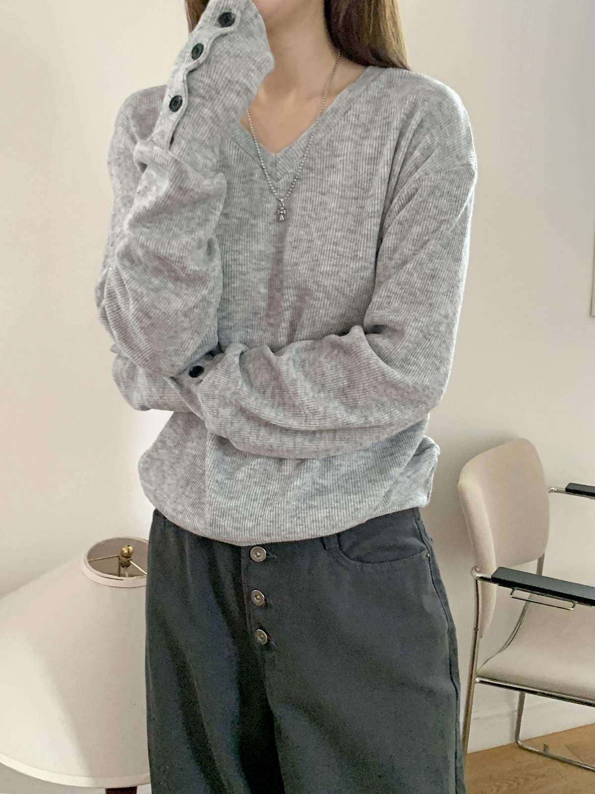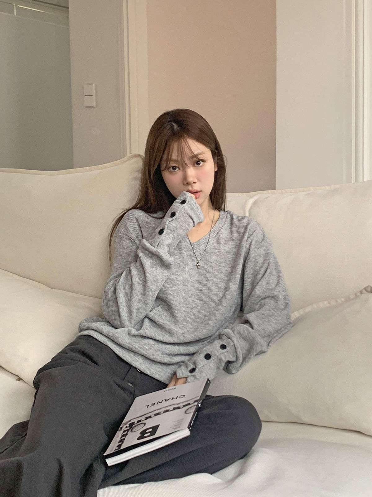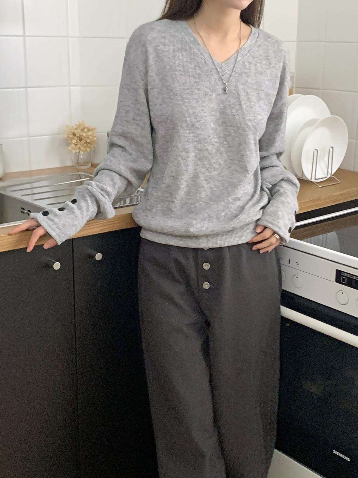 길어보이는 목선을 연출해주는 브이넥과 낙낙한 품과 긴소매 디자인과 소매버튼으로