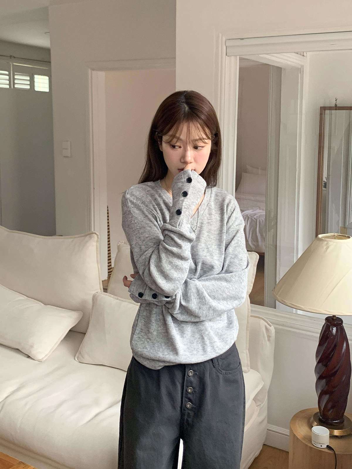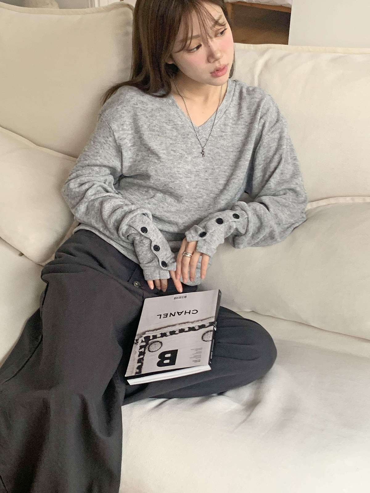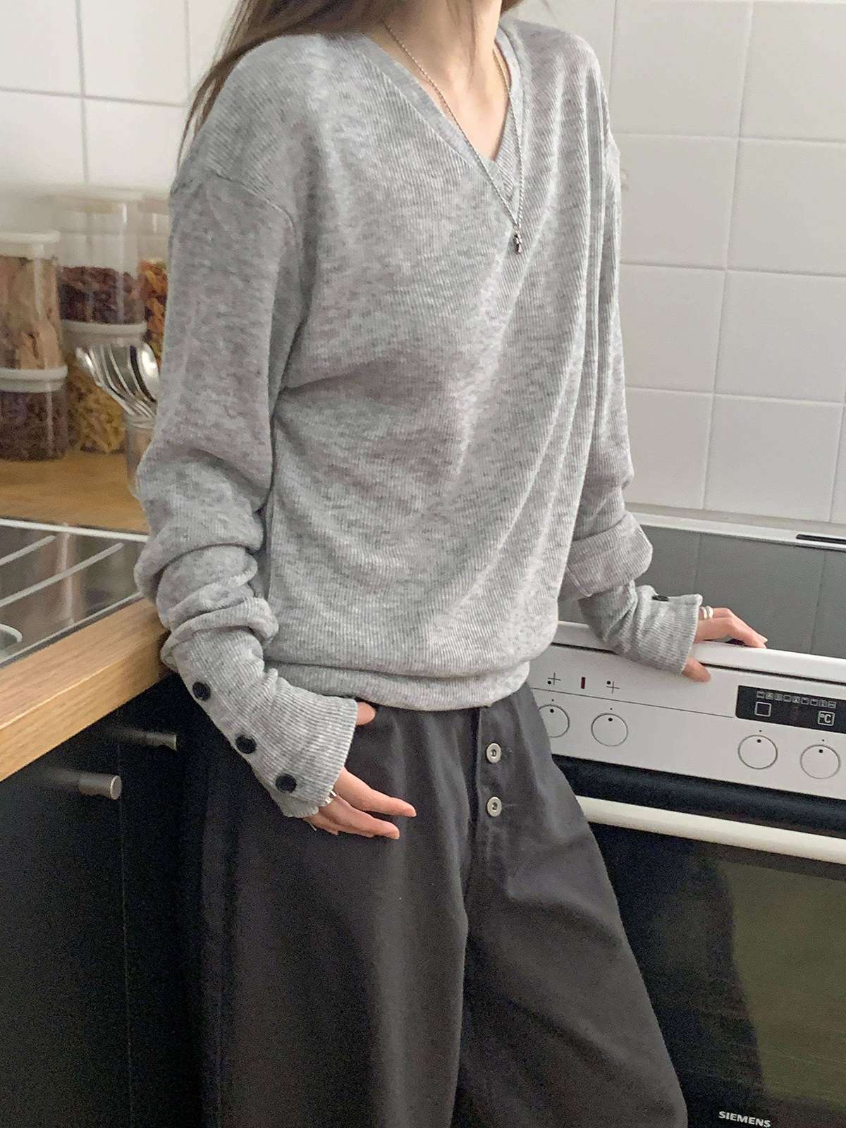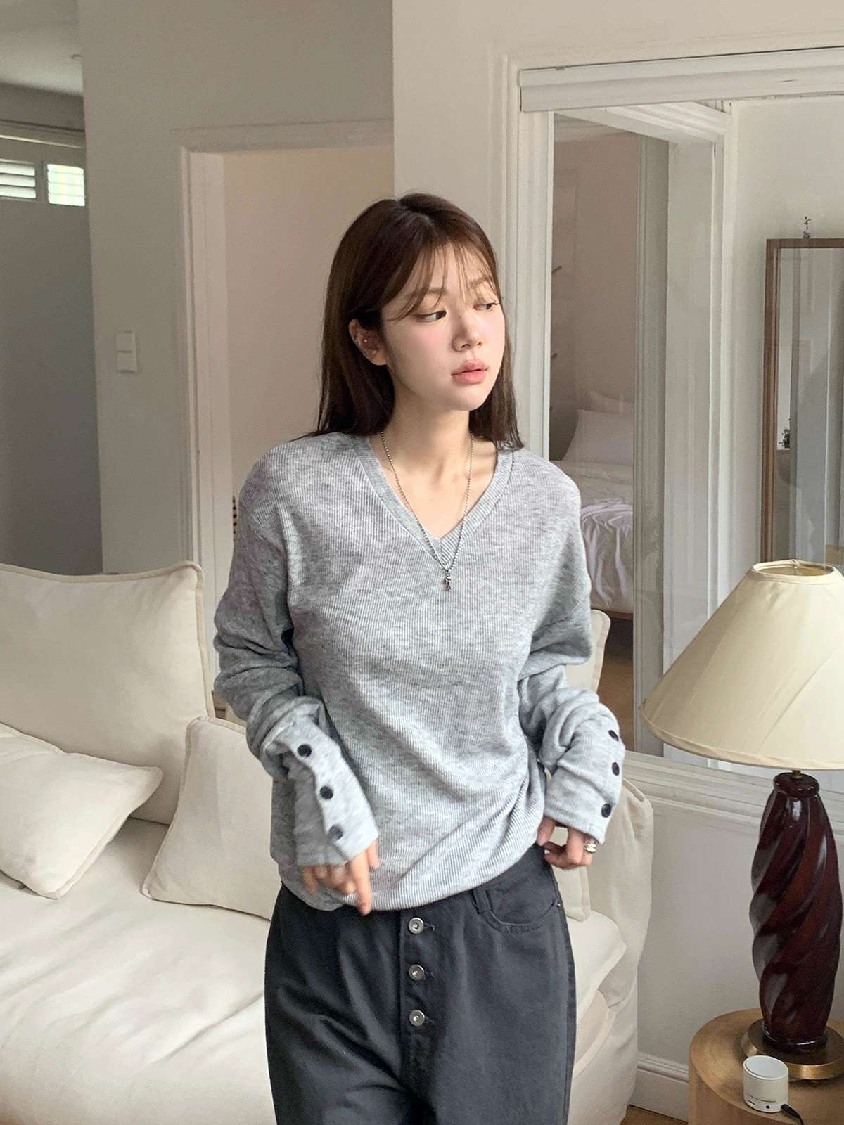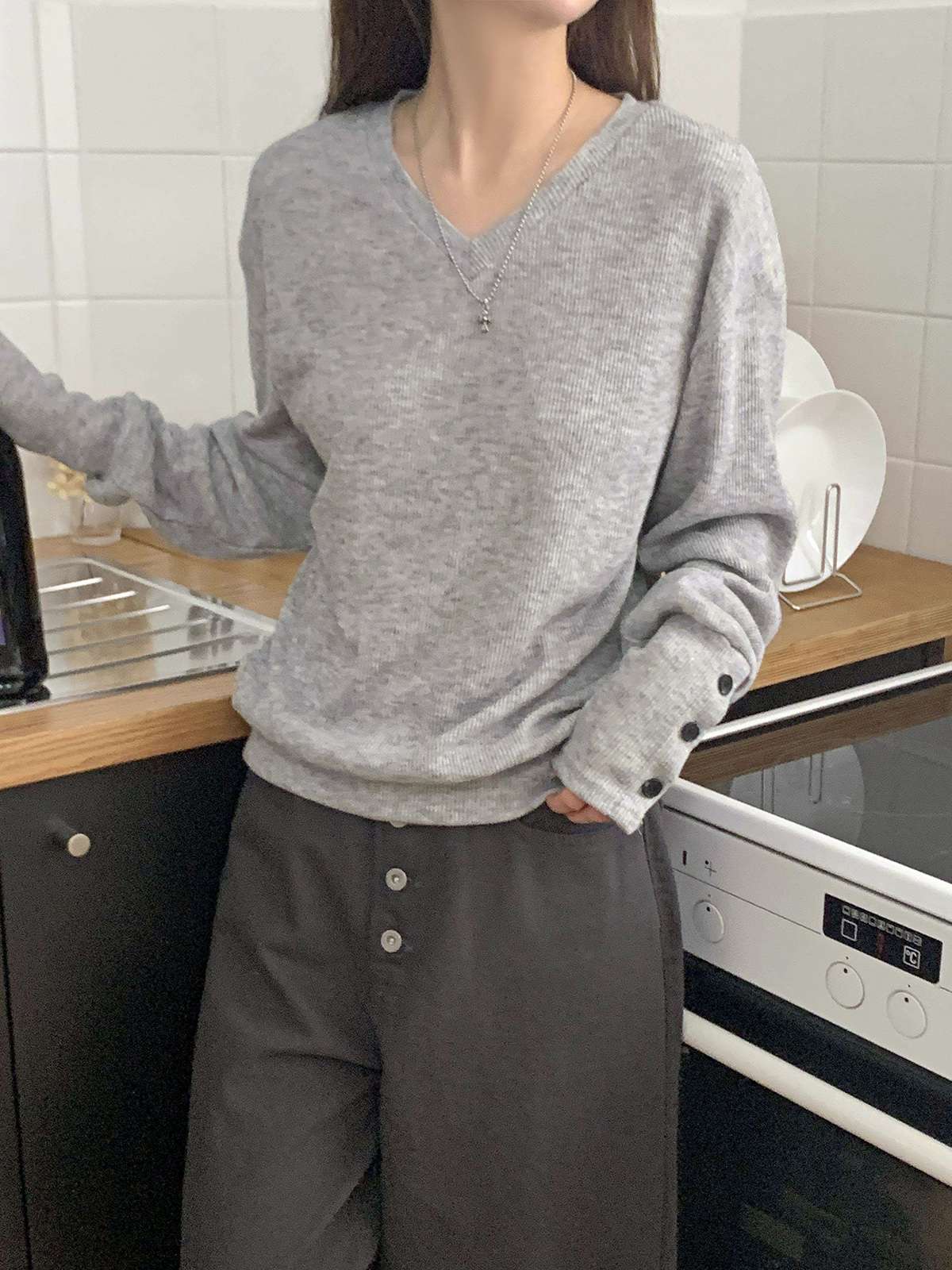 길어보이는 목선을 연출해주는 브이넥과 낙낙한 품과 긴소매 디자인과 소매버튼으로