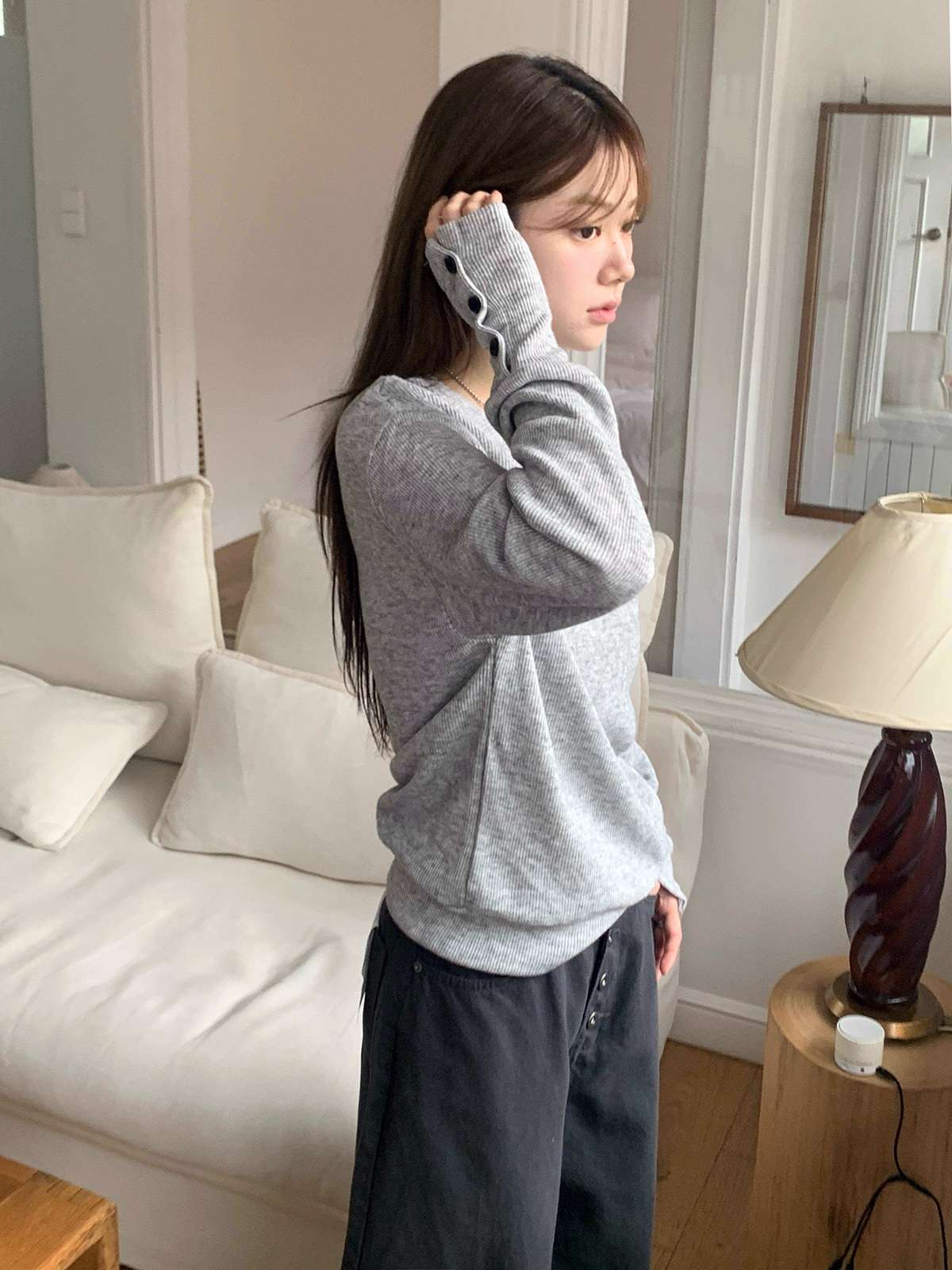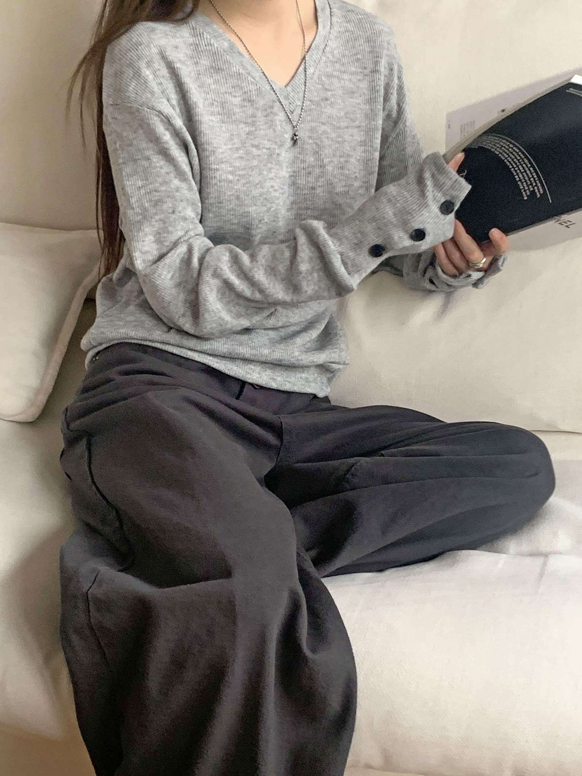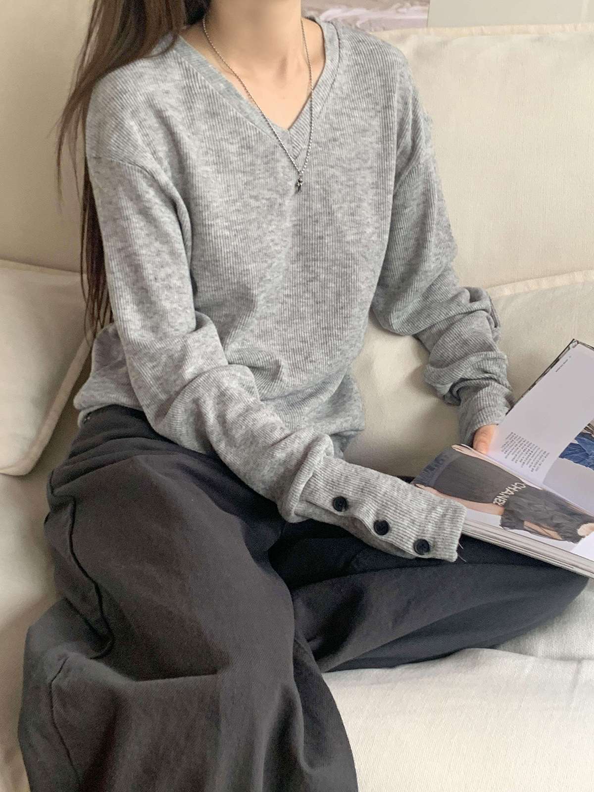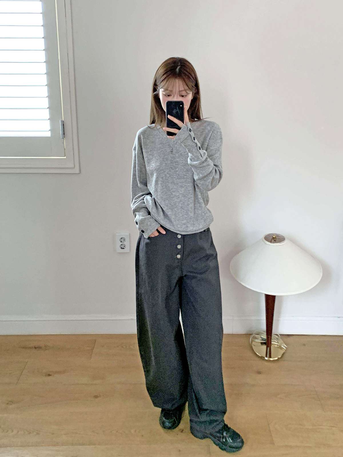 길어보이는 목선을 연출해주는 브이넥과 낙낙한 품과 긴소매 디자인과 소매버튼으로