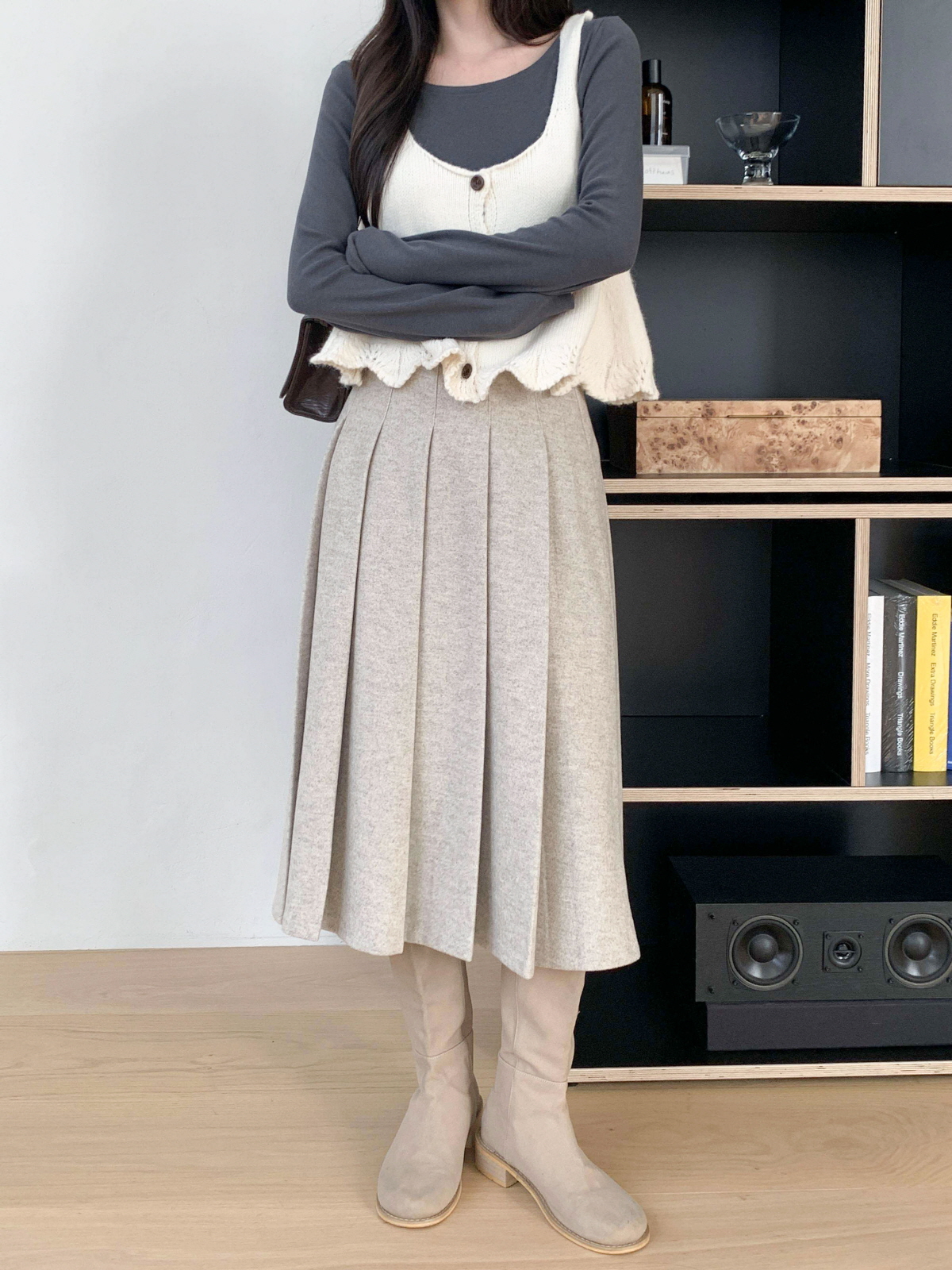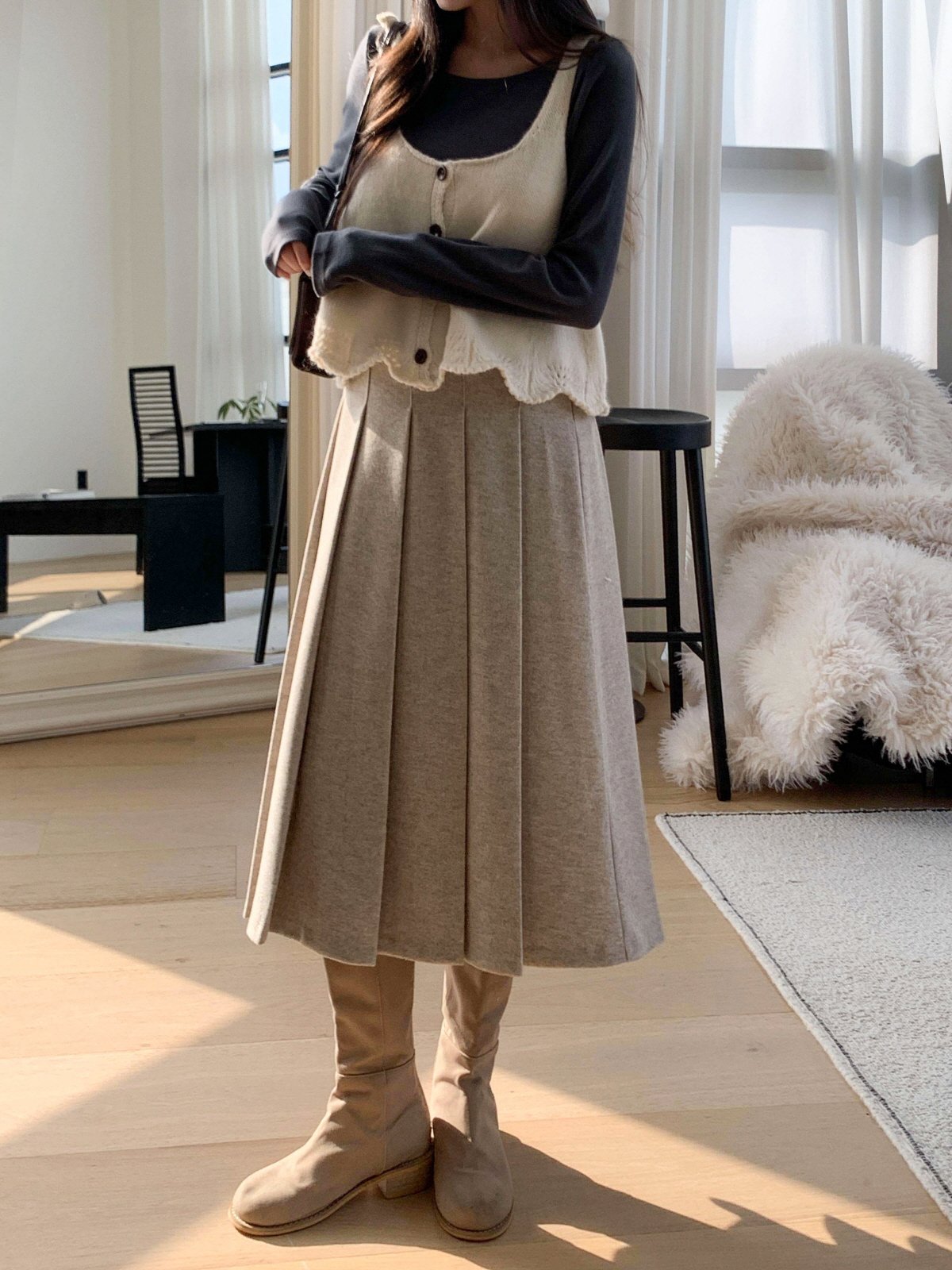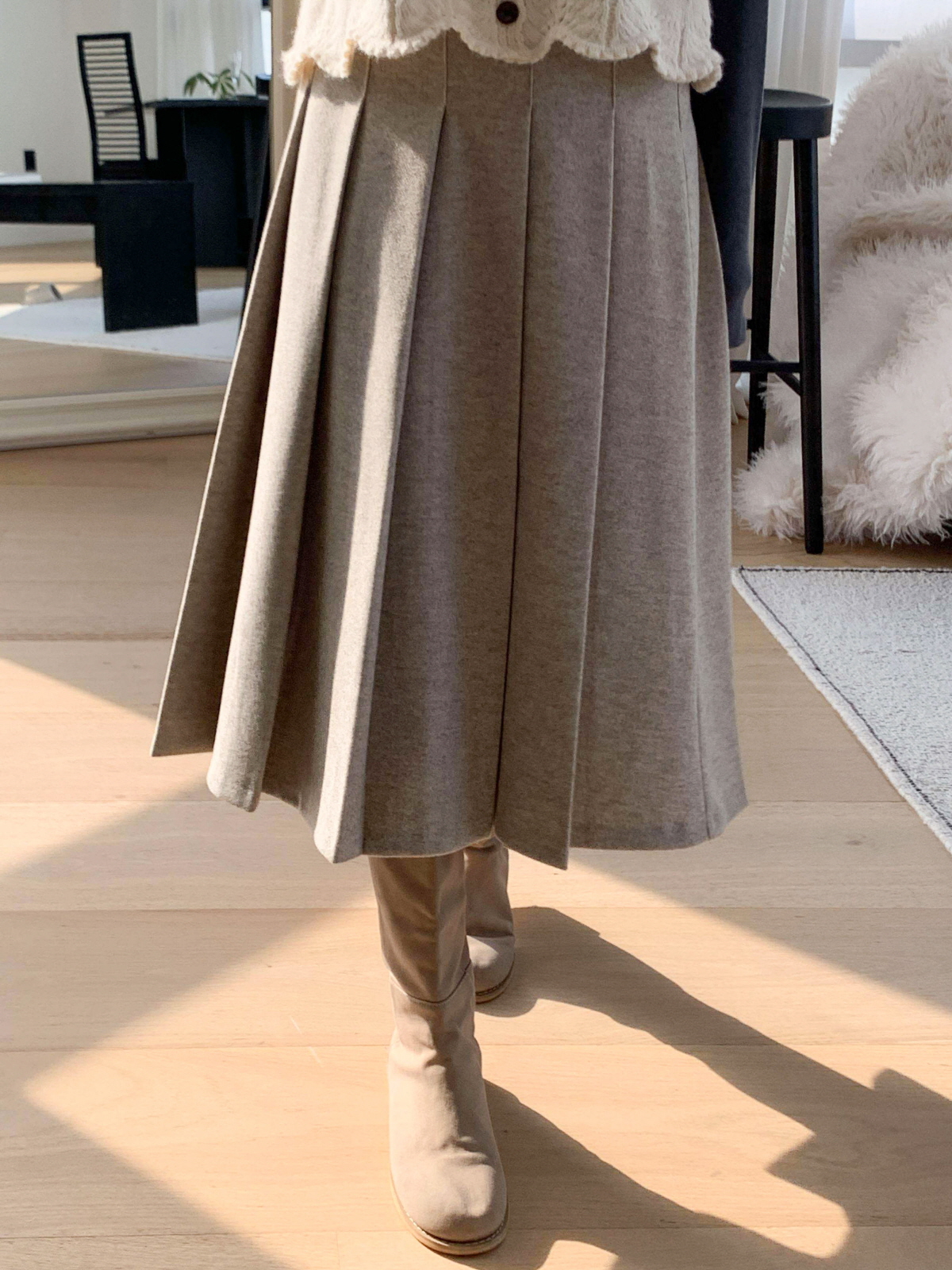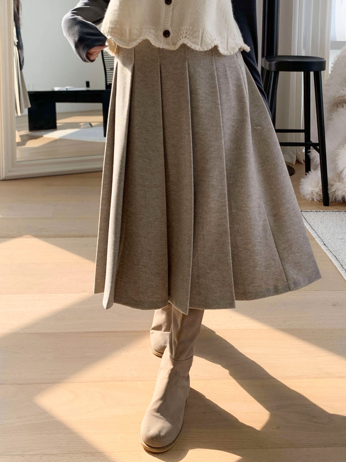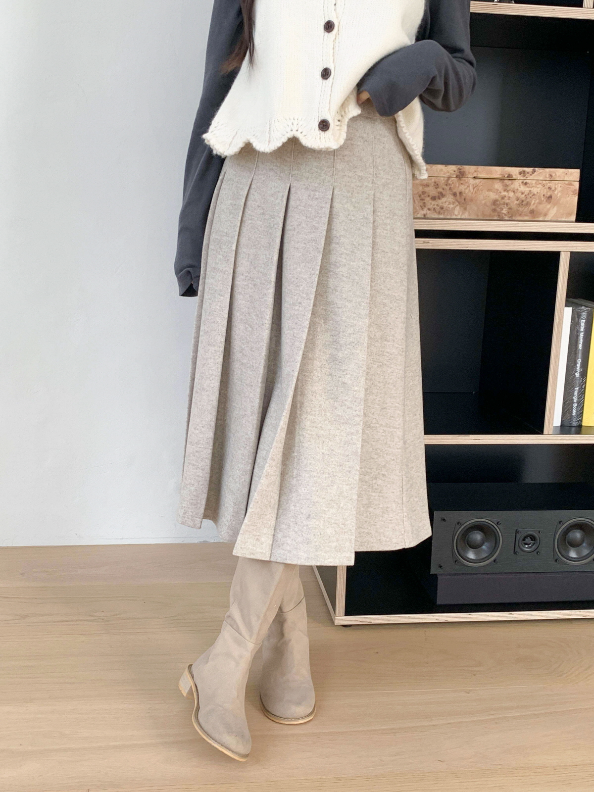 도톰한 모직 원단의 플리츠 롱 스커트