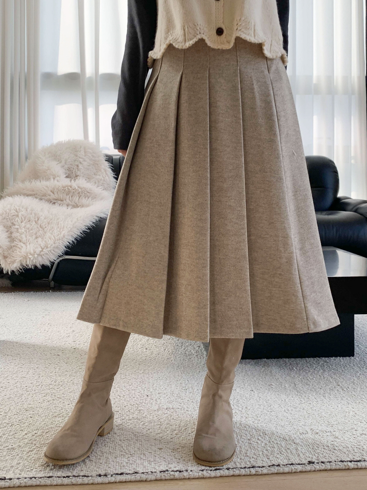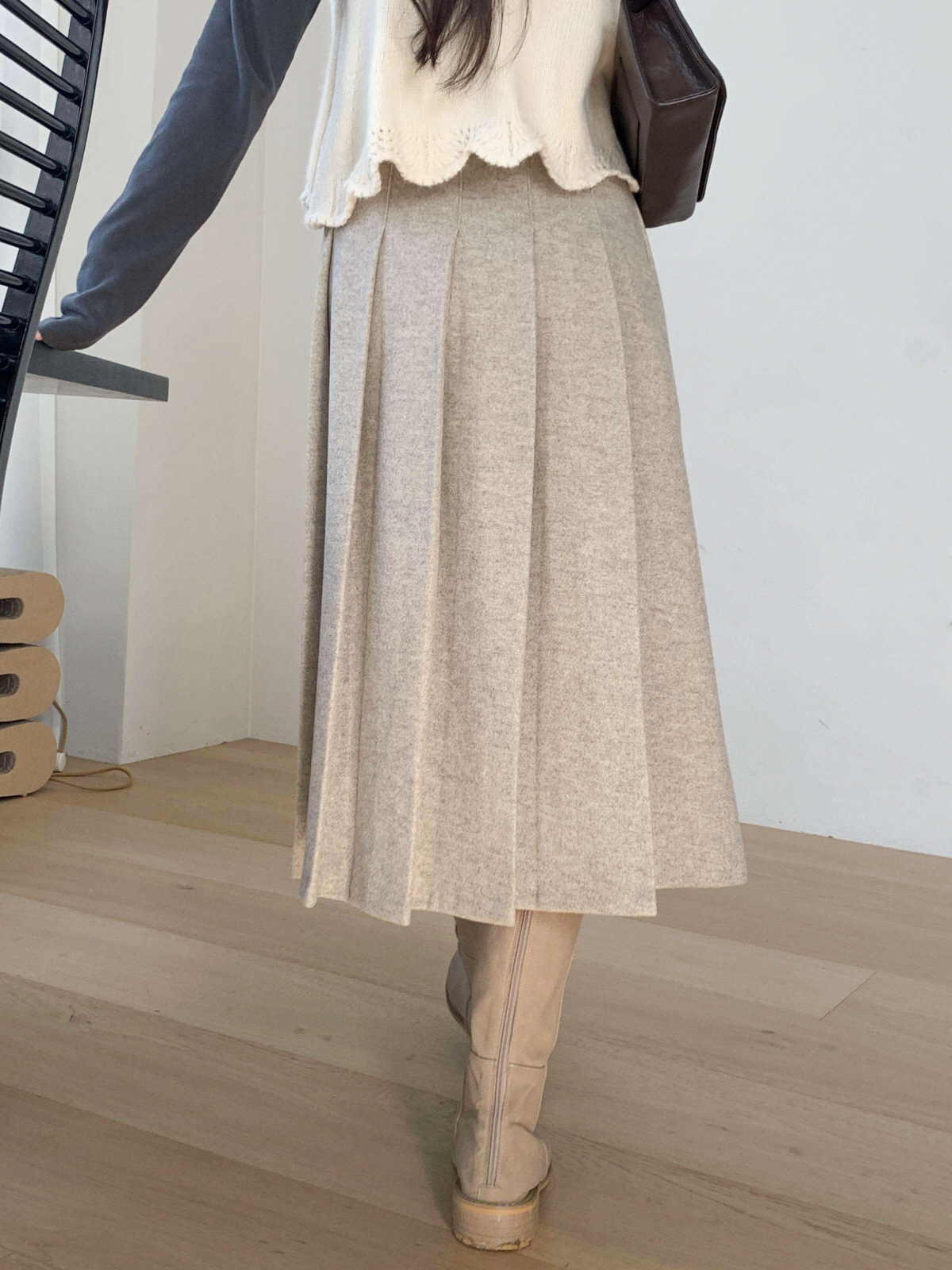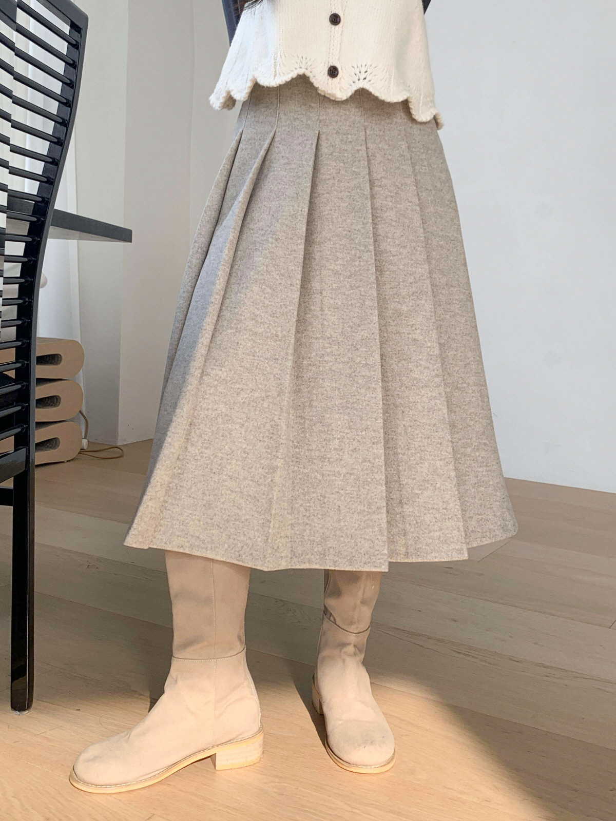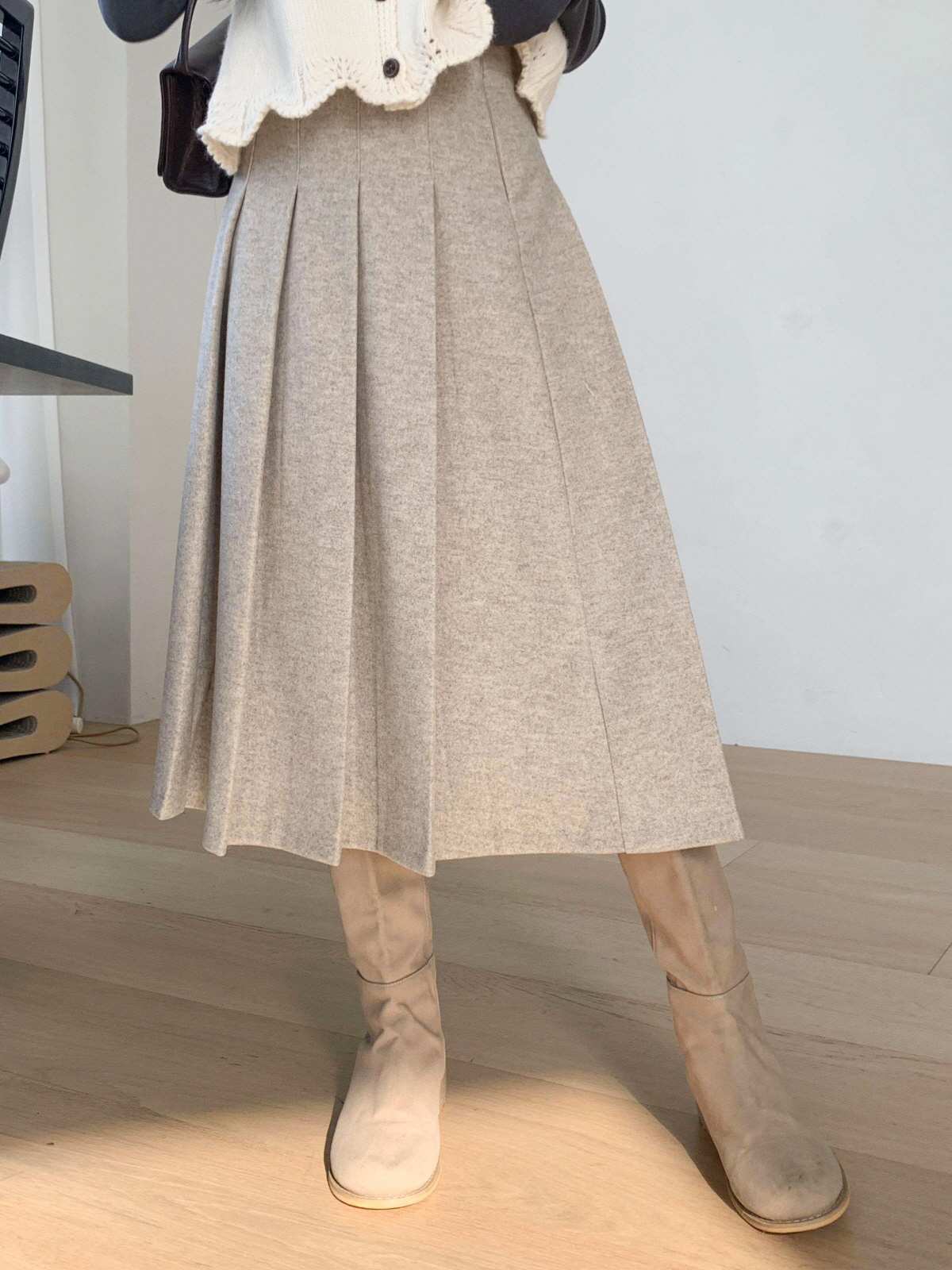 도톰한 모직 원단의 플리츠 롱 스커트