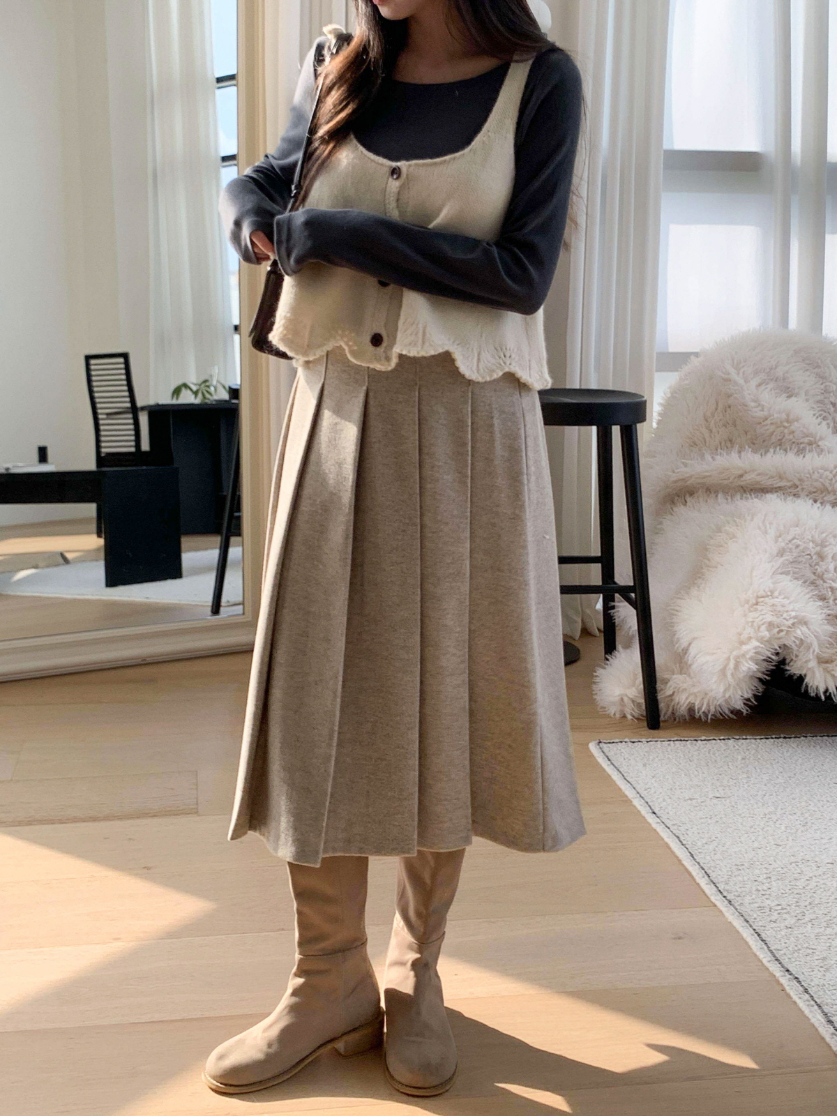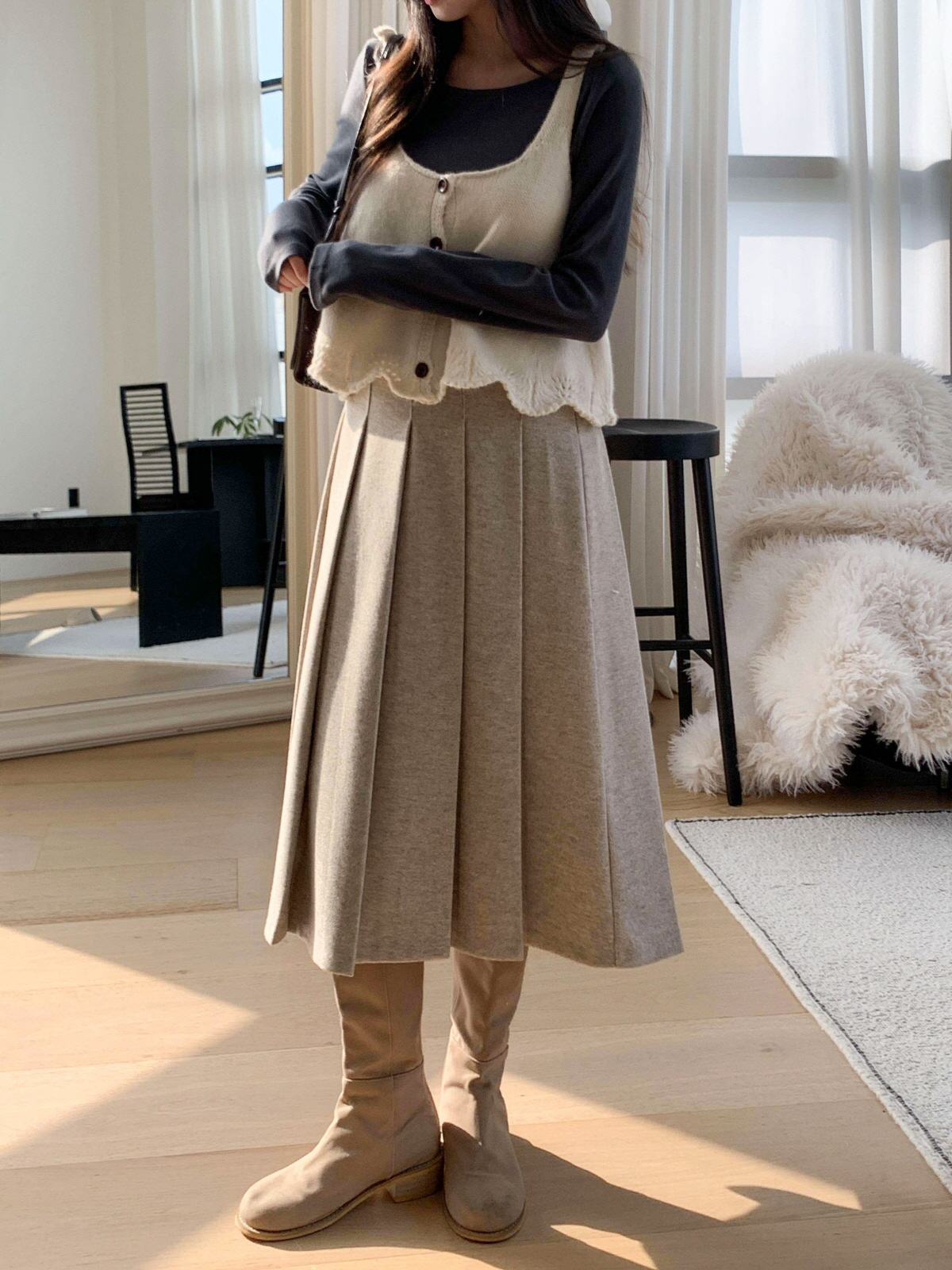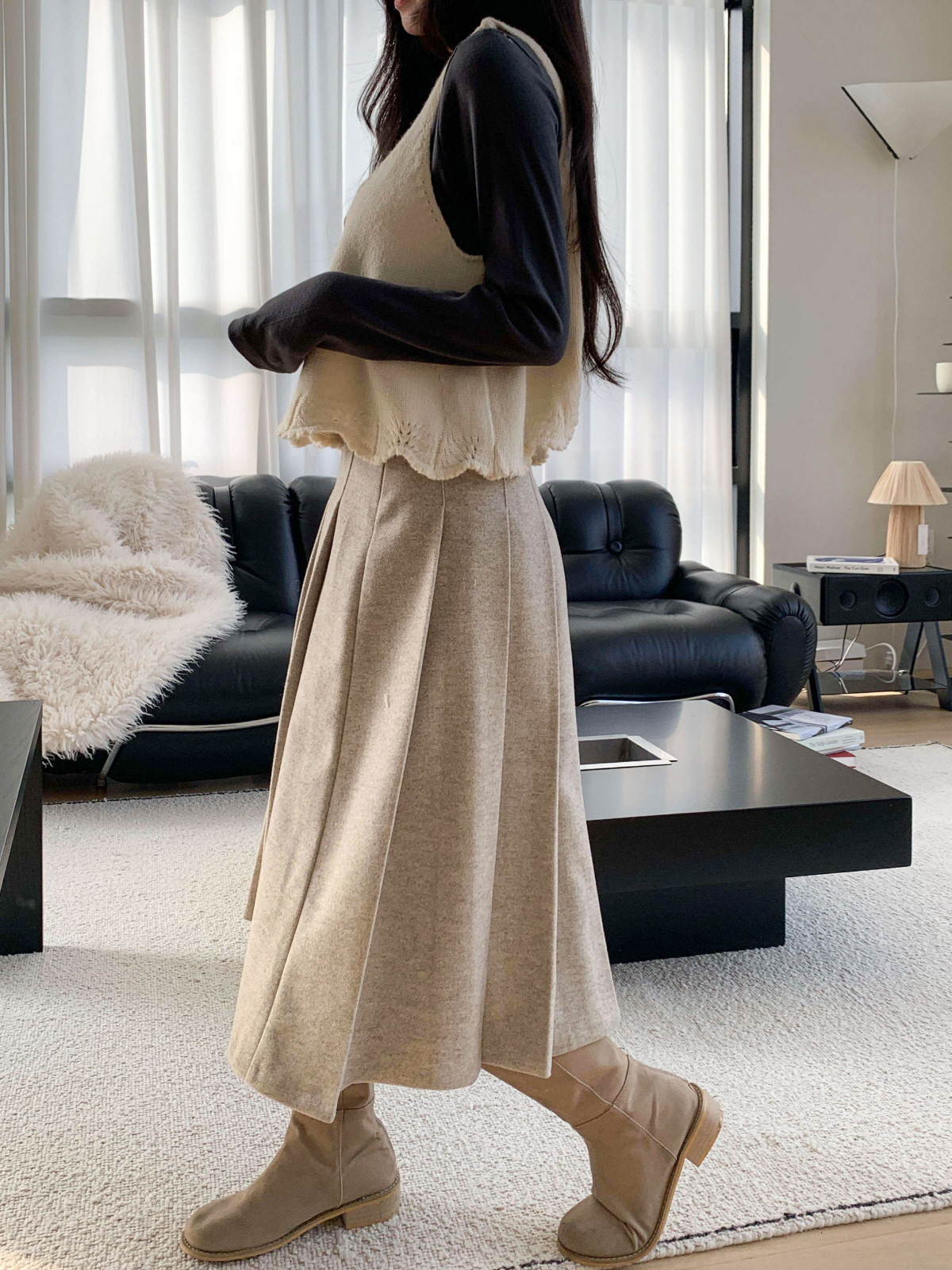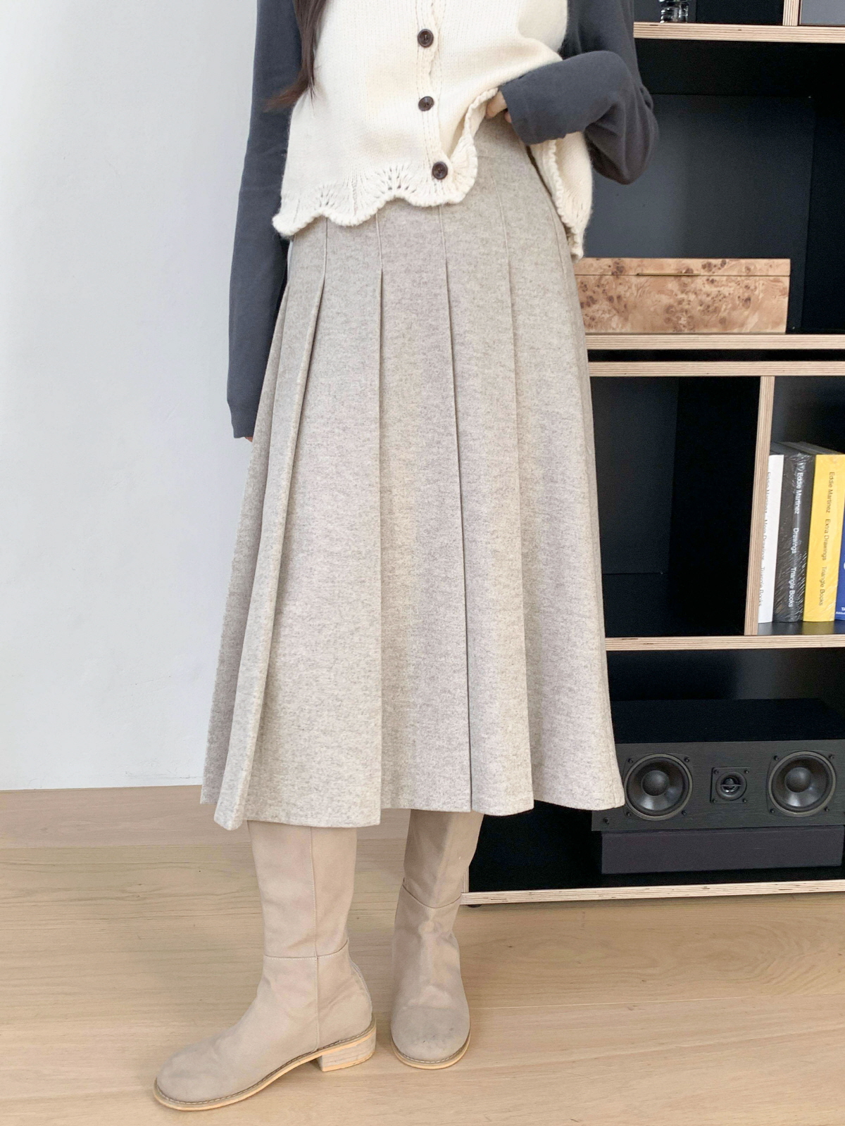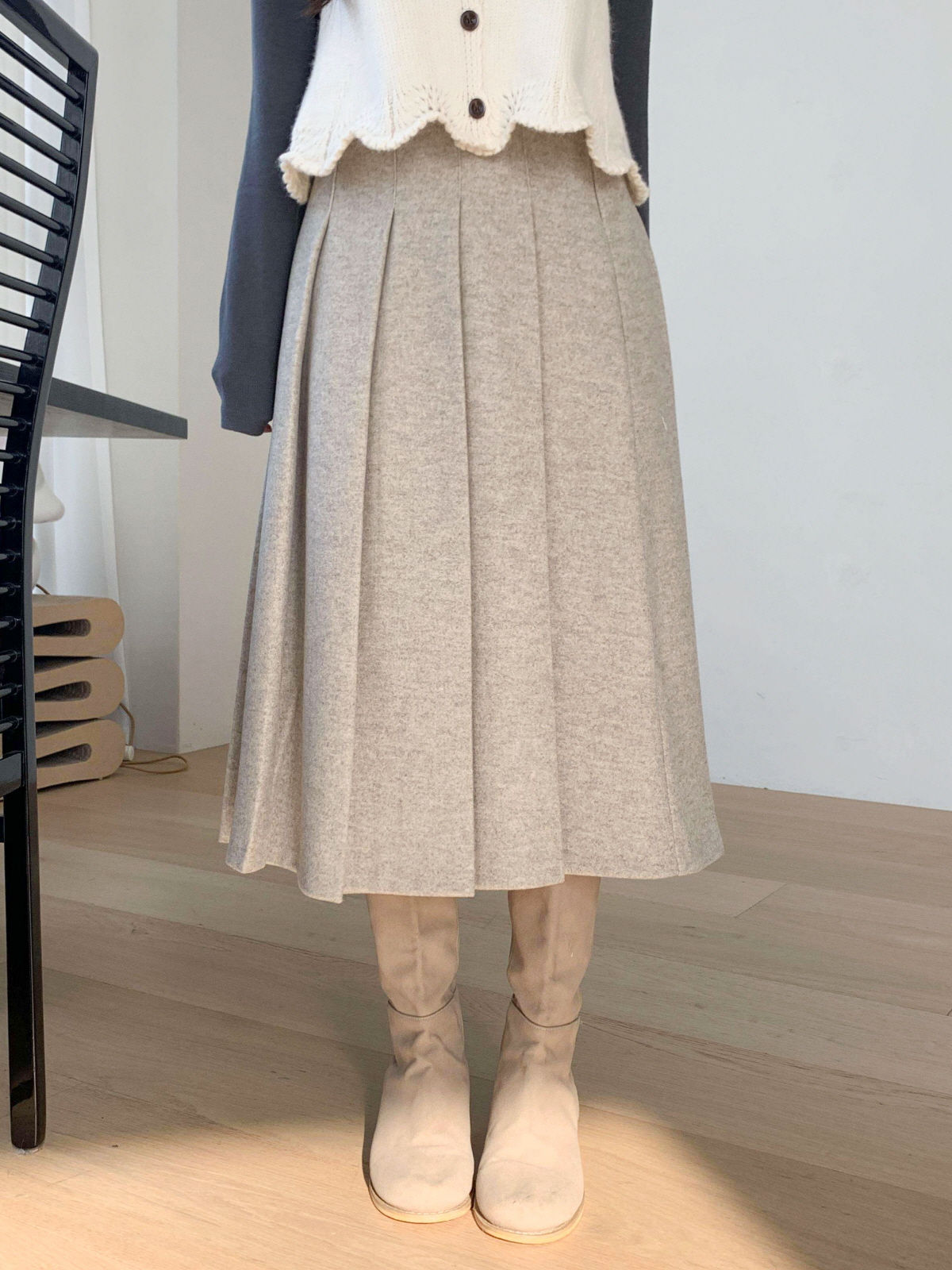도톰한 모직 원단의 플리츠 롱 스커트