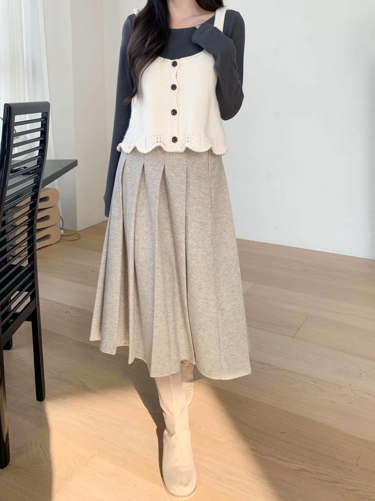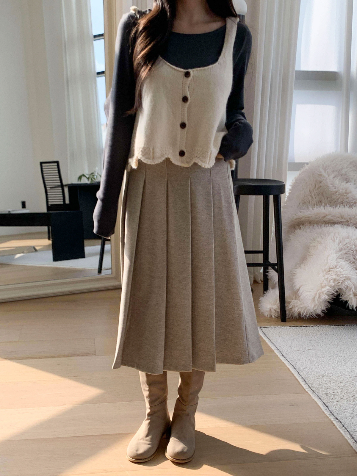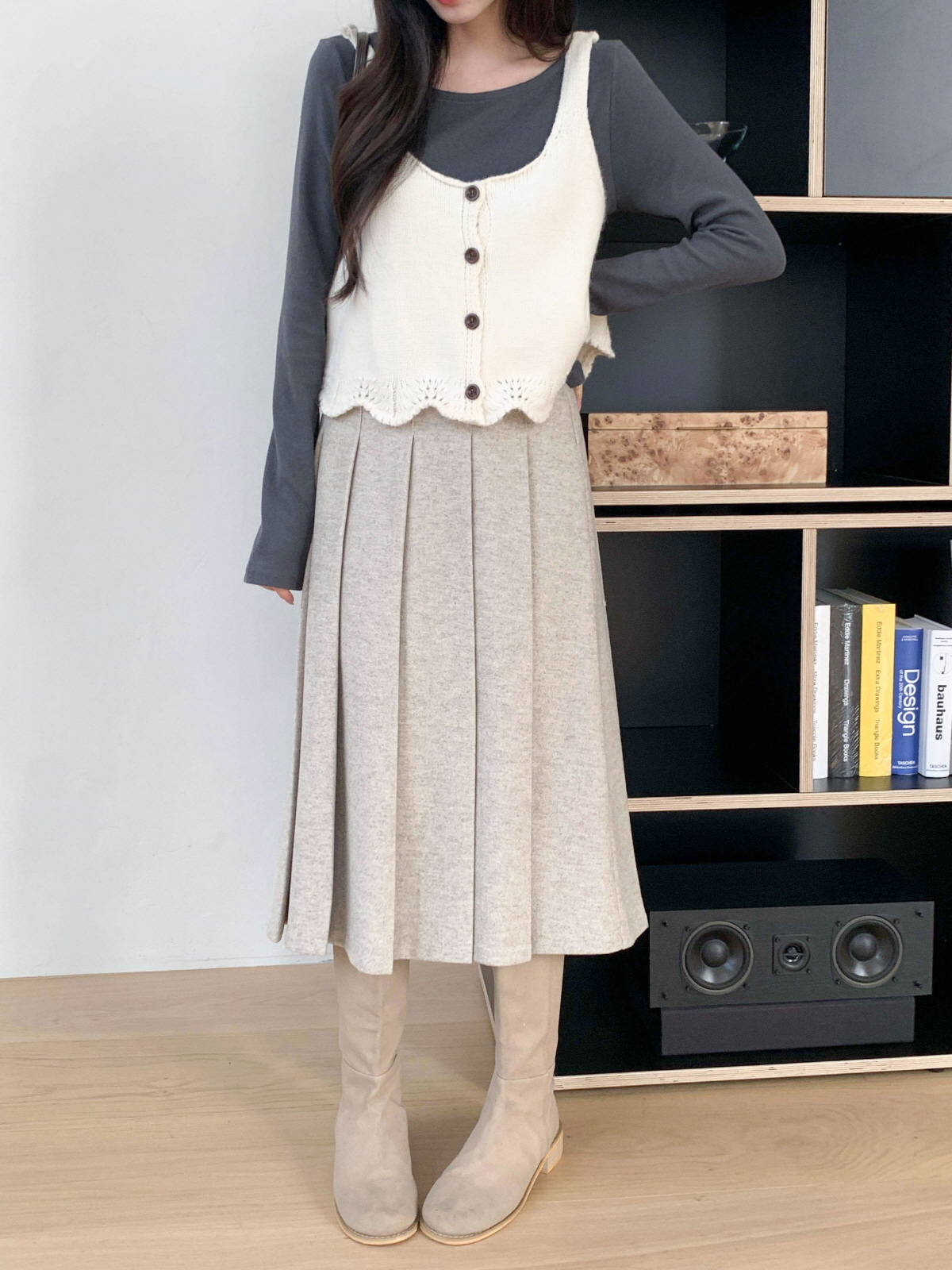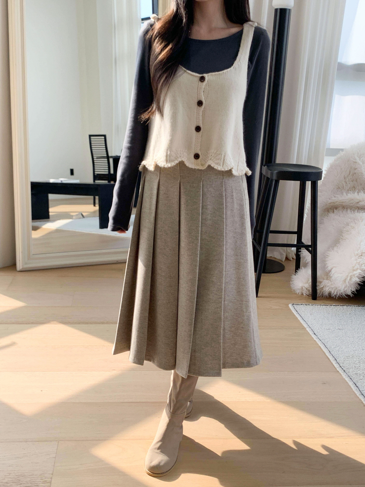 도톰한 모직 원단의 플리츠 롱 스커트