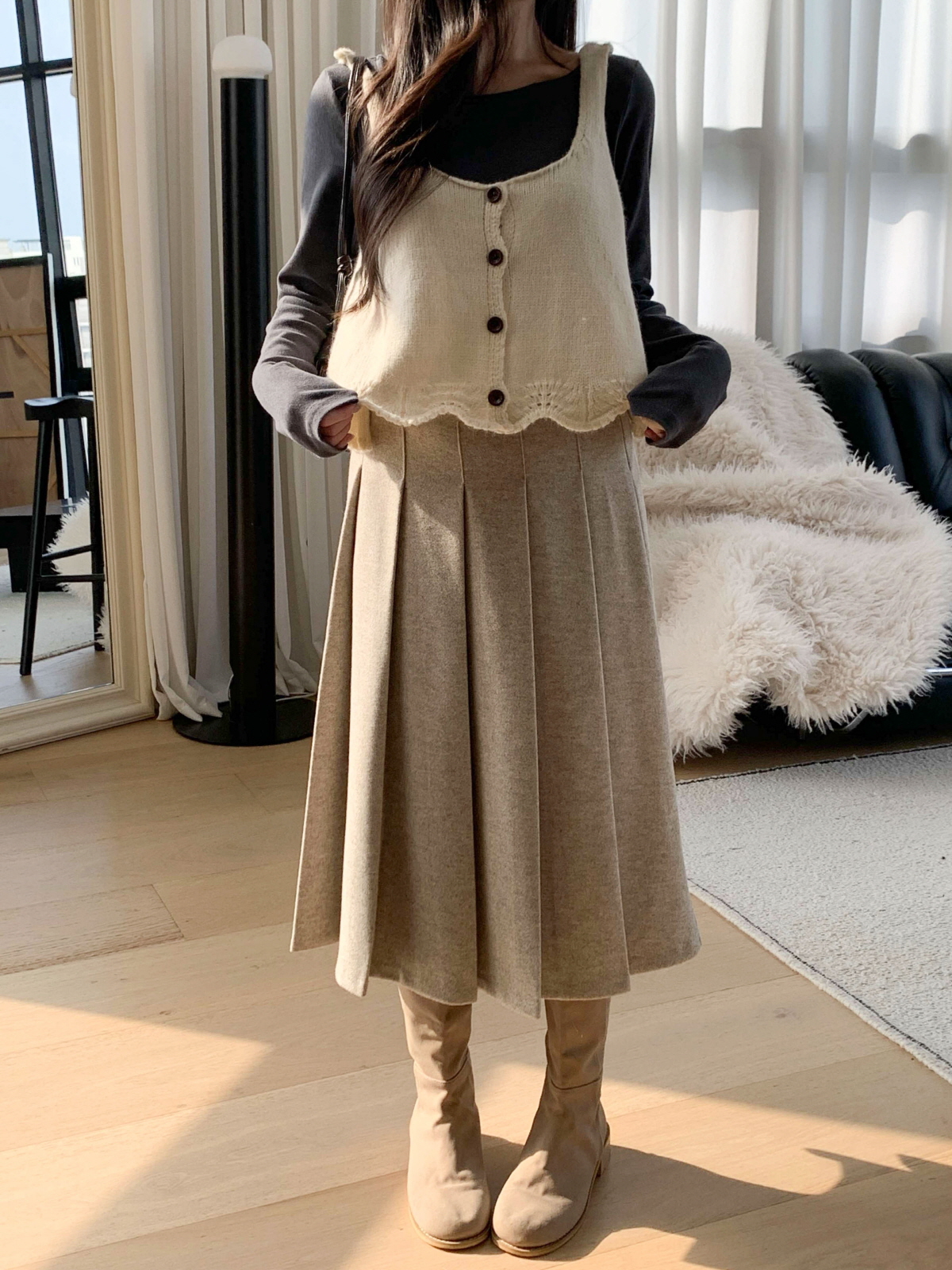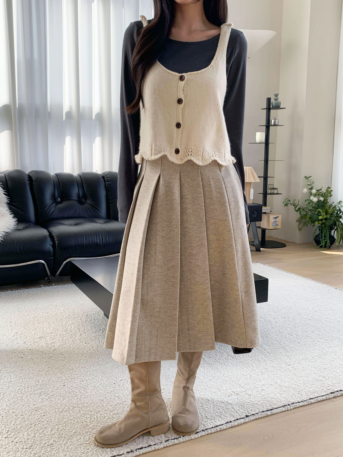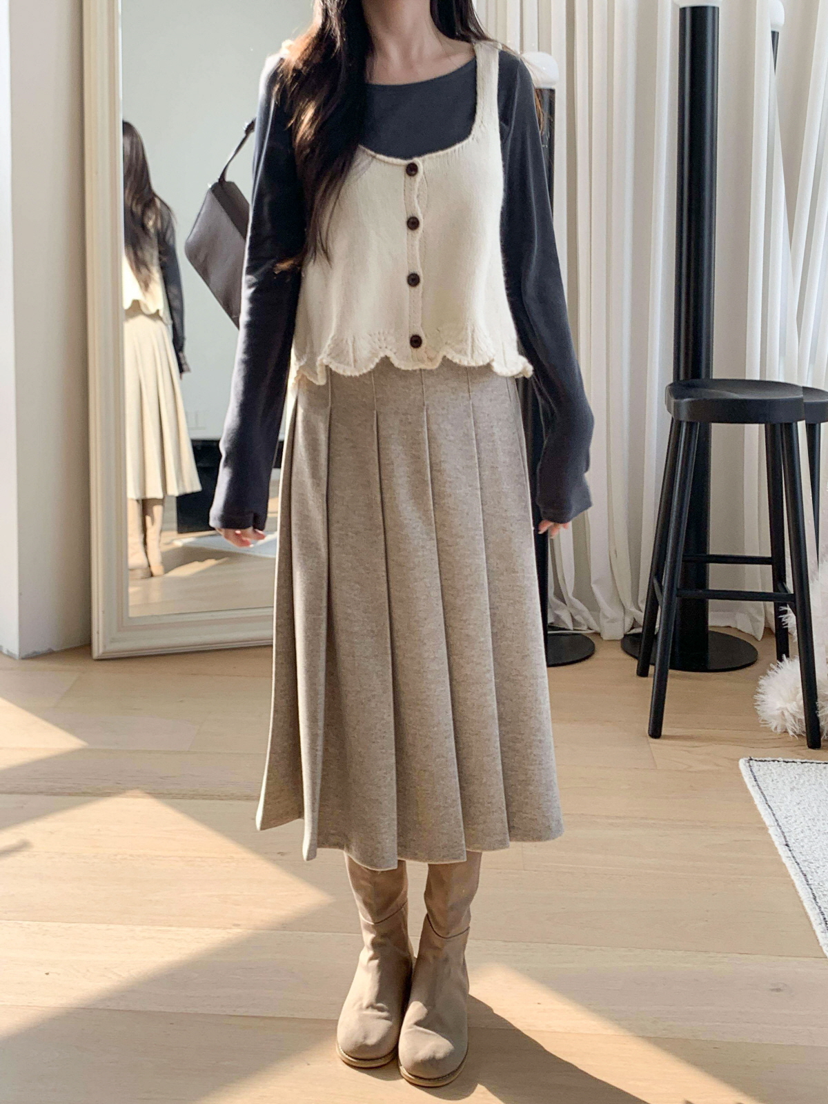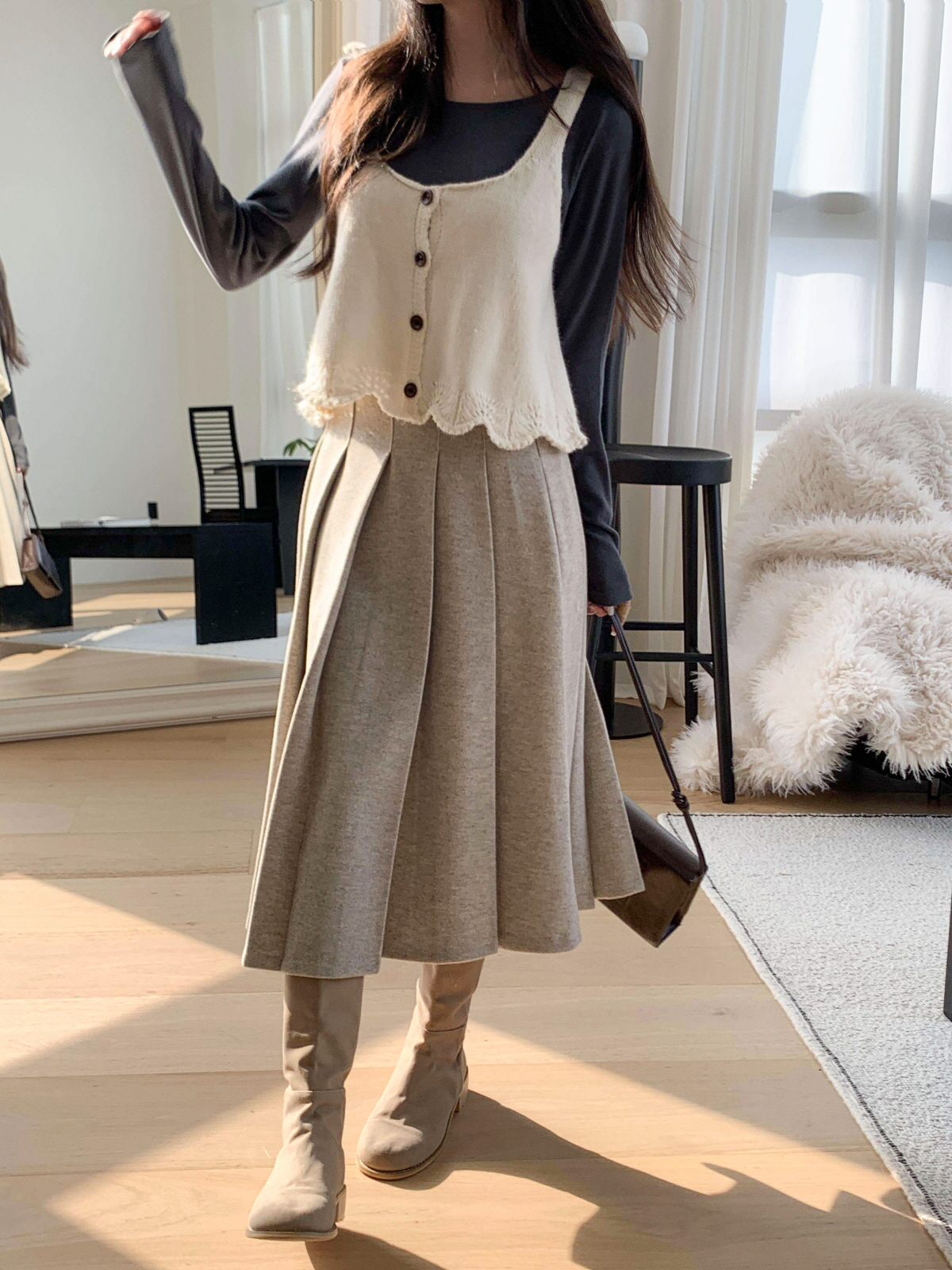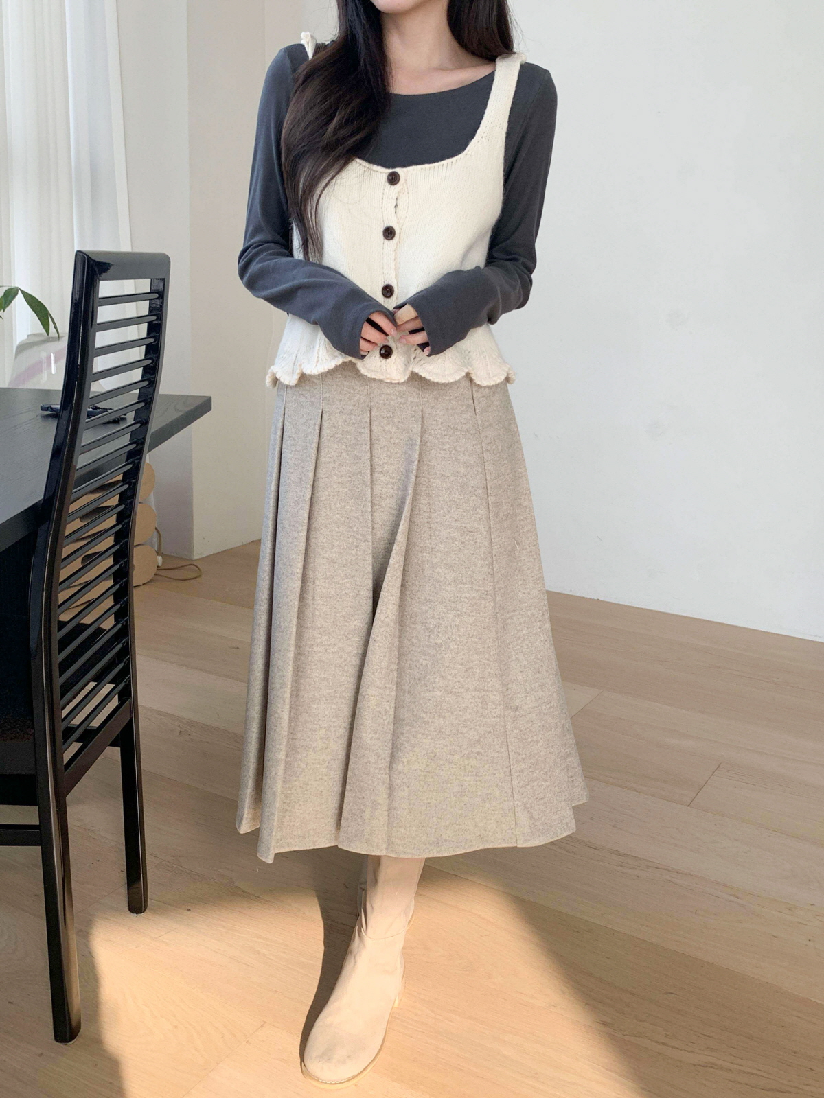 도톰한 모직 원단의 플리츠 롱 스커트