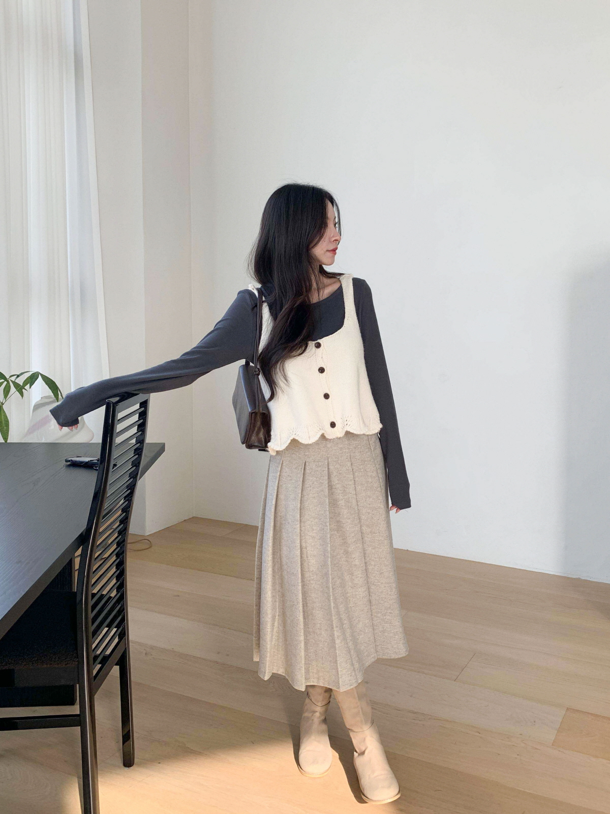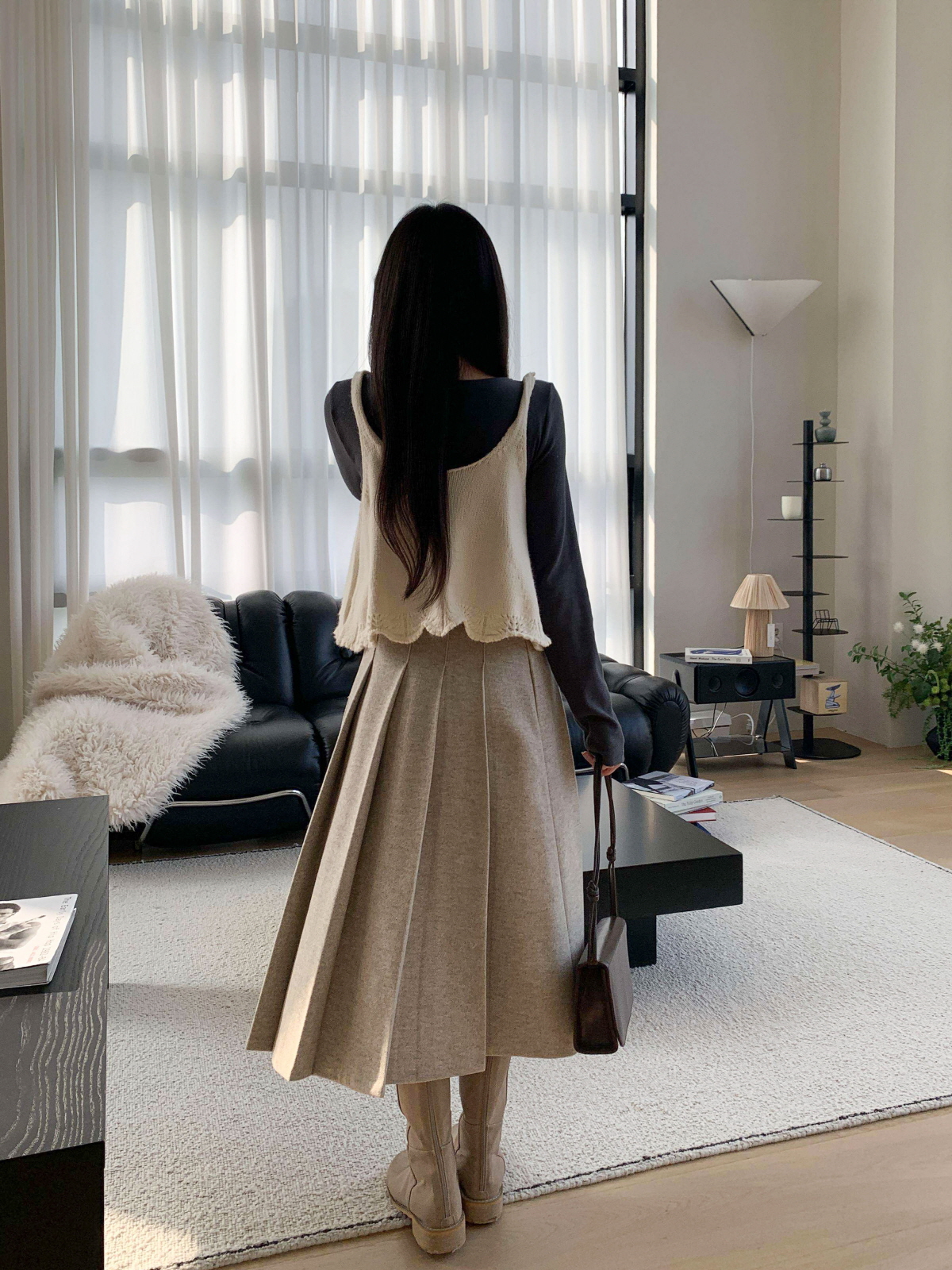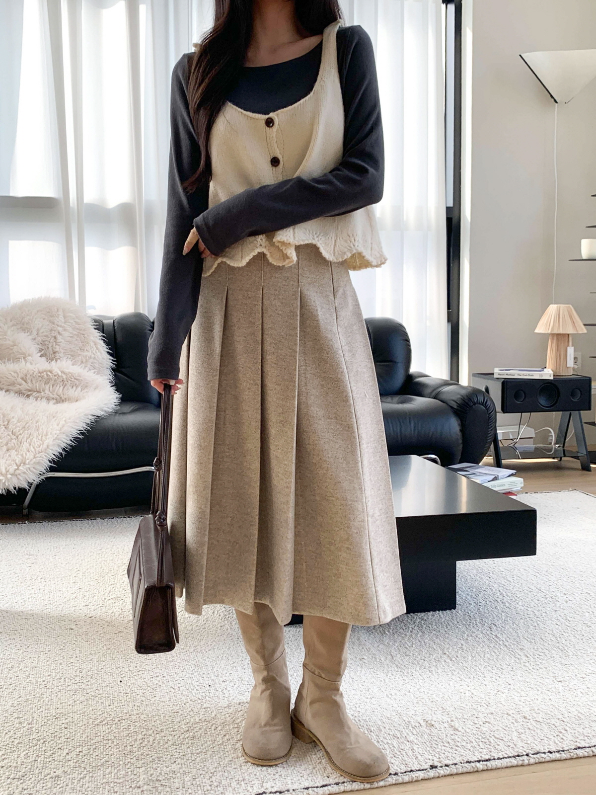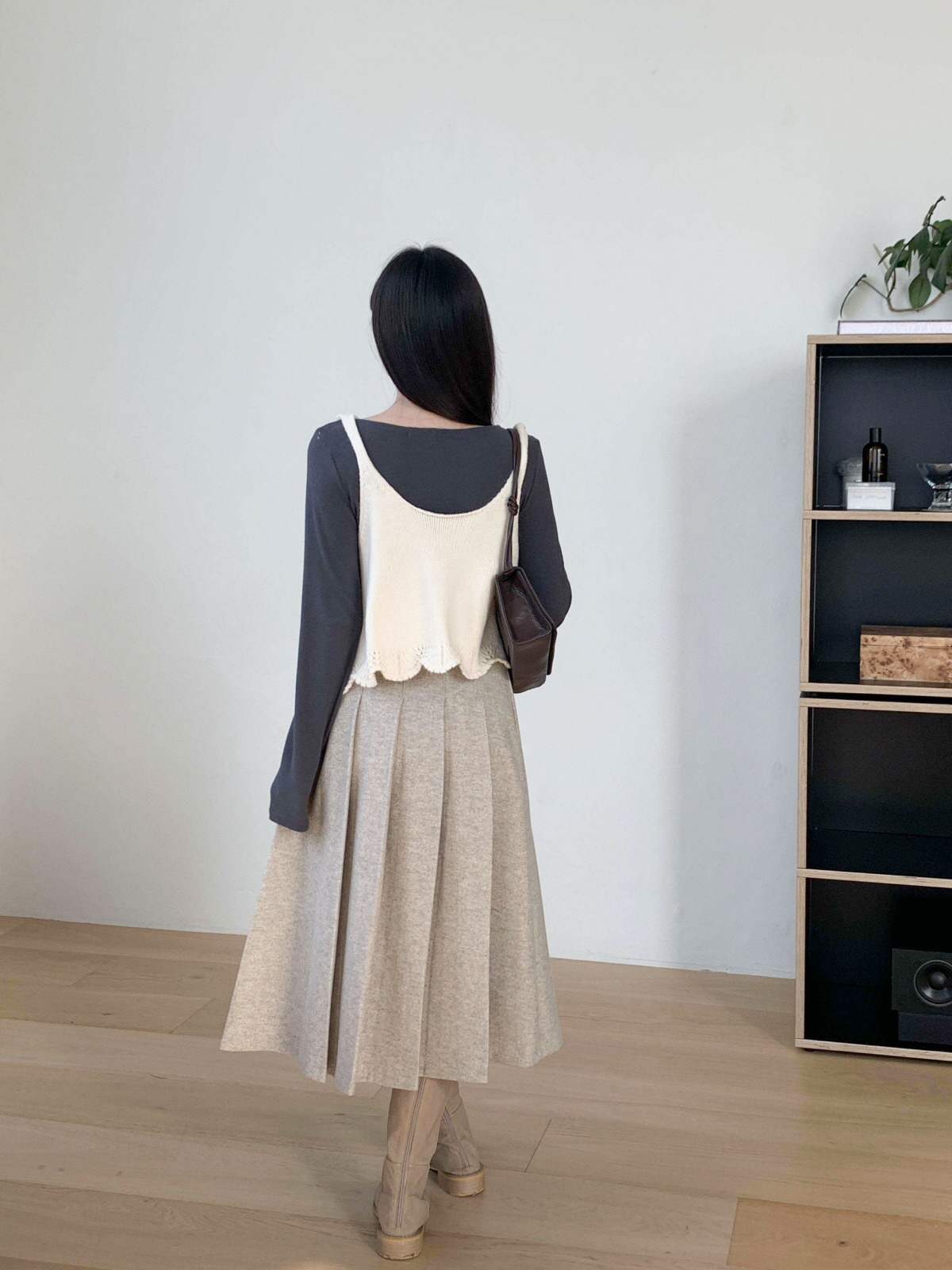 도톰한 모직 원단의 플리츠 롱 스커트