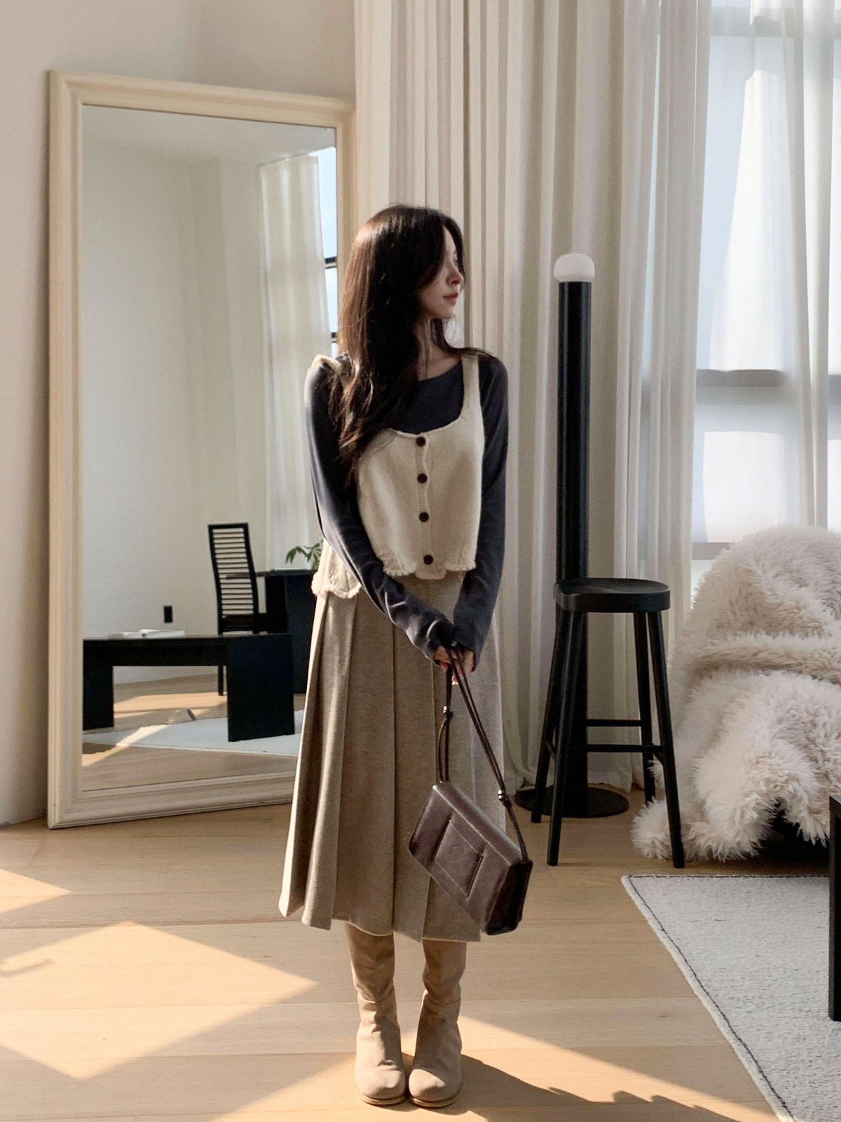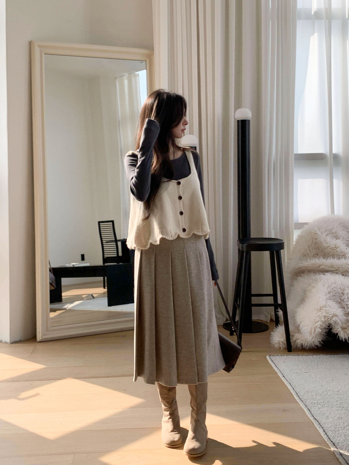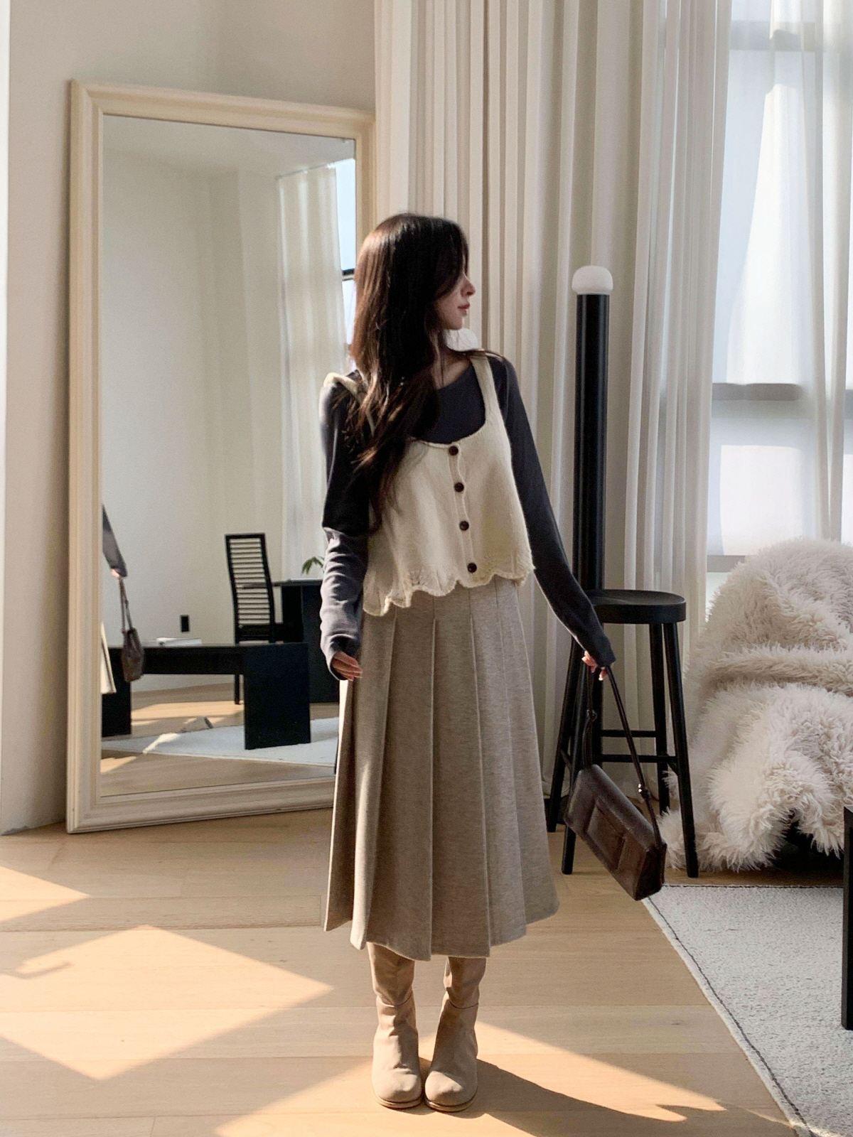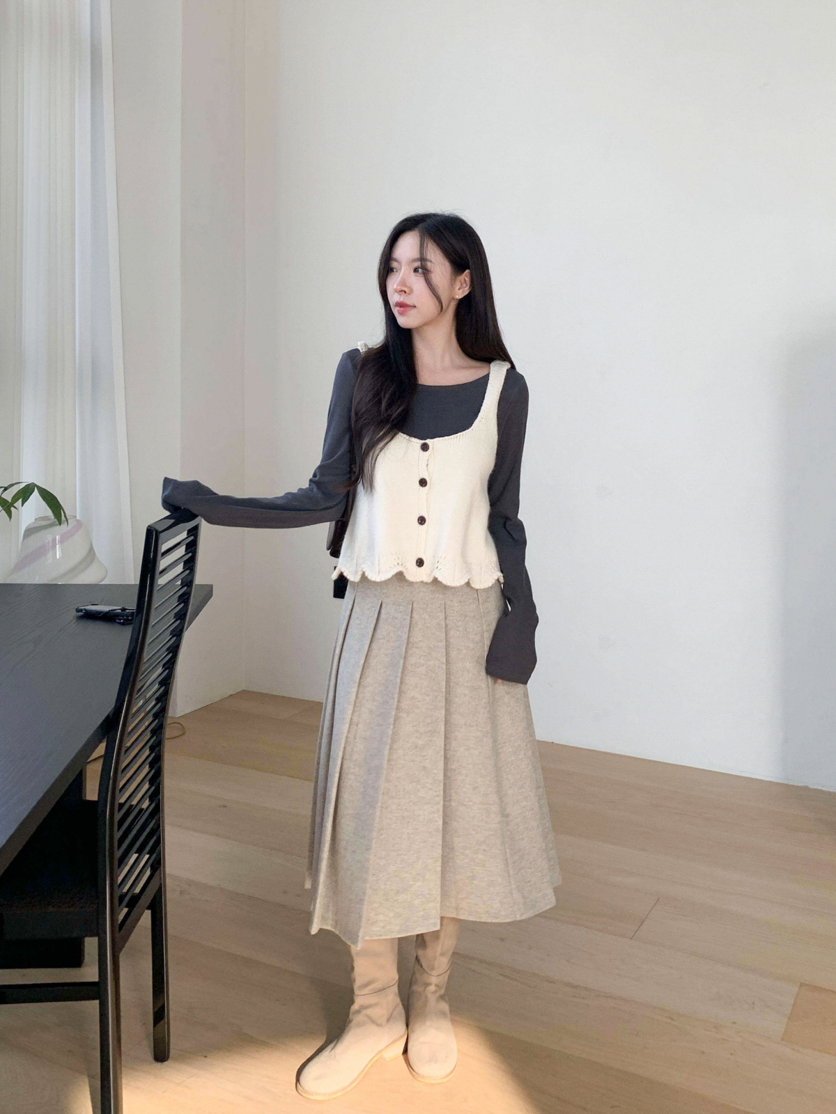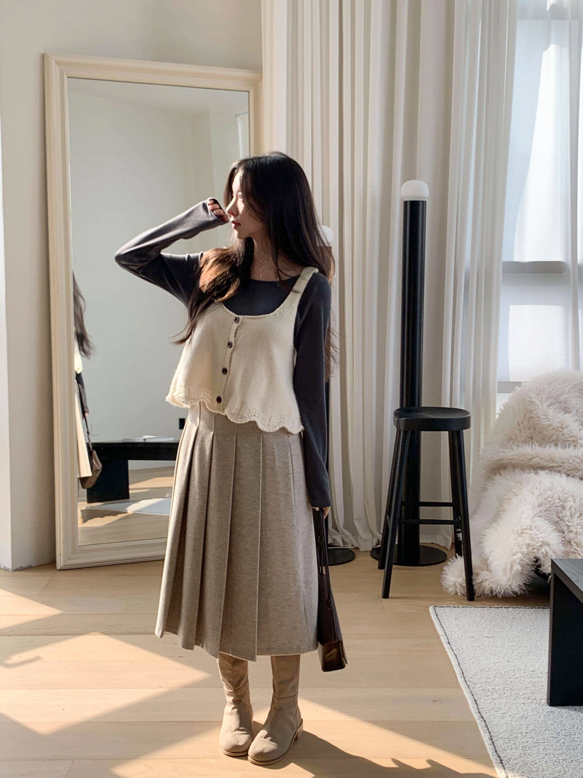 도톰한 모직 원단의 플리츠 롱 스커트