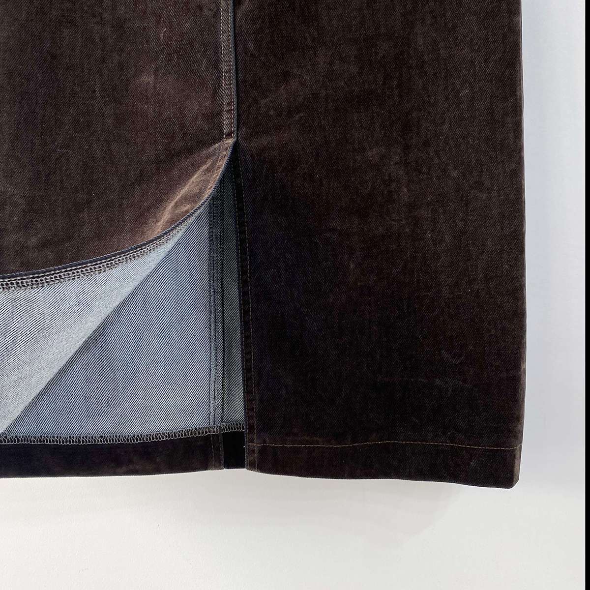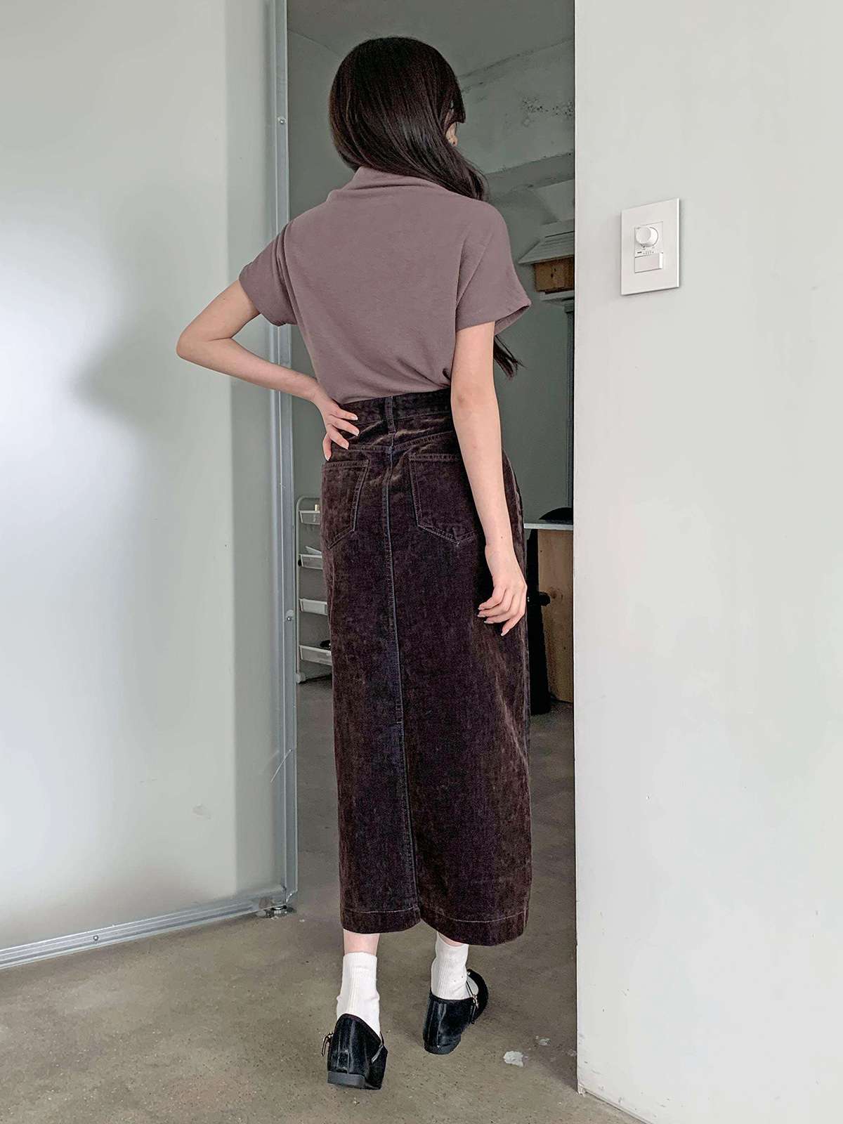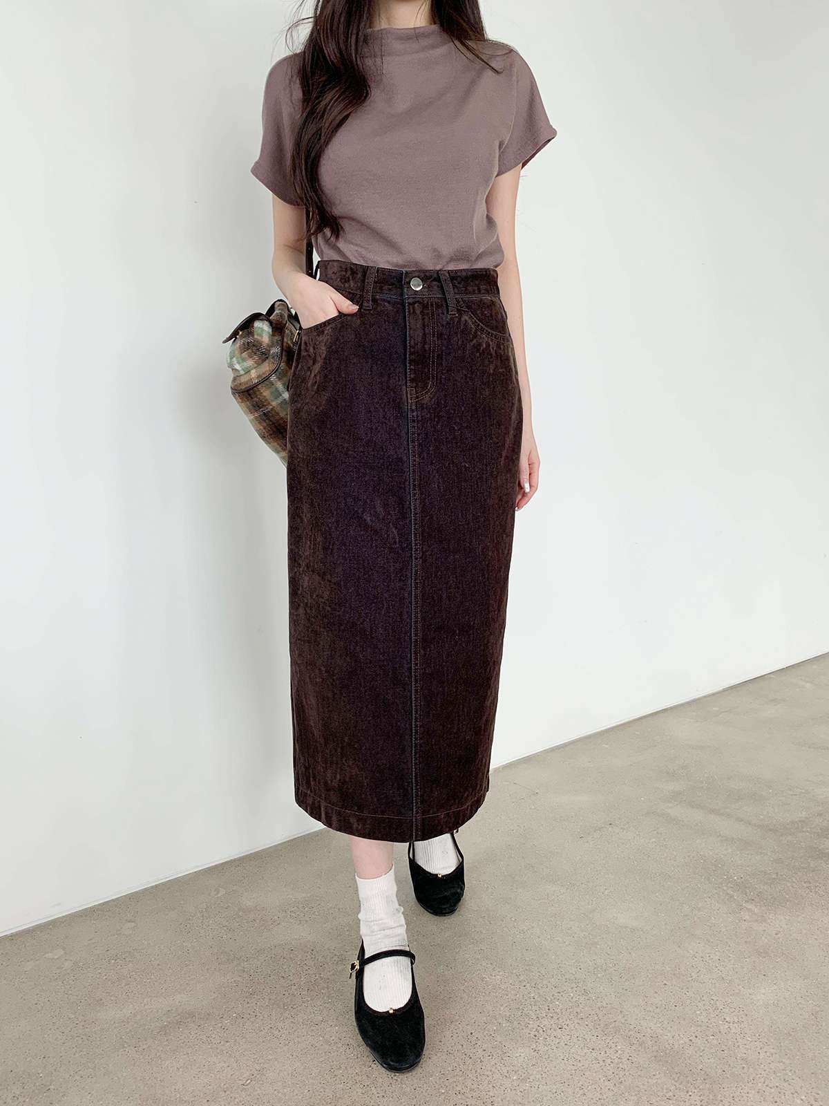 뒤에 트임이 있어서 활동하기 편한 벨벳 데님 롱 스커트로
