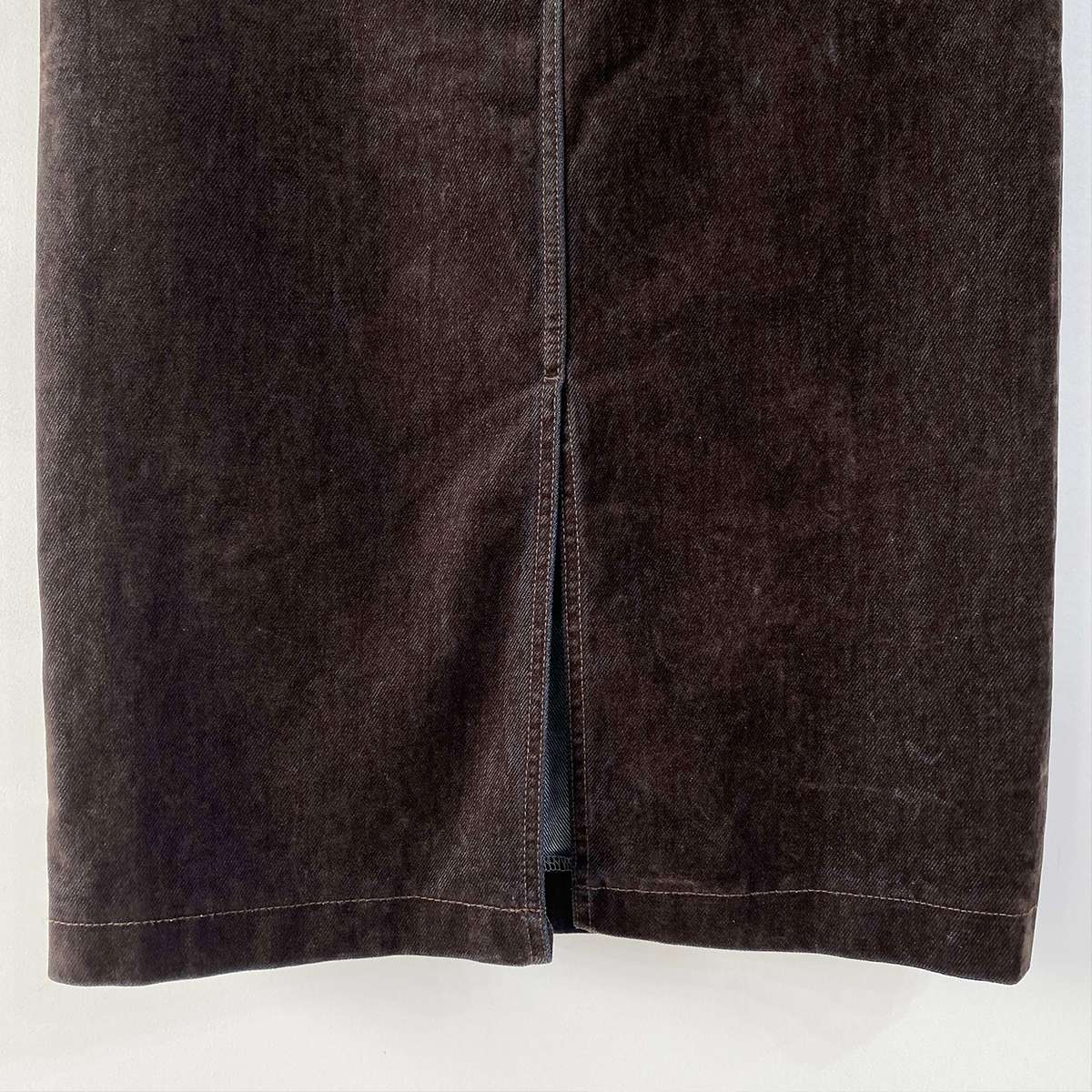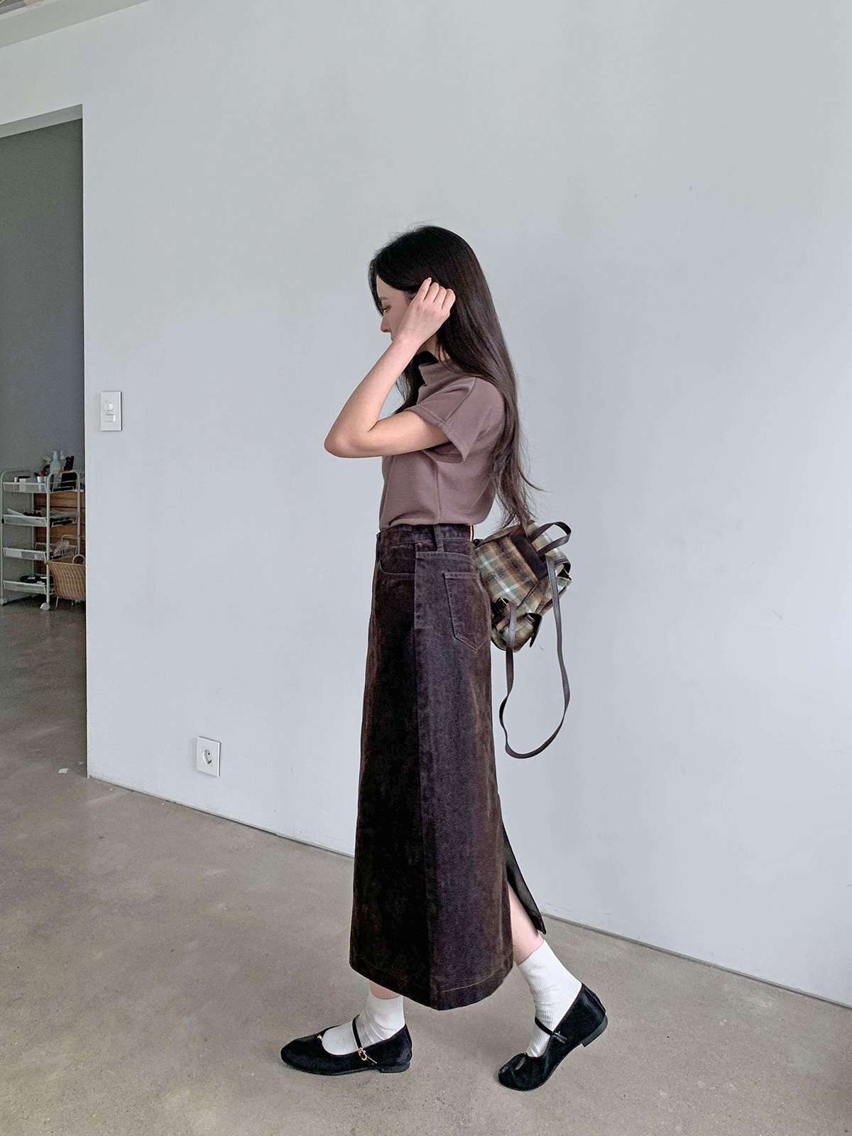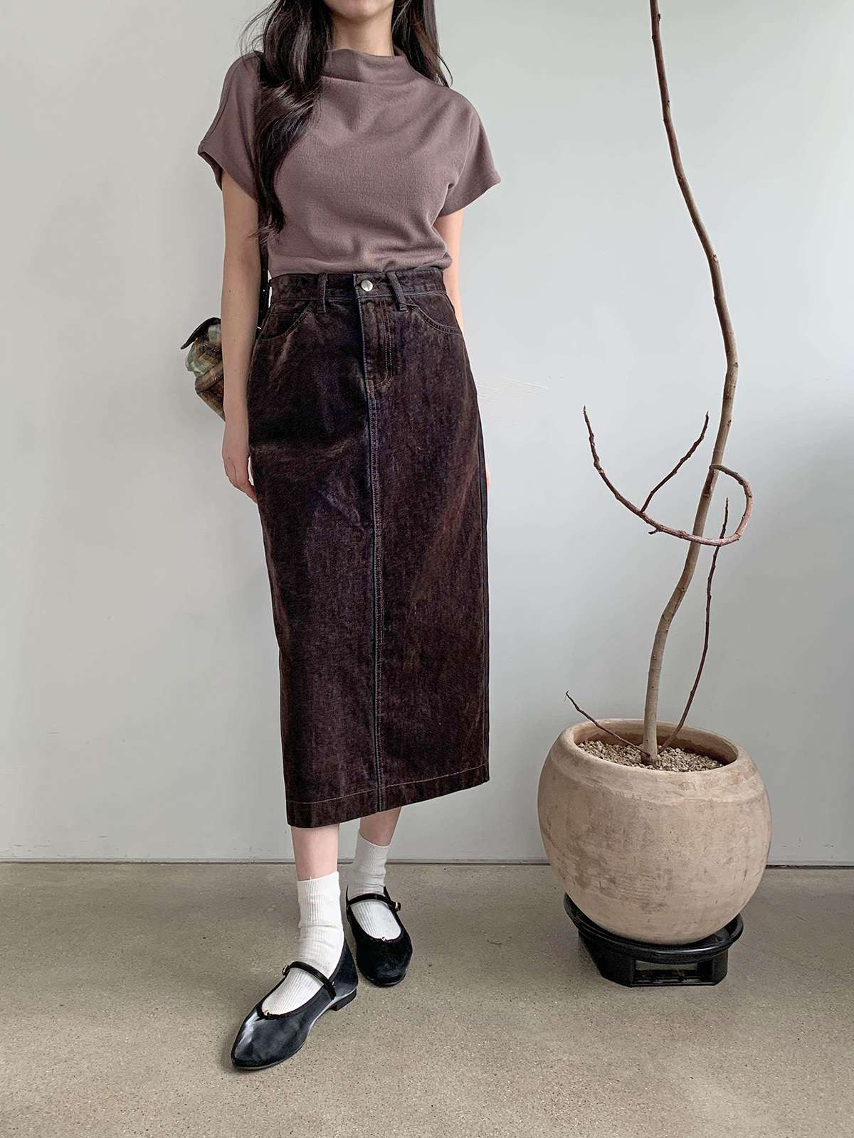뒤에 트임이 있어서 활동하기 편한 벨벳 데님 롱 스커트로