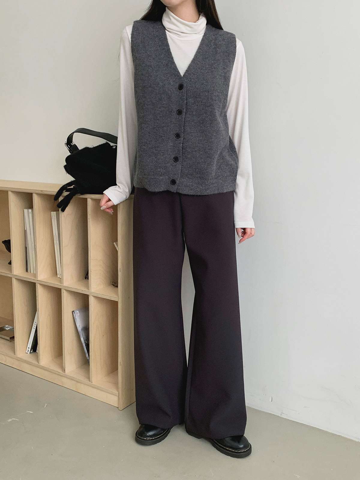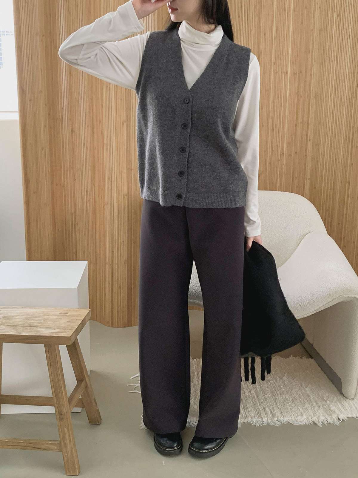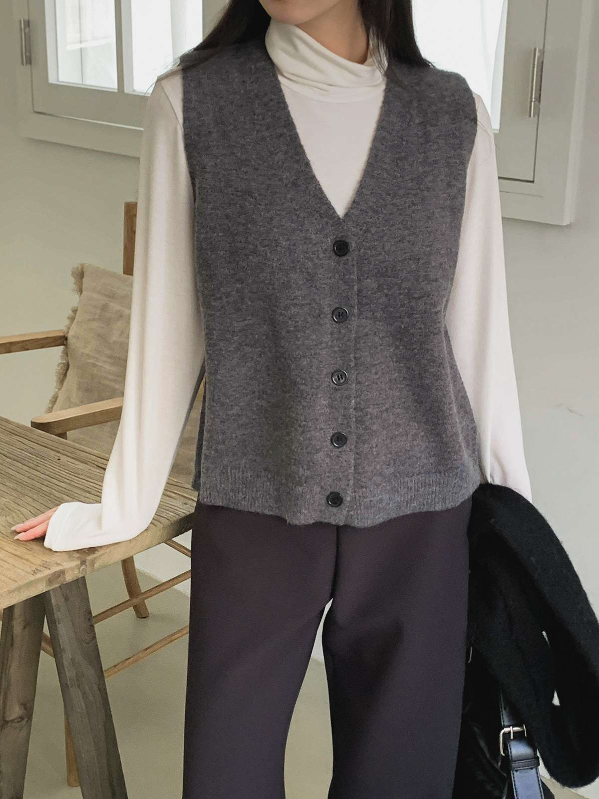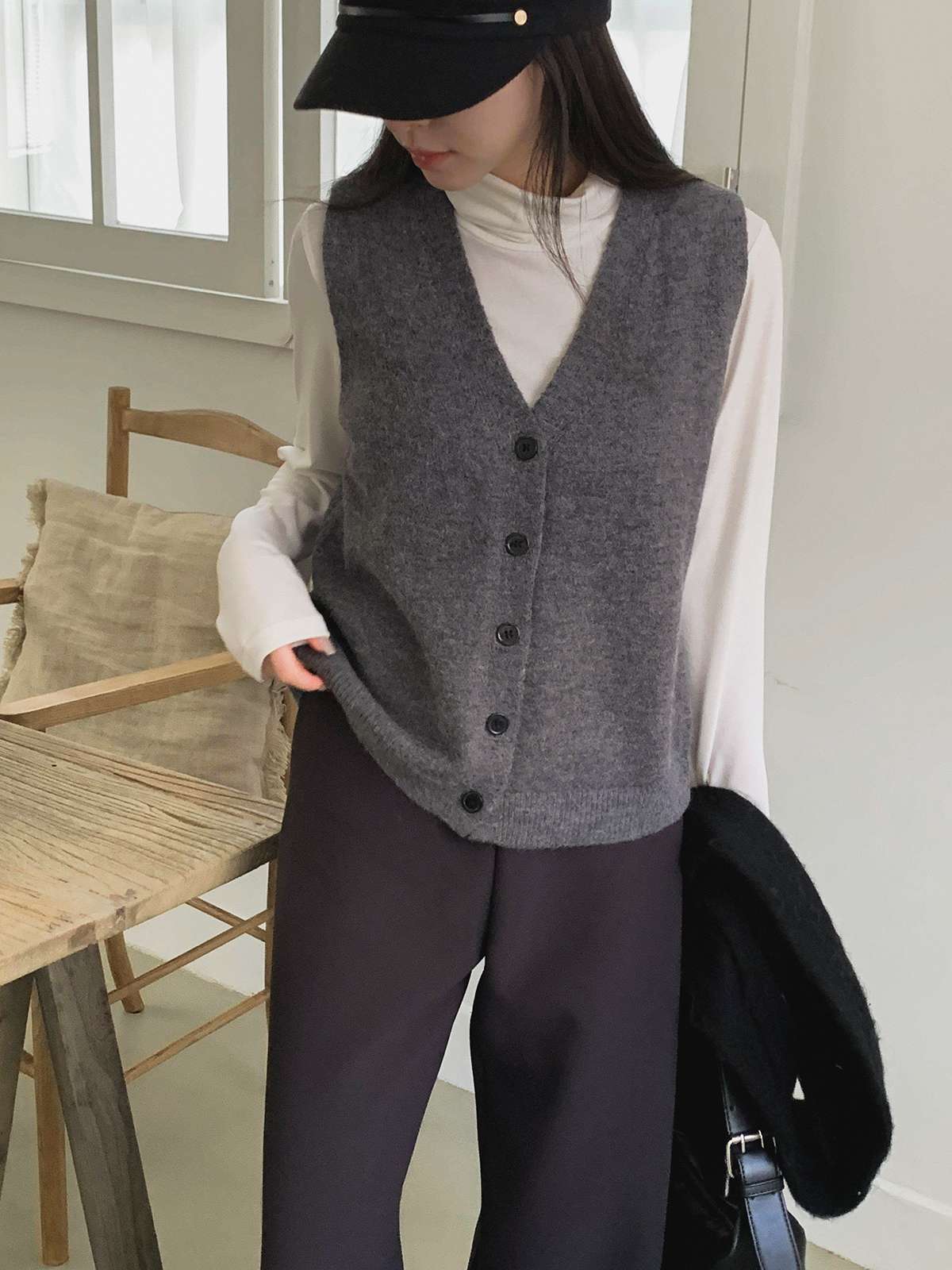 오버핏 사이즈의 부드러운 버튼 니트 베스트