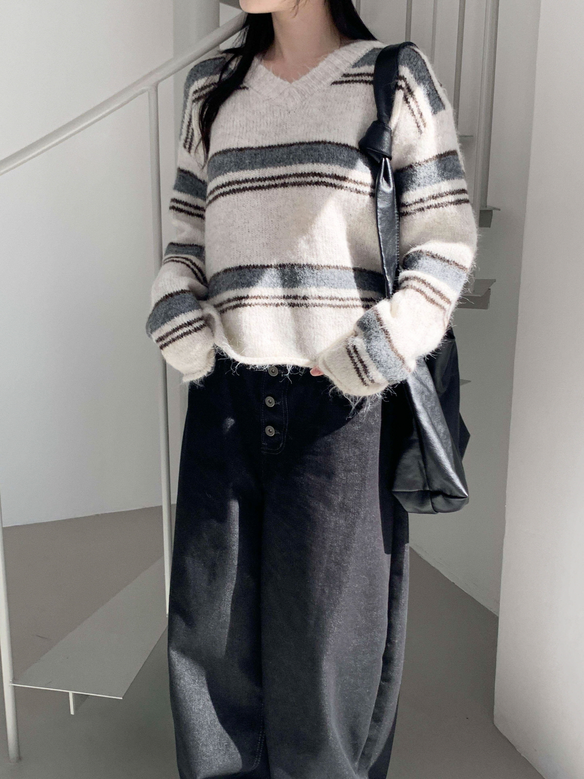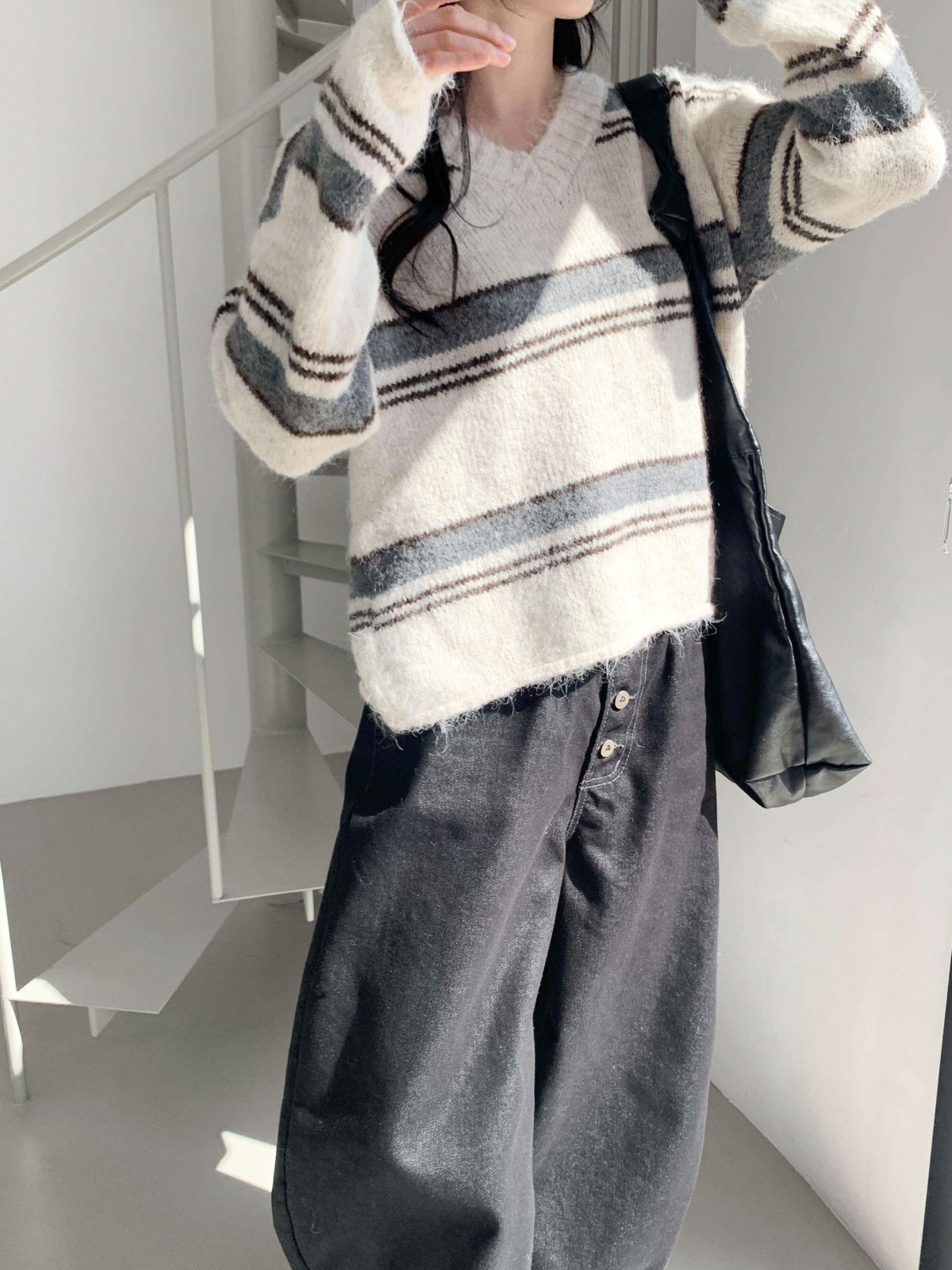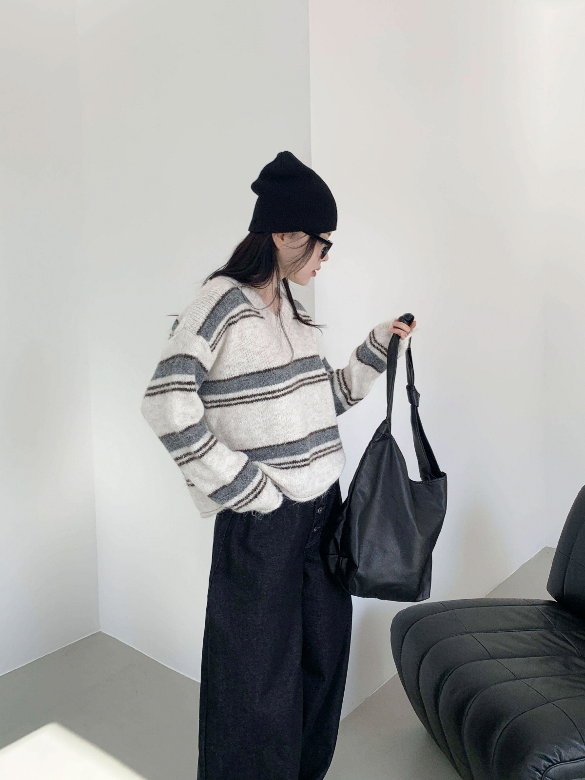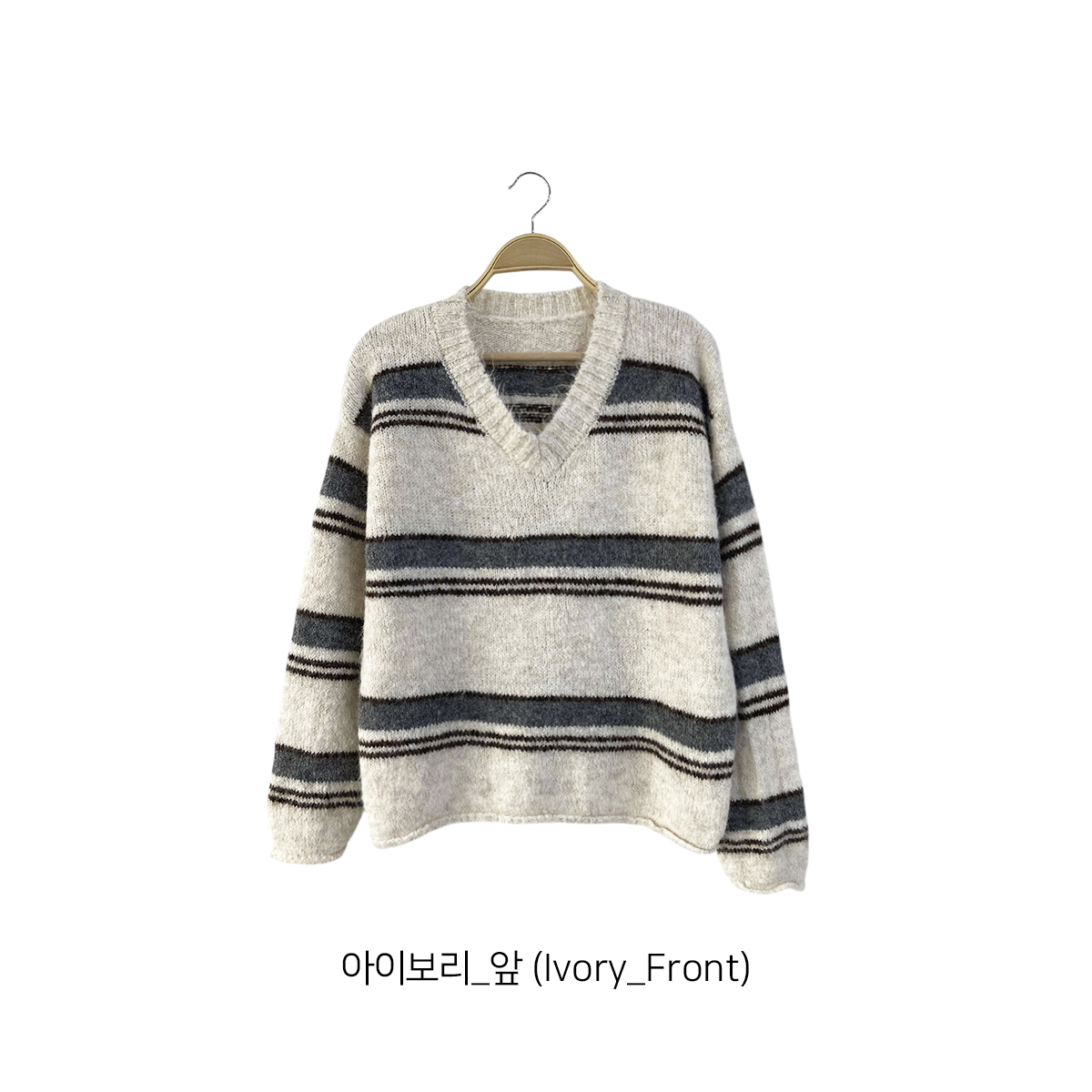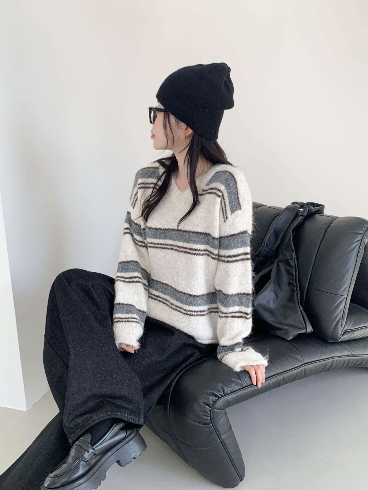[ NT6049K5A-소프드 불규칙 단가라 오버핏 브이넥 니트 ]