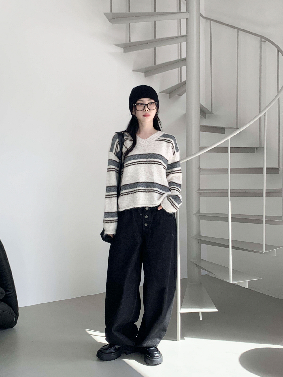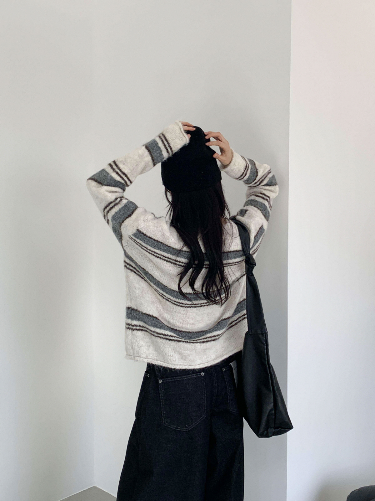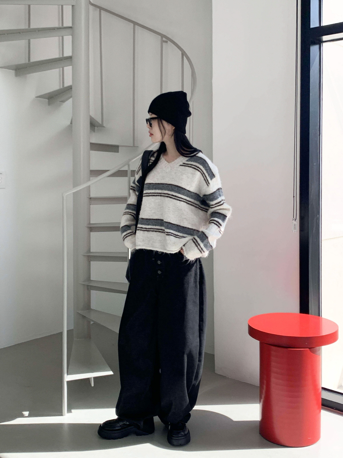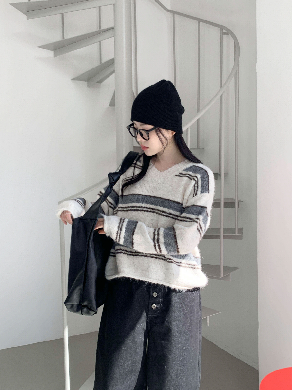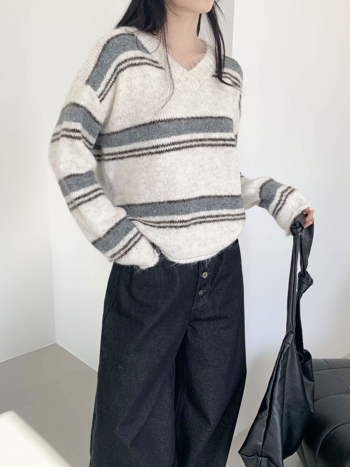 [ NT6049K5A-소프드 불규칙 단가라 오버핏 브이넥 니트 ]