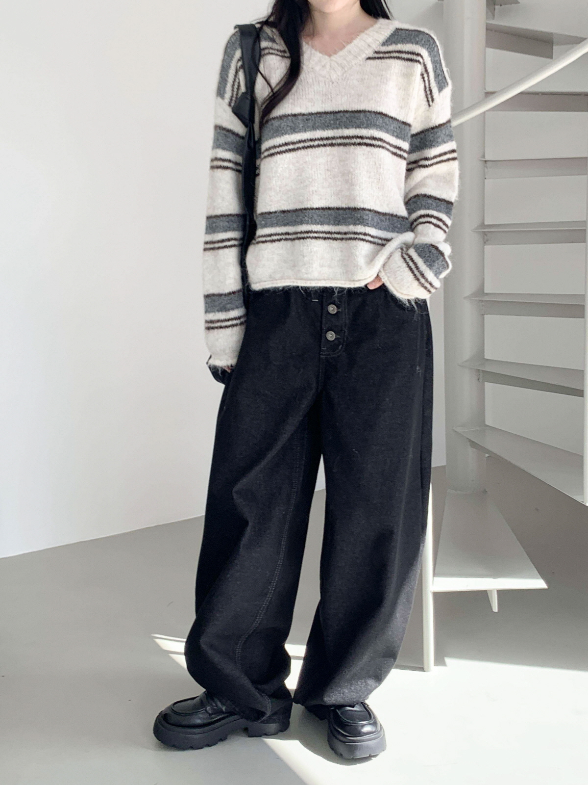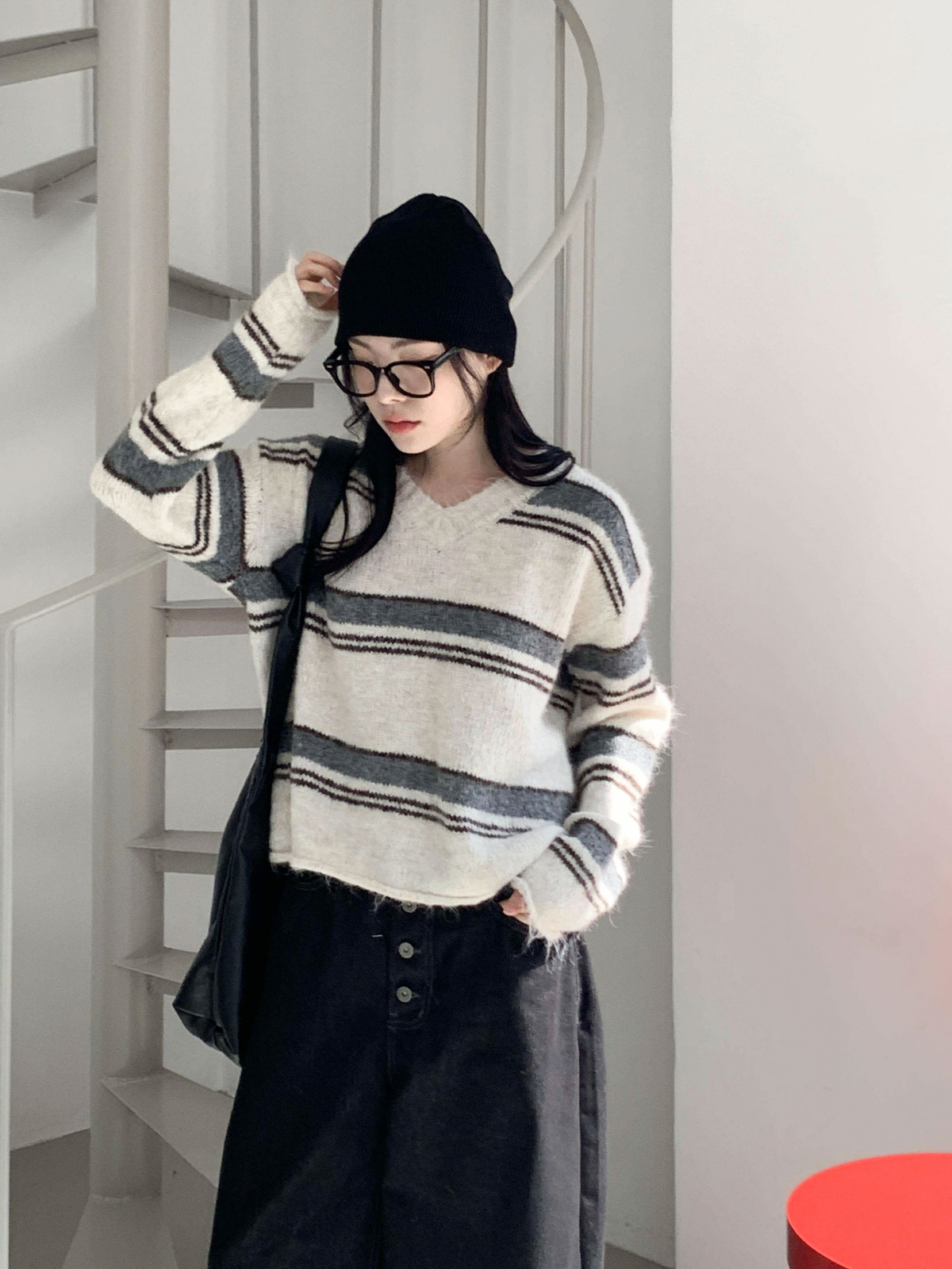 폭닥폭닥 포근한 느낌의 박시핏 브이넥 니트