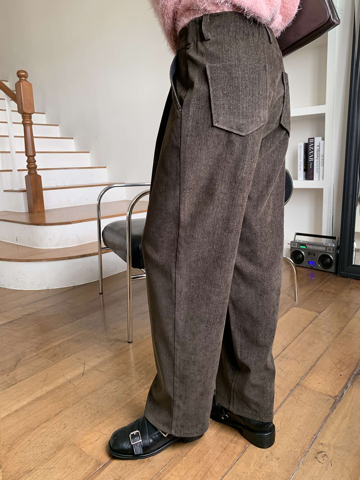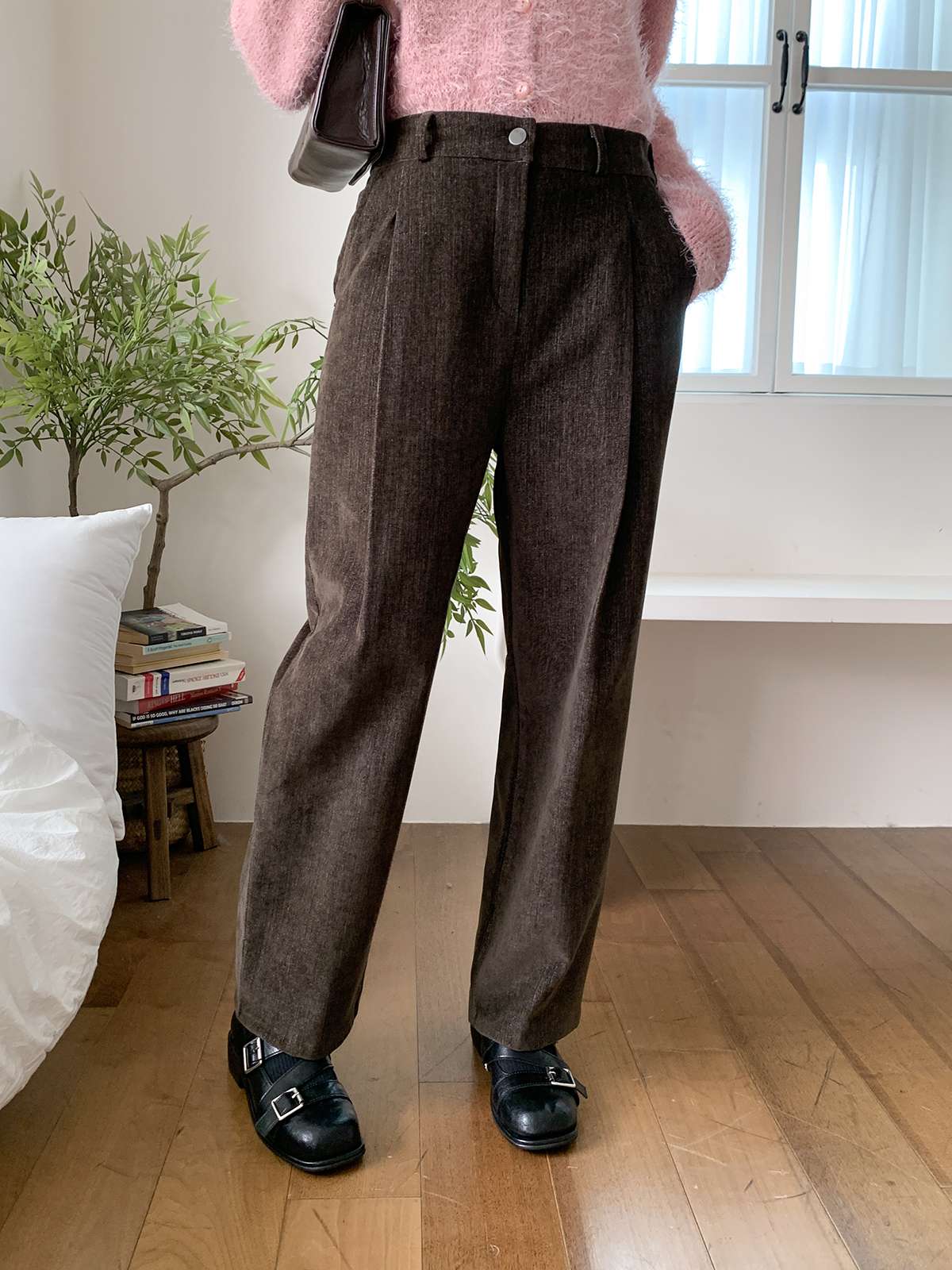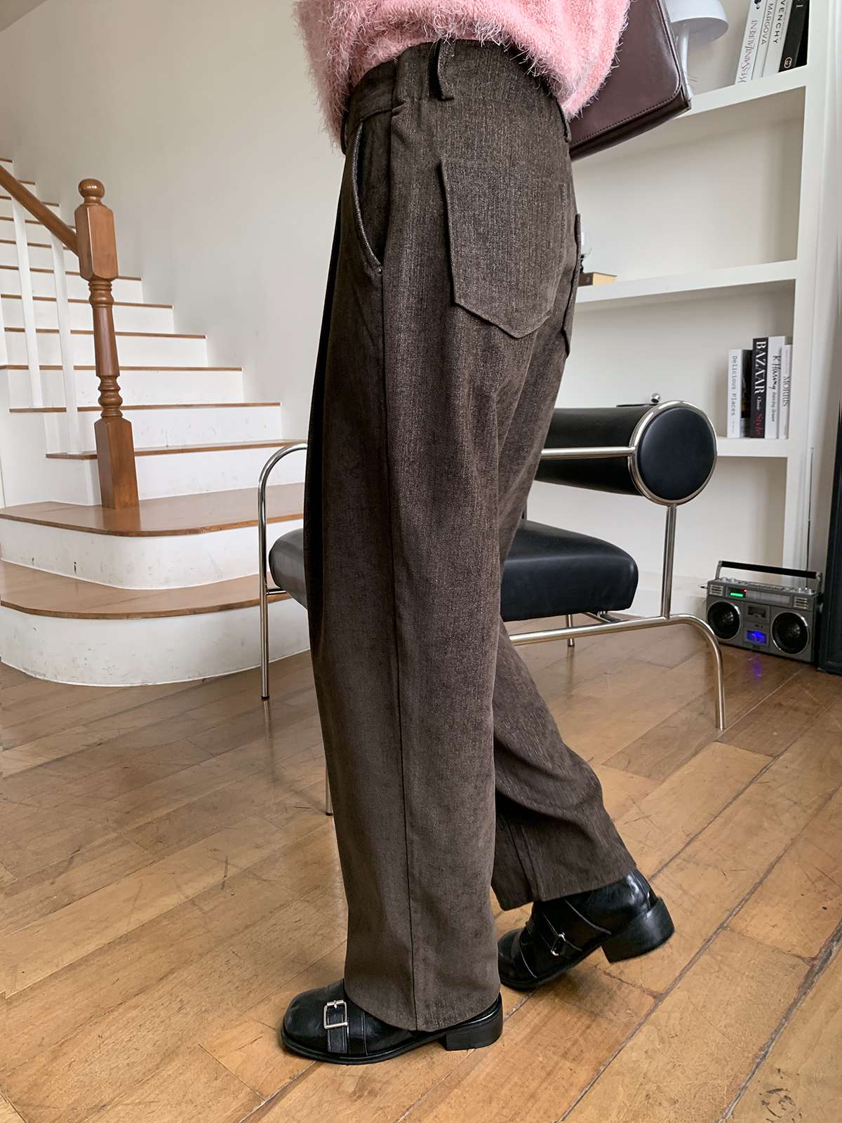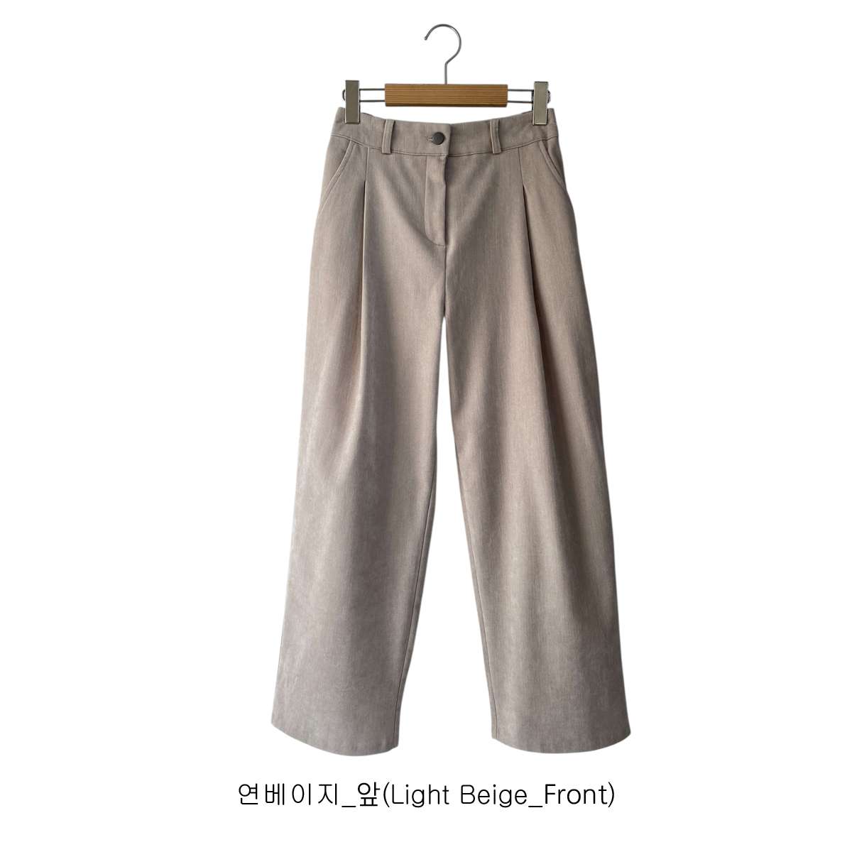 고급스러운 질감의 스웨이드 핀턱 배기핏 기모 슬랙스