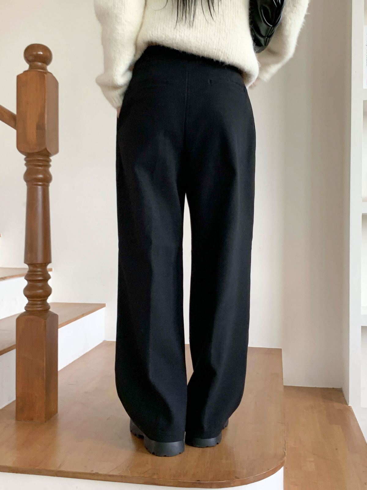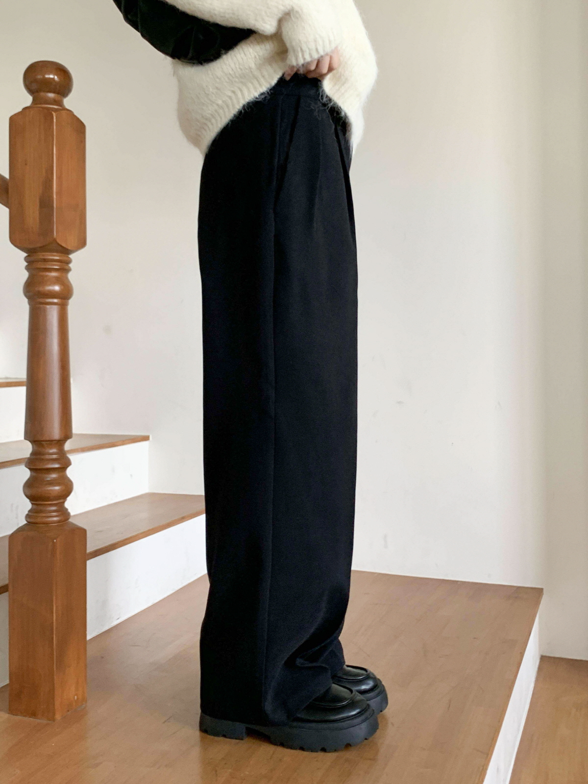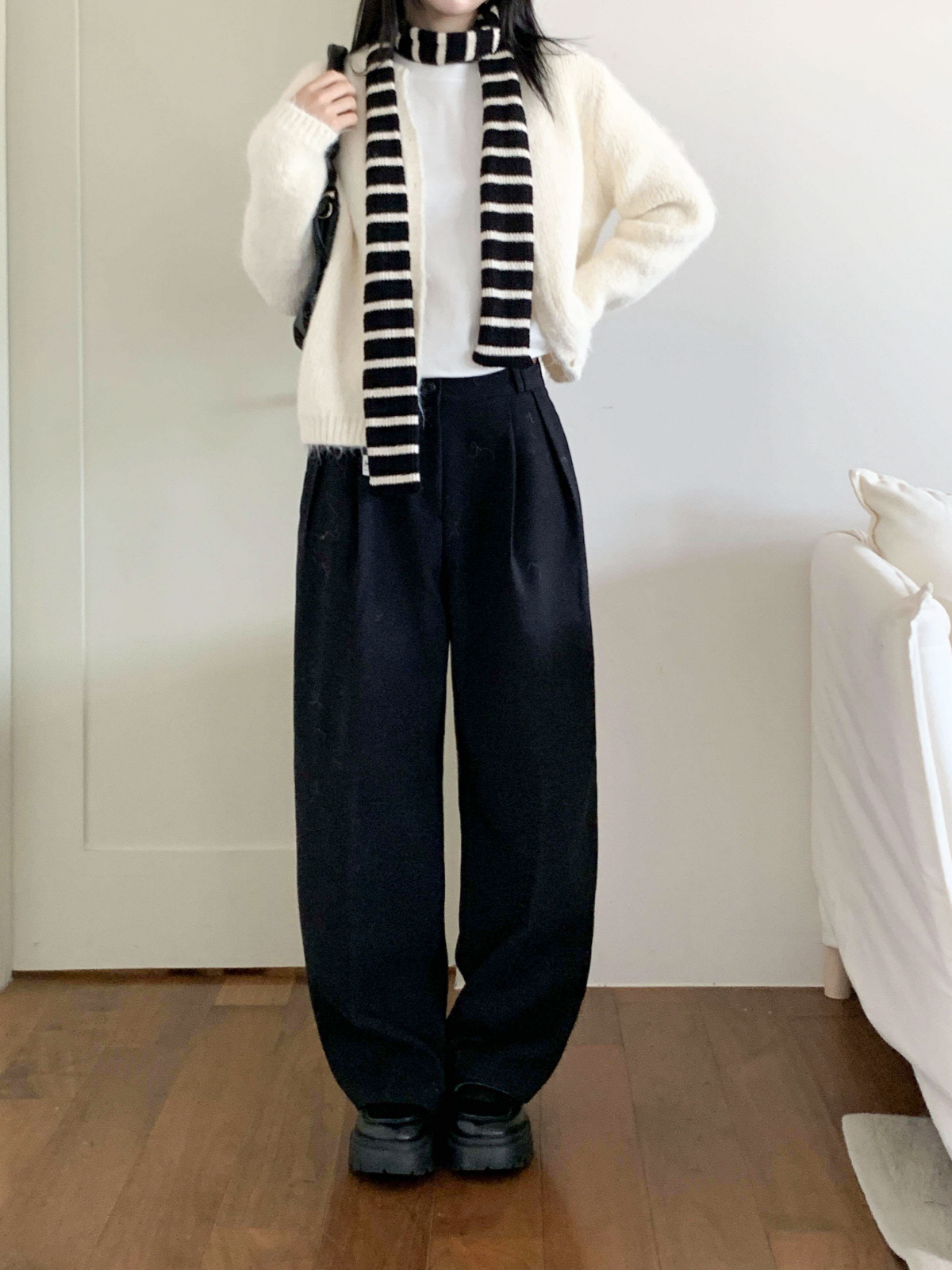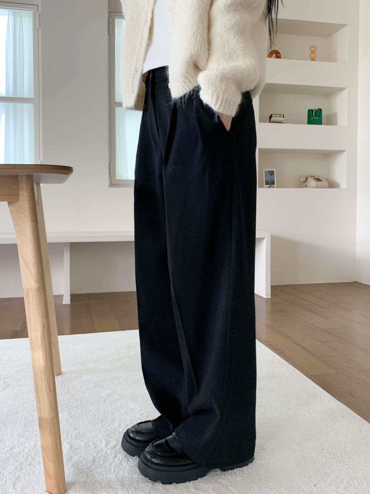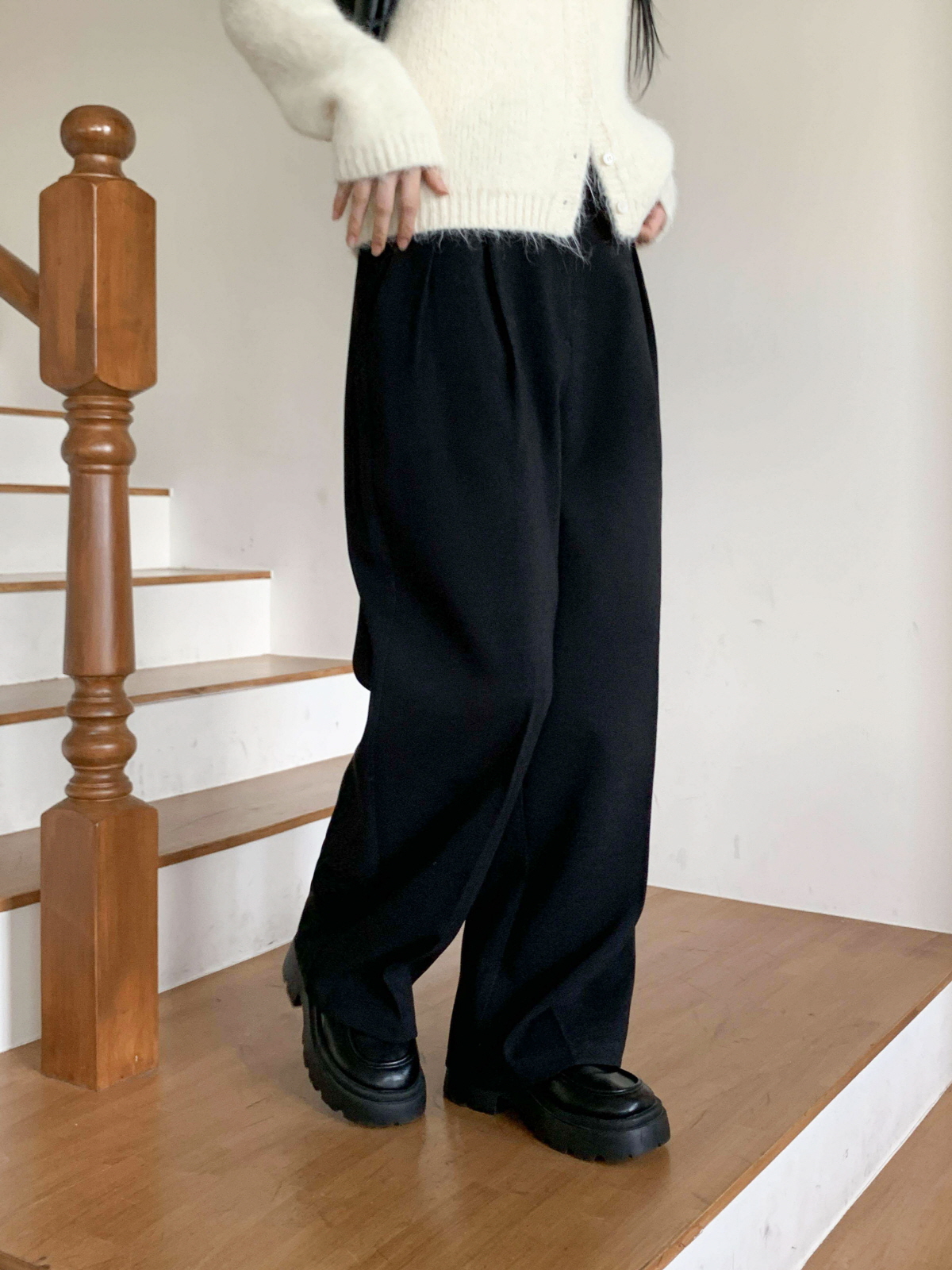 도톰한 두께감으로 한겨울까지 입기 좋은 모직 와이드 팬츠로