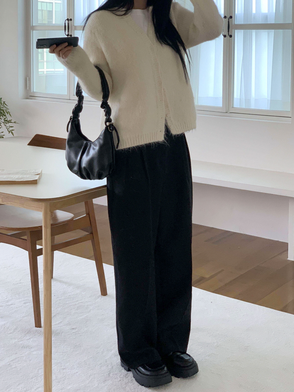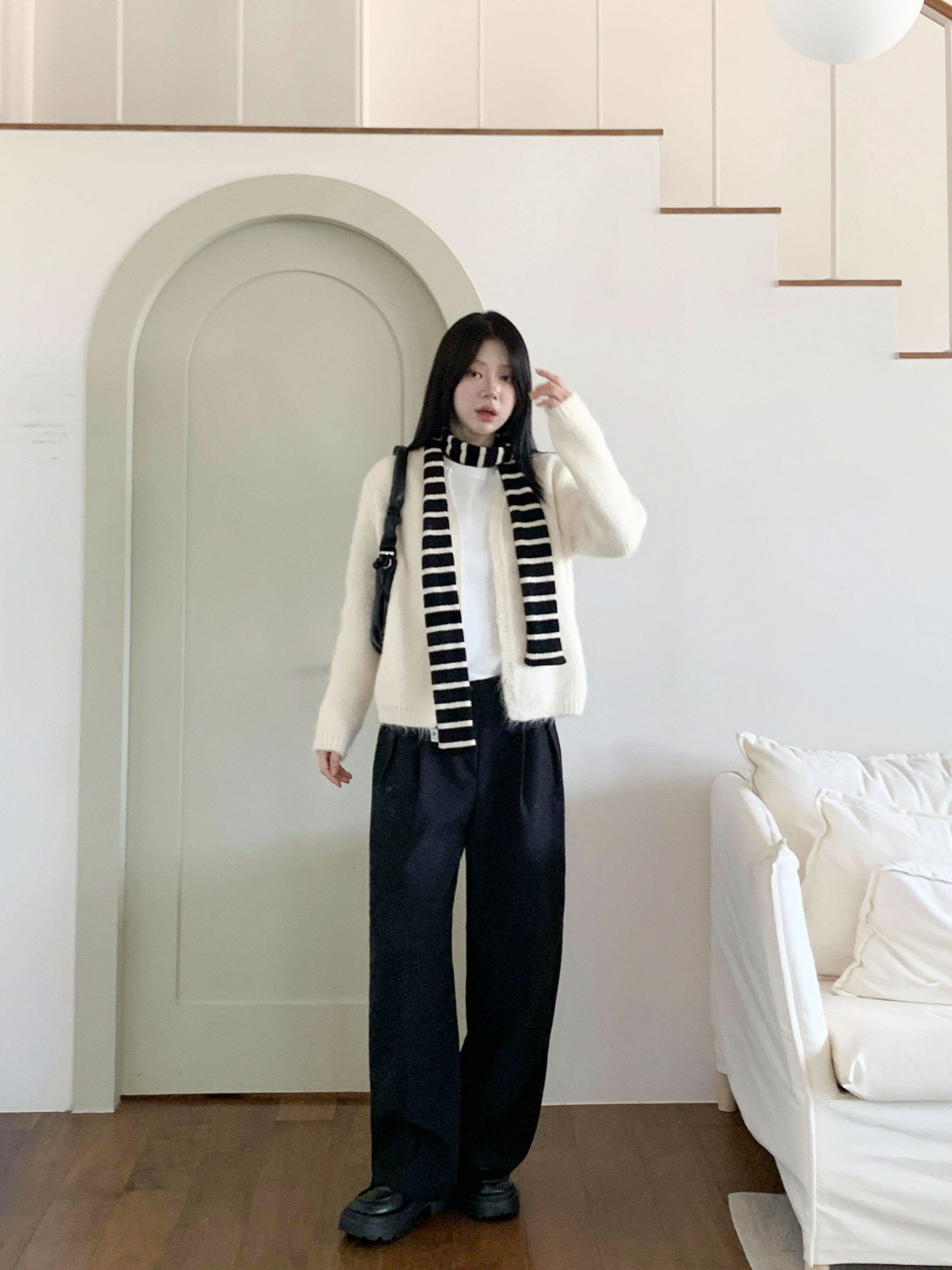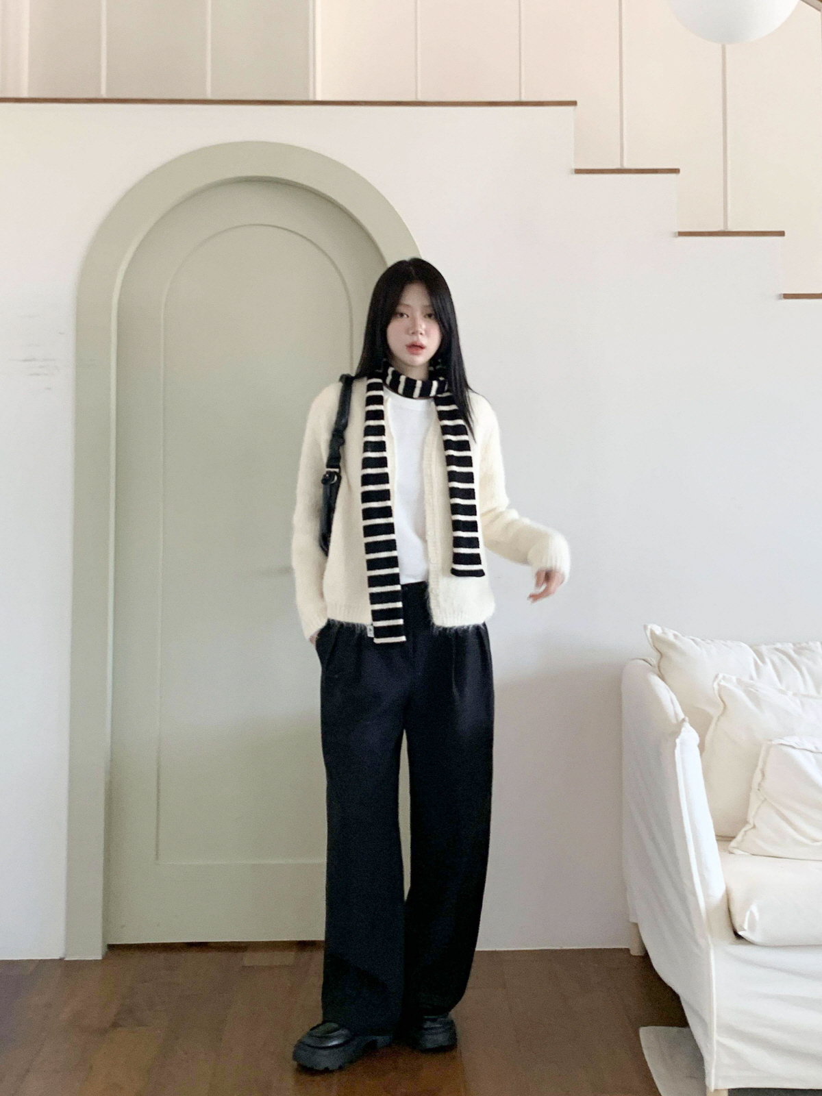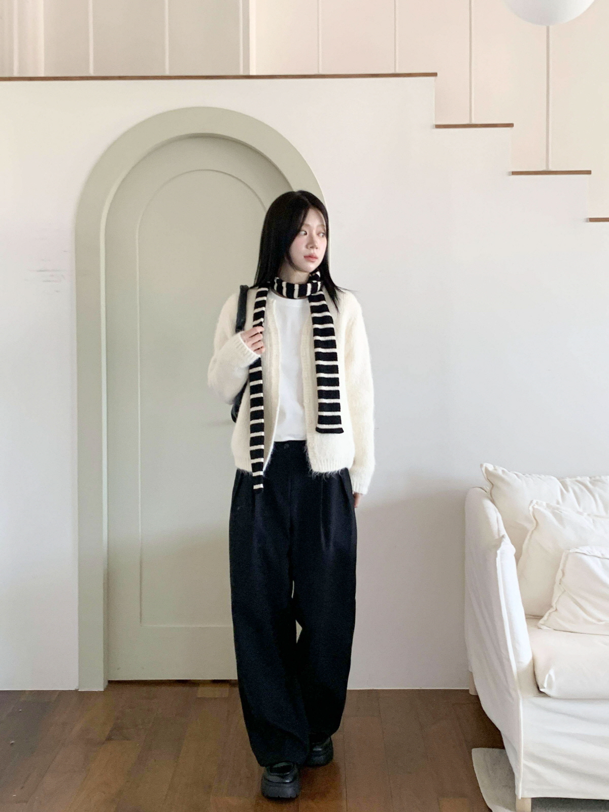 도톰한 두께감으로 한겨울까지 입기 좋은 모직 와이드 팬츠로