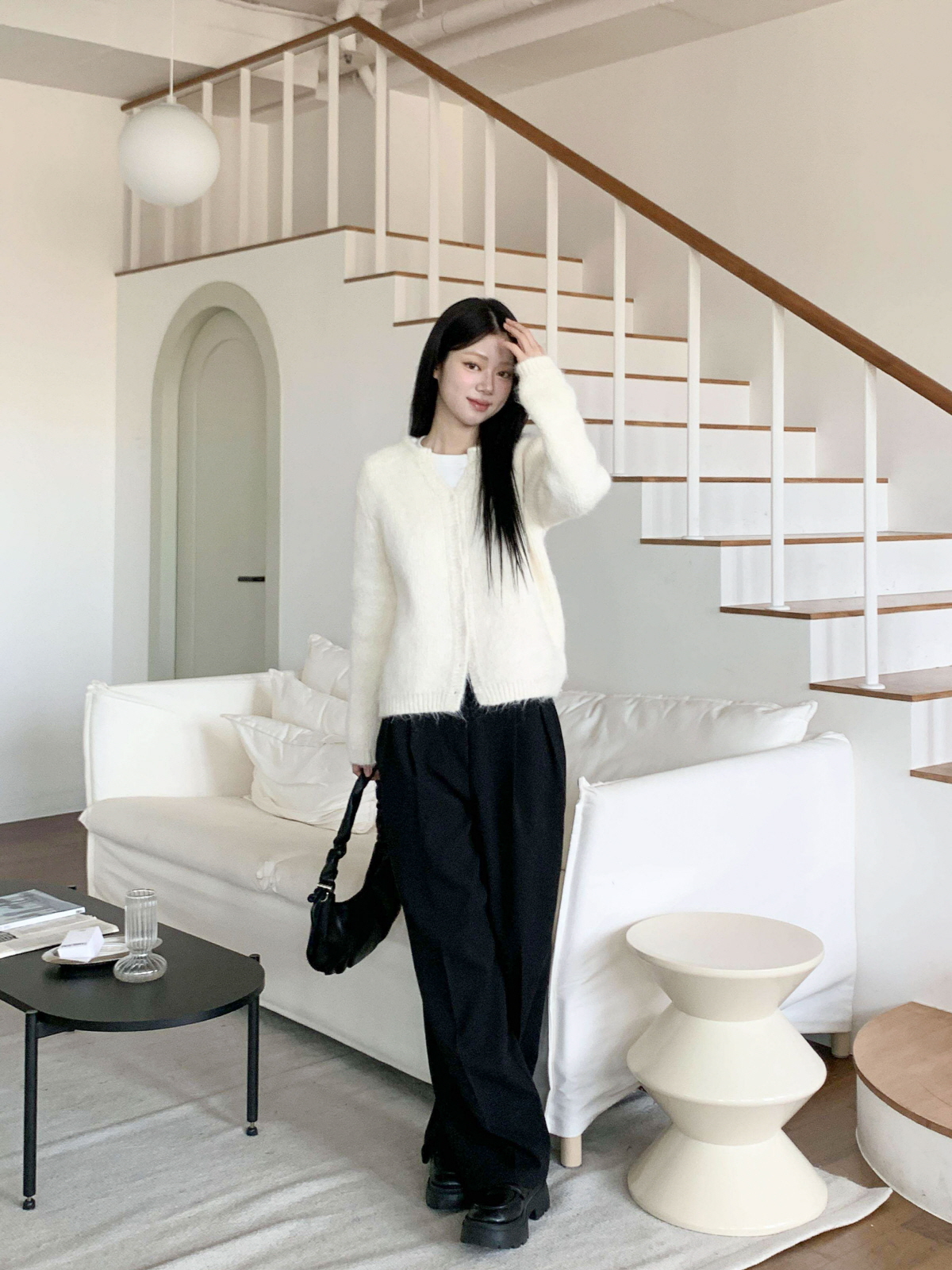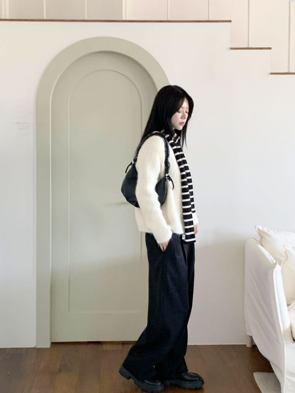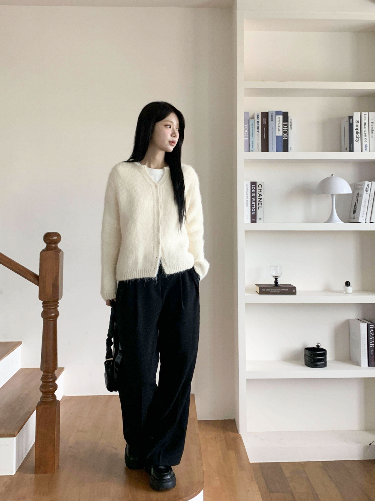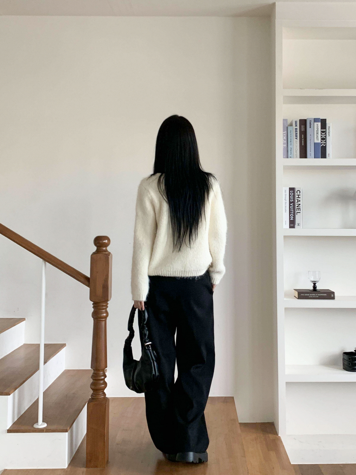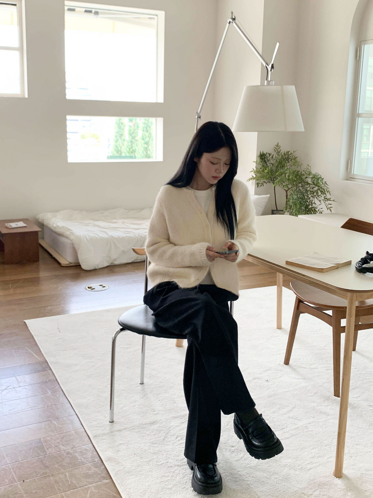 도톰한 두께감으로 한겨울까지 입기 좋은 모직 와이드 팬츠로