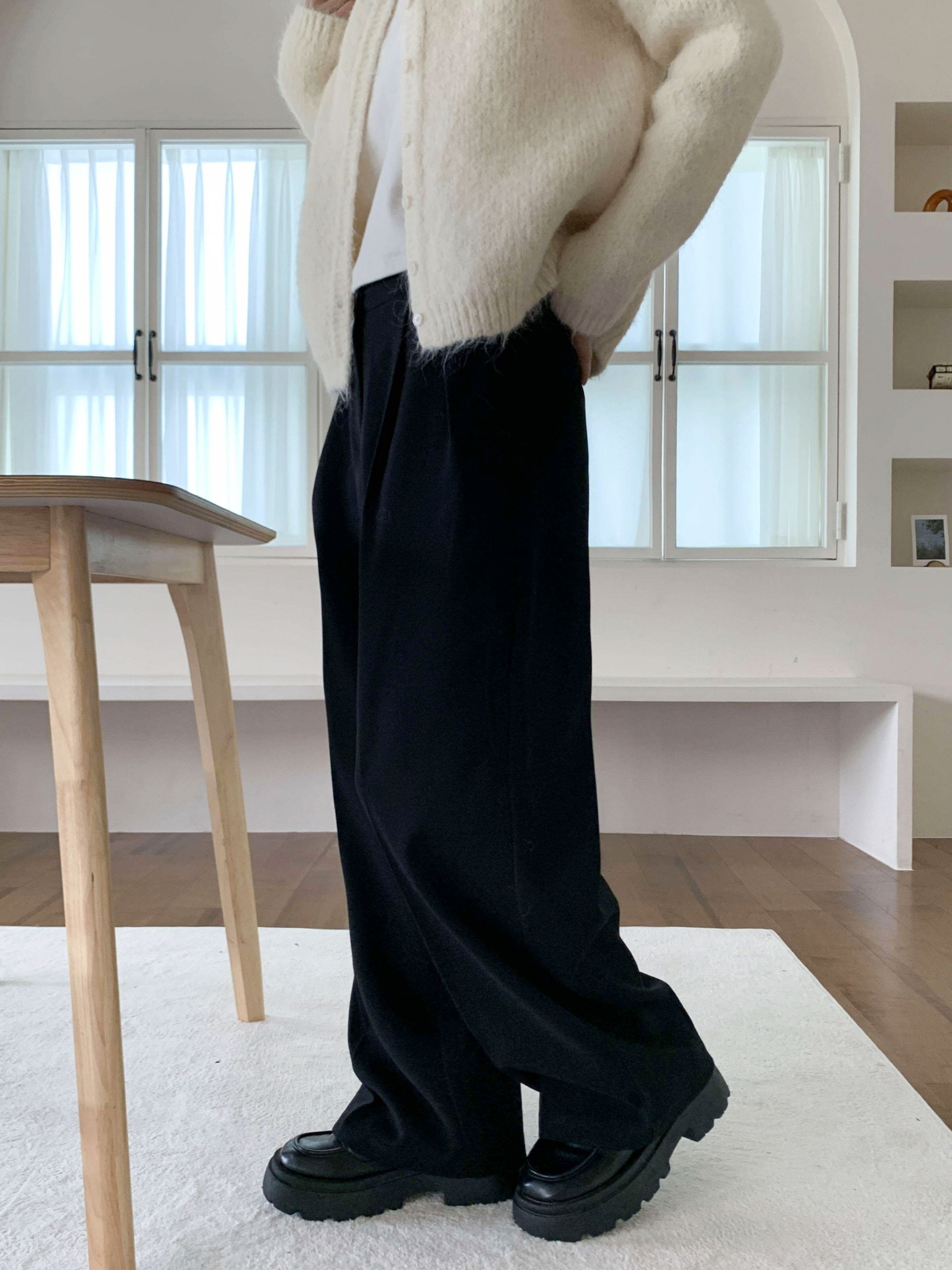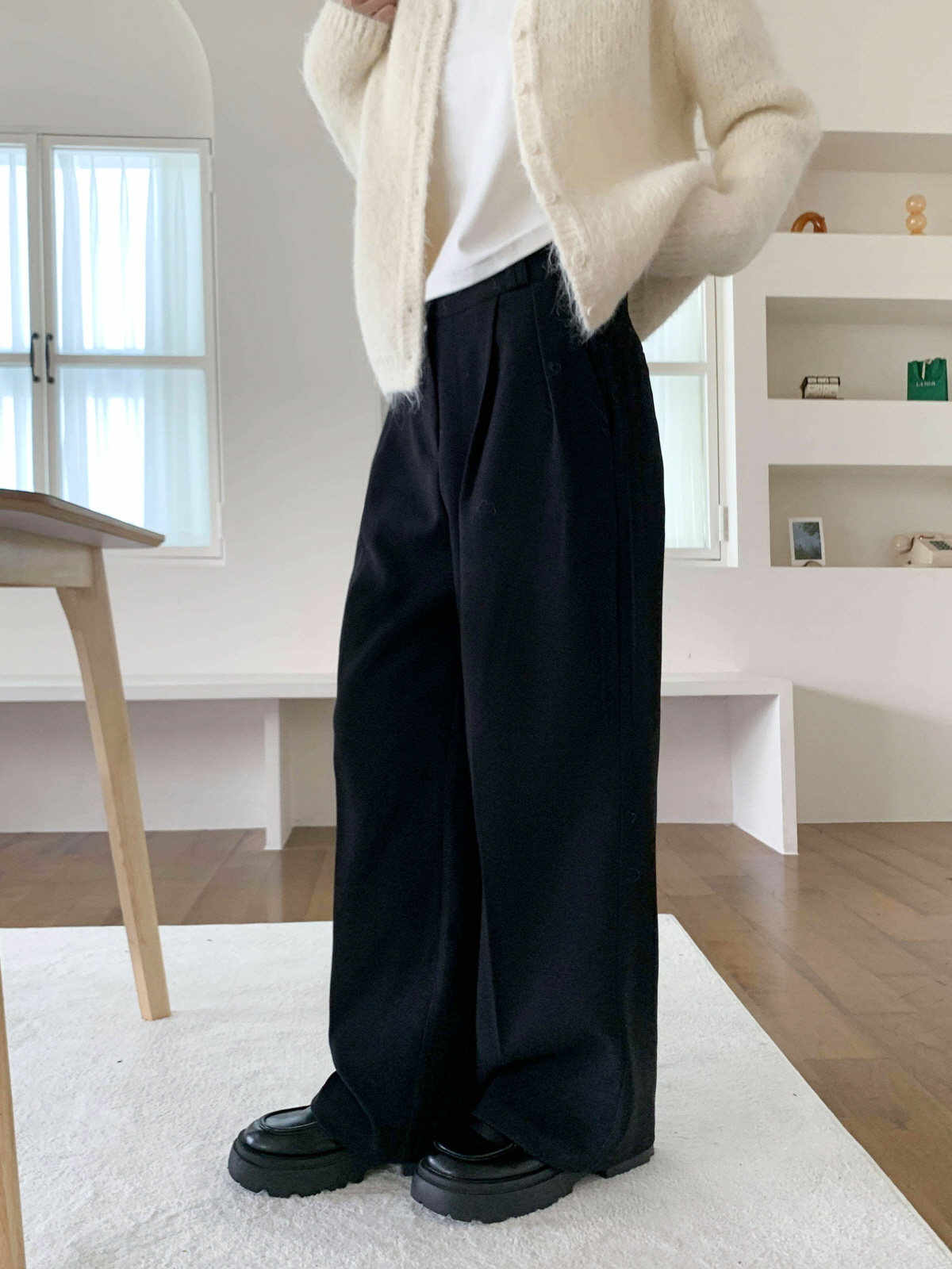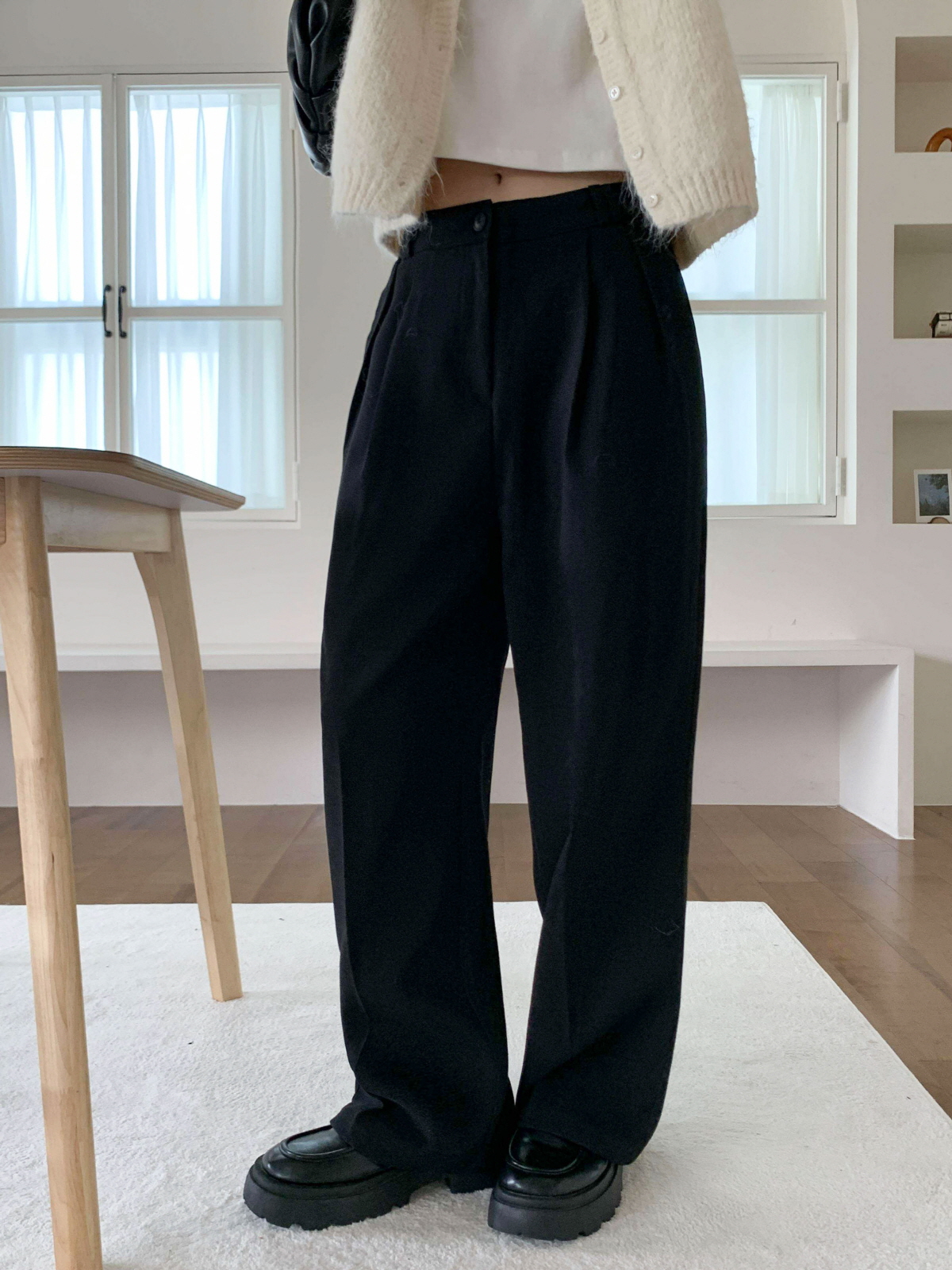 따뜻하고 포근한 모직 소재로 앞면에 투핀턱 디테일이 입체적인 와이드 슬랙스