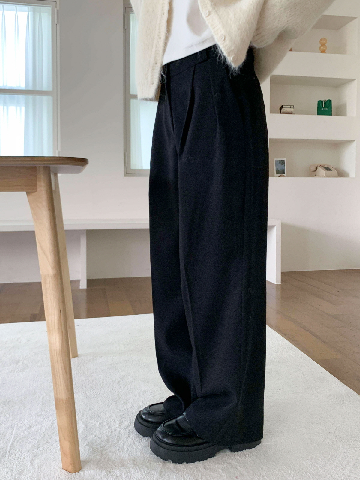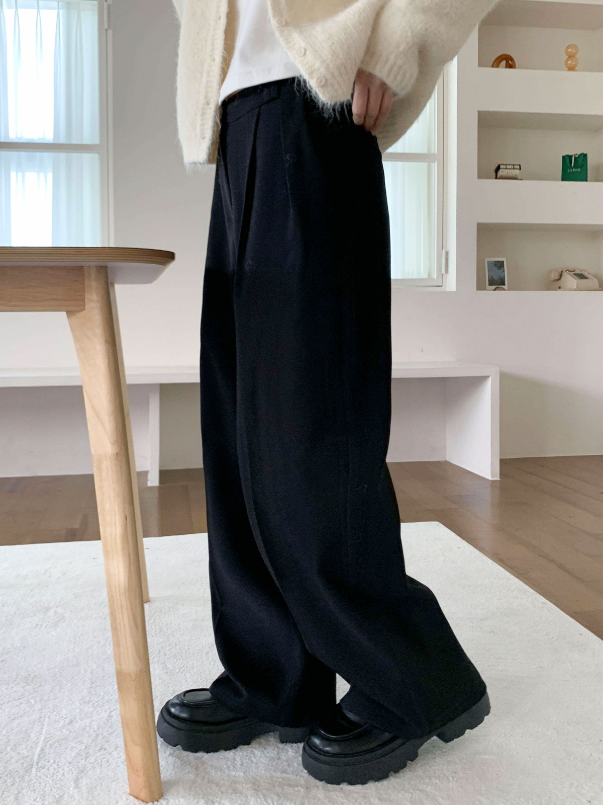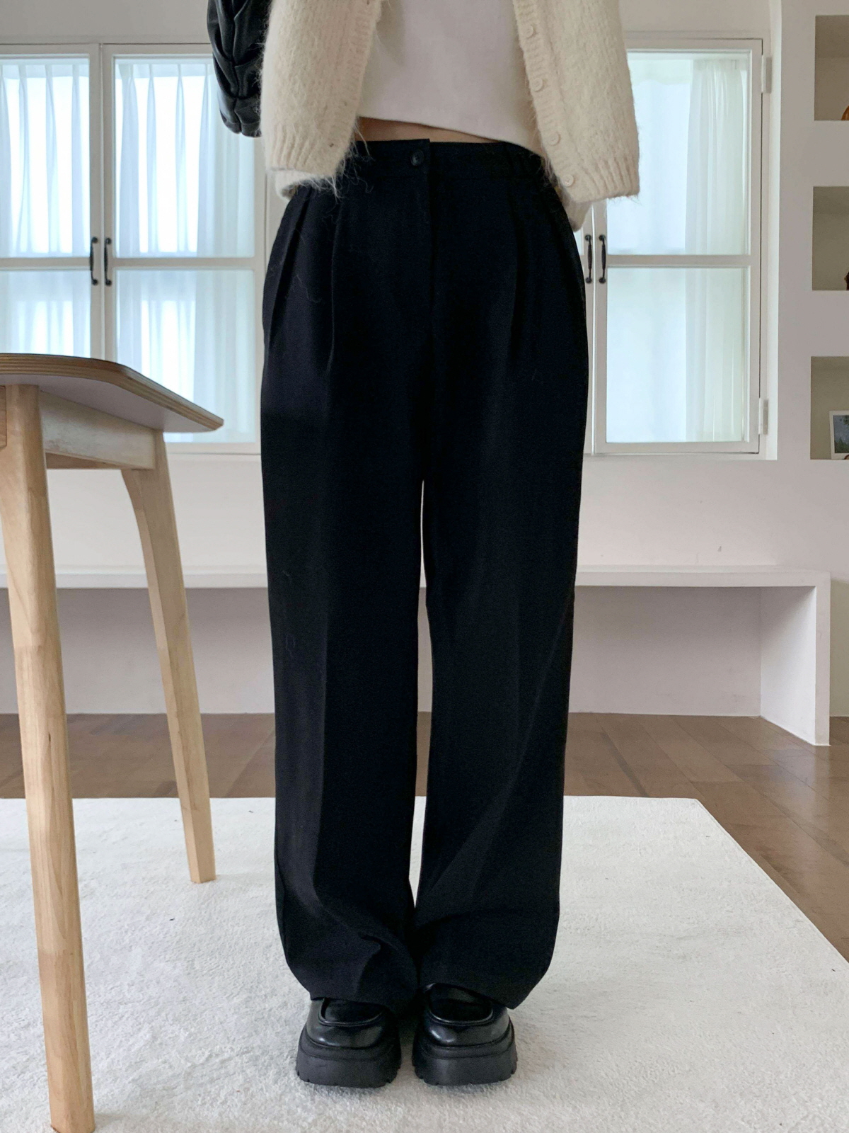 따뜻하고 포근한 모직 소재로 앞면에 투핀턱 디테일이 입체적인 와이드 슬랙스