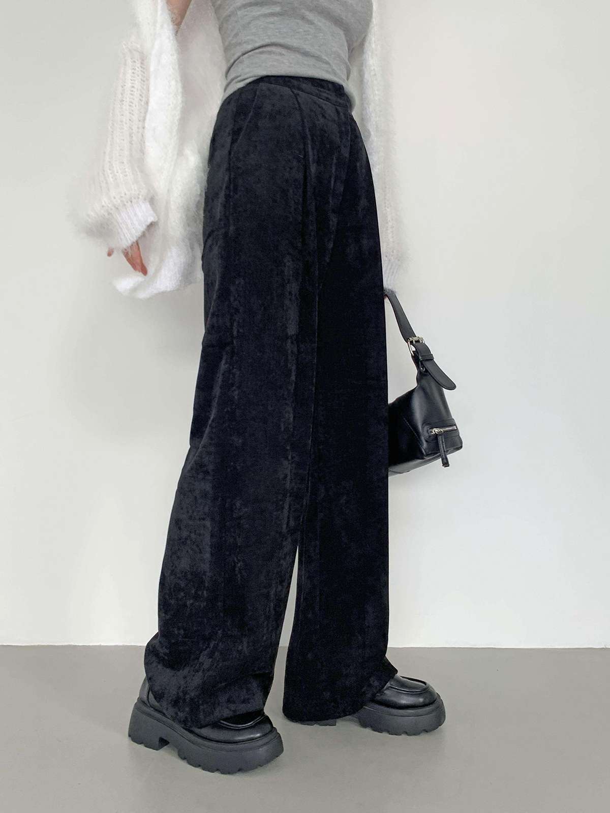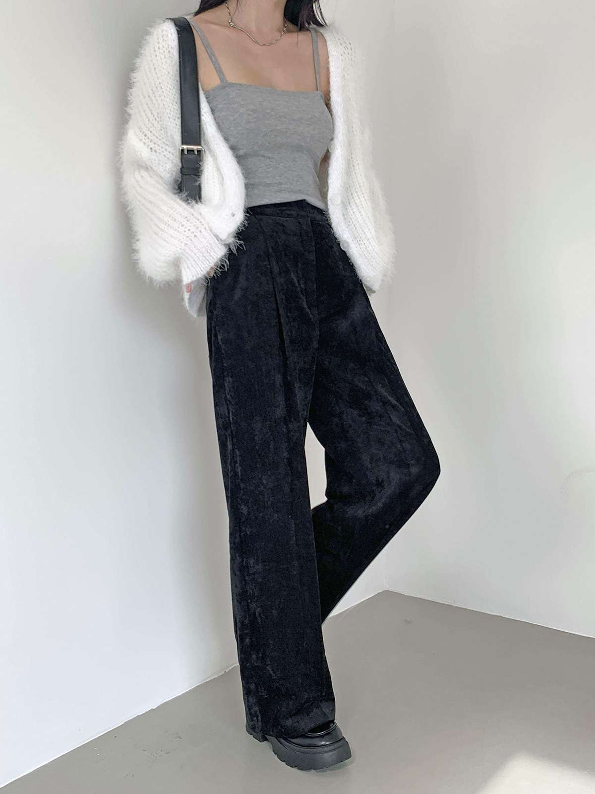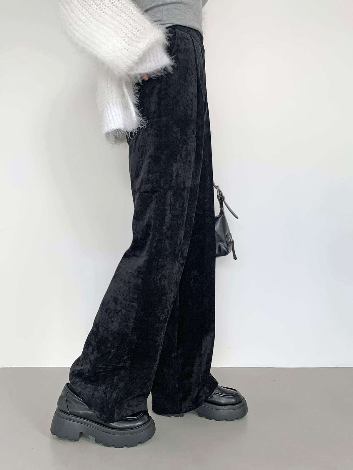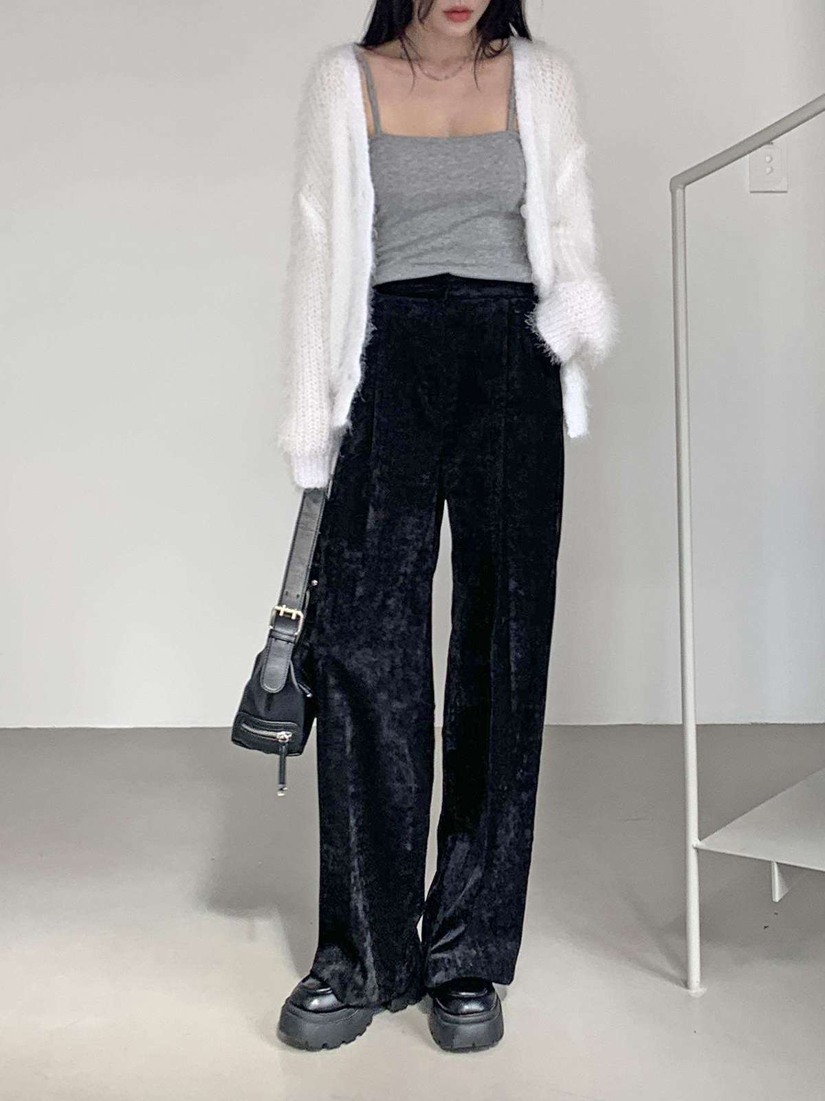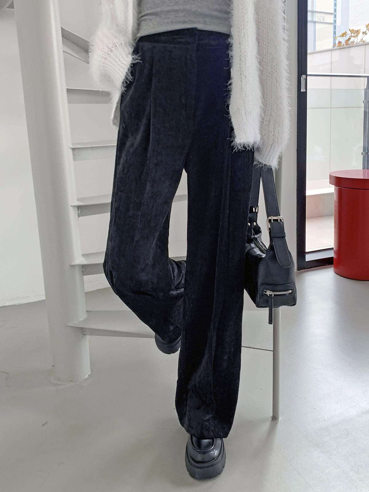 벨벳 소재의 고급스러운 분위기를 나타내는 와이드 슬랙스로