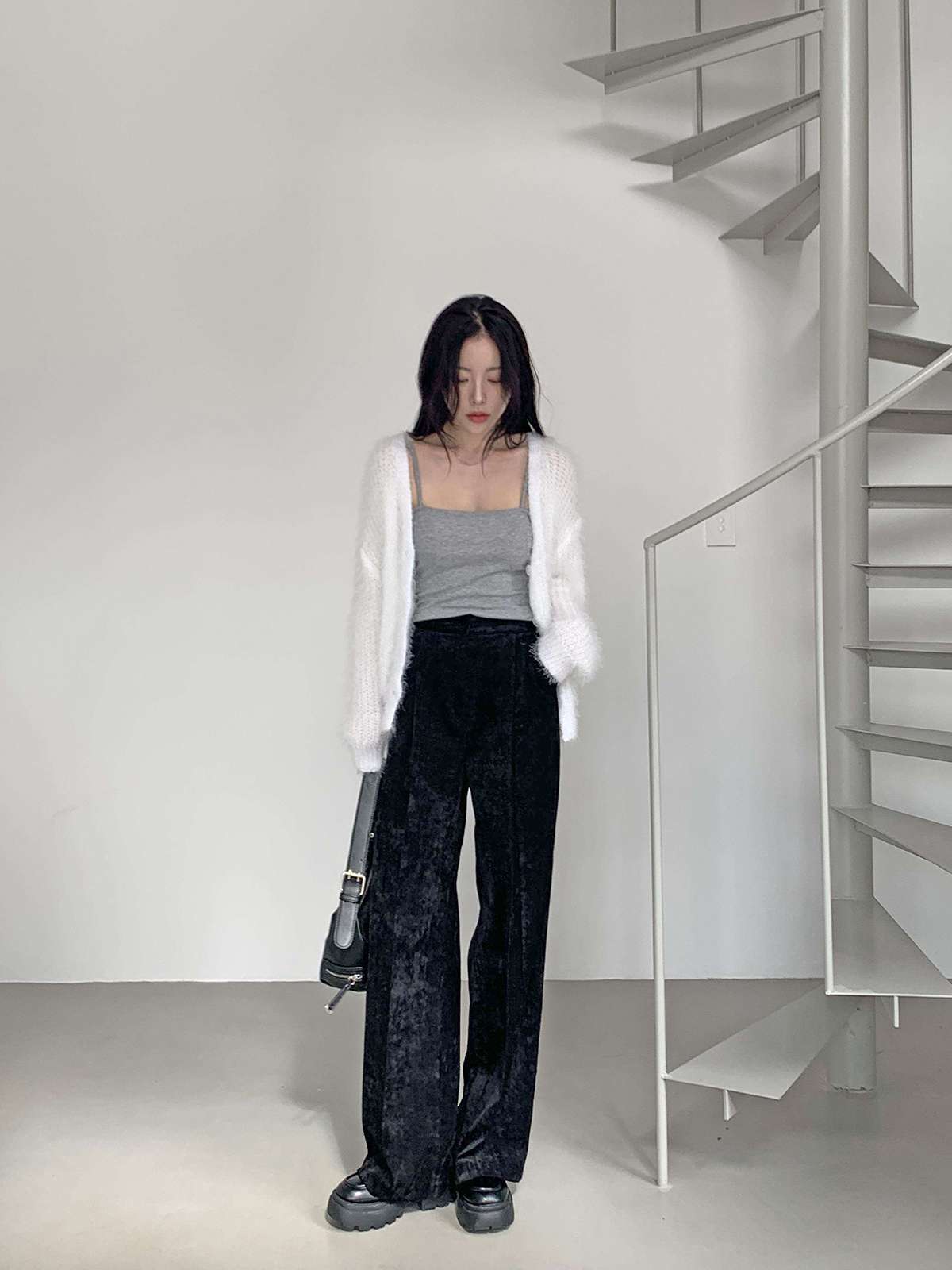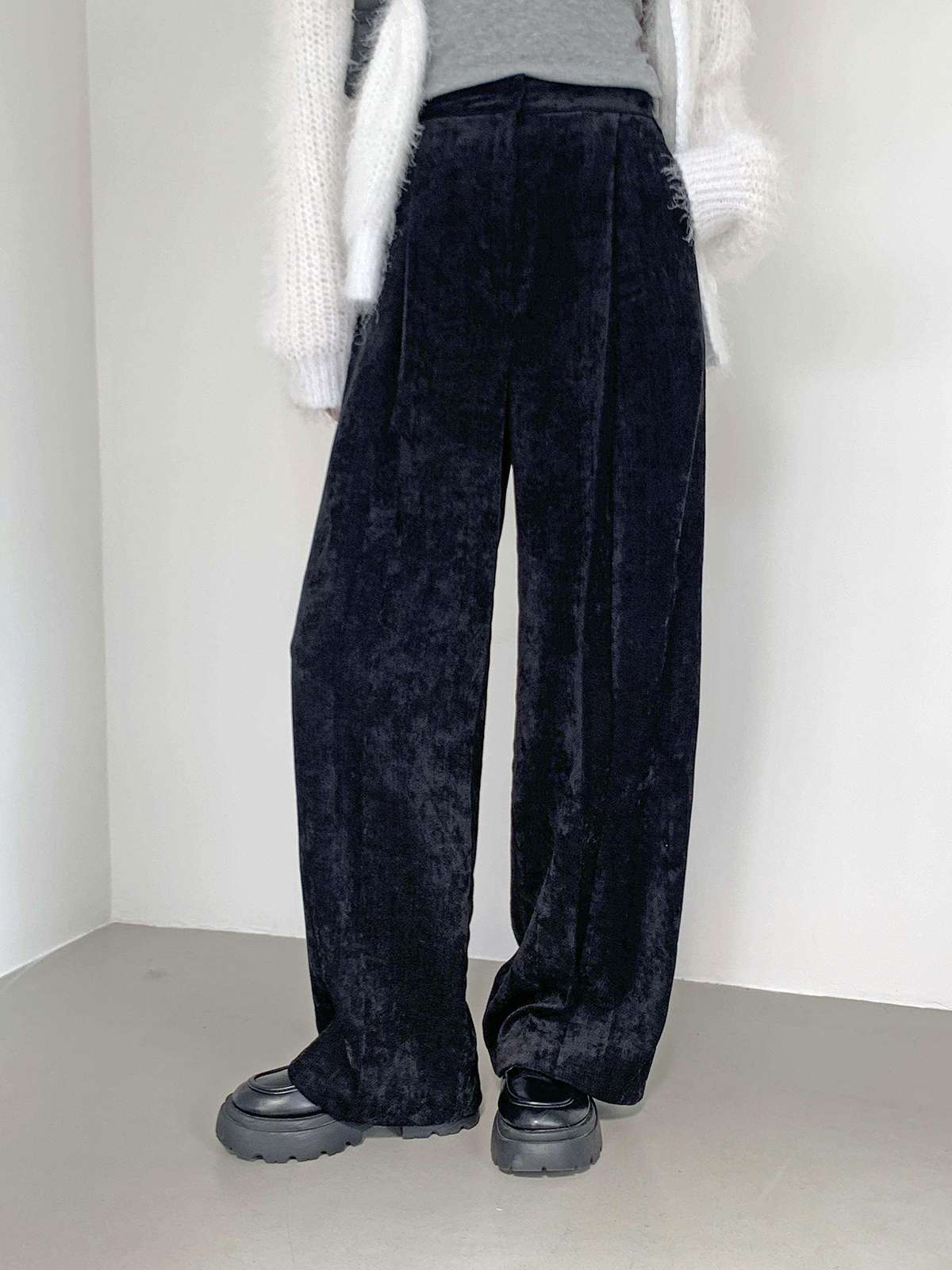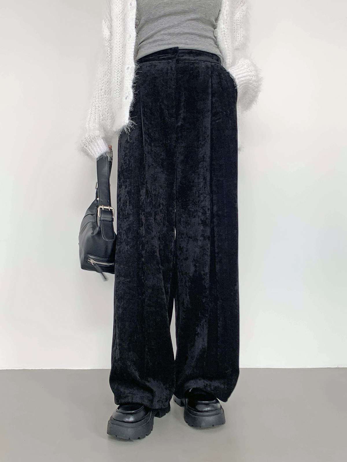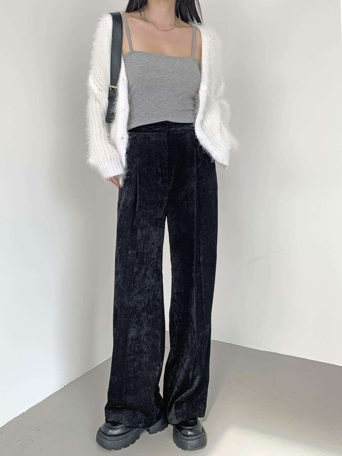벨벳 소재의 고급스러운 분위기를 나타내는 와이드 슬랙스로