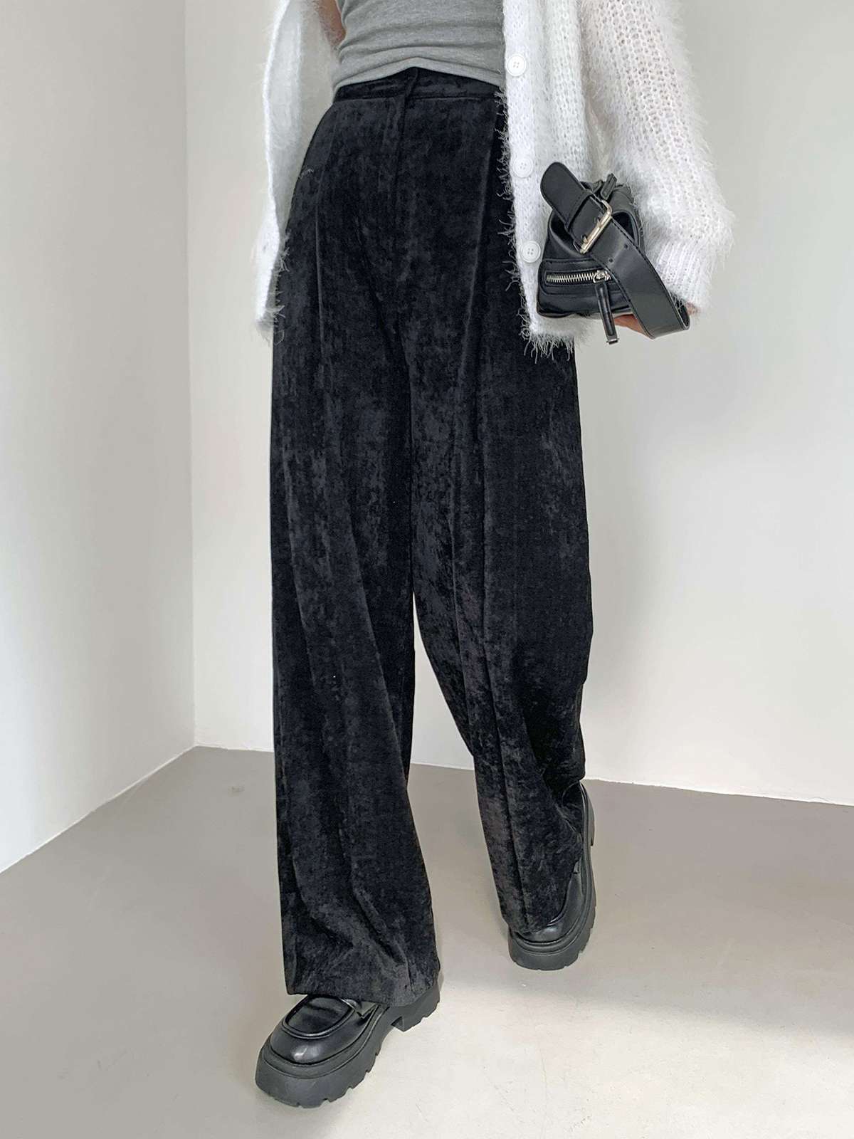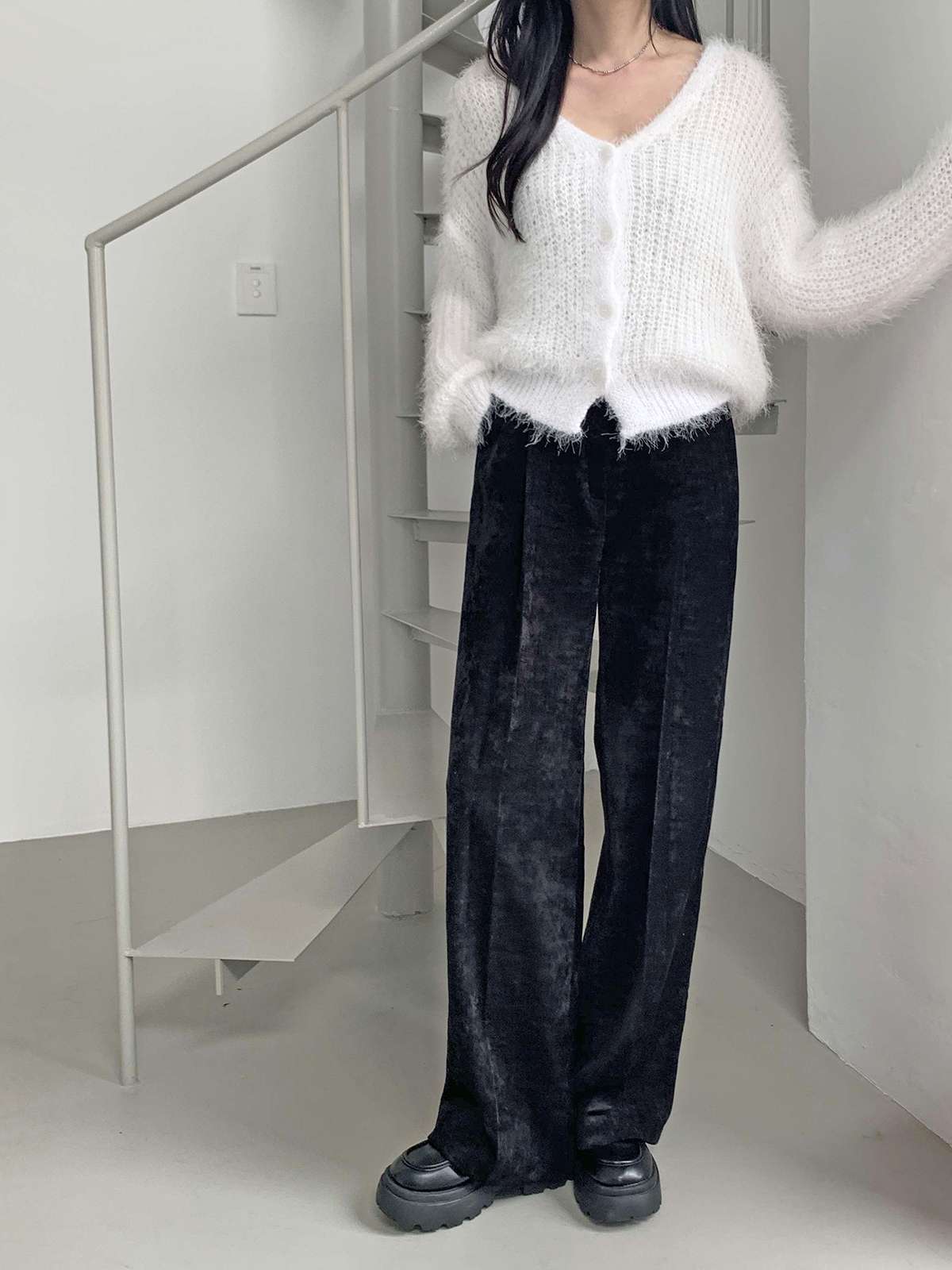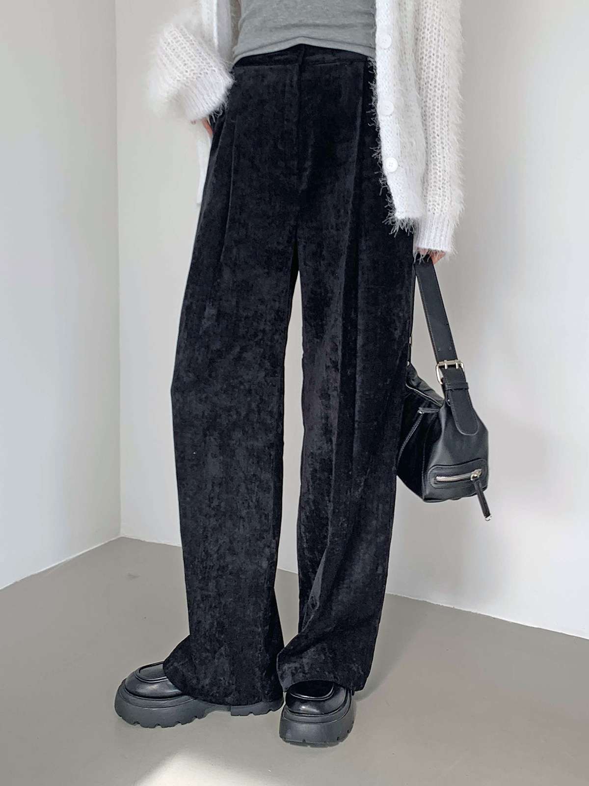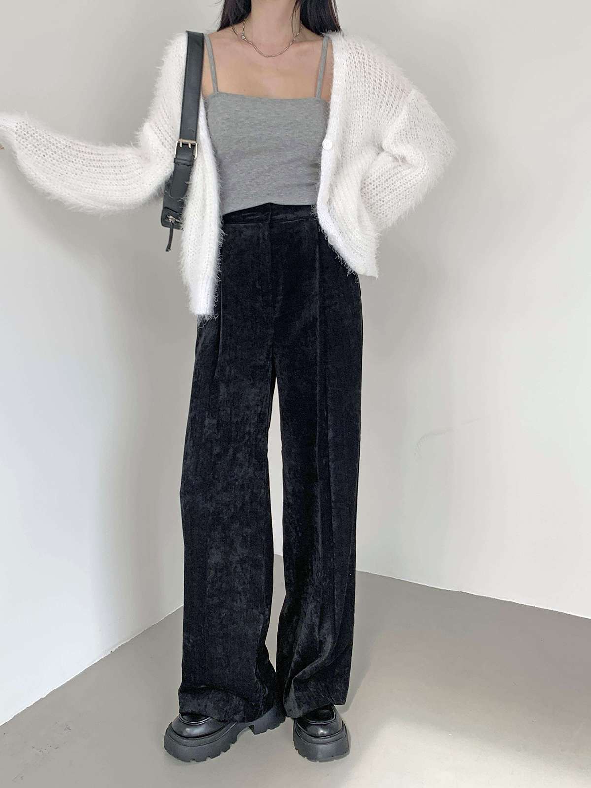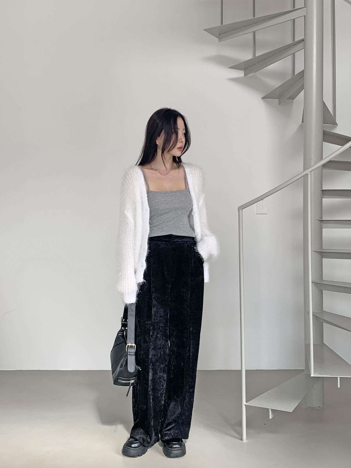 벨벳 소재의 고급스러운 분위기를 나타내는 와이드 슬랙스로