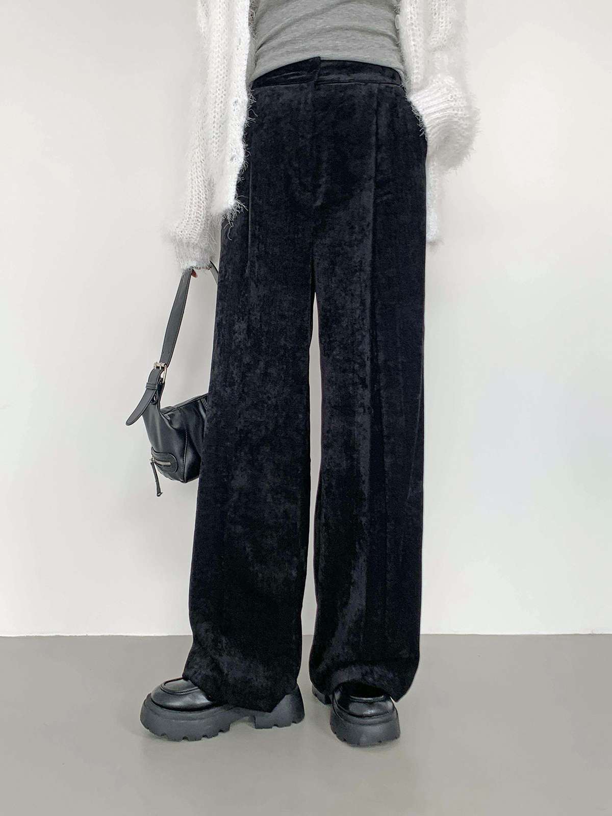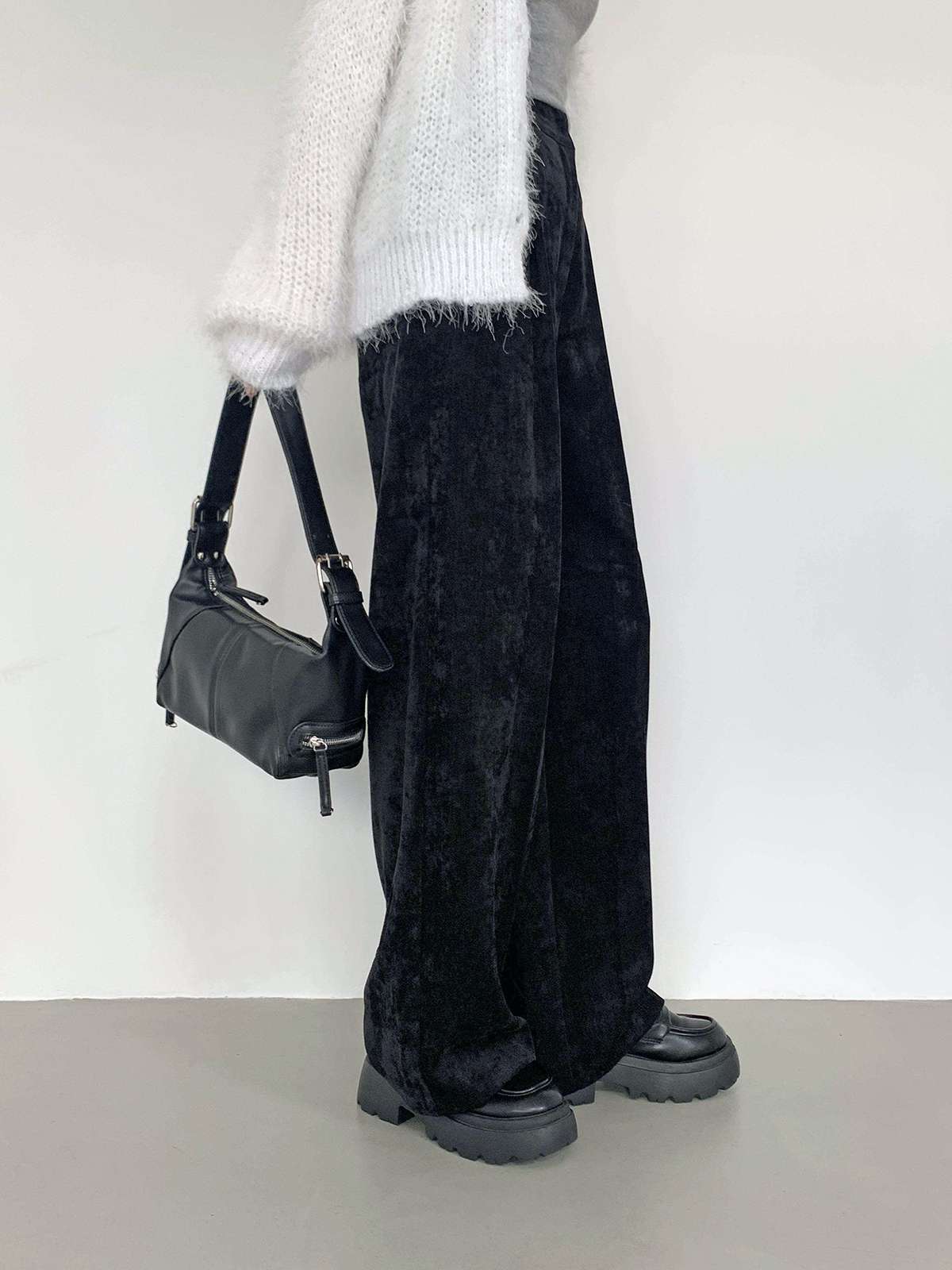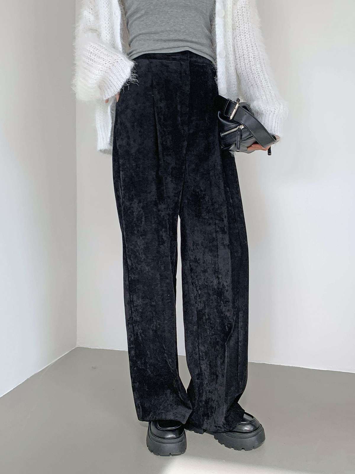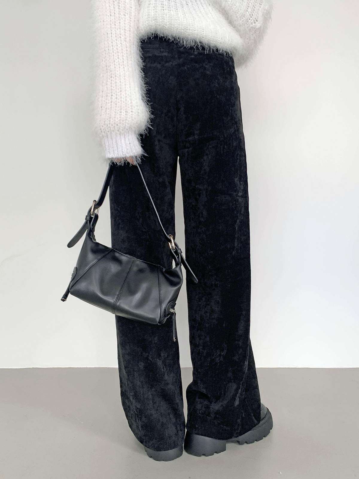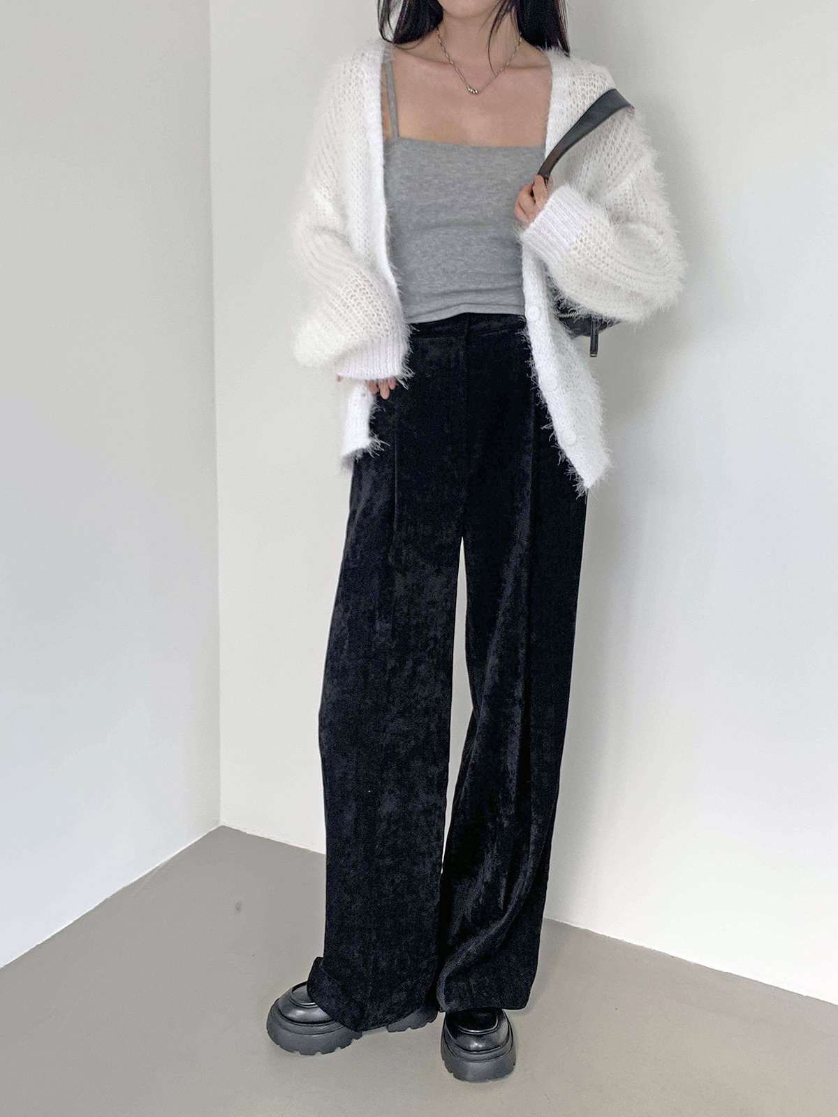 벨벳 소재의 고급스러운 분위기를 나타내는 와이드 슬랙스로