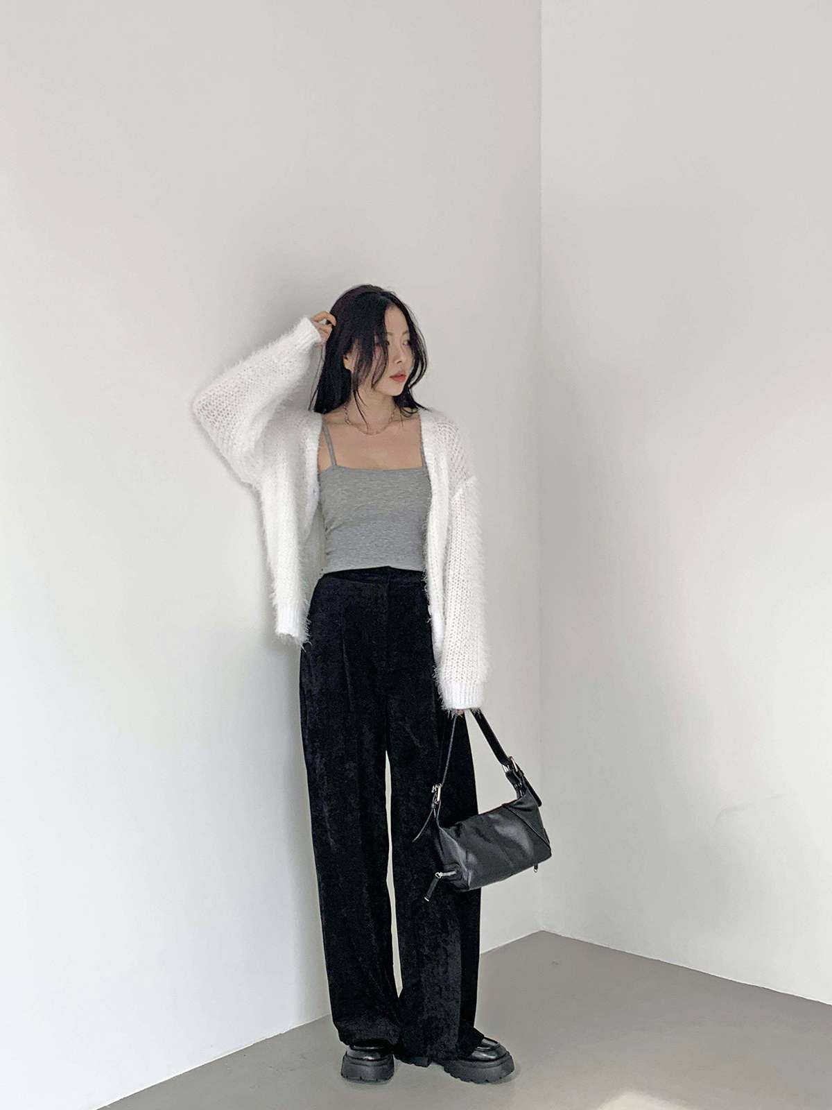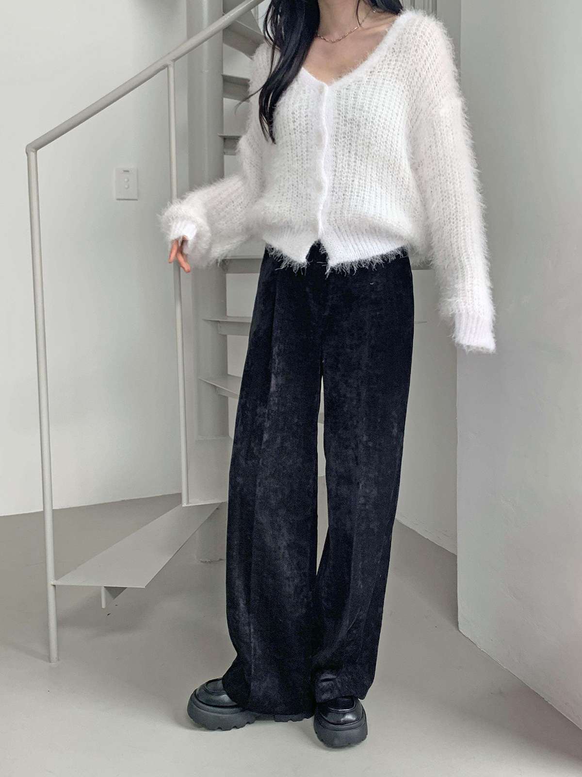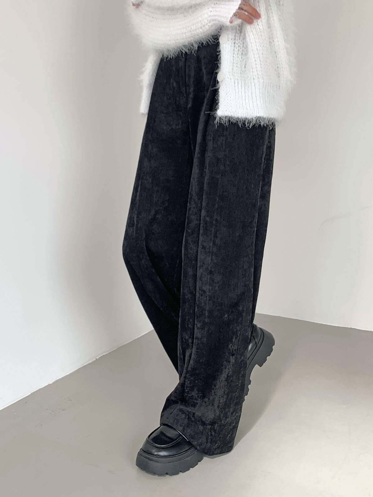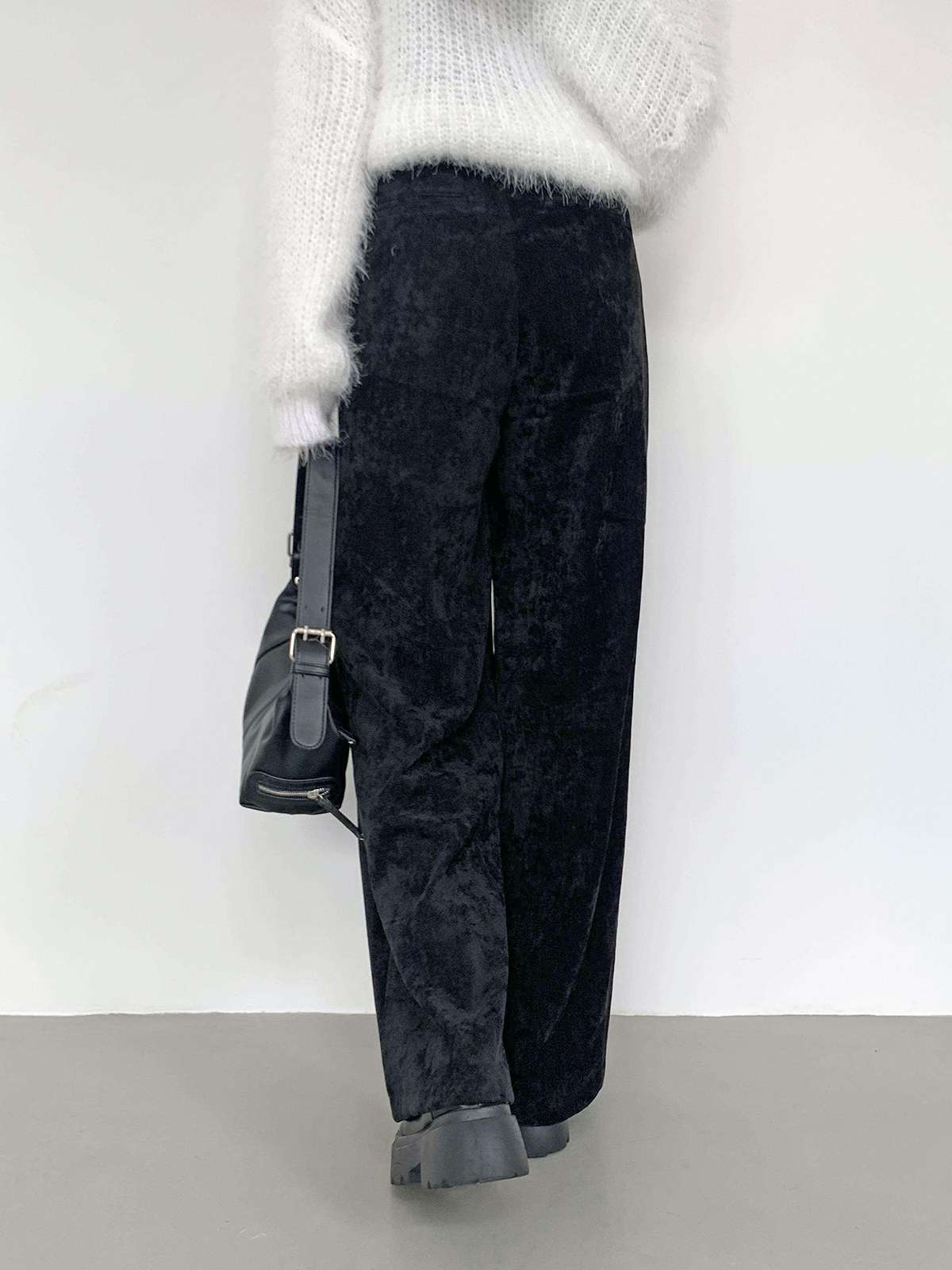 벨벳 소재의 고급스러운 분위기를 나타내는 와이드 슬랙스로
