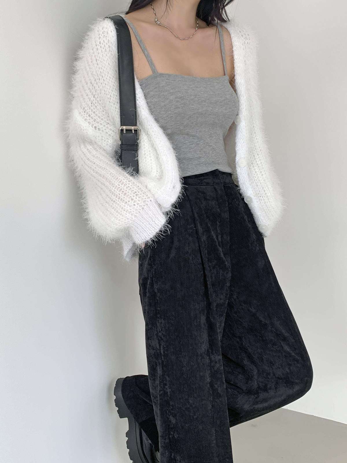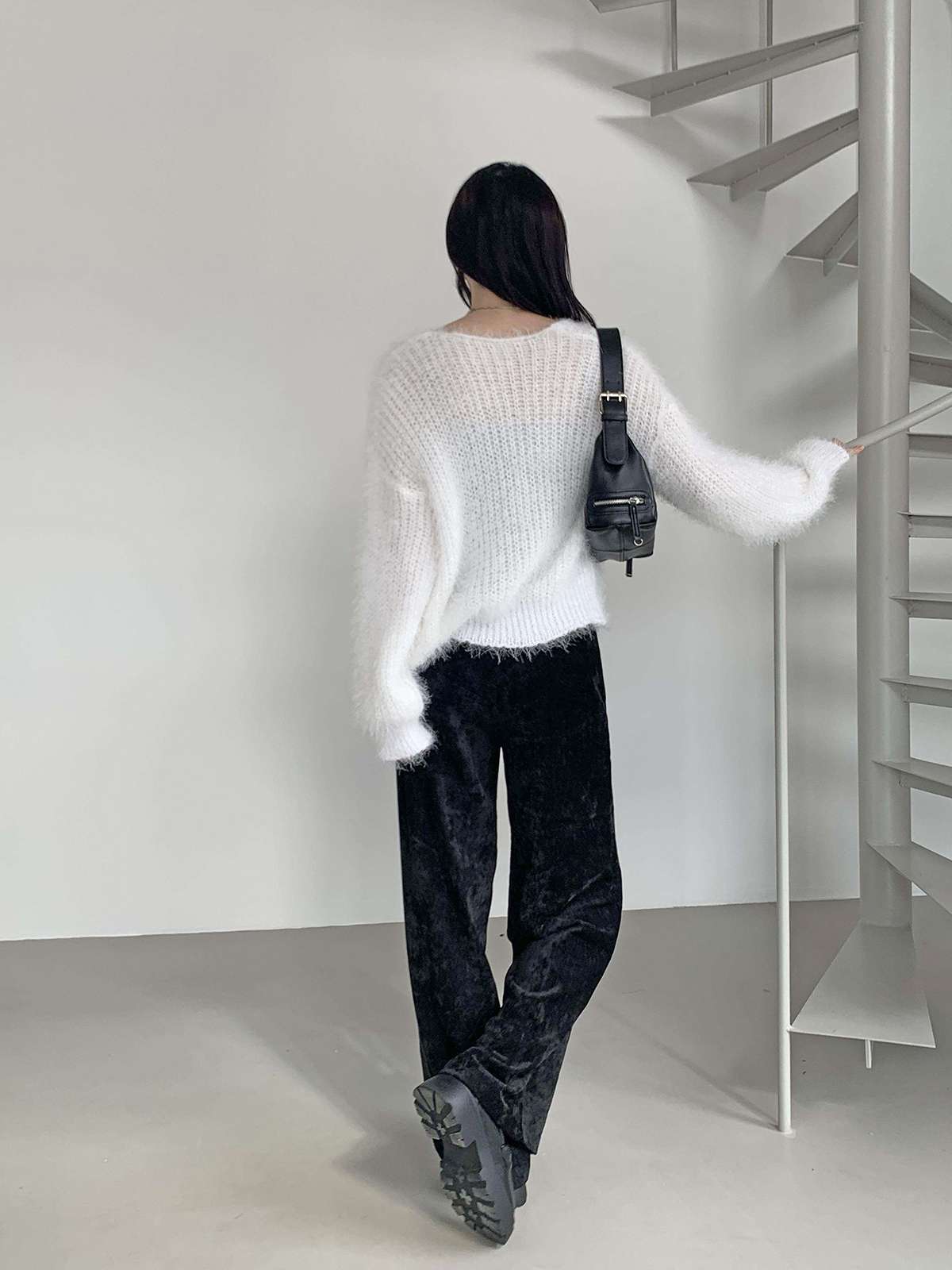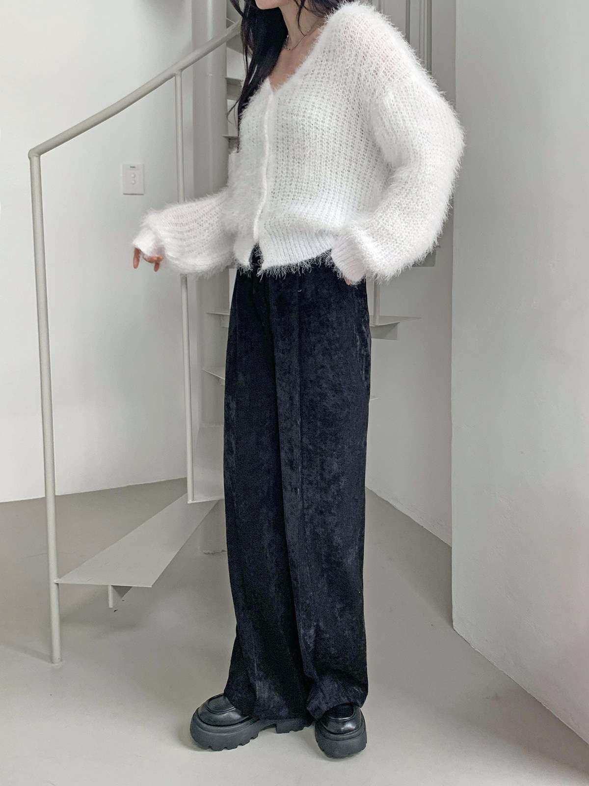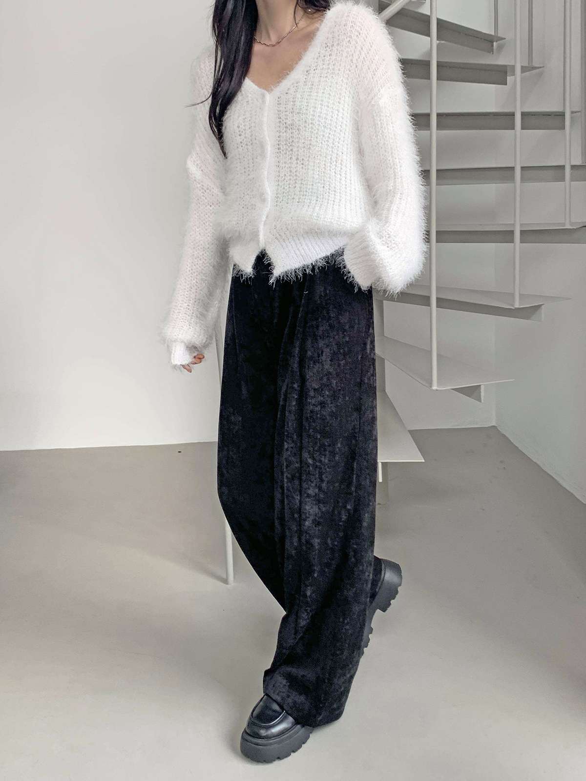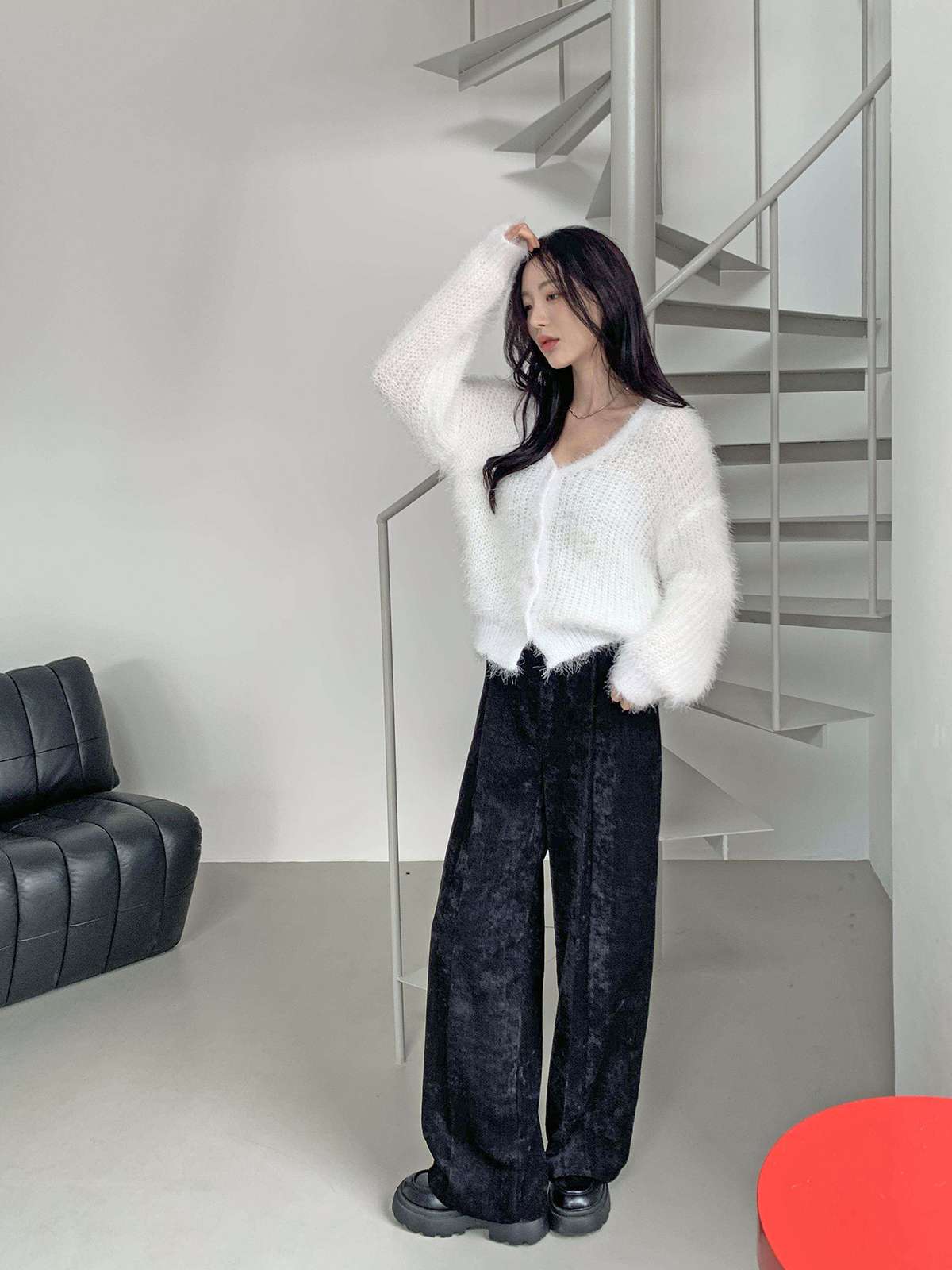 벨벳 소재의 고급스러운 분위기를 나타내는 와이드 슬랙스로