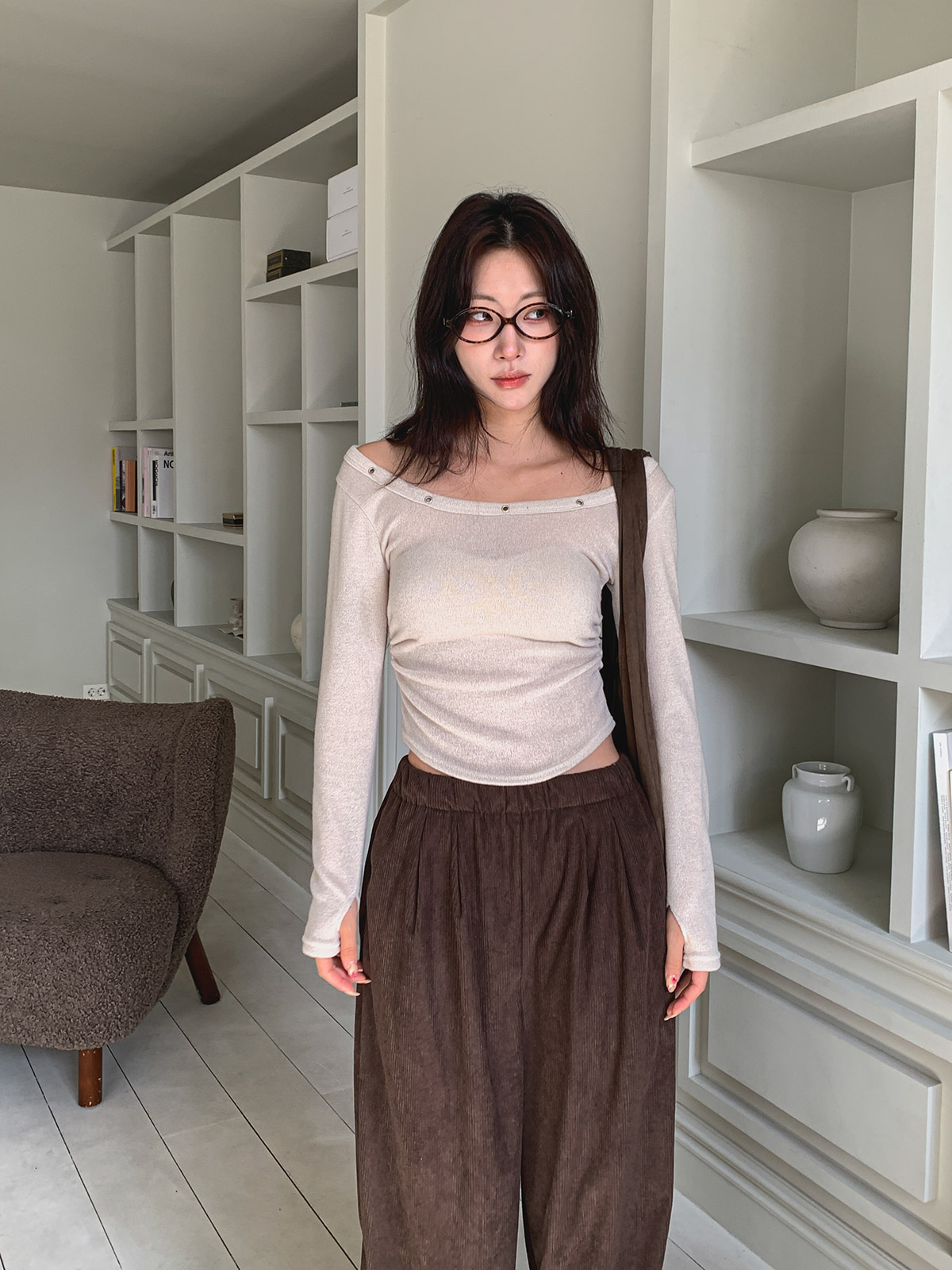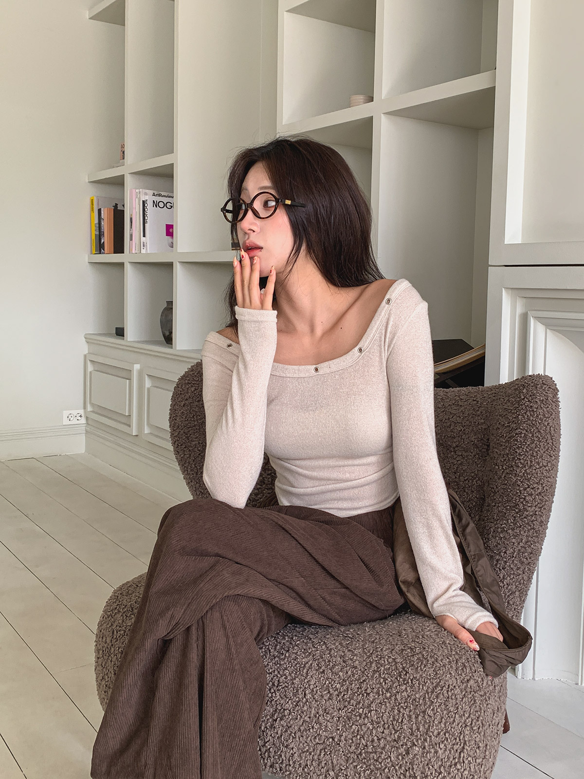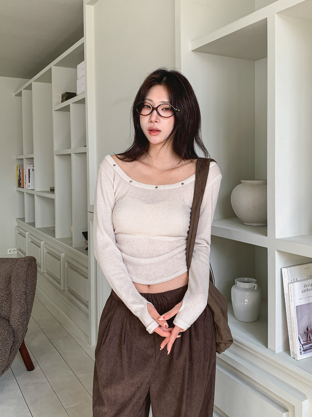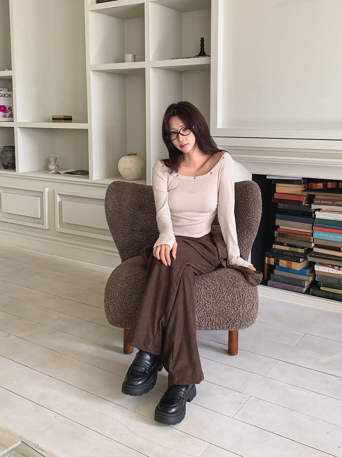 아일렛 디테일이 포인트인 U넥 셔링 니트 티셔츠