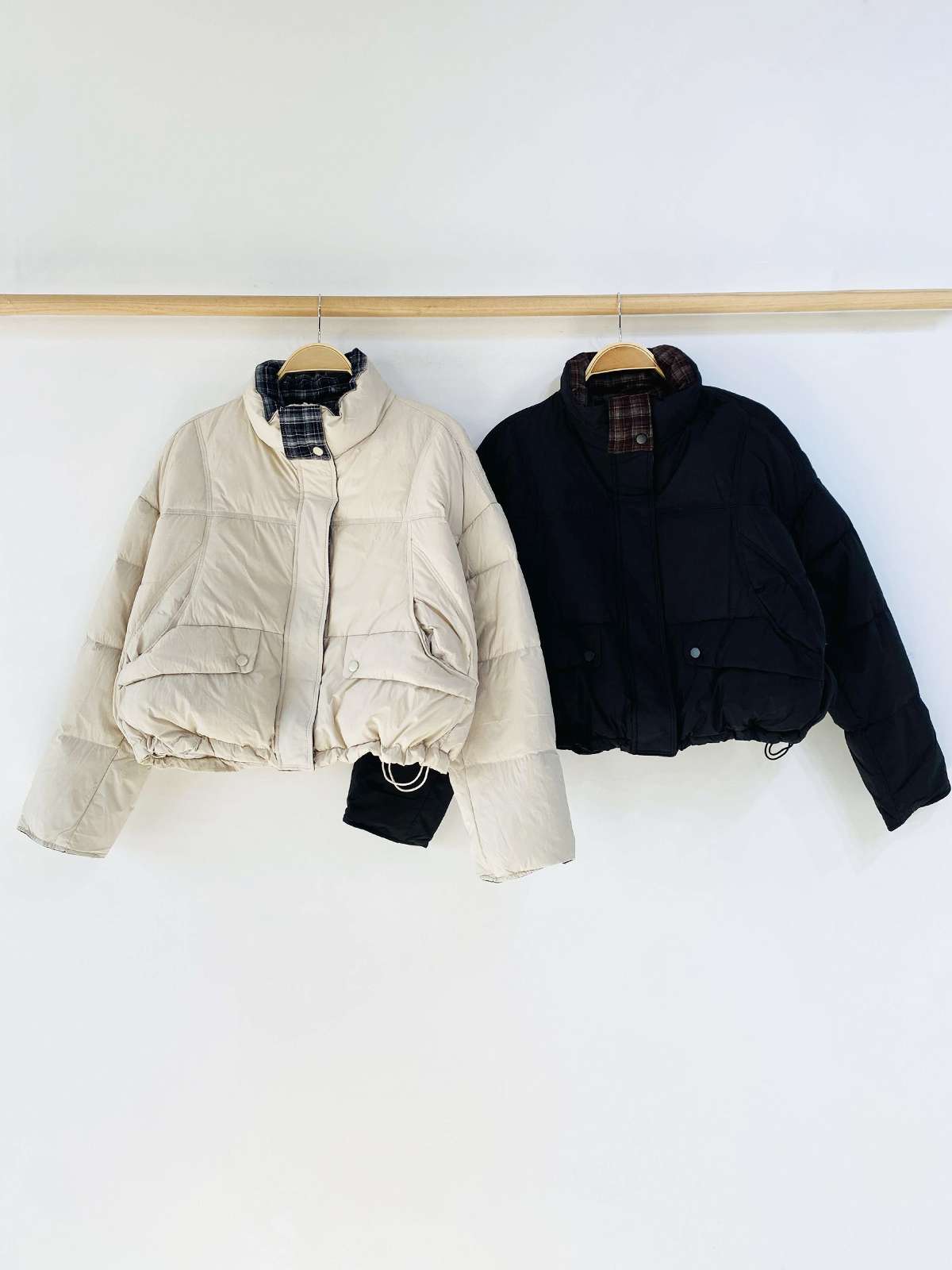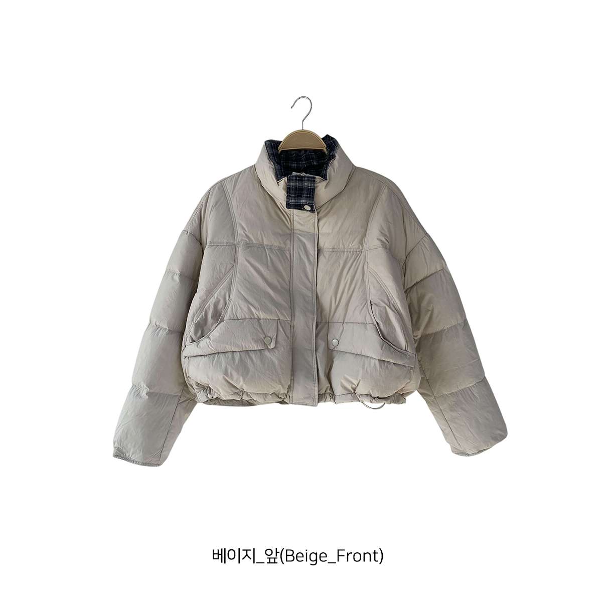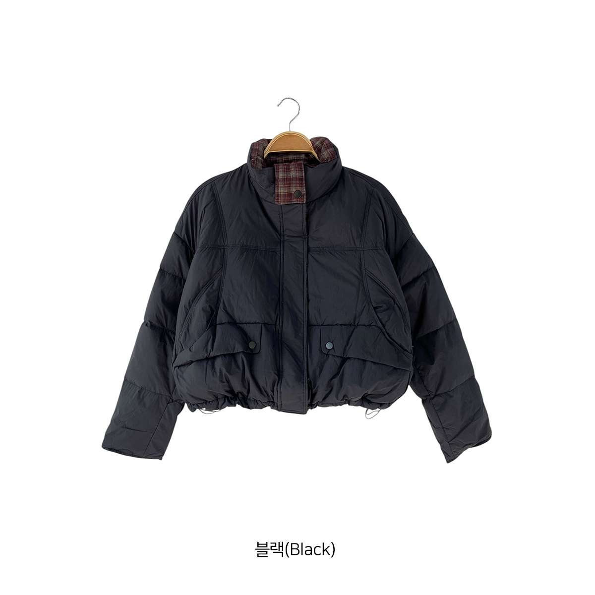 우수한 보온성을 자랑하는 체크 배색 카라 숏 패딩입니다!